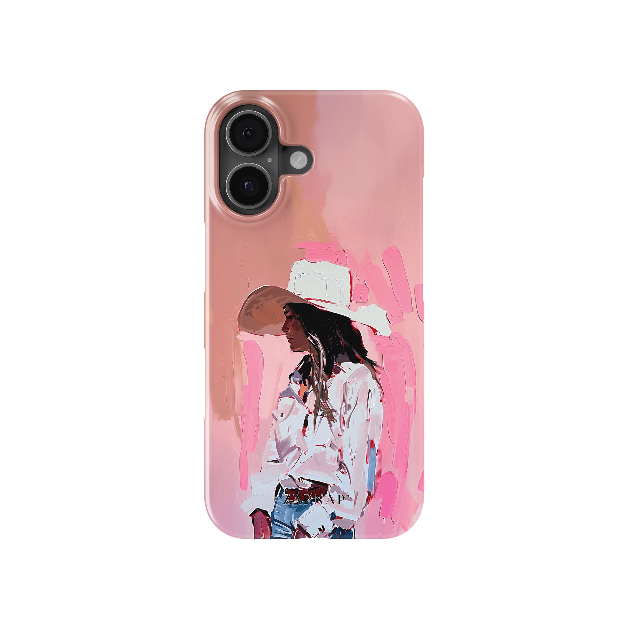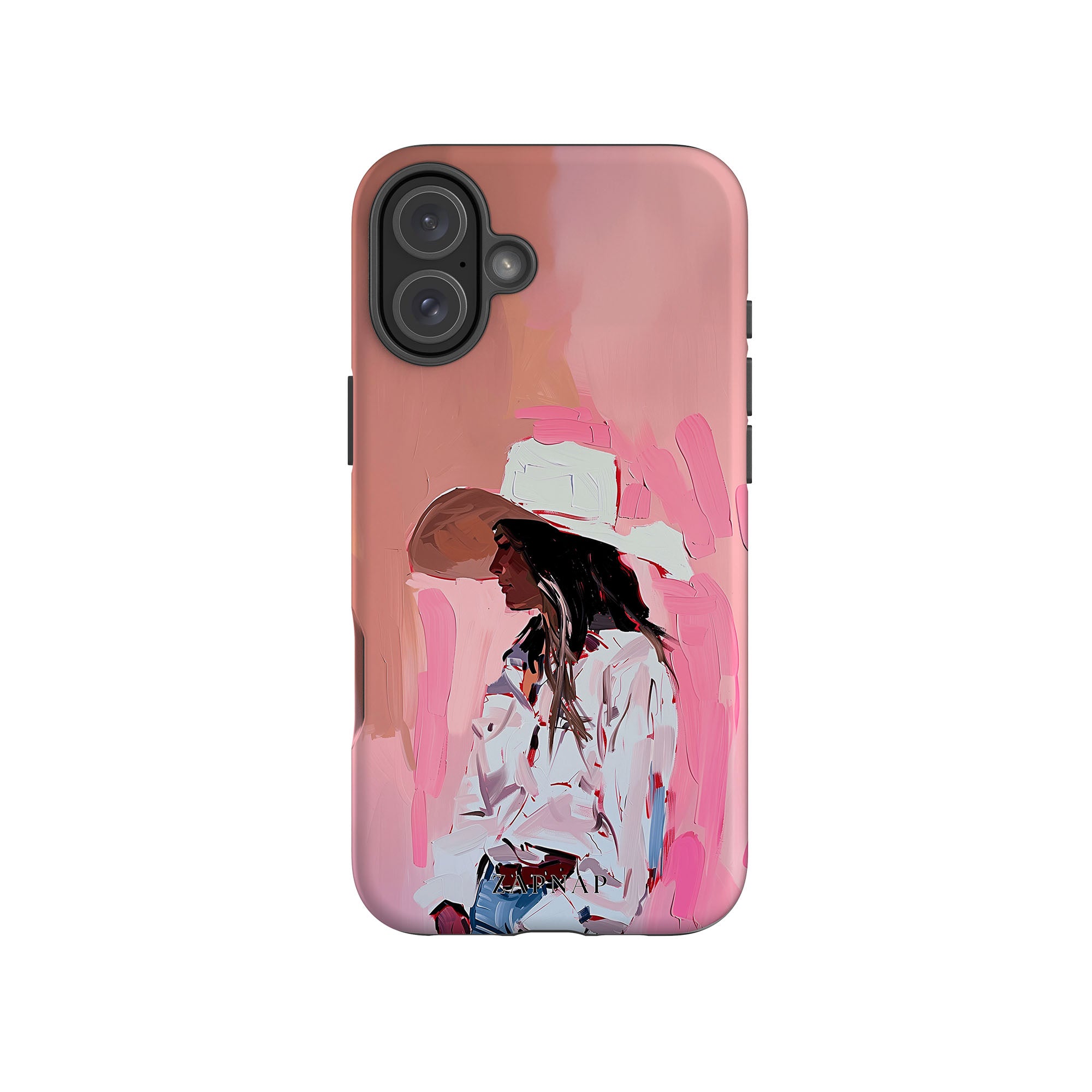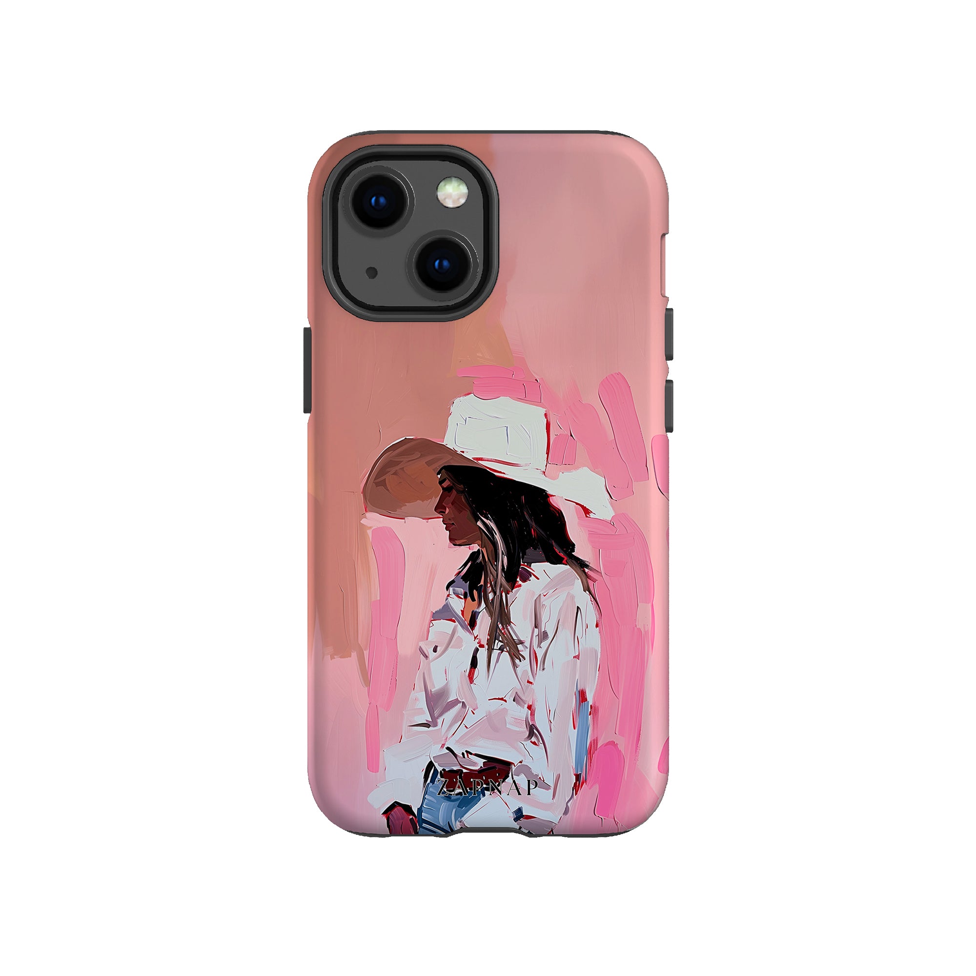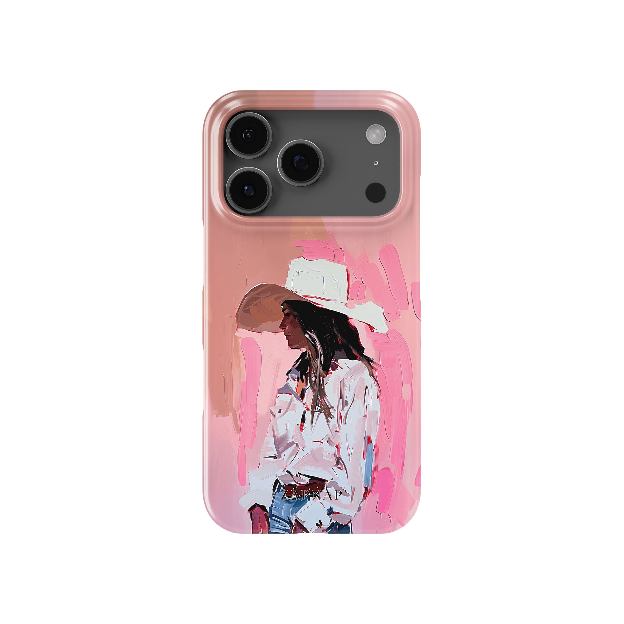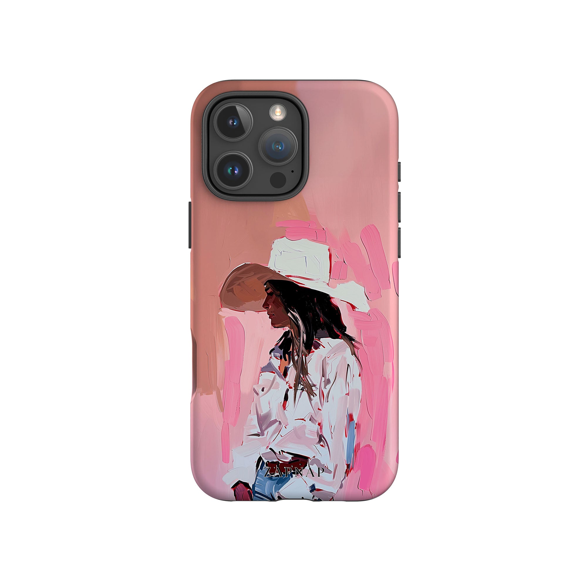 Texas Serenade portretteert een contemplatieve cowgirl, die de essentie van stille kracht en gratie vastlegt tegen een achtergrond van zachte, vloeiende roze tinten. De subtiele penseelstreken benadrukken haar evenwichtige houding en de tijdloze geest van de Lone Star State.