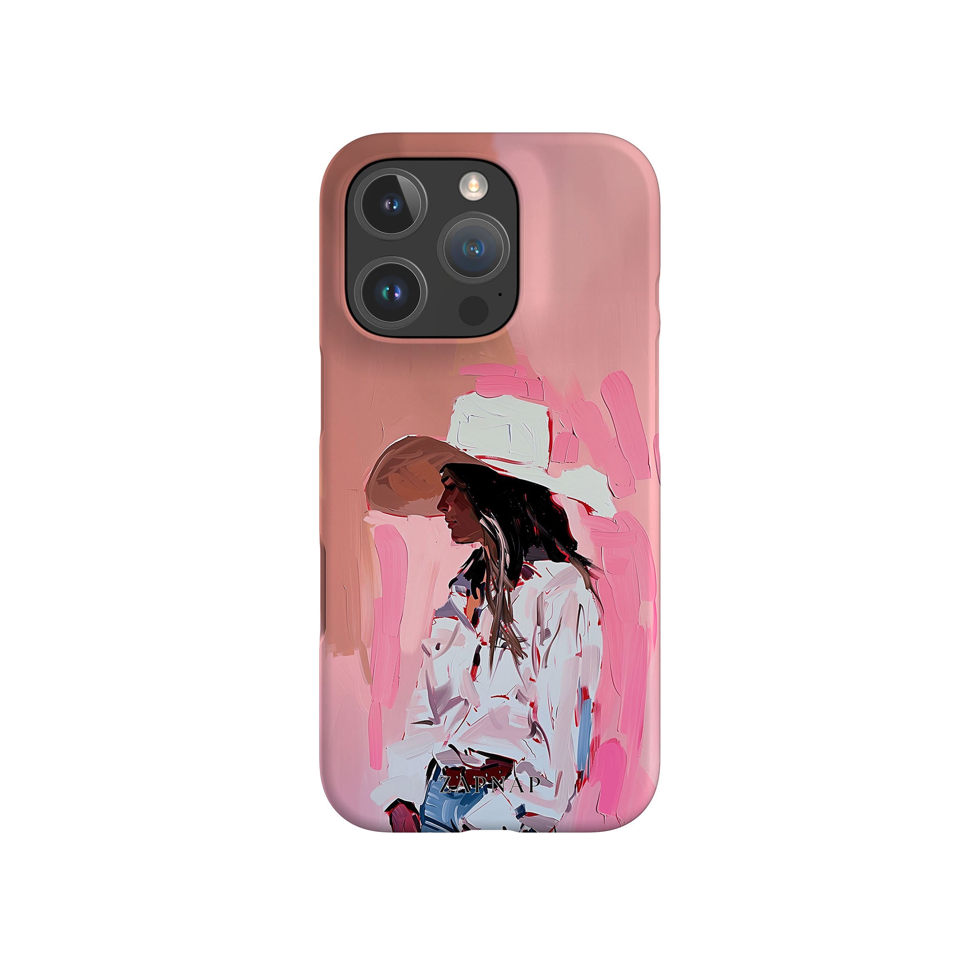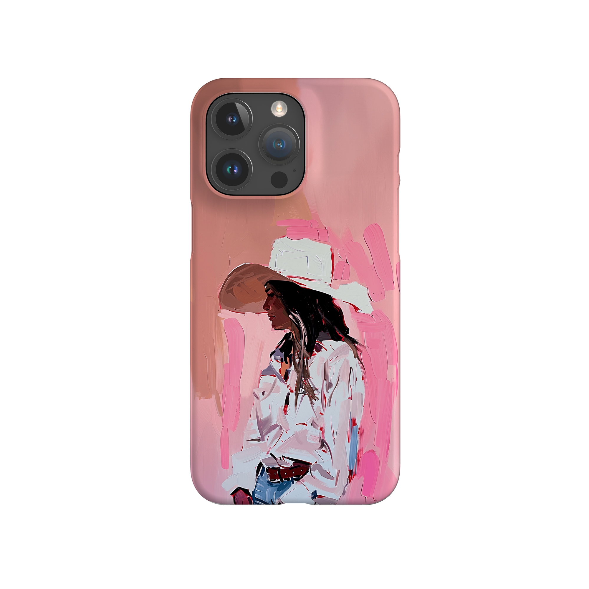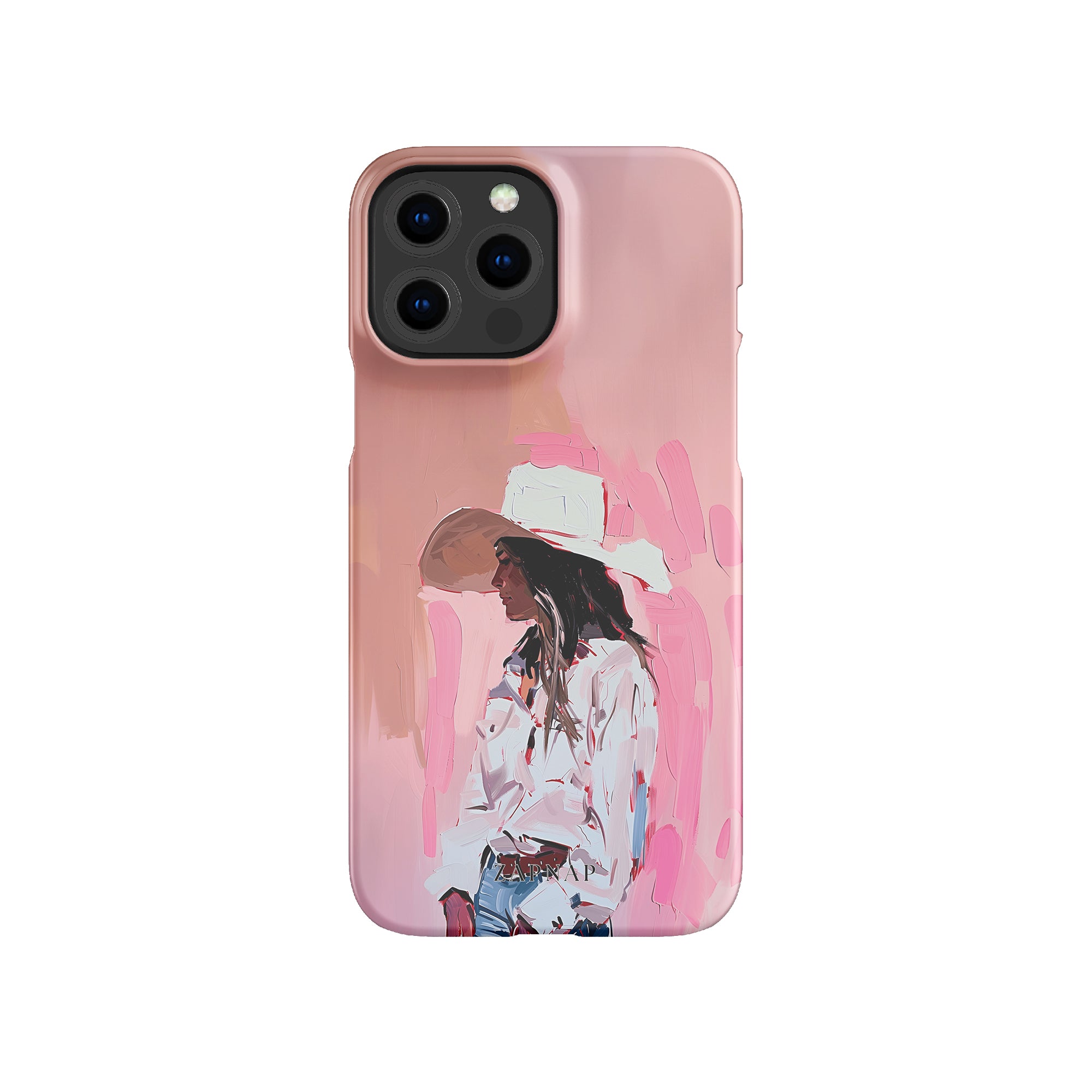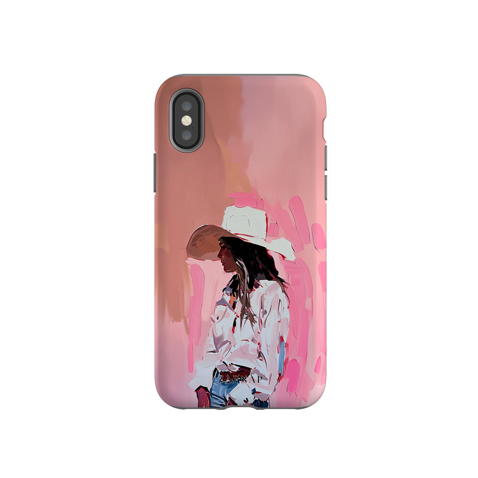 Texas Serenade portretteert een contemplatieve cowgirl, die de essentie van stille kracht en gratie vastlegt tegen een achtergrond van zachte, vloeiende roze tinten. De subtiele penseelstreken benadrukken haar evenwichtige houding en de tijdloze geest van de Lone Star State.