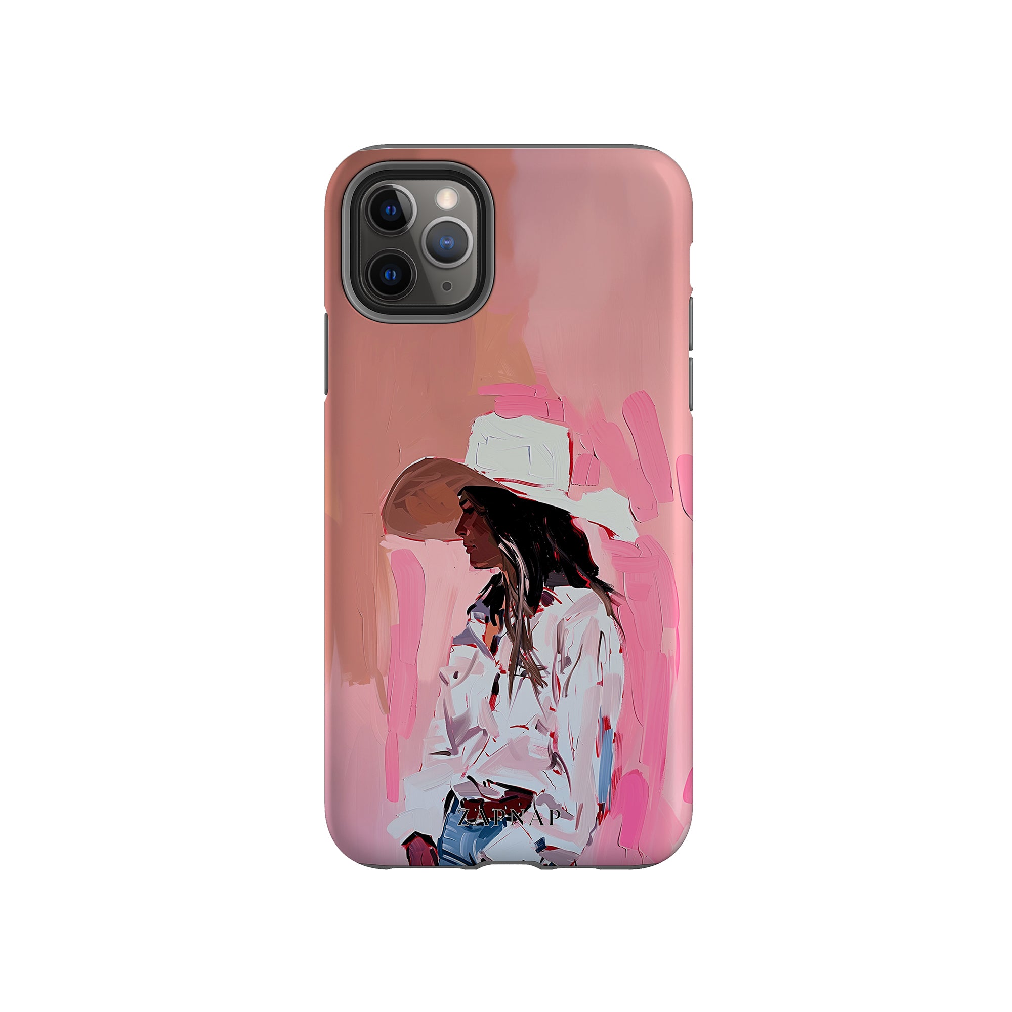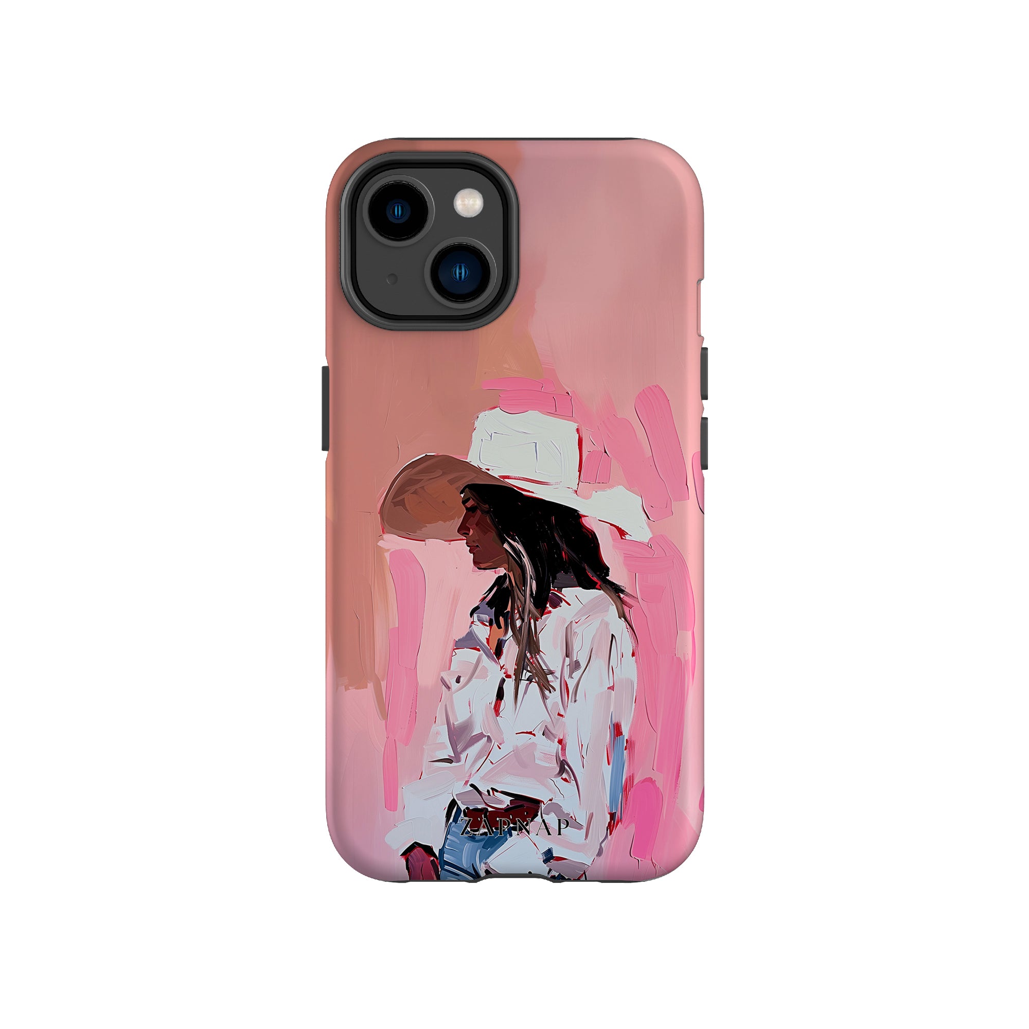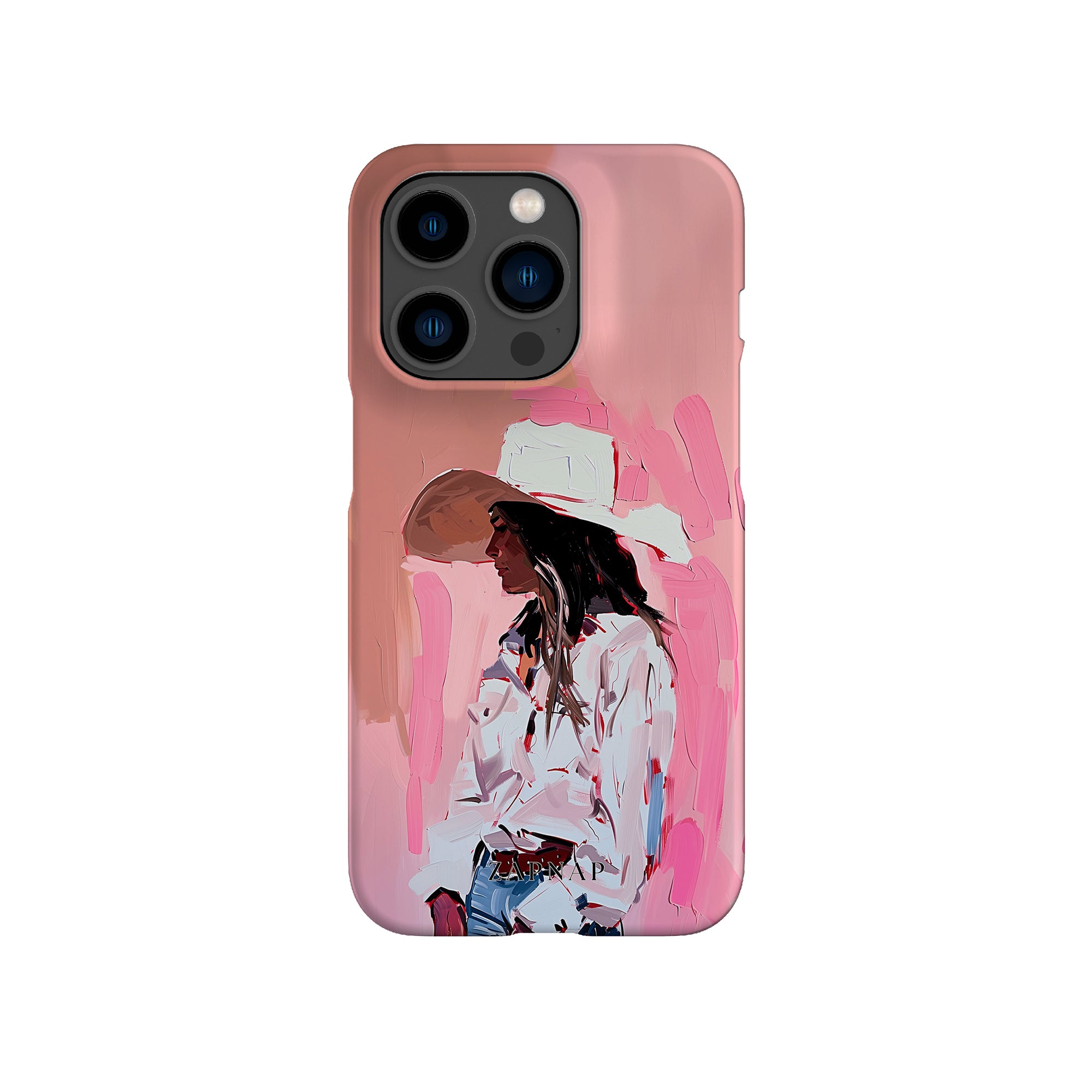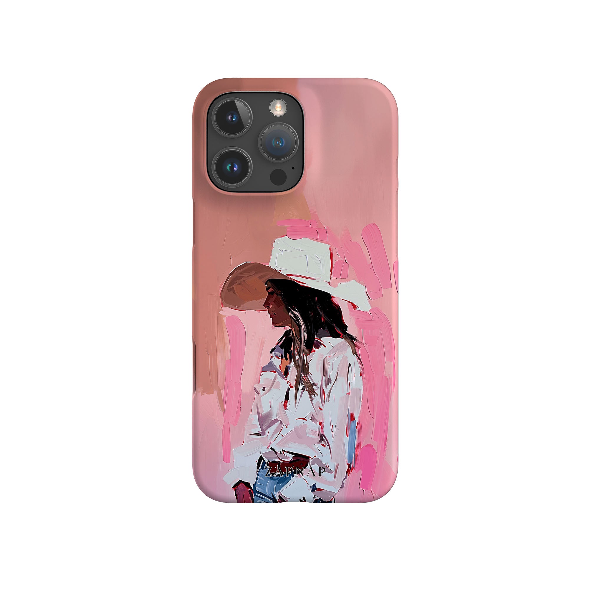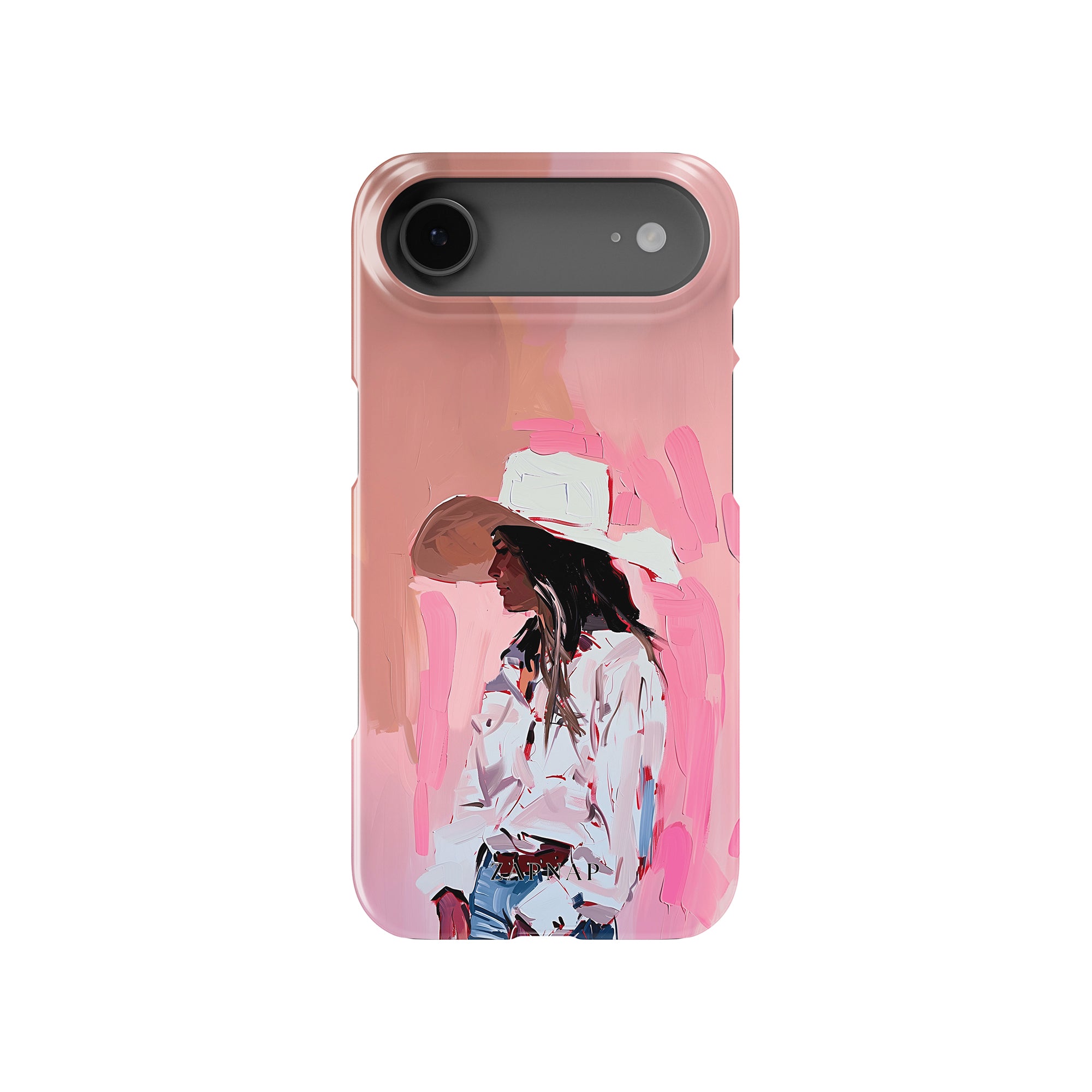 Texas Serenade portretteert een contemplatieve cowgirl, die de essentie van stille kracht en gratie vastlegt tegen een achtergrond van zachte, vloeiende roze tinten. De subtiele penseelstreken benadrukken haar evenwichtige houding en de tijdloze geest van de Lone Star State.