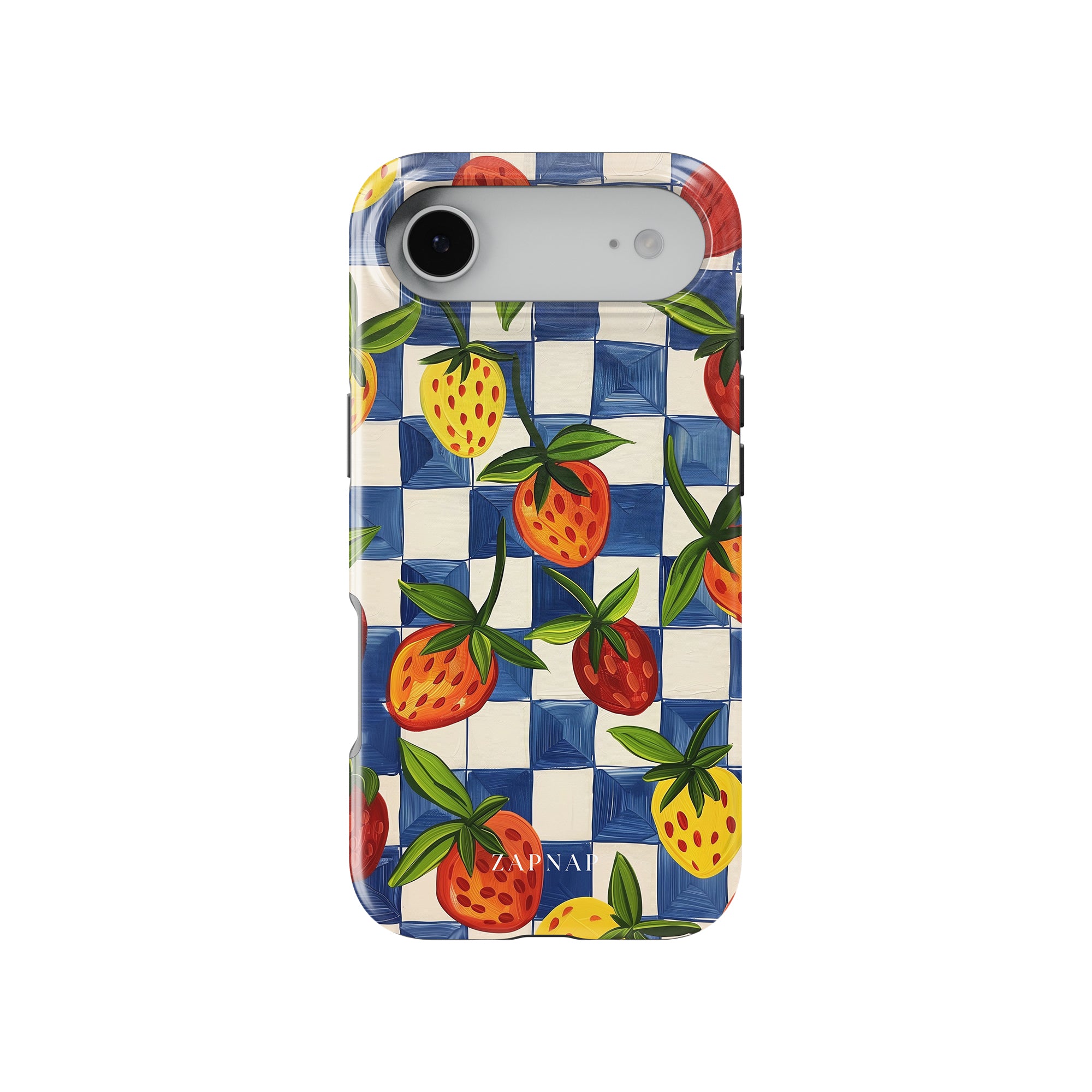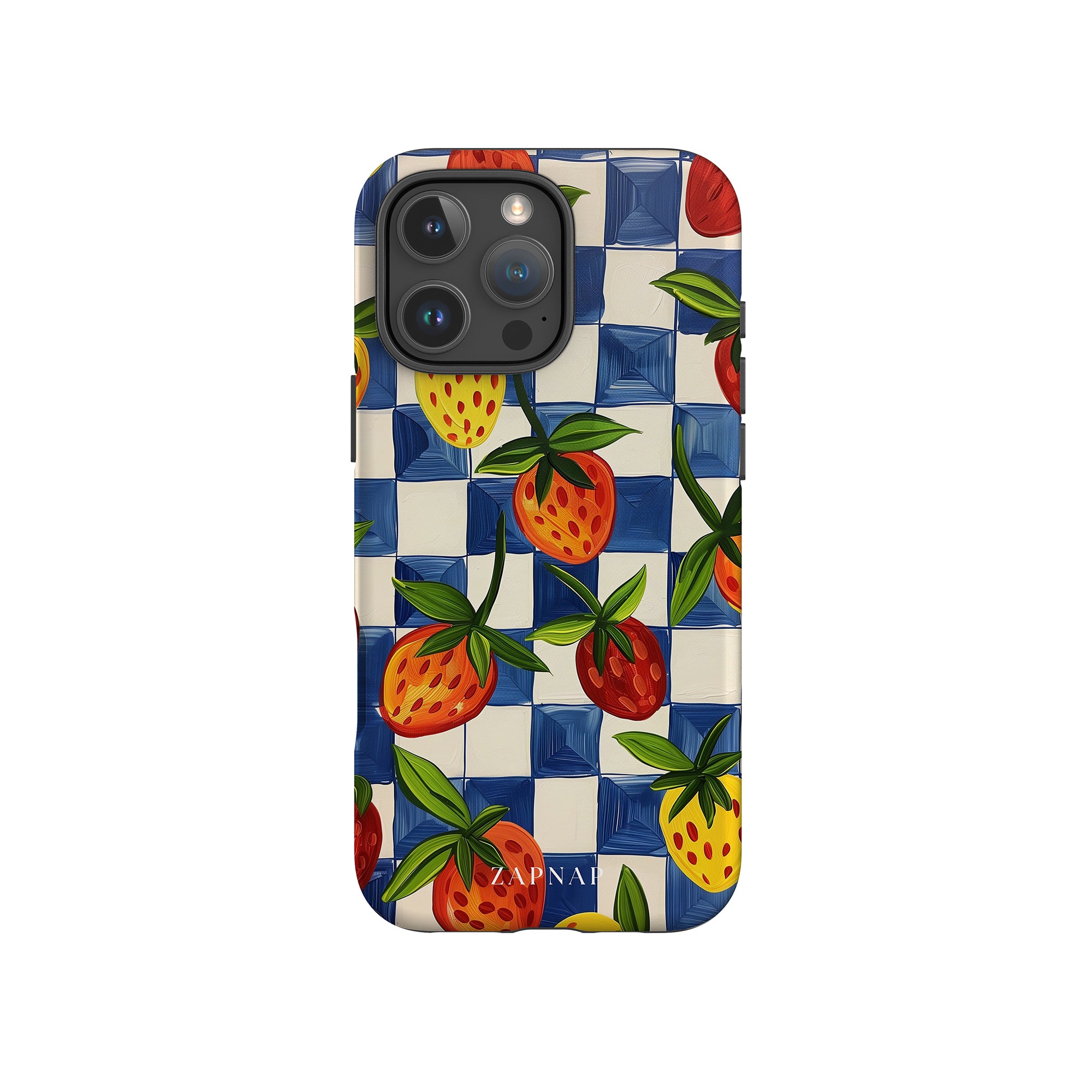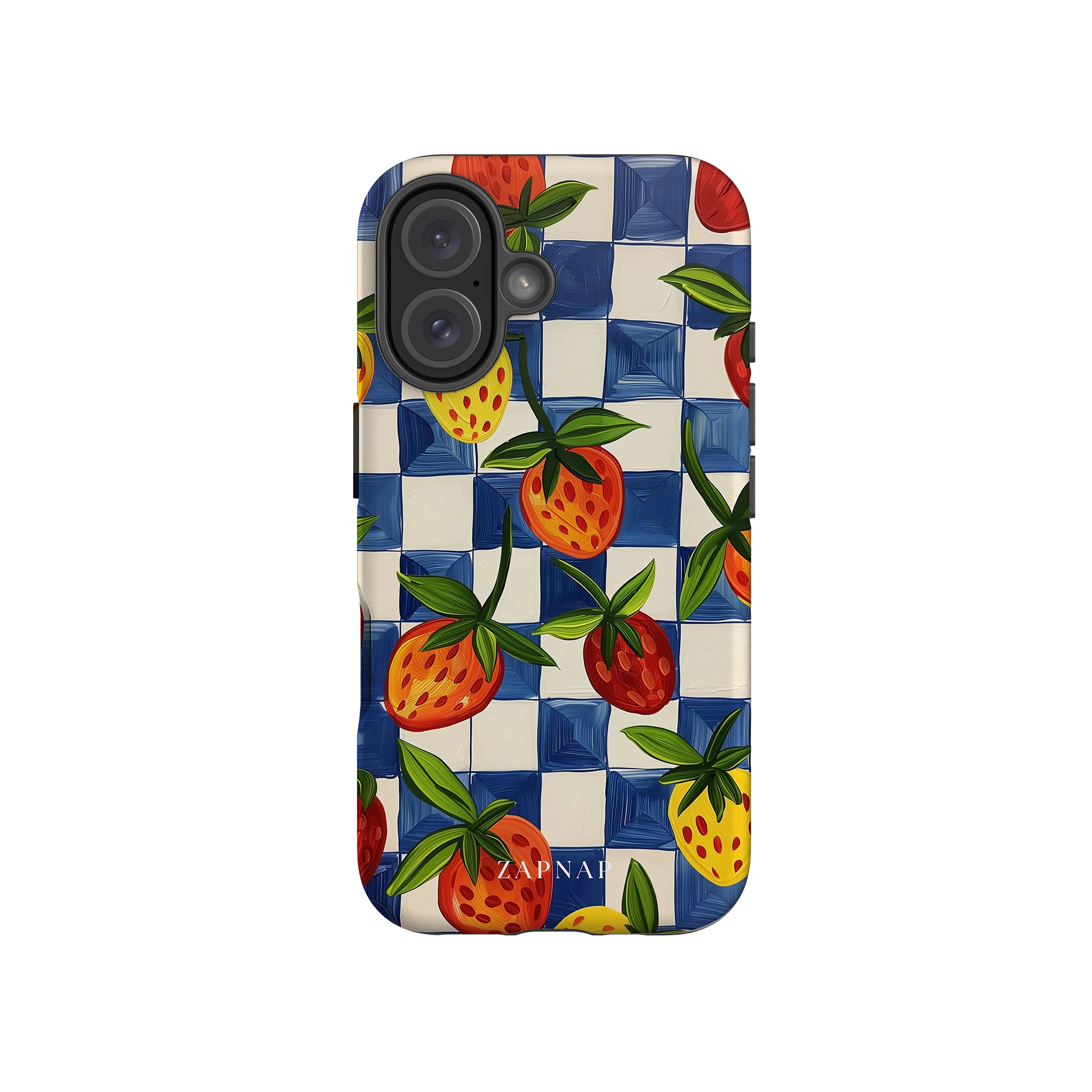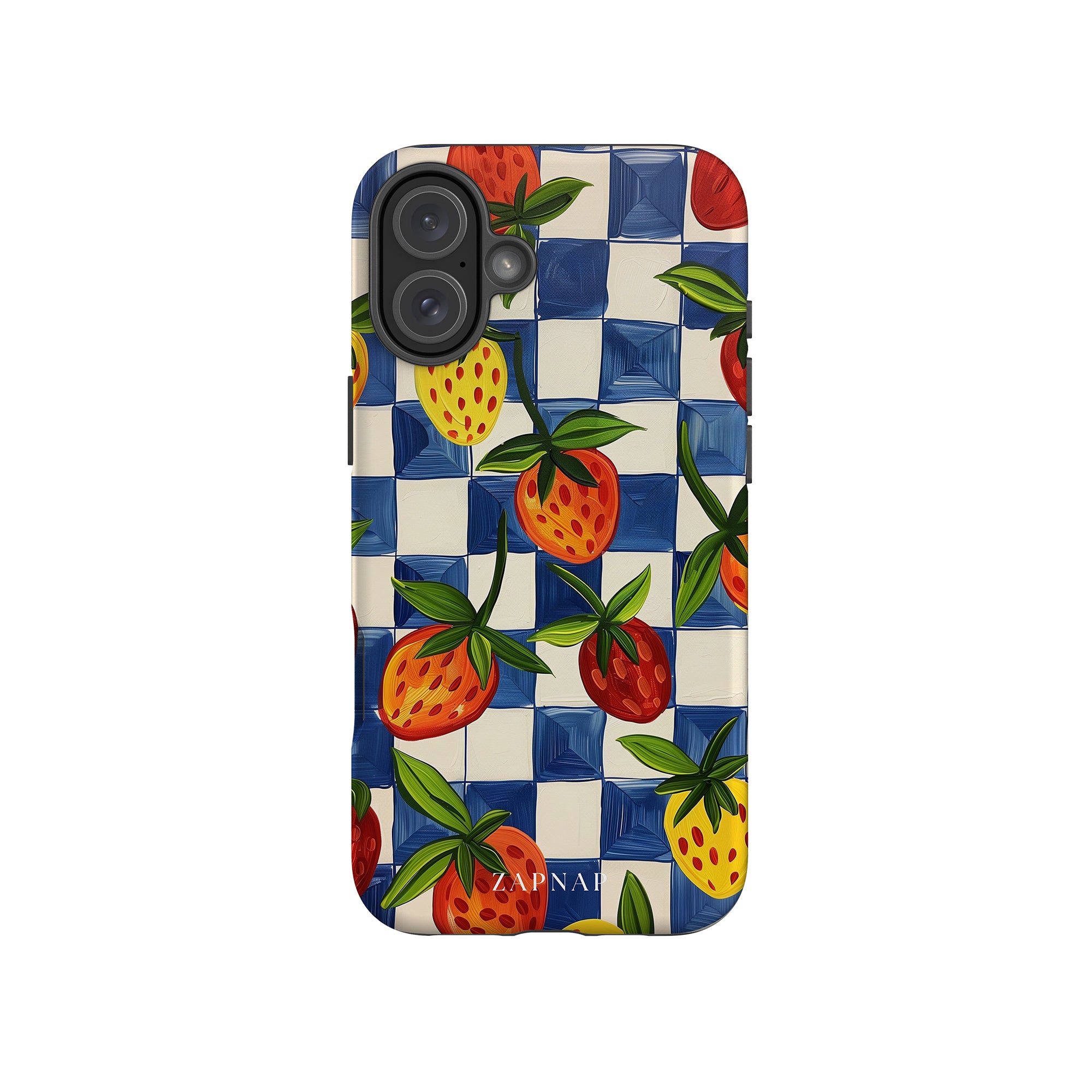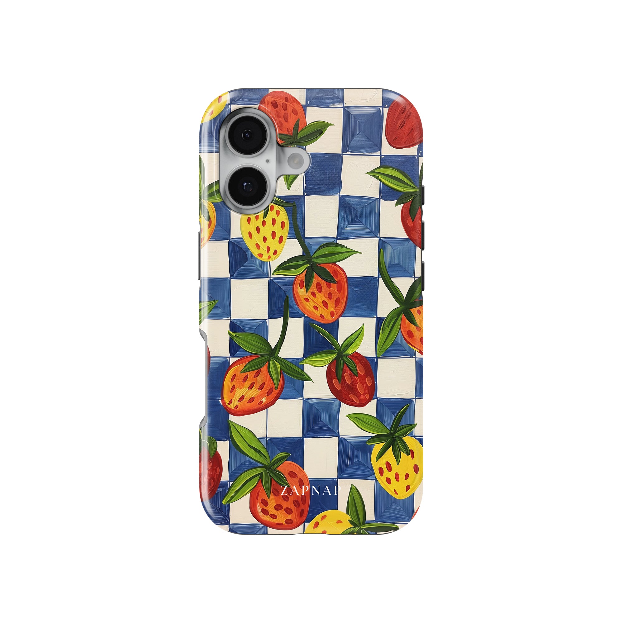 Dit speelse ontwerp brengt een vleugje kleur en vreugde met zijn levendige aardbeien tegen een klassieke blauw-wit geblokte achtergrond. Het levendige contrast tussen de rijke rode, gele en groene tinten van de bessen en de frisse ruiten roepen een heerlijk gevoel van zomerse frisheid en zorgeloos buitenplezier op. Perfect om elke ruimte op te fleuren met een vleugje fruitige charme.