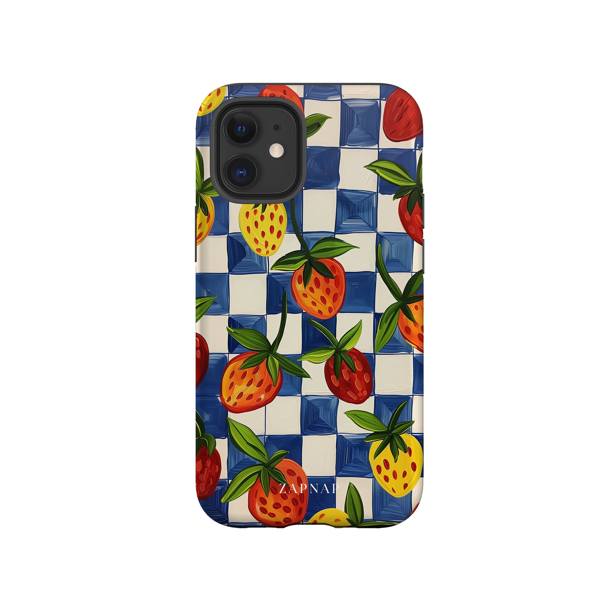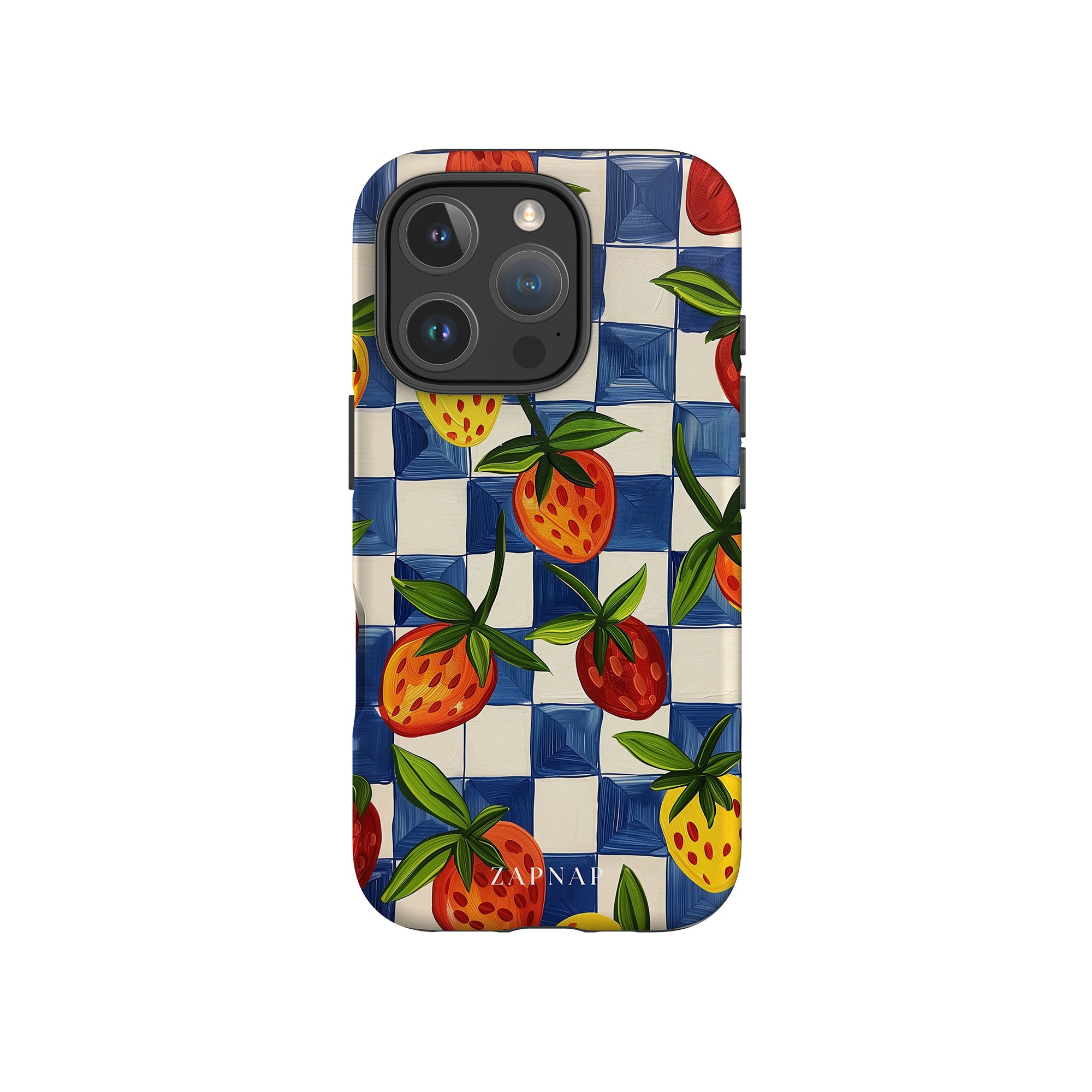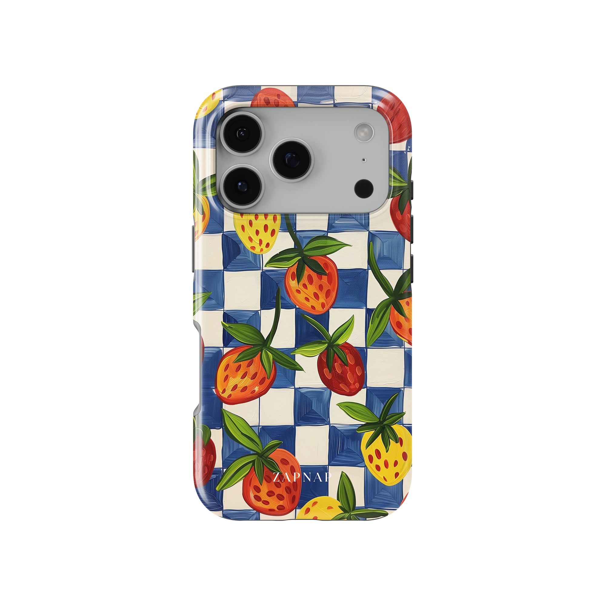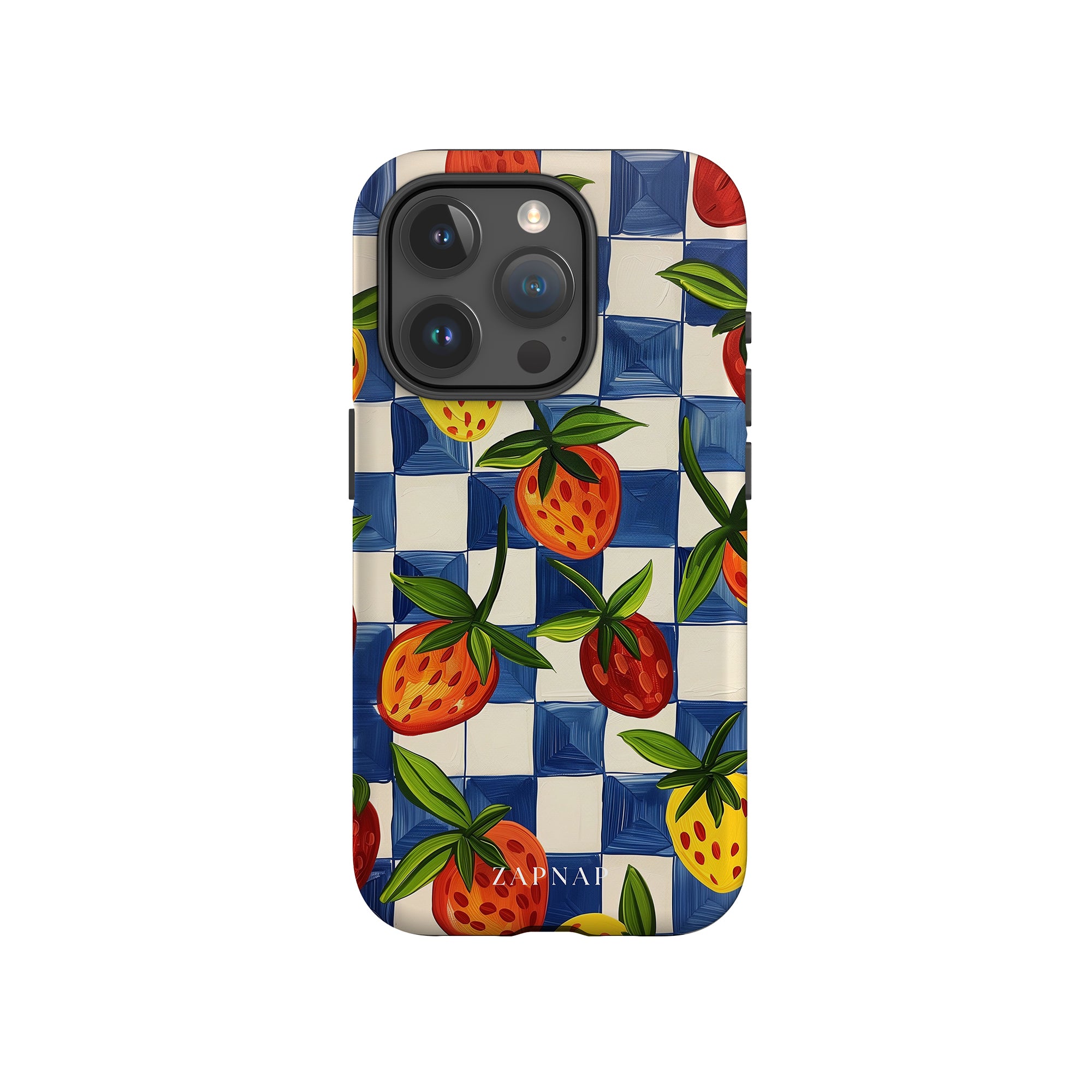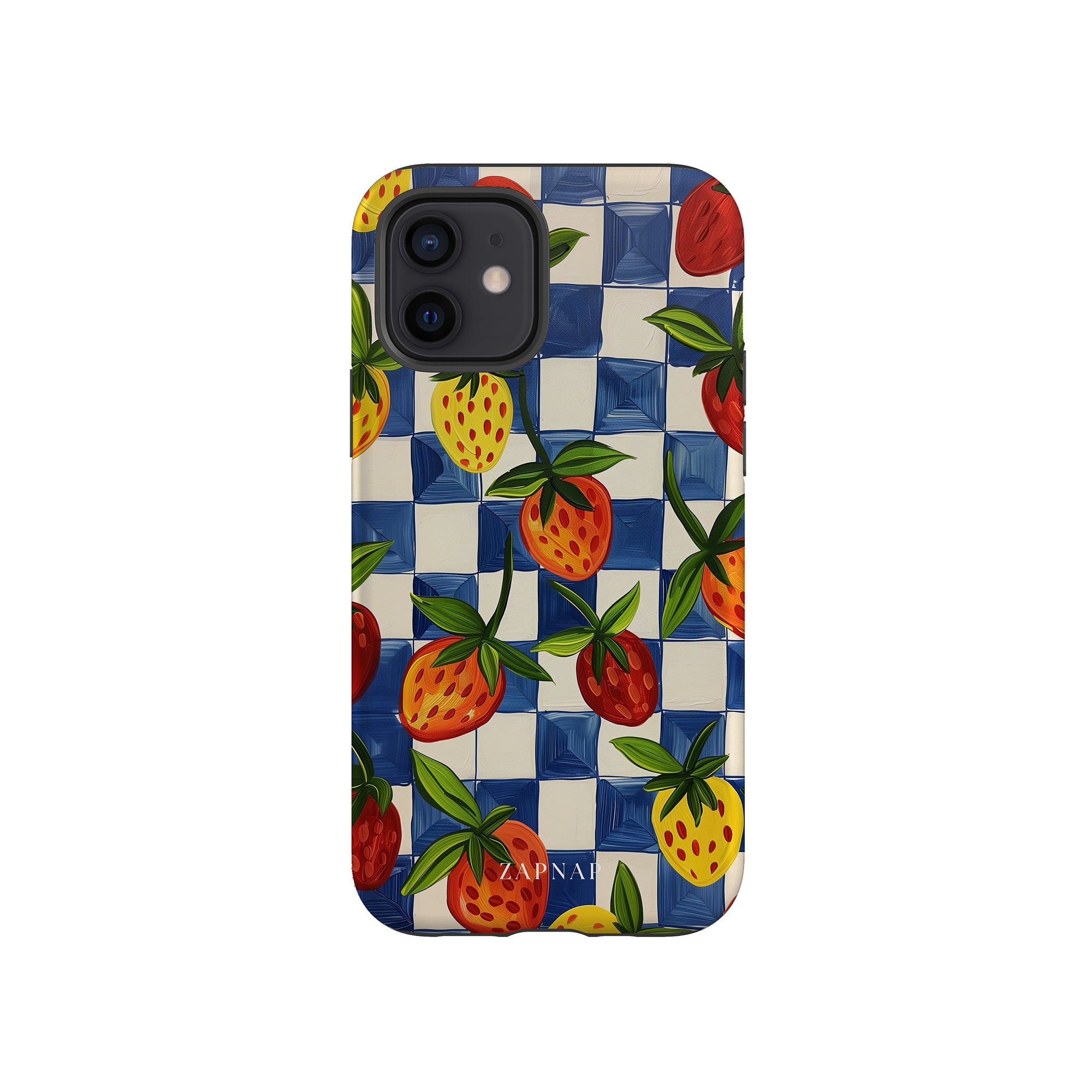 Dit speelse ontwerp brengt een vleugje kleur en vreugde met zijn levendige aardbeien tegen een klassieke blauw-wit geblokte achtergrond. Het levendige contrast tussen de rijke rode, gele en groene tinten van de bessen en de frisse ruiten roepen een heerlijk gevoel van zomerse frisheid en zorgeloos buitenplezier op. Perfect om elke ruimte op te fleuren met een vleugje fruitige charme.
