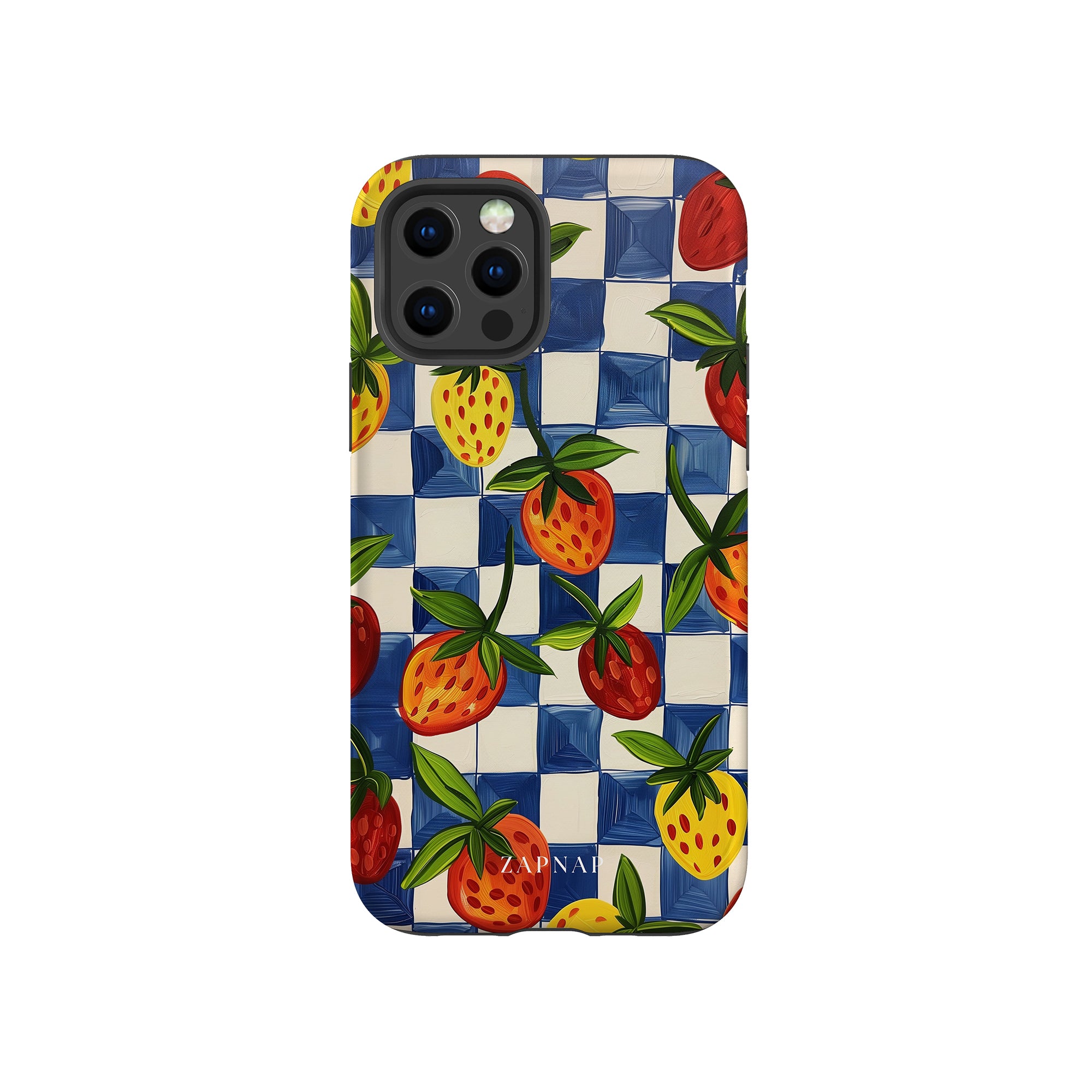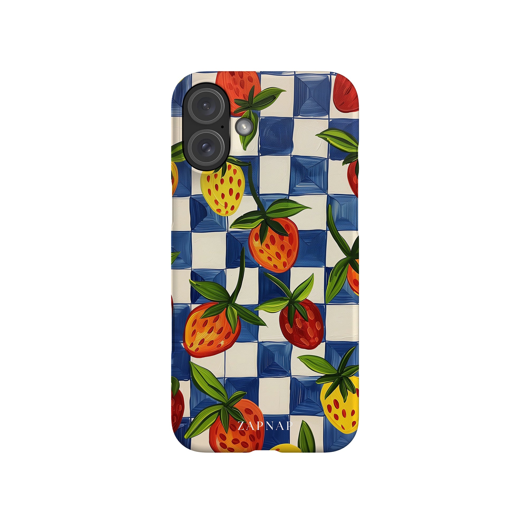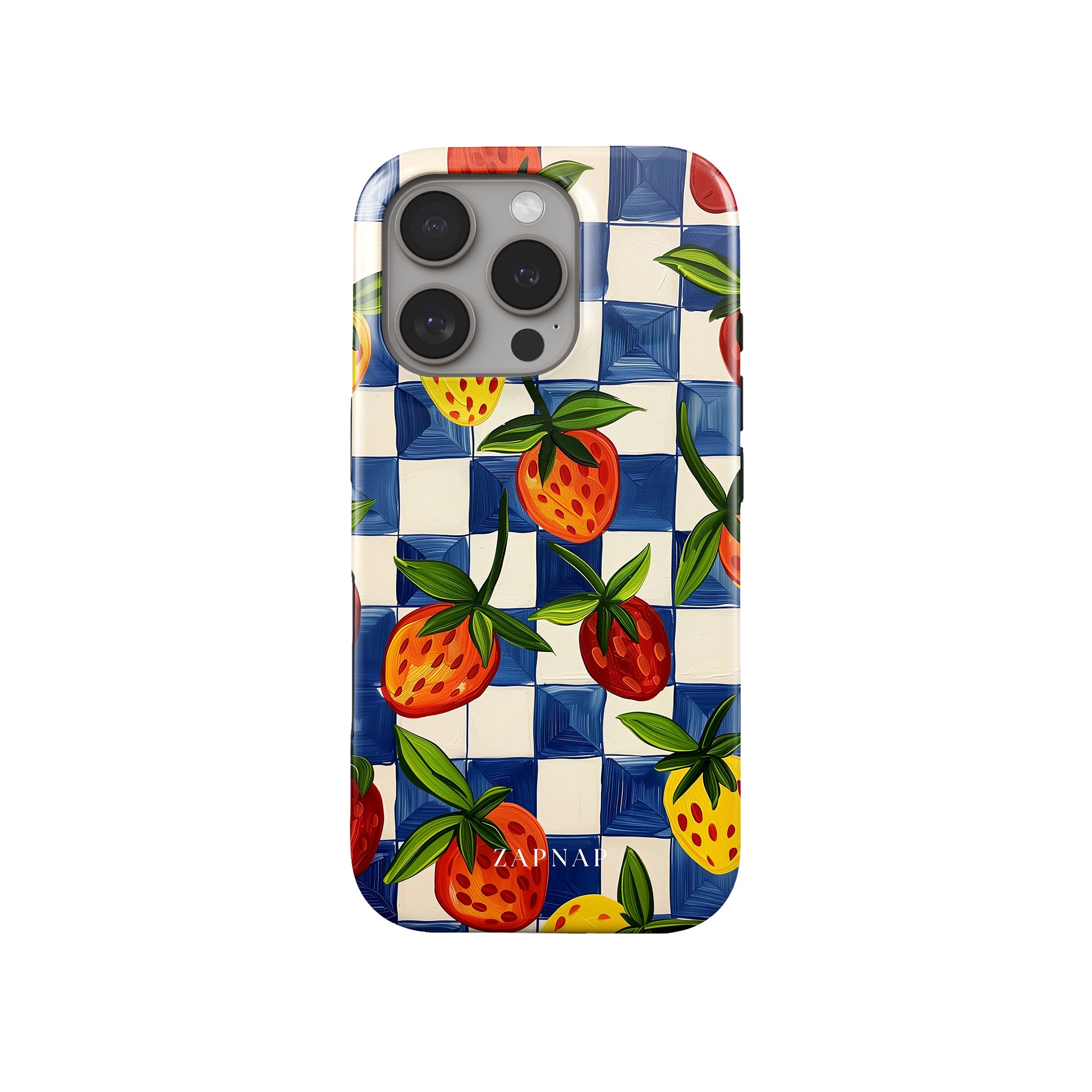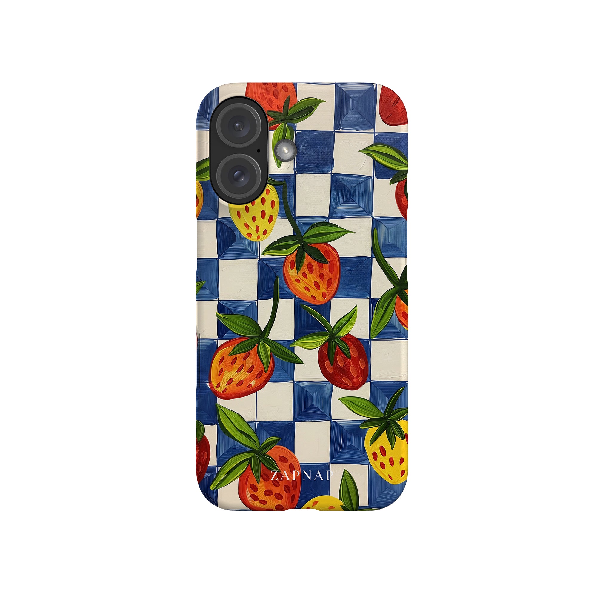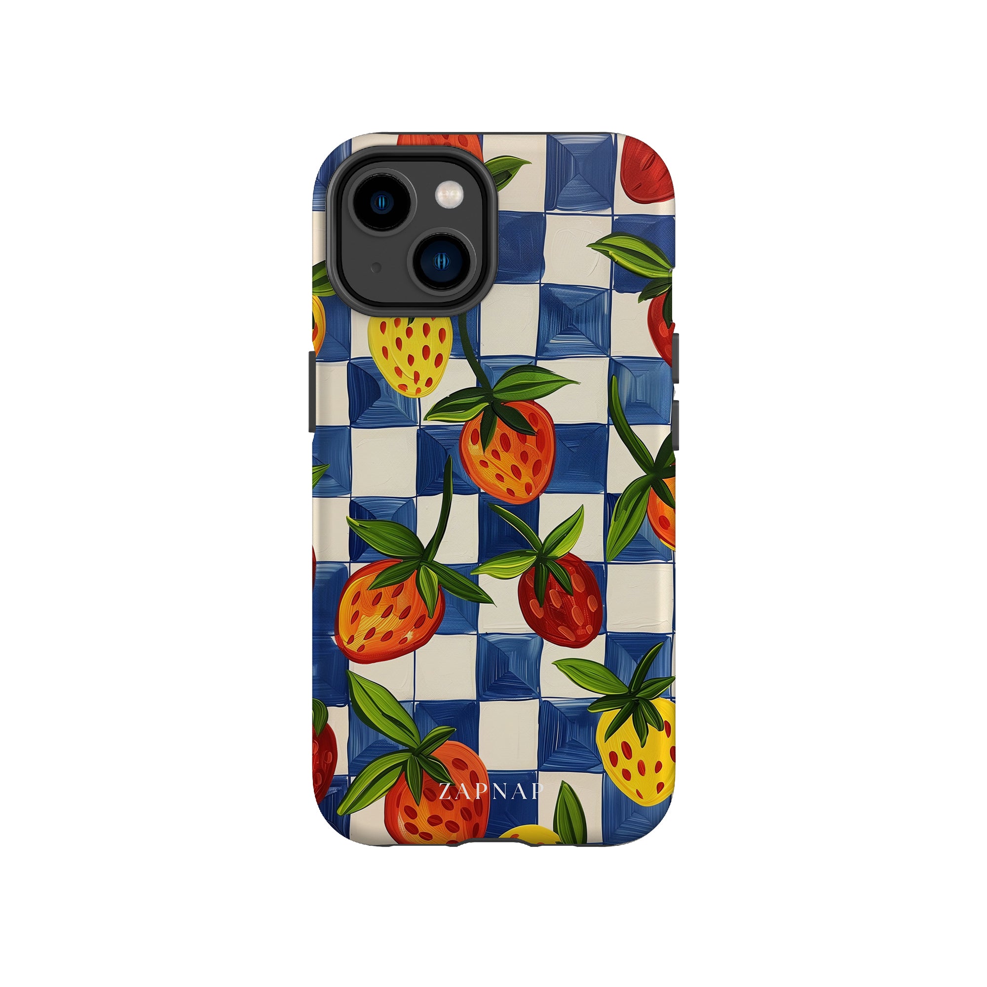 Dit speelse ontwerp brengt een vleugje kleur en vreugde met zijn levendige aardbeien tegen een klassieke blauw-wit geblokte achtergrond. Het levendige contrast tussen de rijke rode, gele en groene tinten van de bessen en de frisse ruiten roepen een heerlijk gevoel van zomerse frisheid en zorgeloos buitenplezier op. Perfect om elke ruimte op te fleuren met een vleugje fruitige charme.