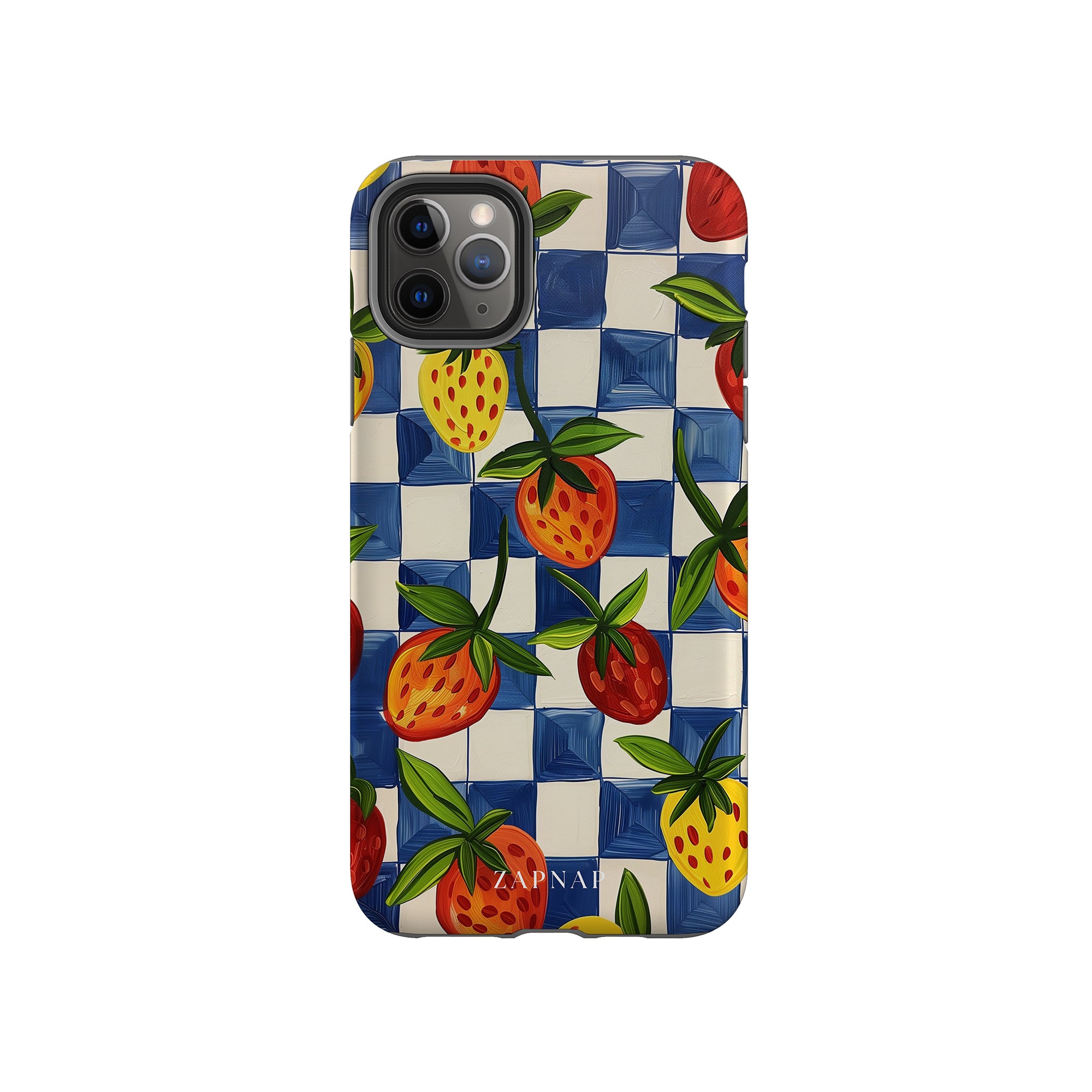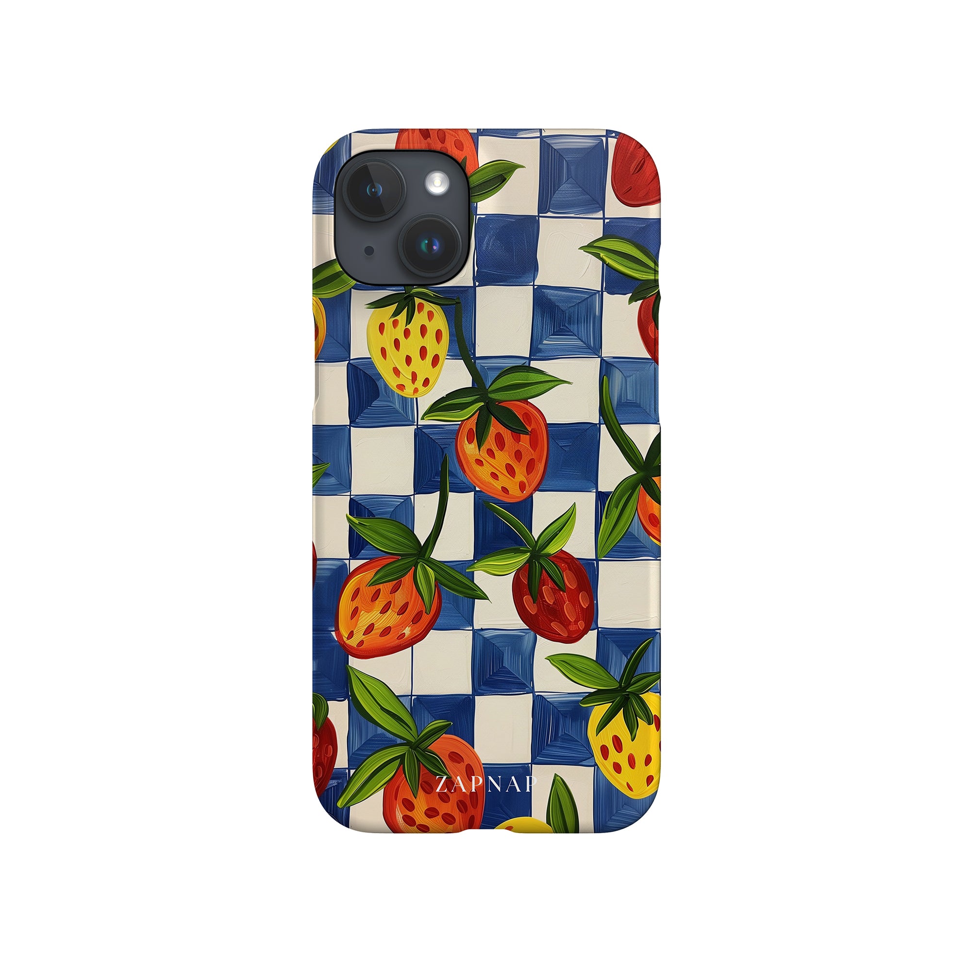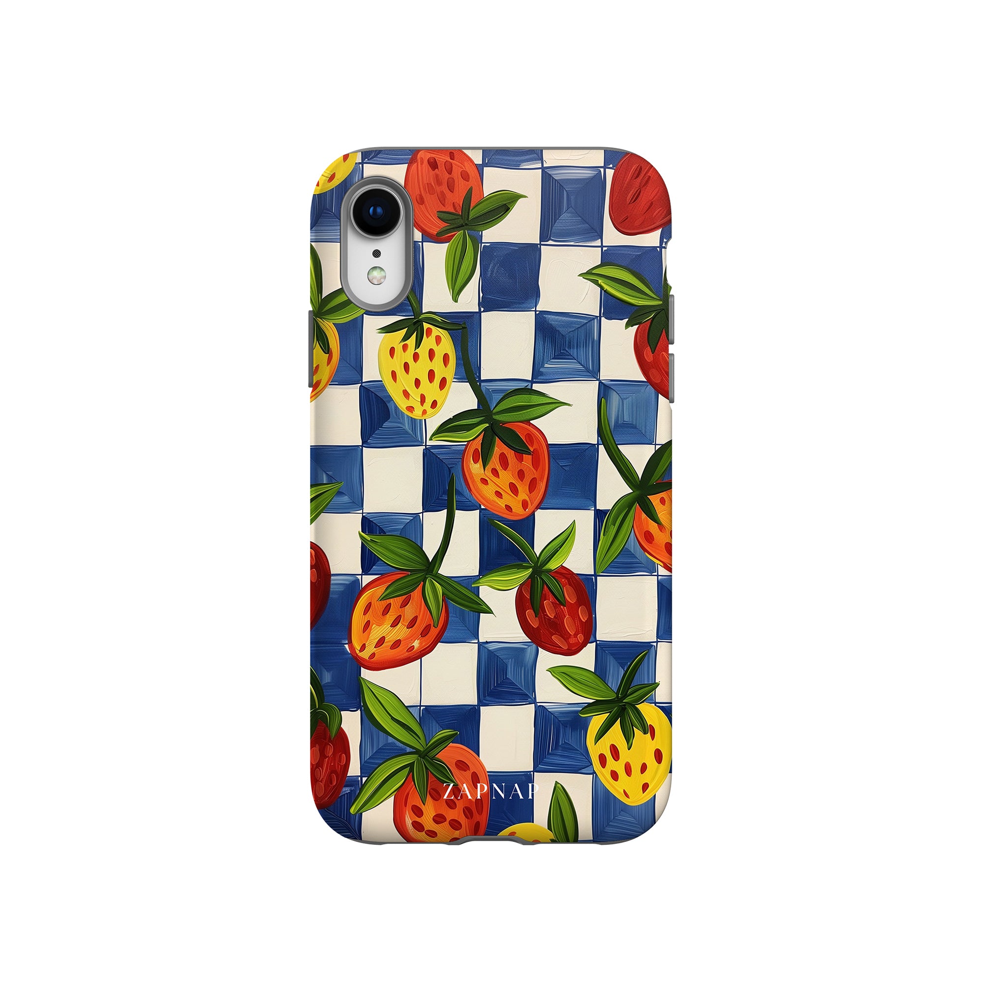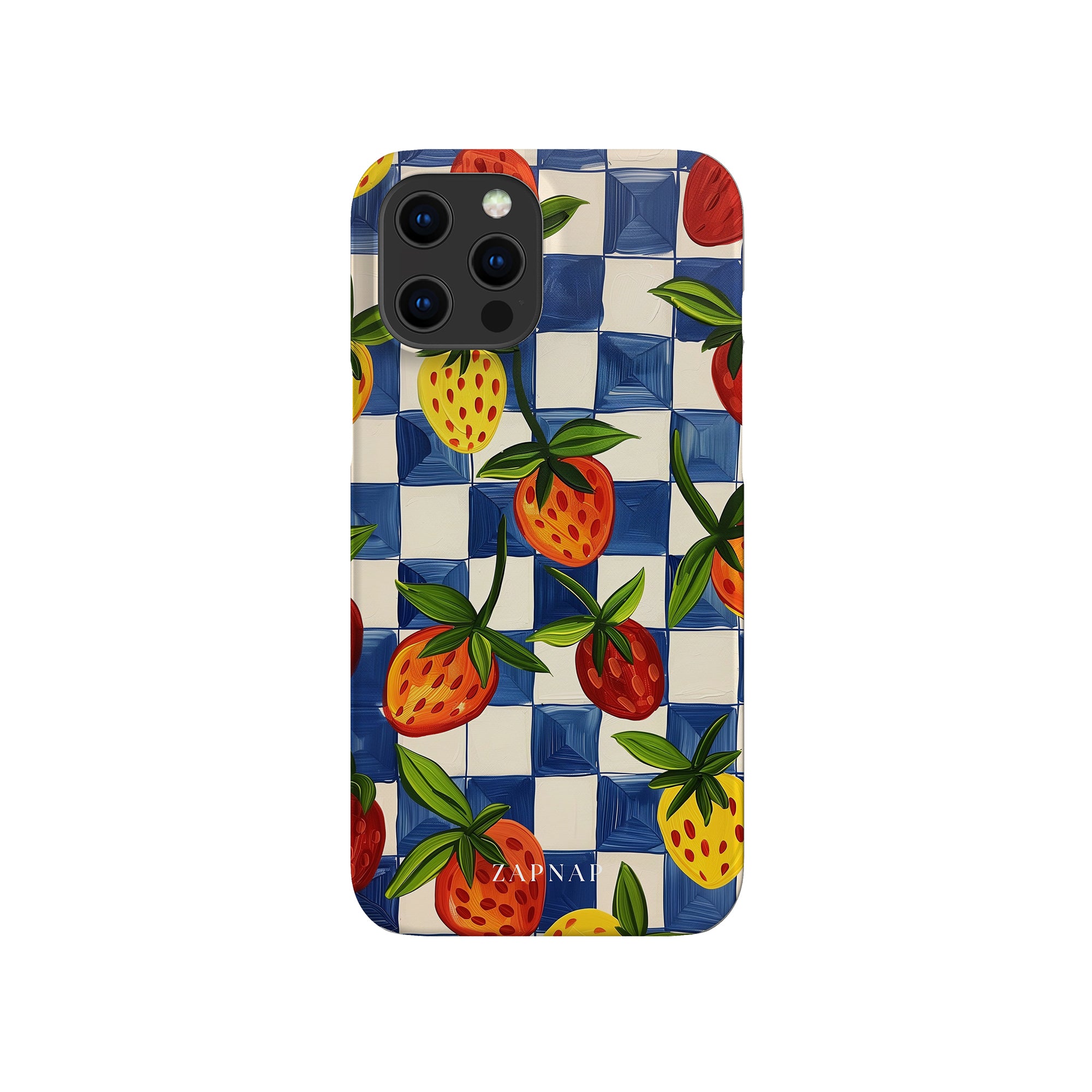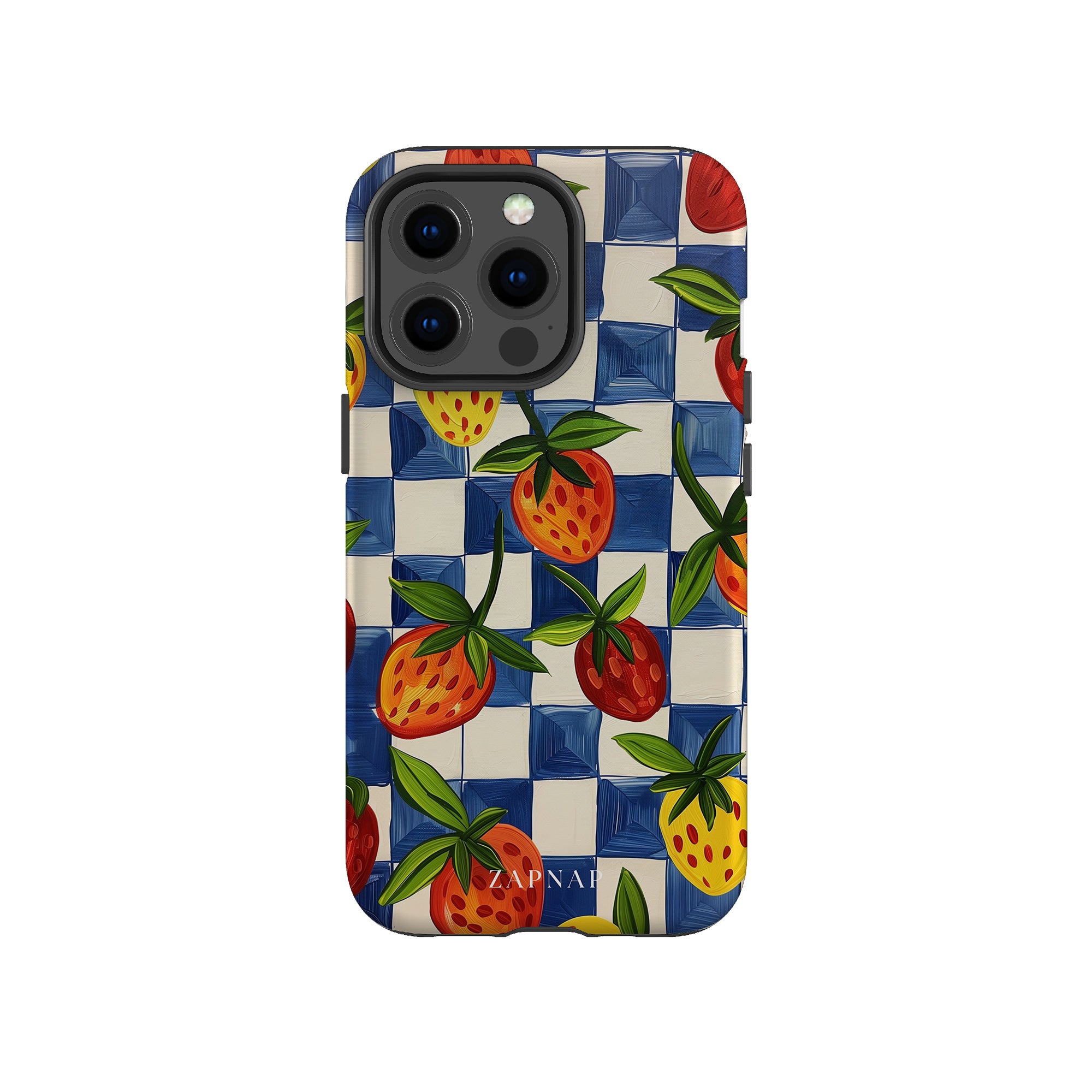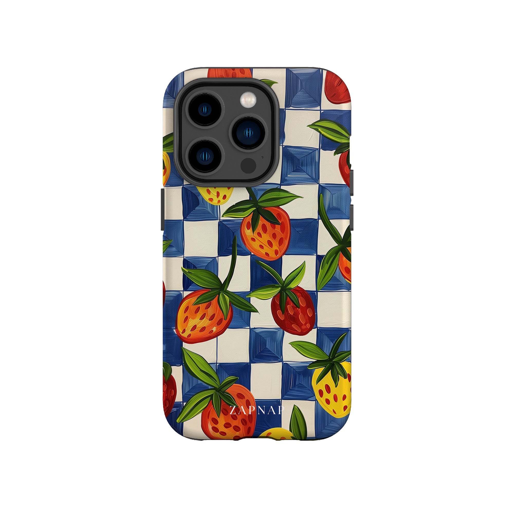 Dit speelse ontwerp brengt een vleugje kleur en vreugde met zijn levendige aardbeien tegen een klassieke blauw-wit geblokte achtergrond. Het levendige contrast tussen de rijke rode, gele en groene tinten van de bessen en de frisse ruiten roepen een heerlijk gevoel van zomerse frisheid en zorgeloos buitenplezier op. Perfect om elke ruimte op te fleuren met een vleugje fruitige charme.