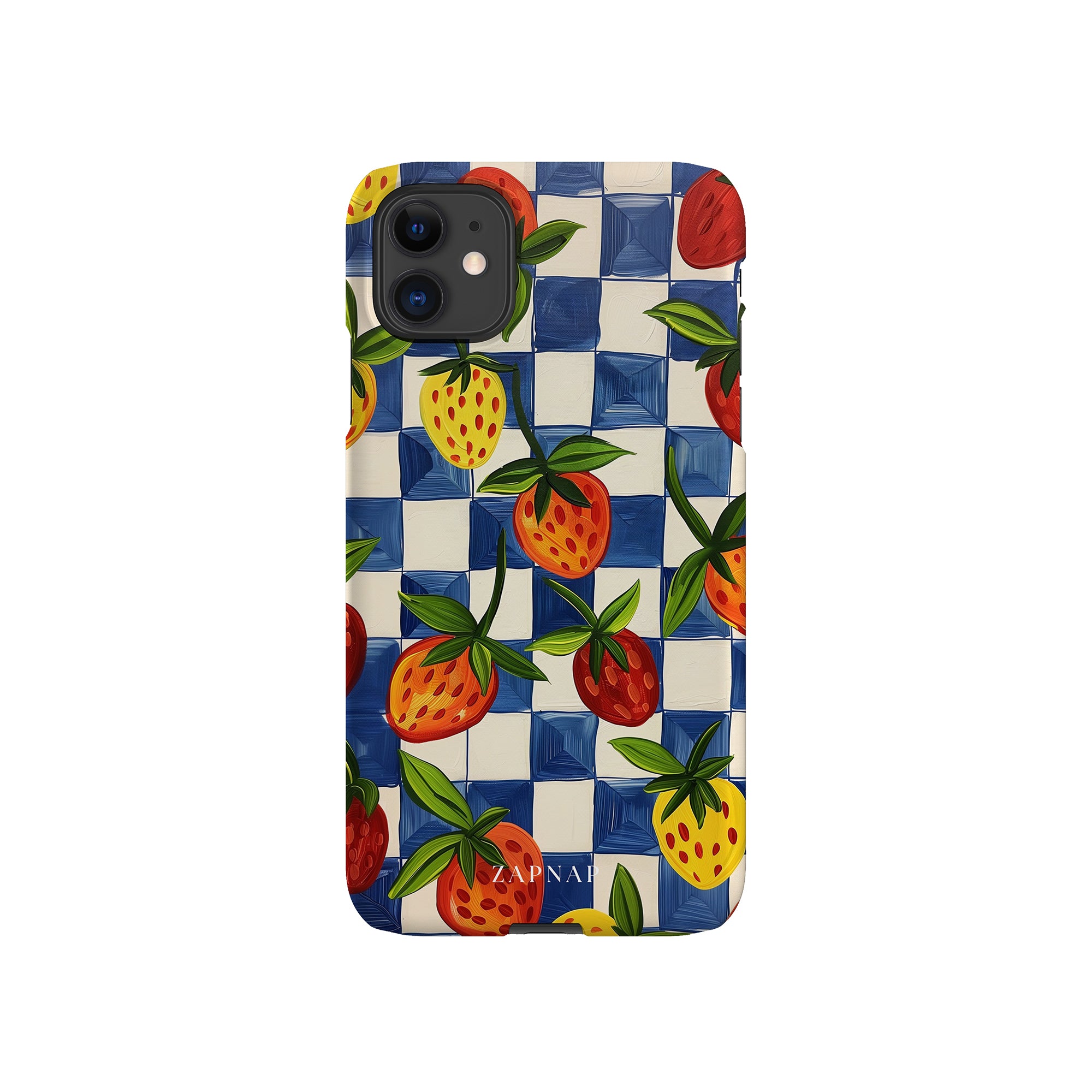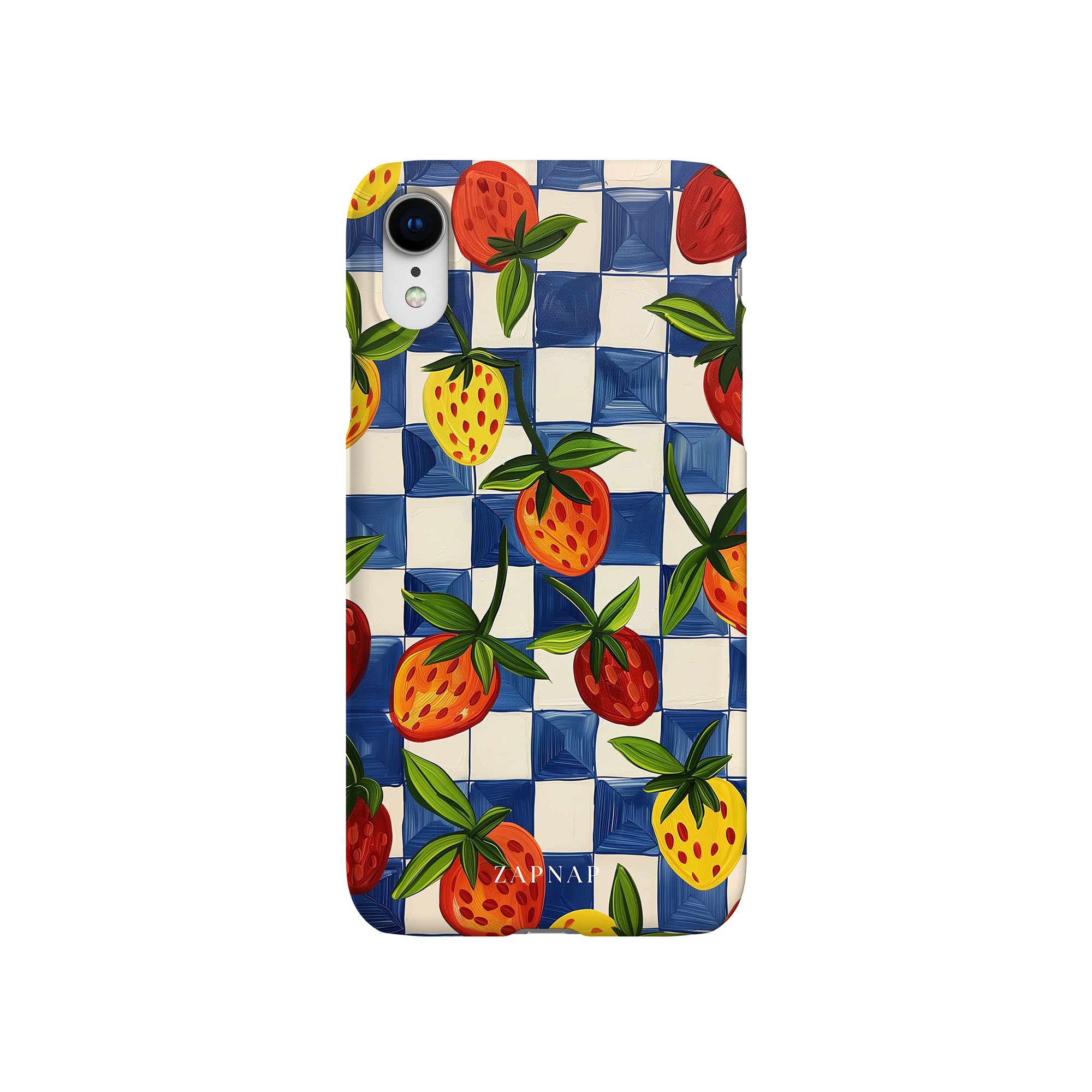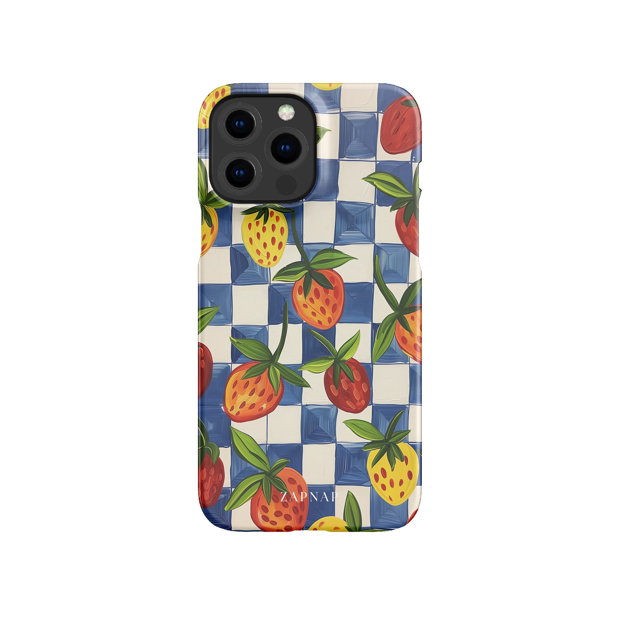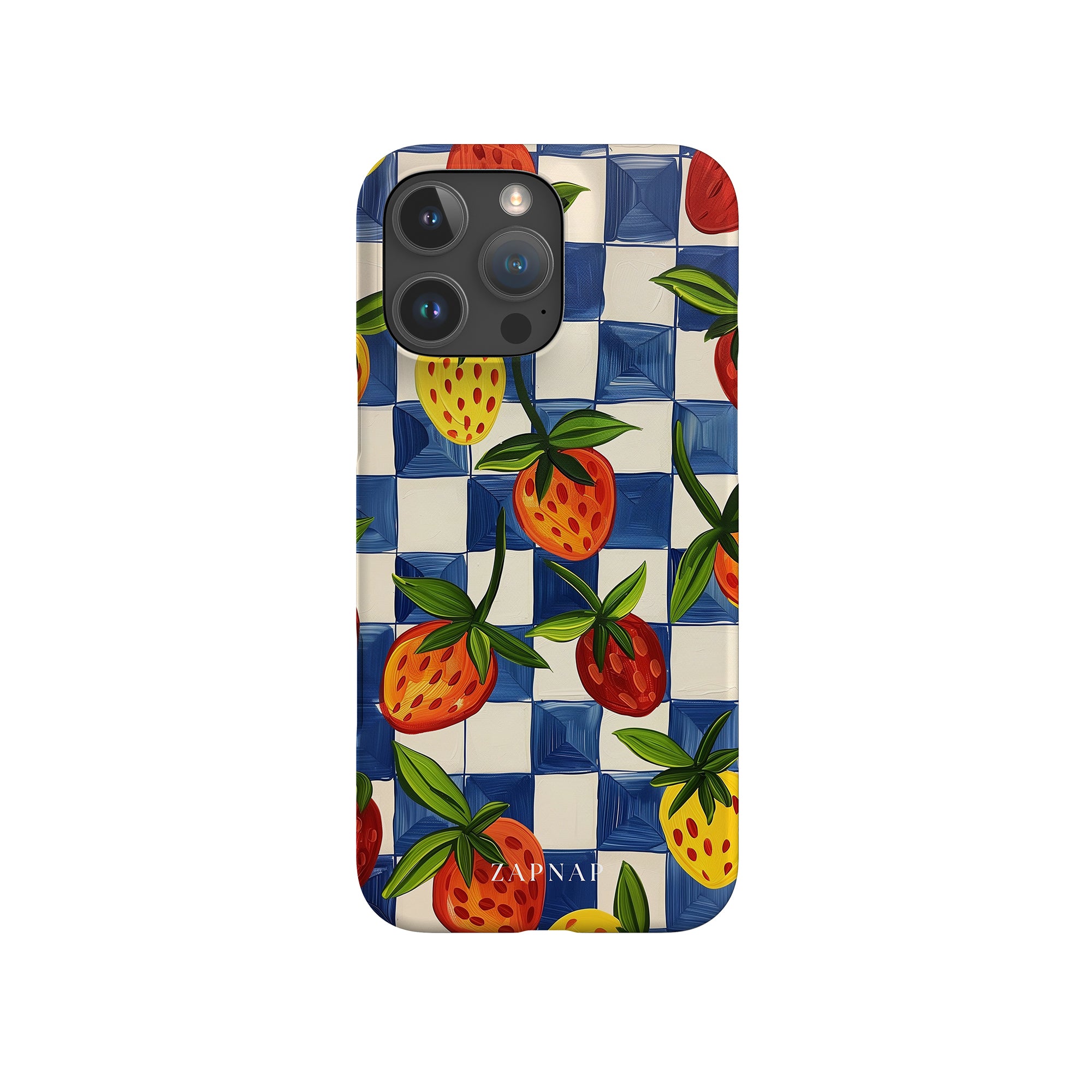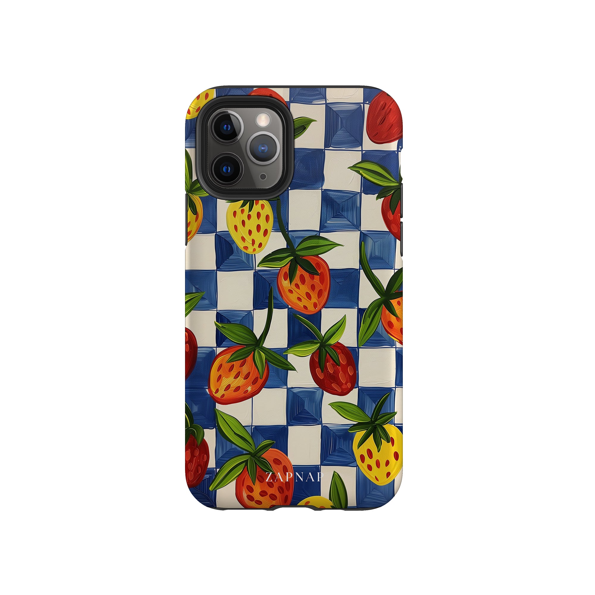 Dit speelse ontwerp brengt een vleugje kleur en vreugde met zijn levendige aardbeien tegen een klassieke blauw-wit geblokte achtergrond. Het levendige contrast tussen de rijke rode, gele en groene tinten van de bessen en de frisse ruiten roepen een heerlijk gevoel van zomerse frisheid en zorgeloos buitenplezier op. Perfect om elke ruimte op te fleuren met een vleugje fruitige charme.