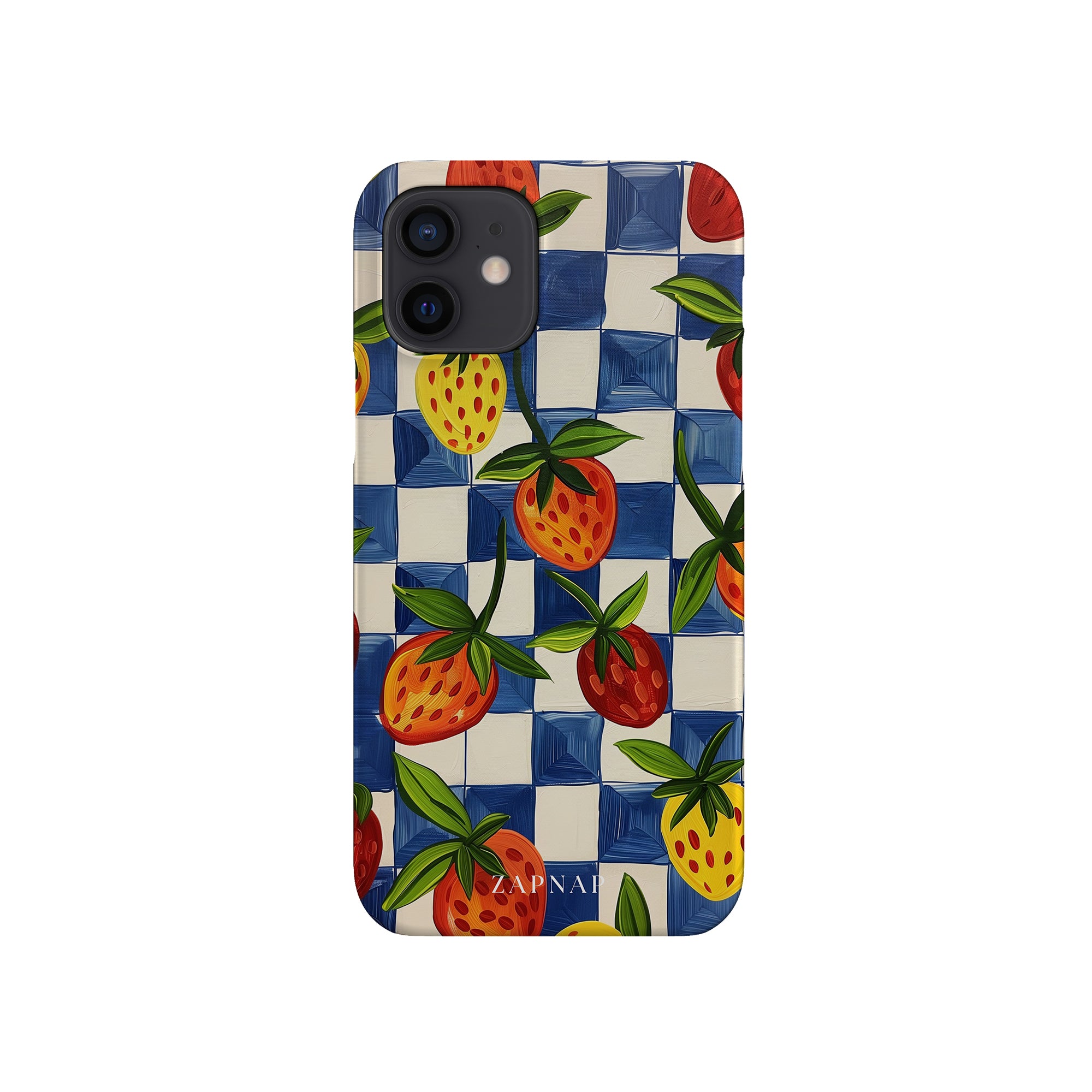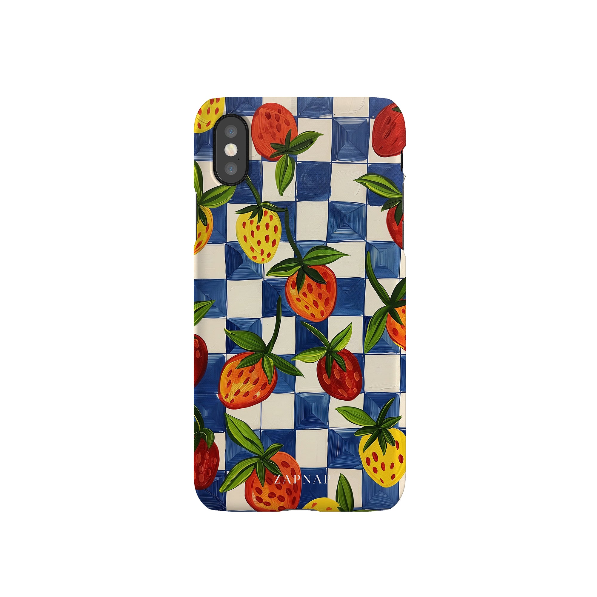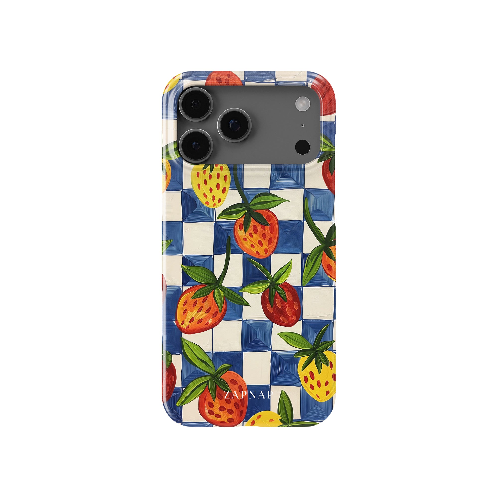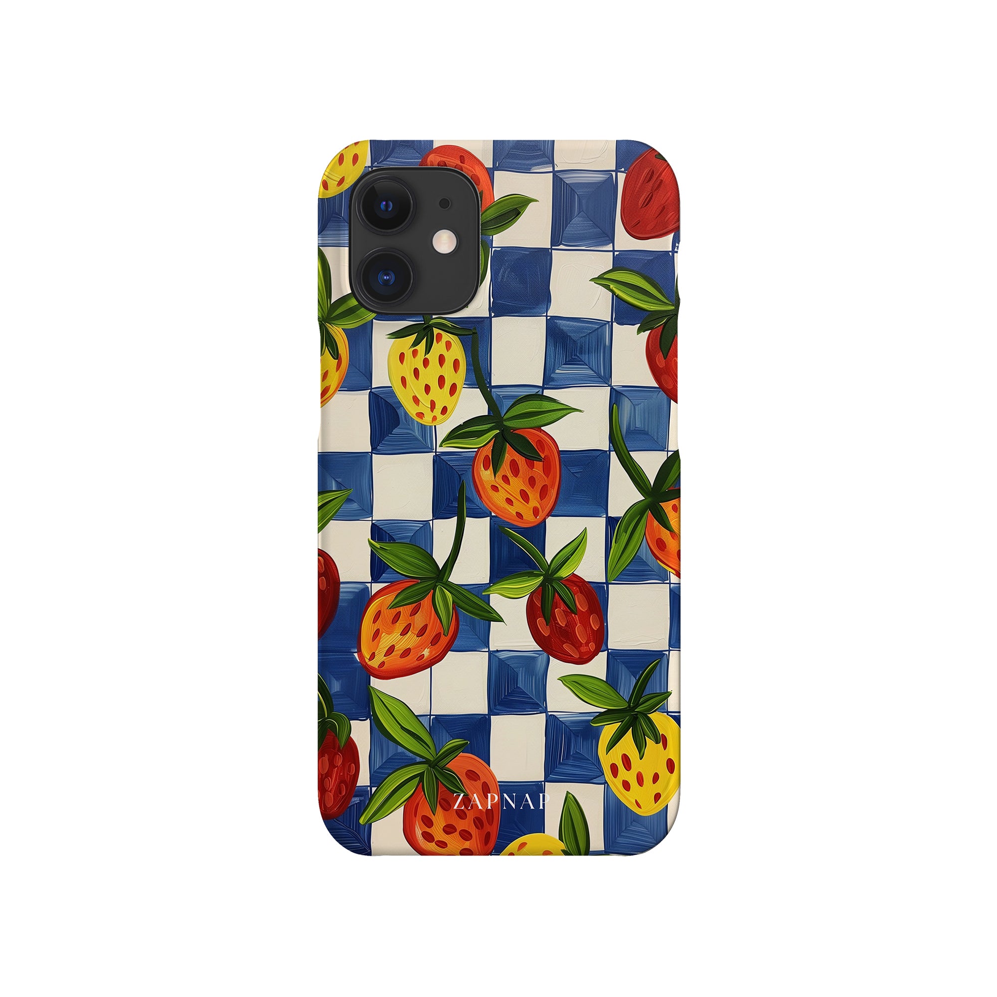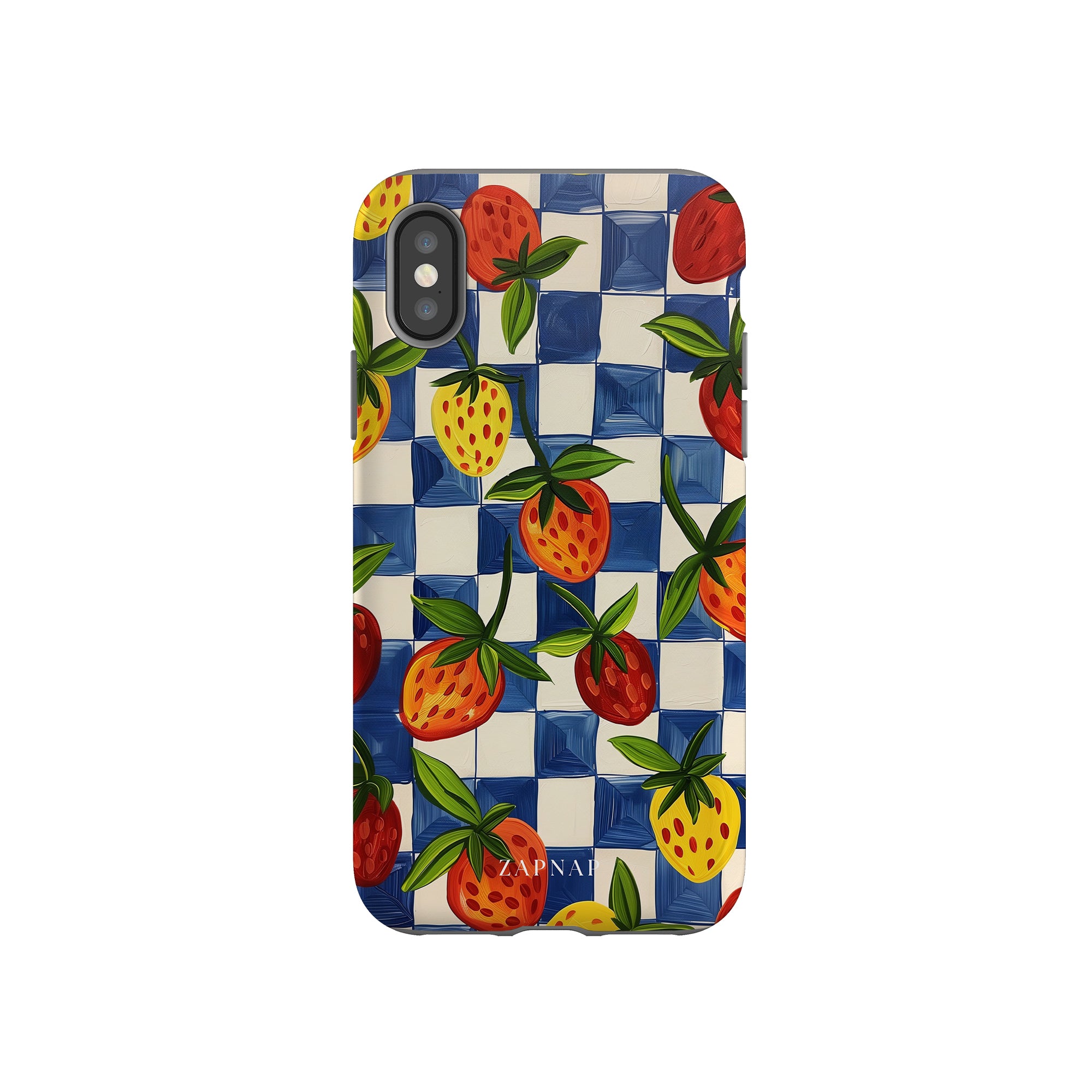 Dit speelse ontwerp brengt een vleugje kleur en vreugde met zijn levendige aardbeien tegen een klassieke blauw-wit geblokte achtergrond. Het levendige contrast tussen de rijke rode, gele en groene tinten van de bessen en de frisse ruiten roepen een heerlijk gevoel van zomerse frisheid en zorgeloos buitenplezier op. Perfect om elke ruimte op te fleuren met een vleugje fruitige charme.