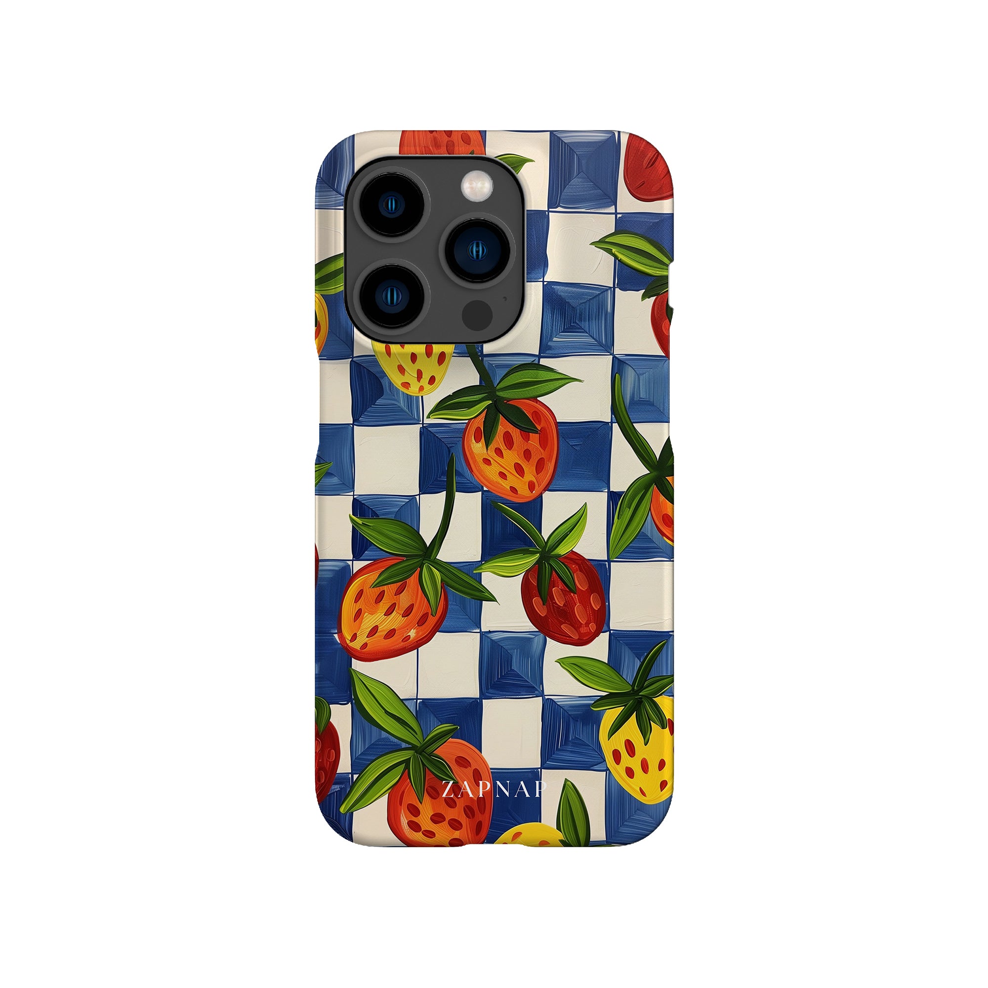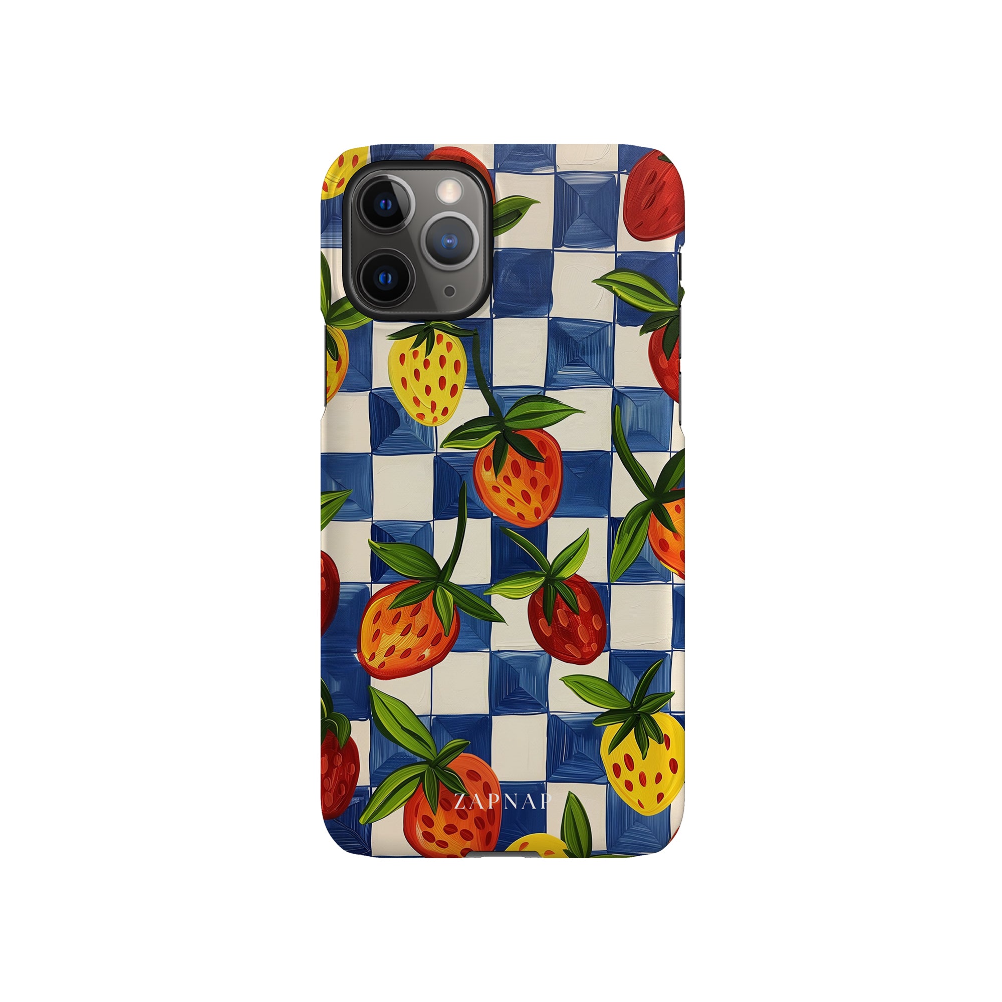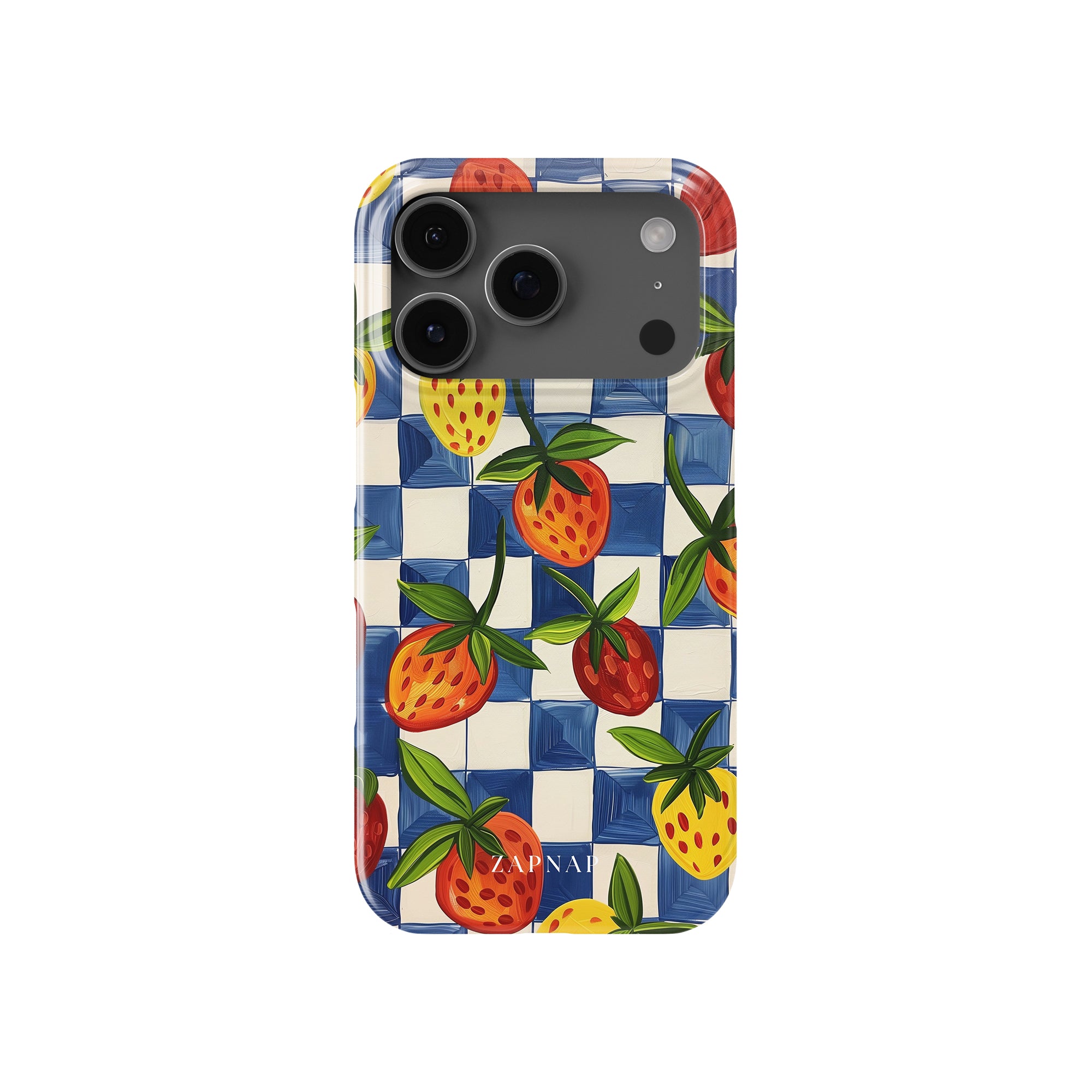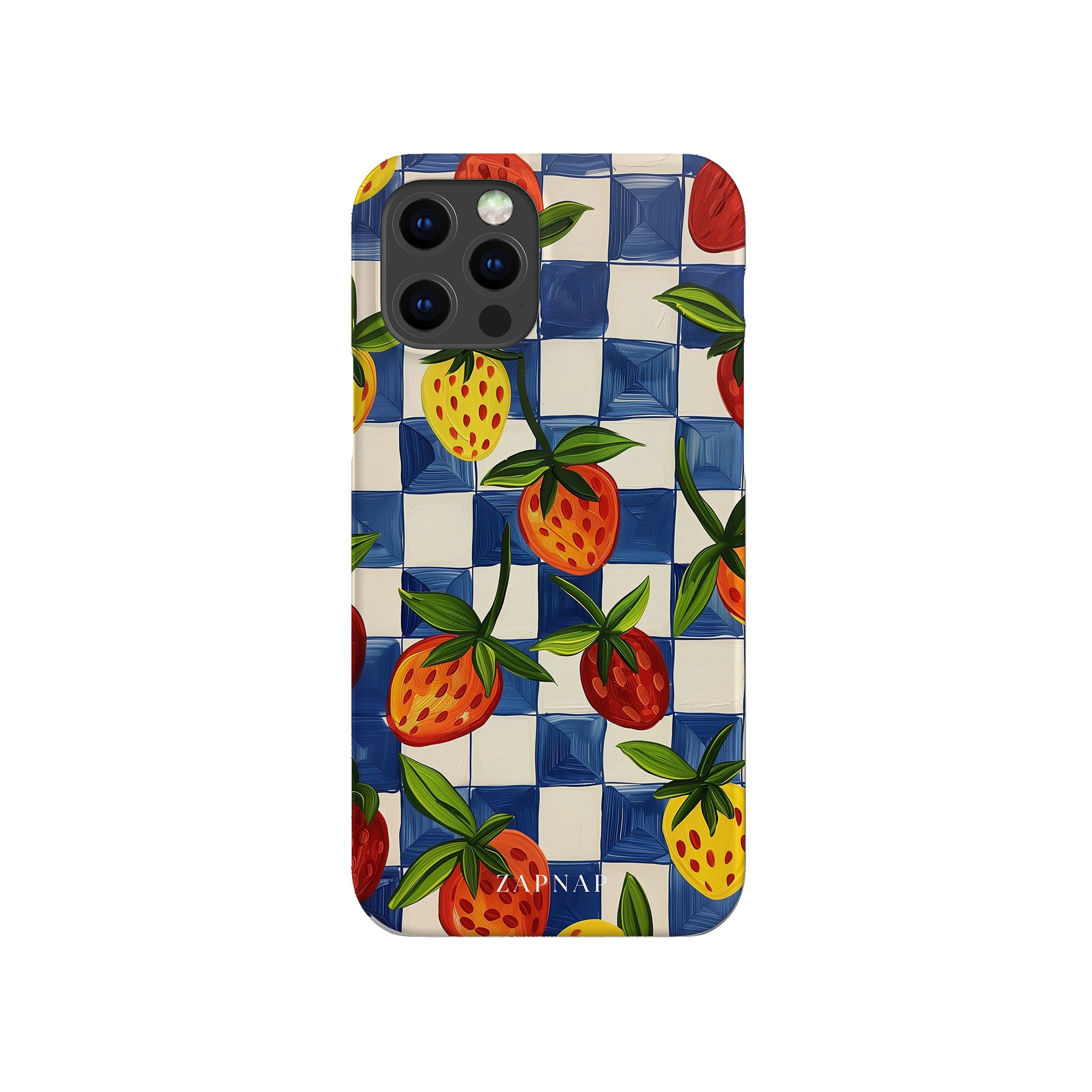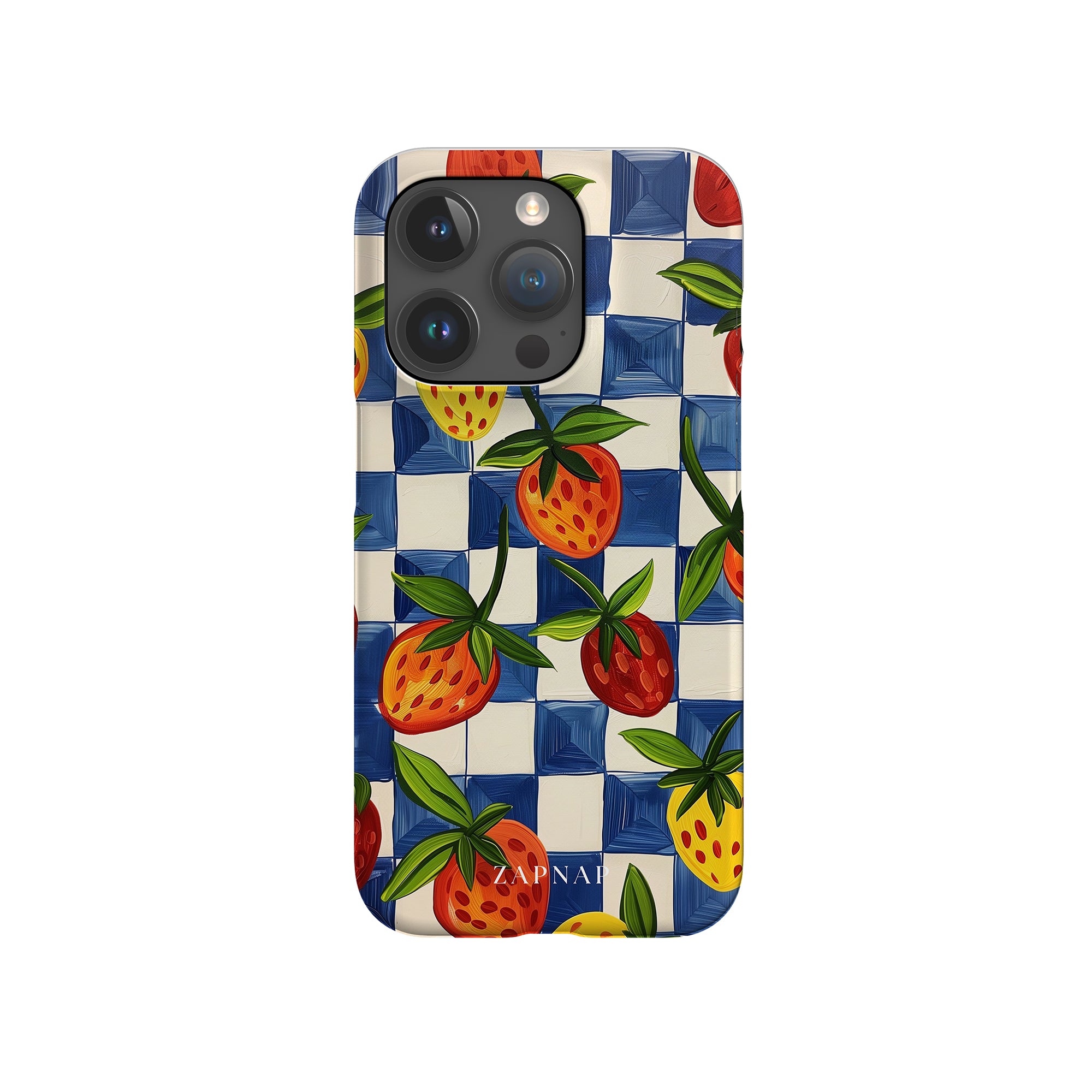 Dit speelse ontwerp brengt een vleugje kleur en vreugde met zijn levendige aardbeien tegen een klassieke blauw-wit geblokte achtergrond. Het levendige contrast tussen de rijke rode, gele en groene tinten van de bessen en de frisse ruiten roepen een heerlijk gevoel van zomerse frisheid en zorgeloos buitenplezier op. Perfect om elke ruimte op te fleuren met een vleugje fruitige charme.
