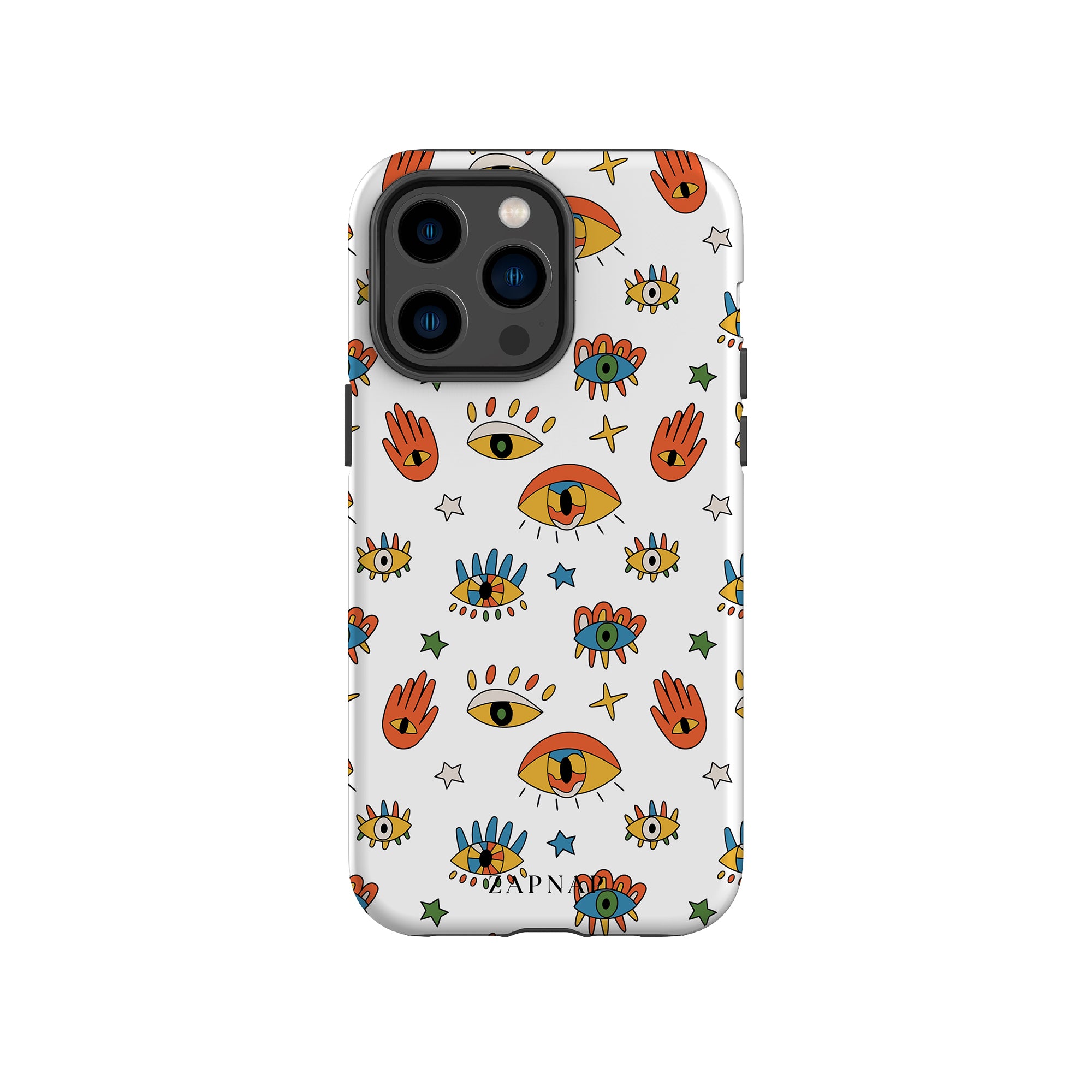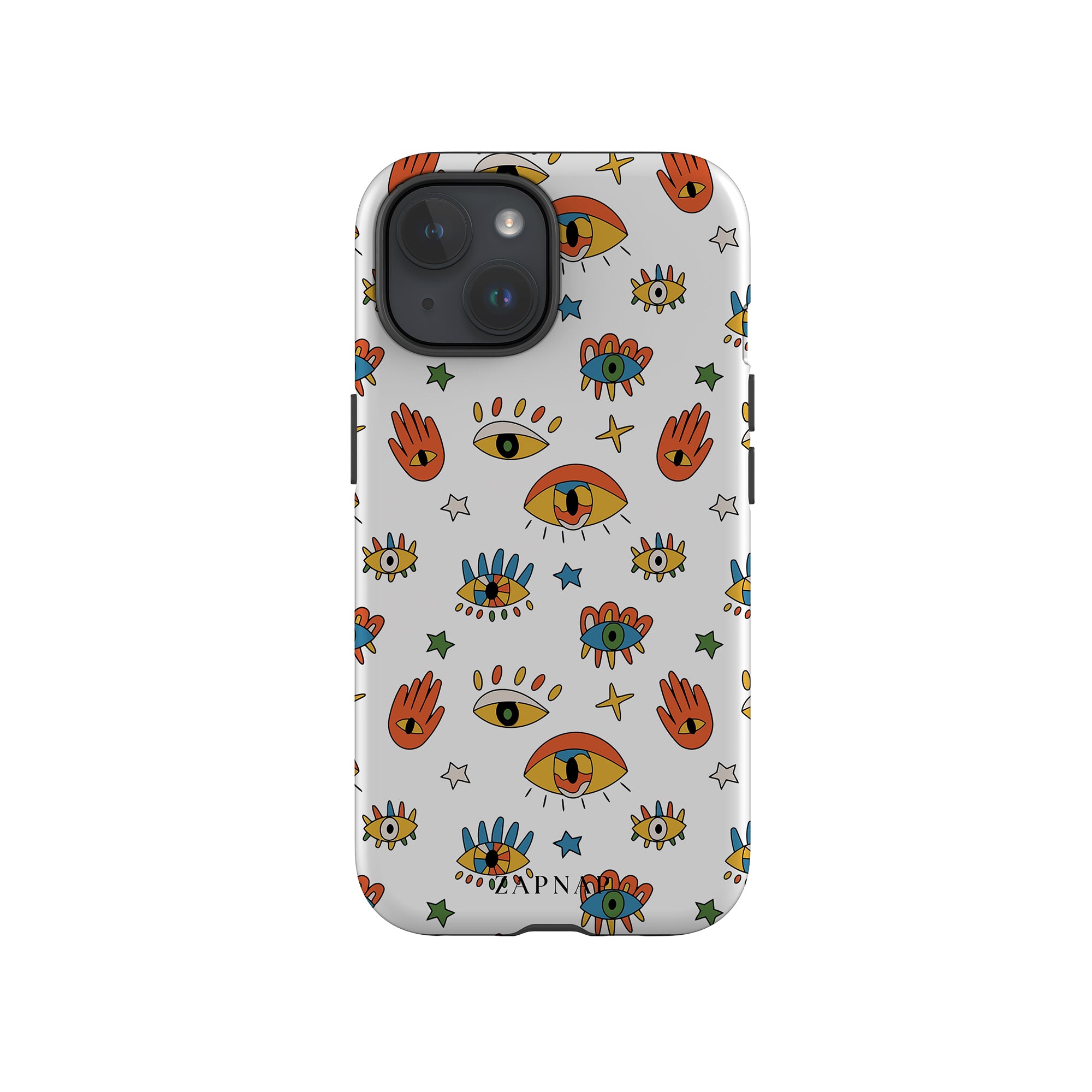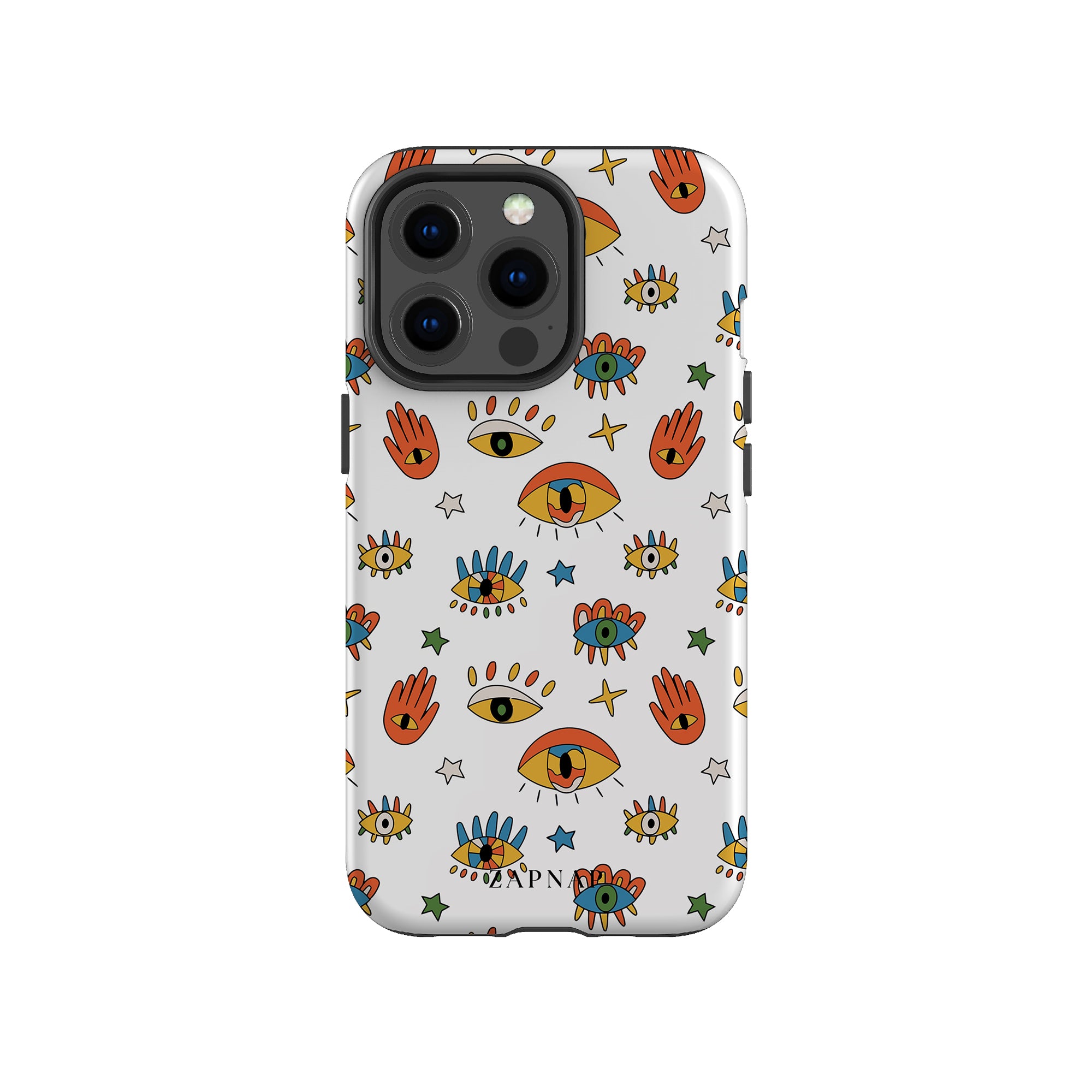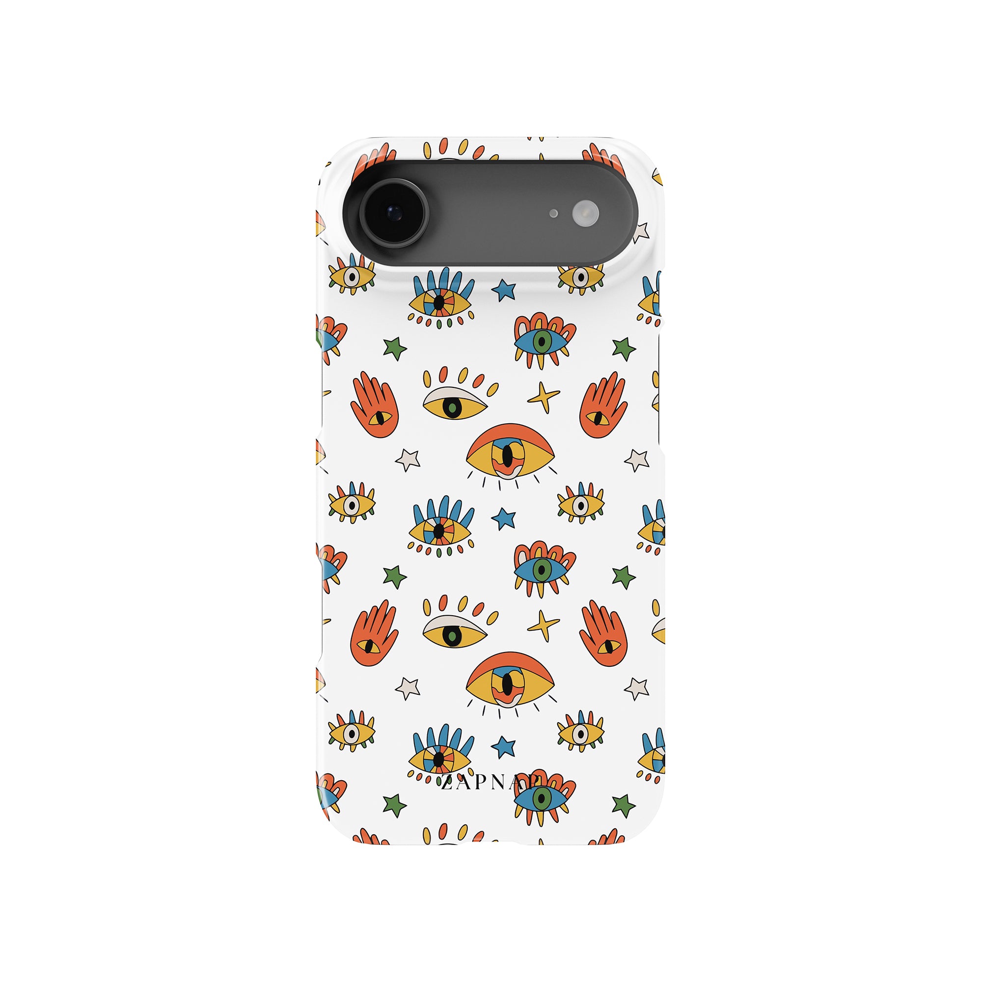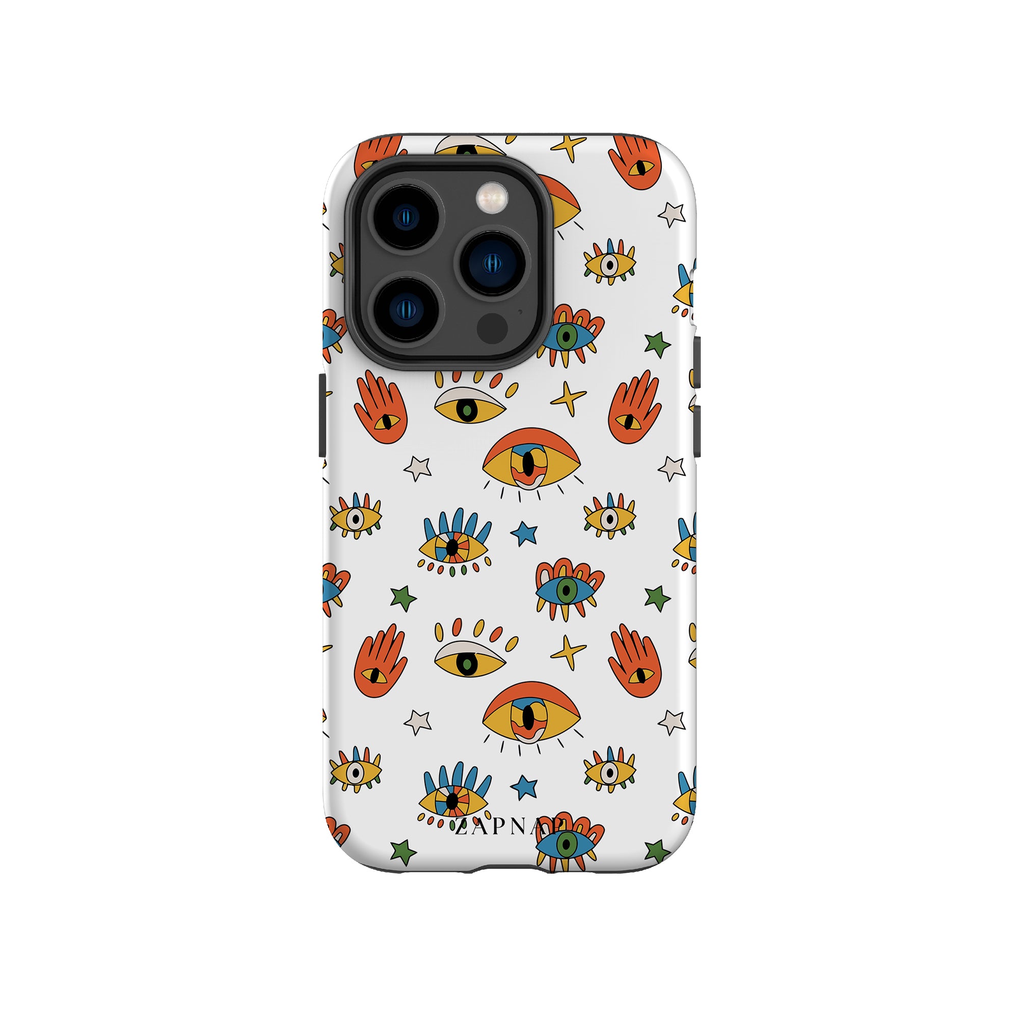 Dit telefoonhoesje heeft een speels en levendig patroon van boze oogmotieven, handen en sterren op een helderwitte achtergrond. De gedurfde kleuren en het grillige ontwerp bieden bescherming en stijl en voegen een vleugje culturele charme en intriges toe aan uw apparaat. 'Guardian Eyes' is perfect voor degenen die unieke en betekenisvolle ontwerpen waarderen, waardoor uw telefoon een opvallend accessoire wordt met een vleugje mystiek.