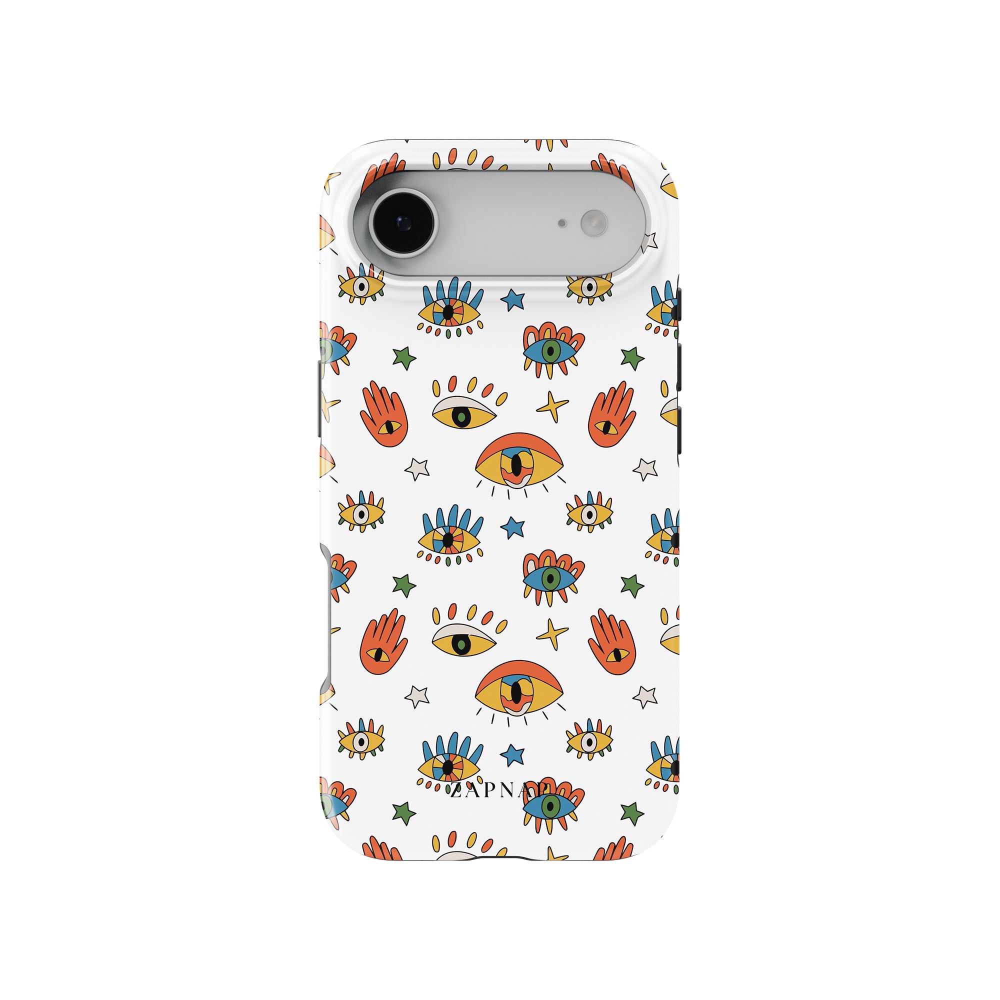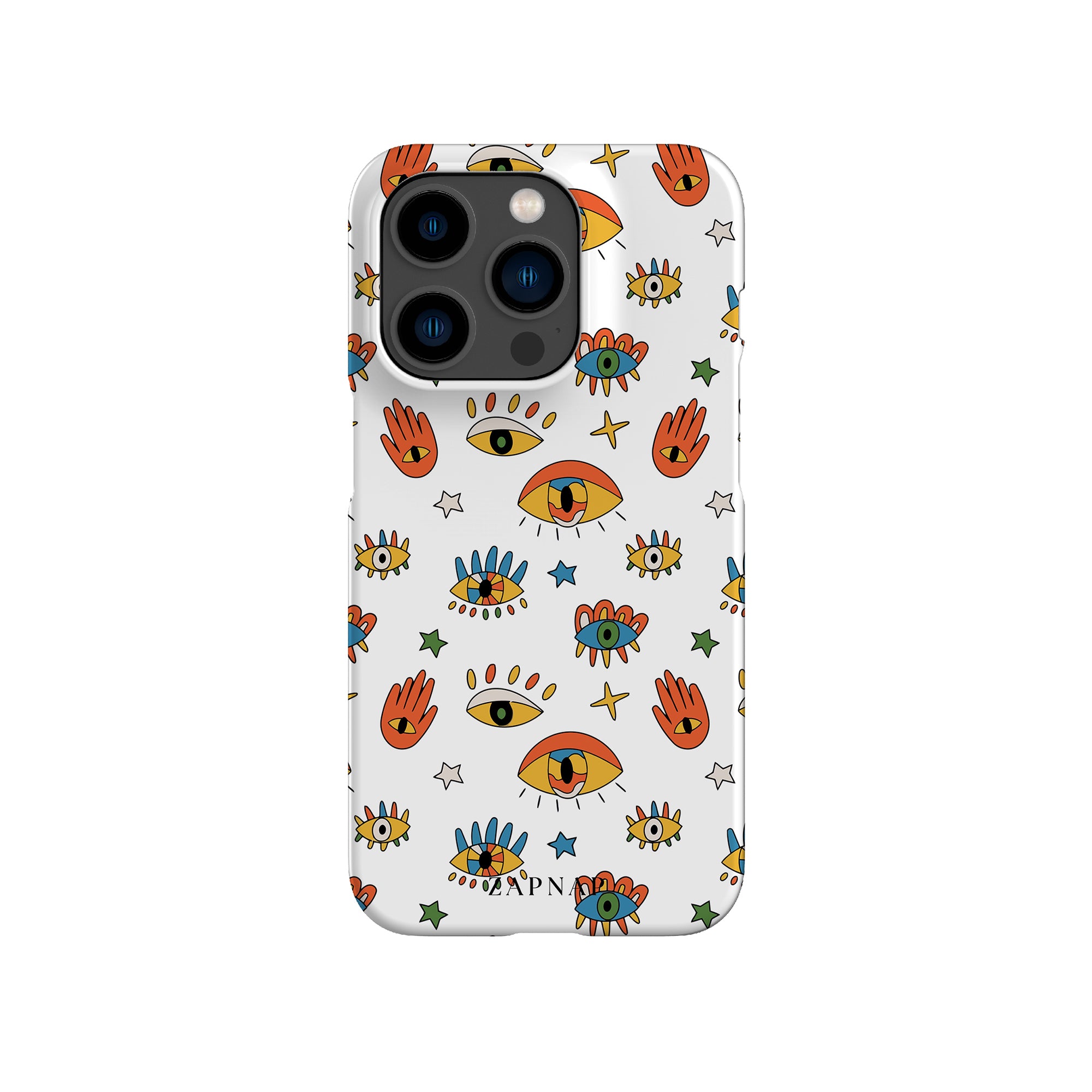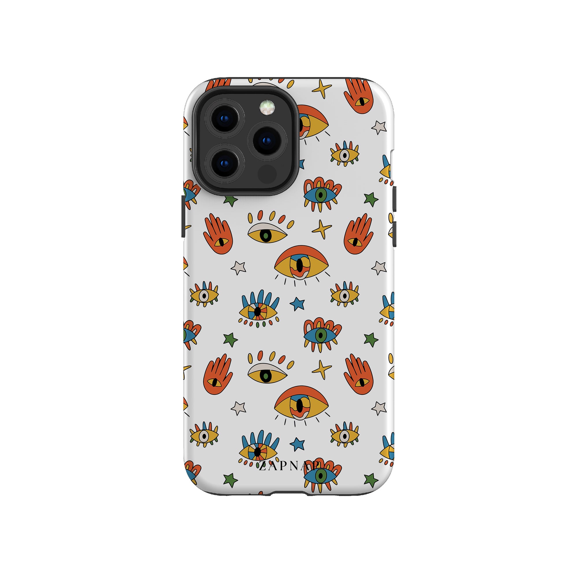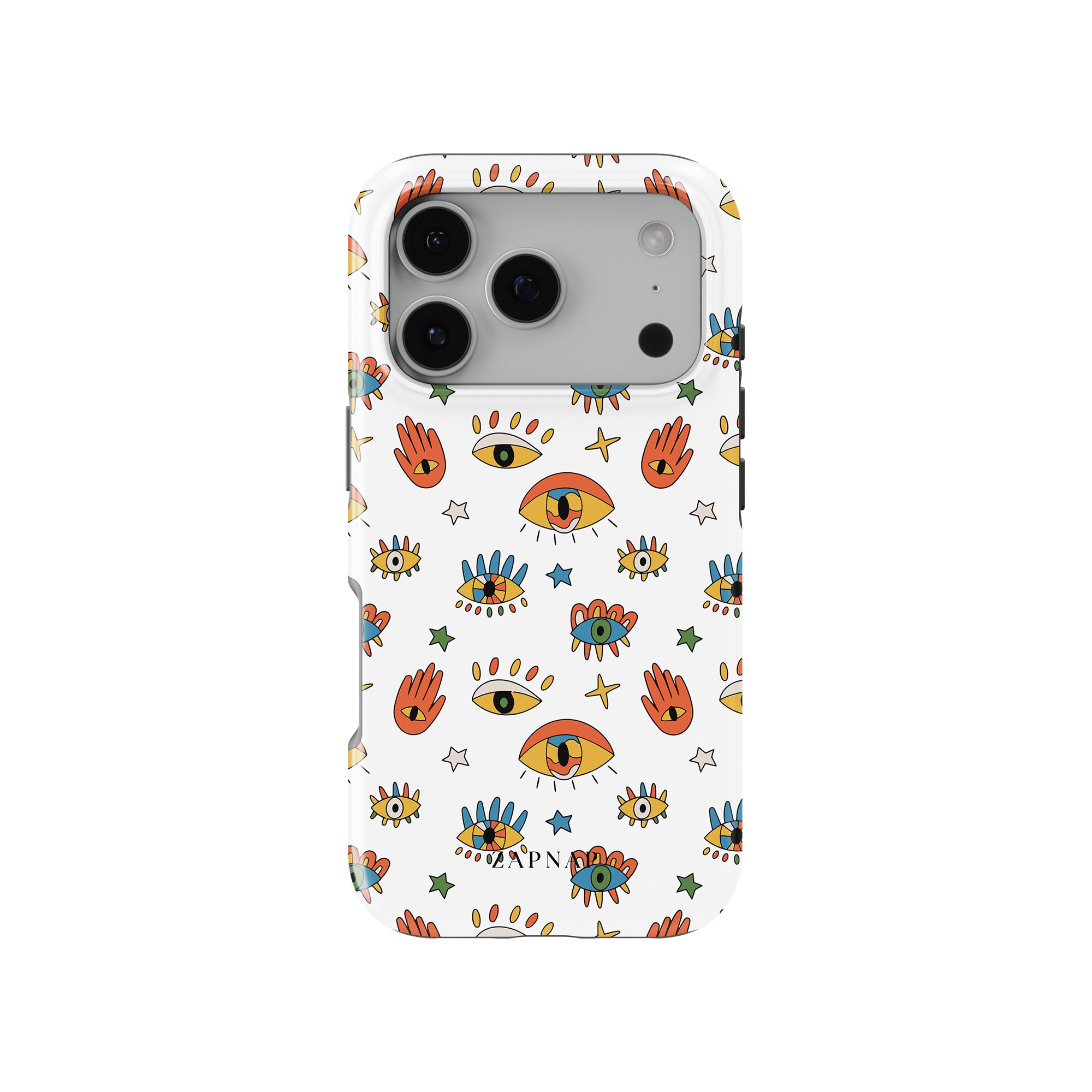 Dit telefoonhoesje heeft een speels en levendig patroon van boze oogmotieven, handen en sterren op een helderwitte achtergrond. De gedurfde kleuren en het grillige ontwerp bieden bescherming en stijl en voegen een vleugje culturele charme en intriges toe aan uw apparaat. 'Guardian Eyes' is perfect voor degenen die unieke en betekenisvolle ontwerpen waarderen, waardoor uw telefoon een opvallend accessoire wordt met een vleugje mystiek.