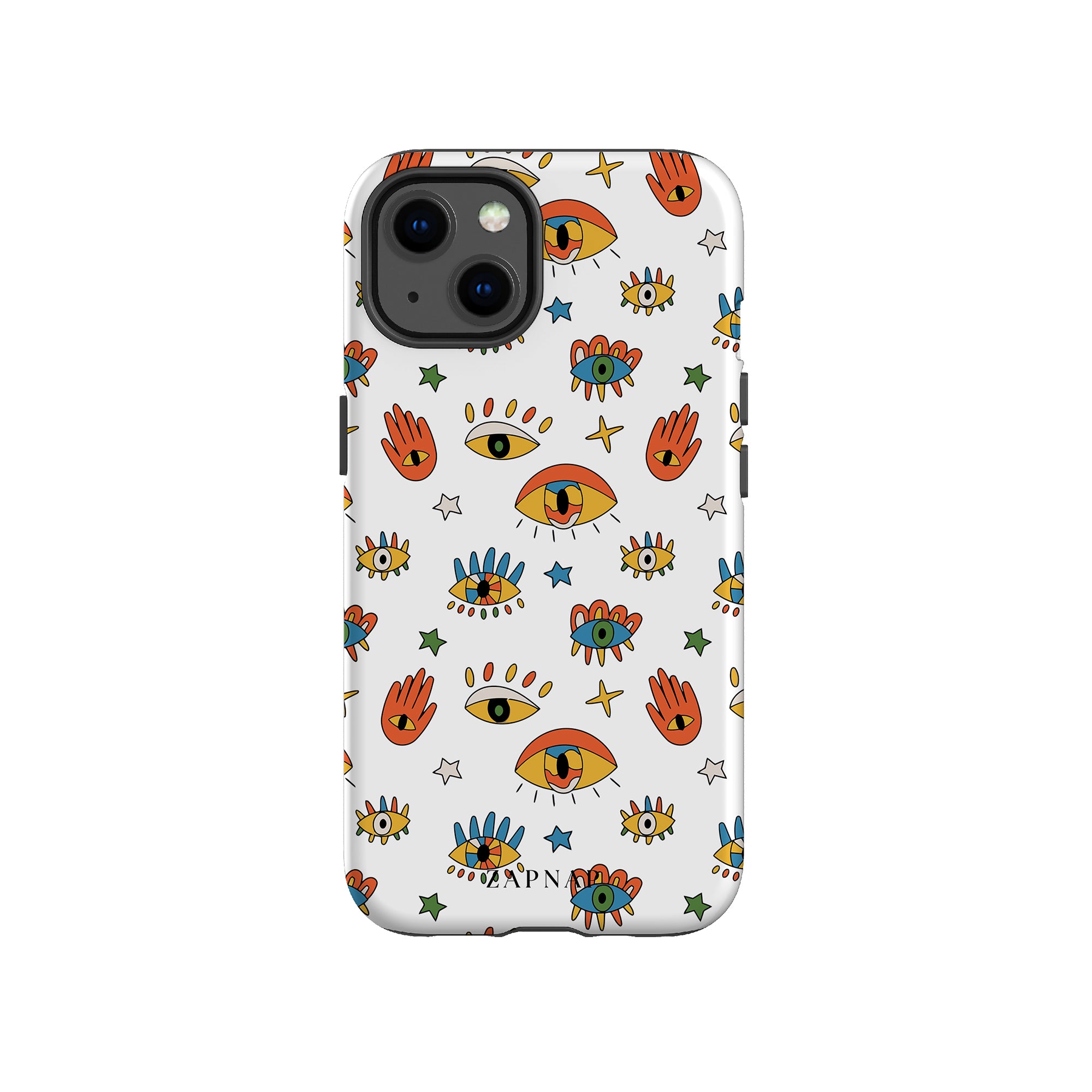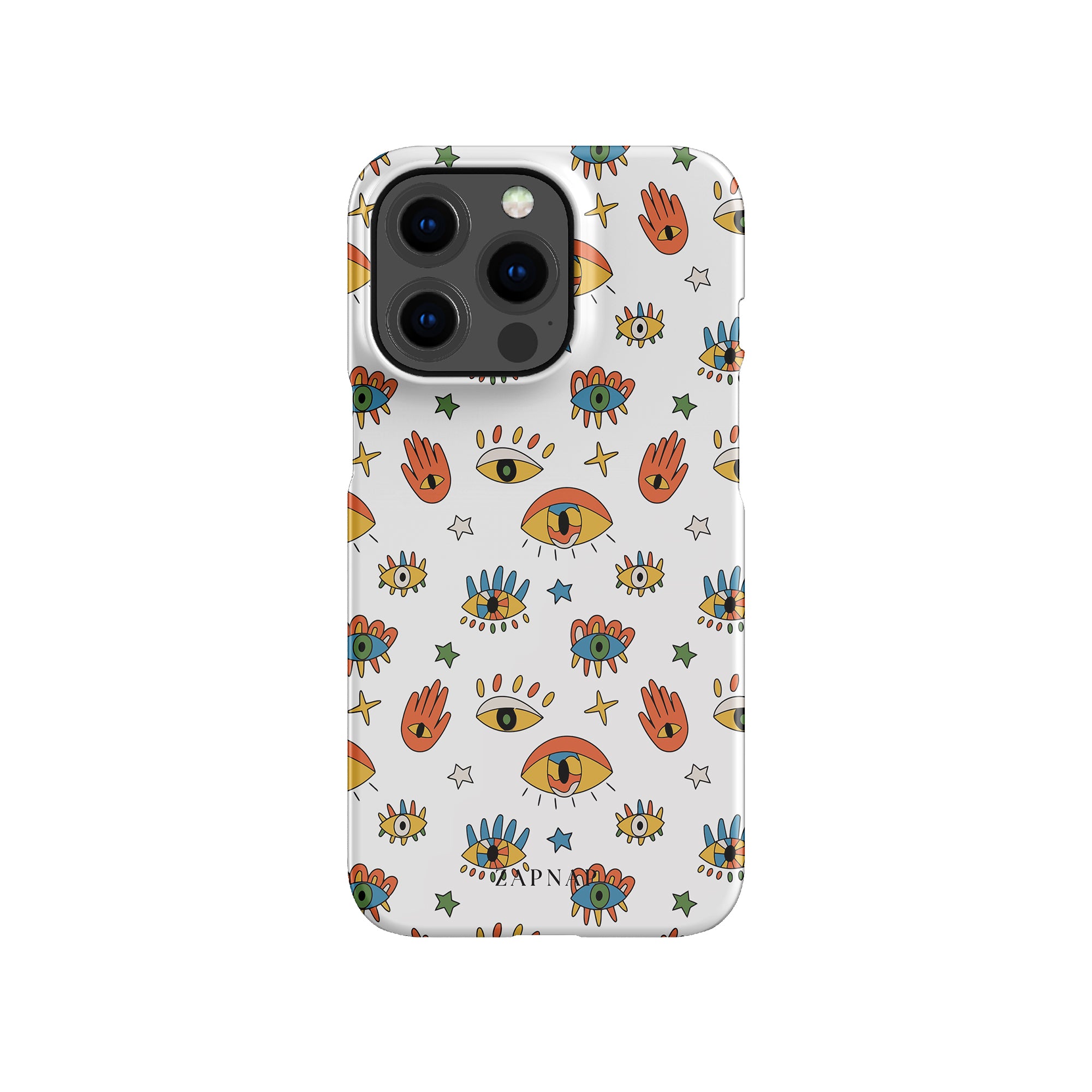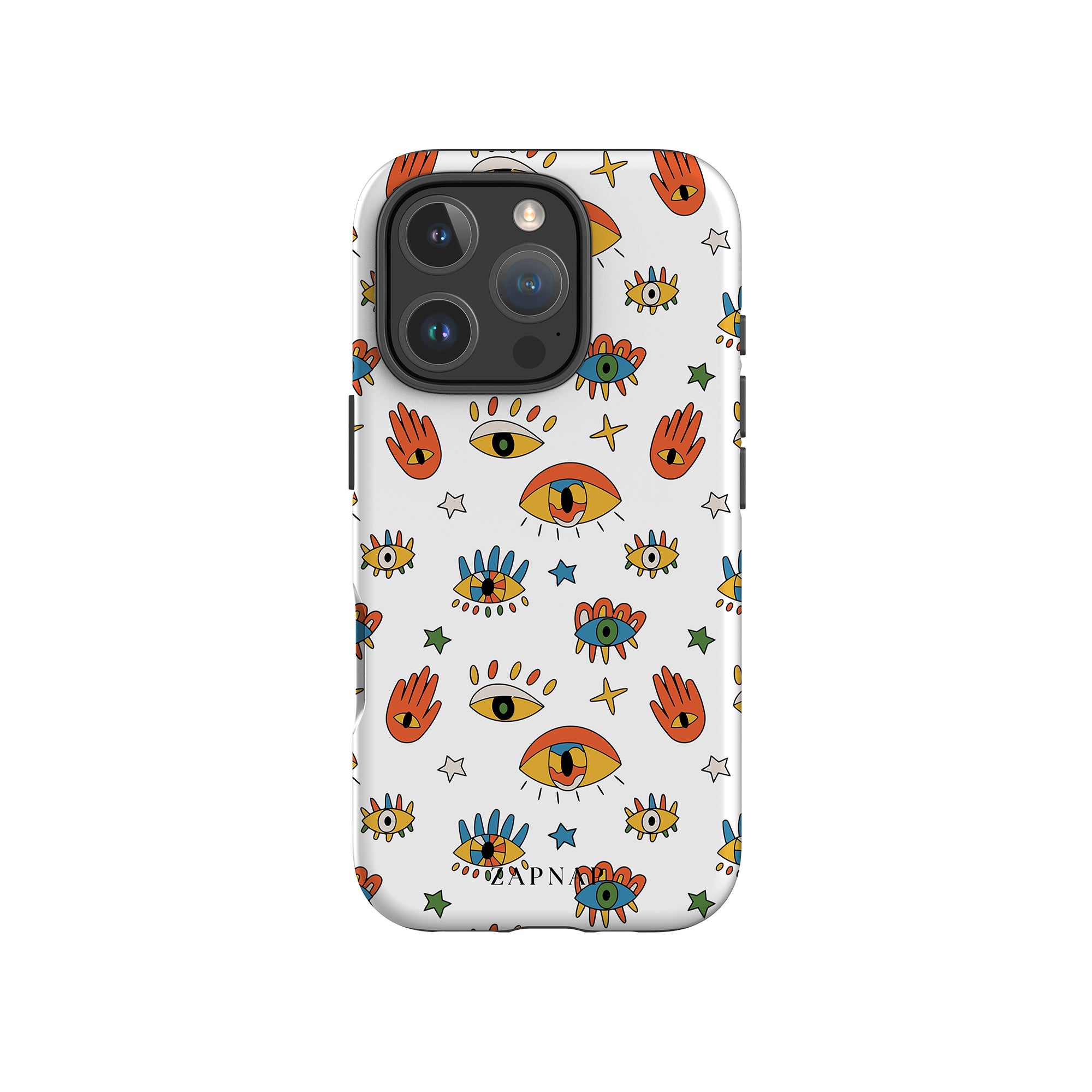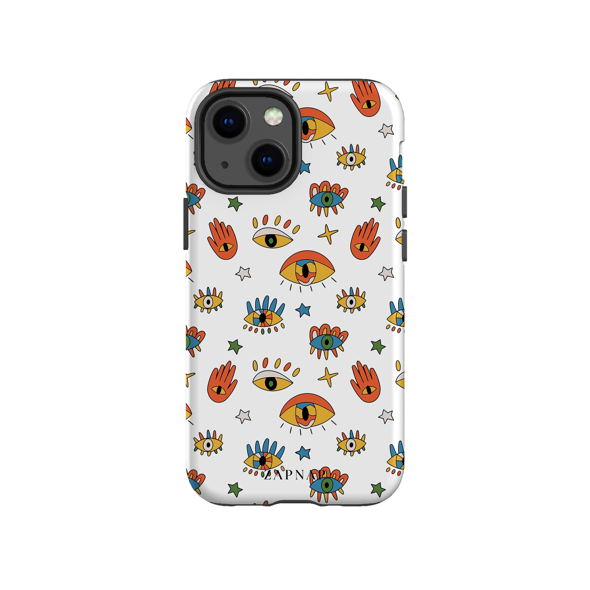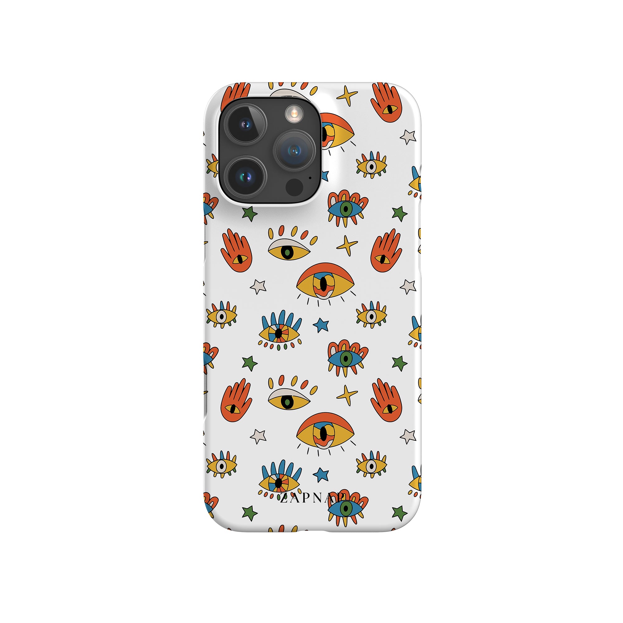 Dit telefoonhoesje heeft een speels en levendig patroon van boze oogmotieven, handen en sterren op een helderwitte achtergrond. De gedurfde kleuren en het grillige ontwerp bieden bescherming en stijl en voegen een vleugje culturele charme en intriges toe aan uw apparaat. 'Guardian Eyes' is perfect voor degenen die unieke en betekenisvolle ontwerpen waarderen, waardoor uw telefoon een opvallend accessoire wordt met een vleugje mystiek.