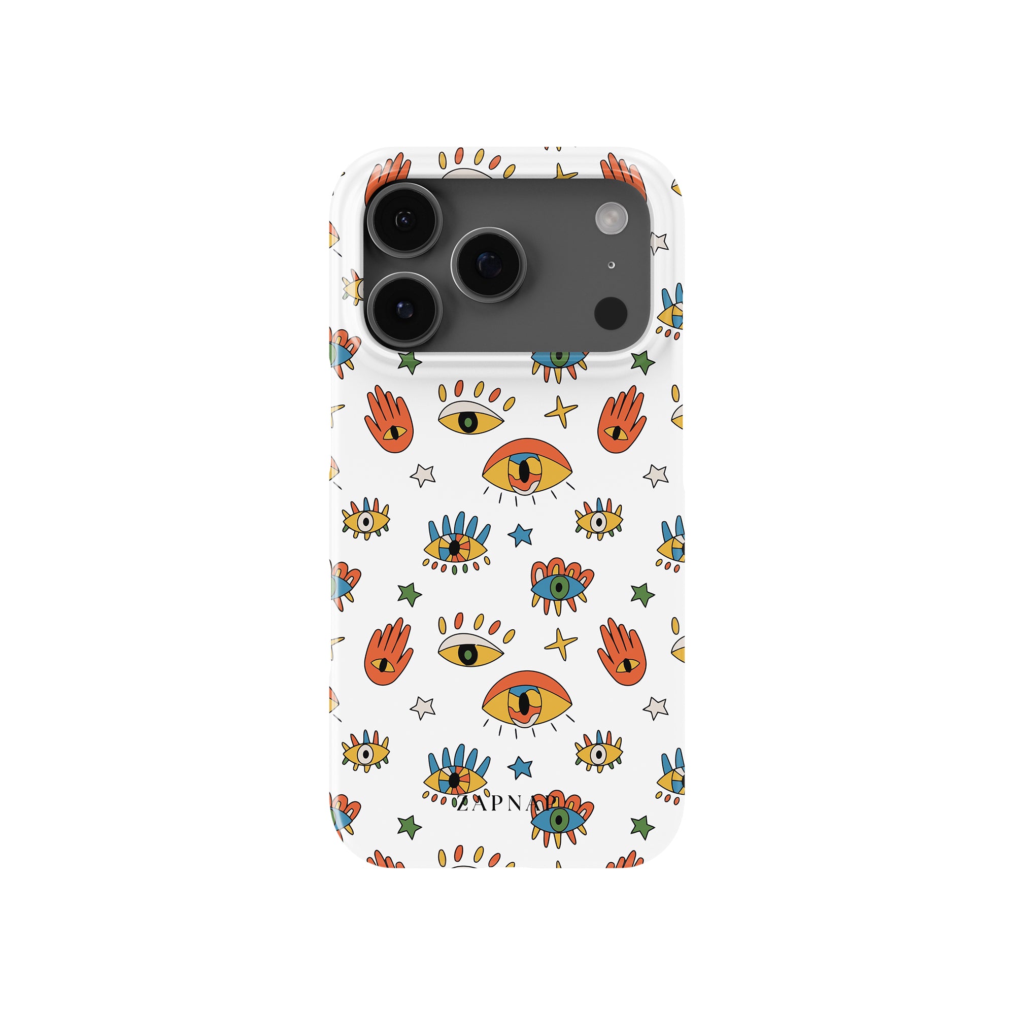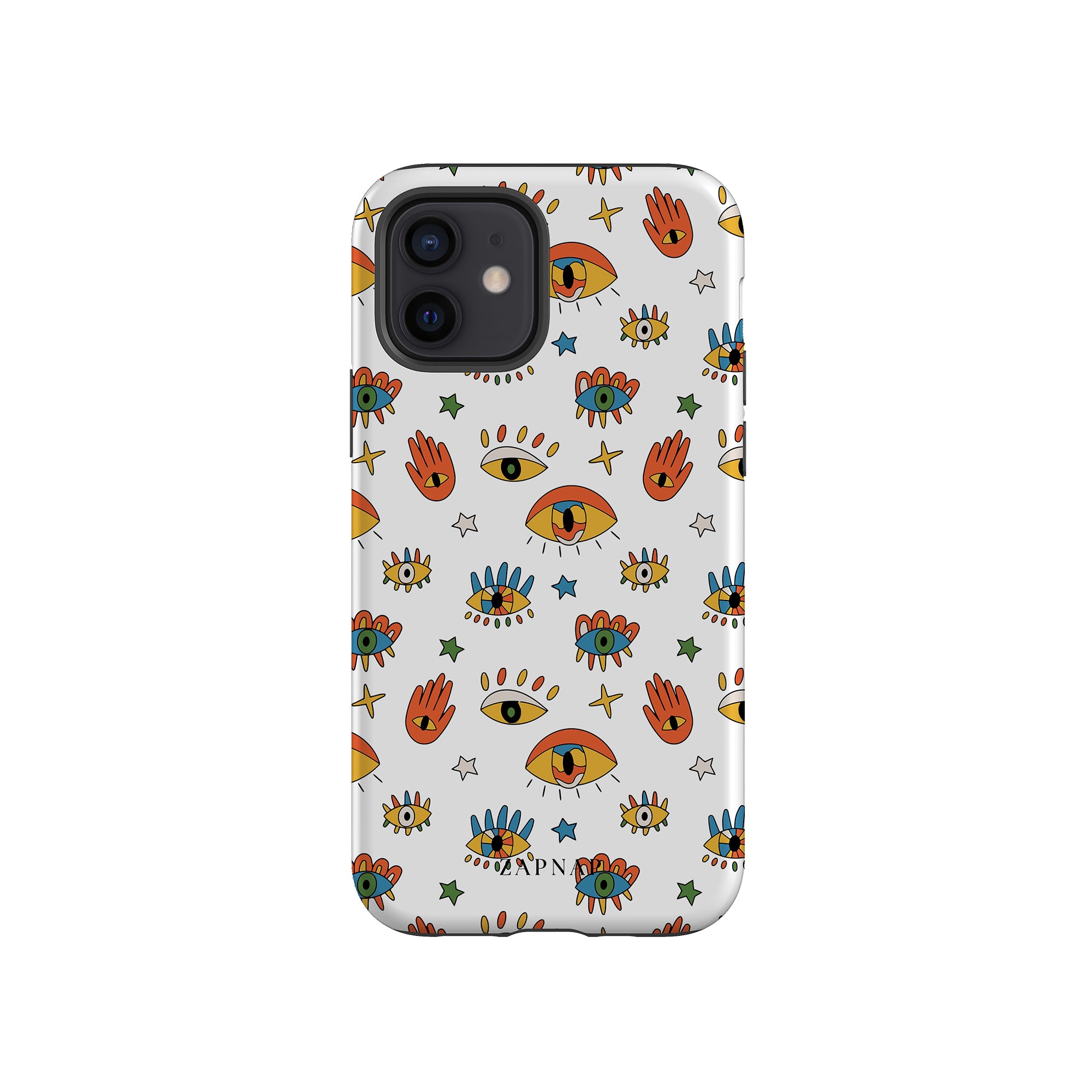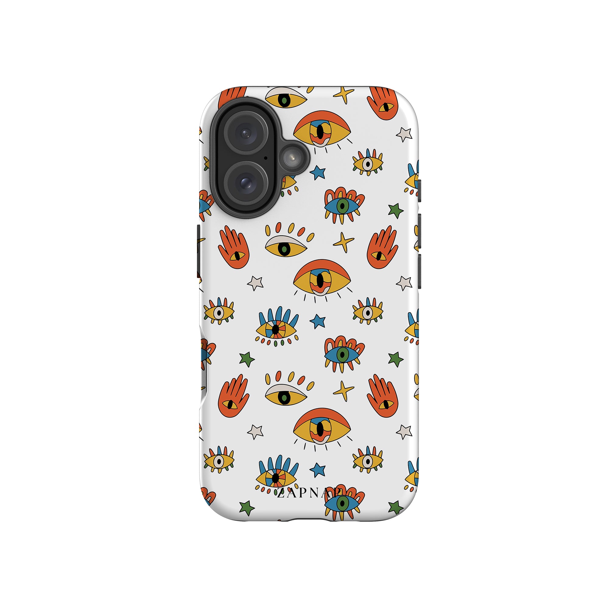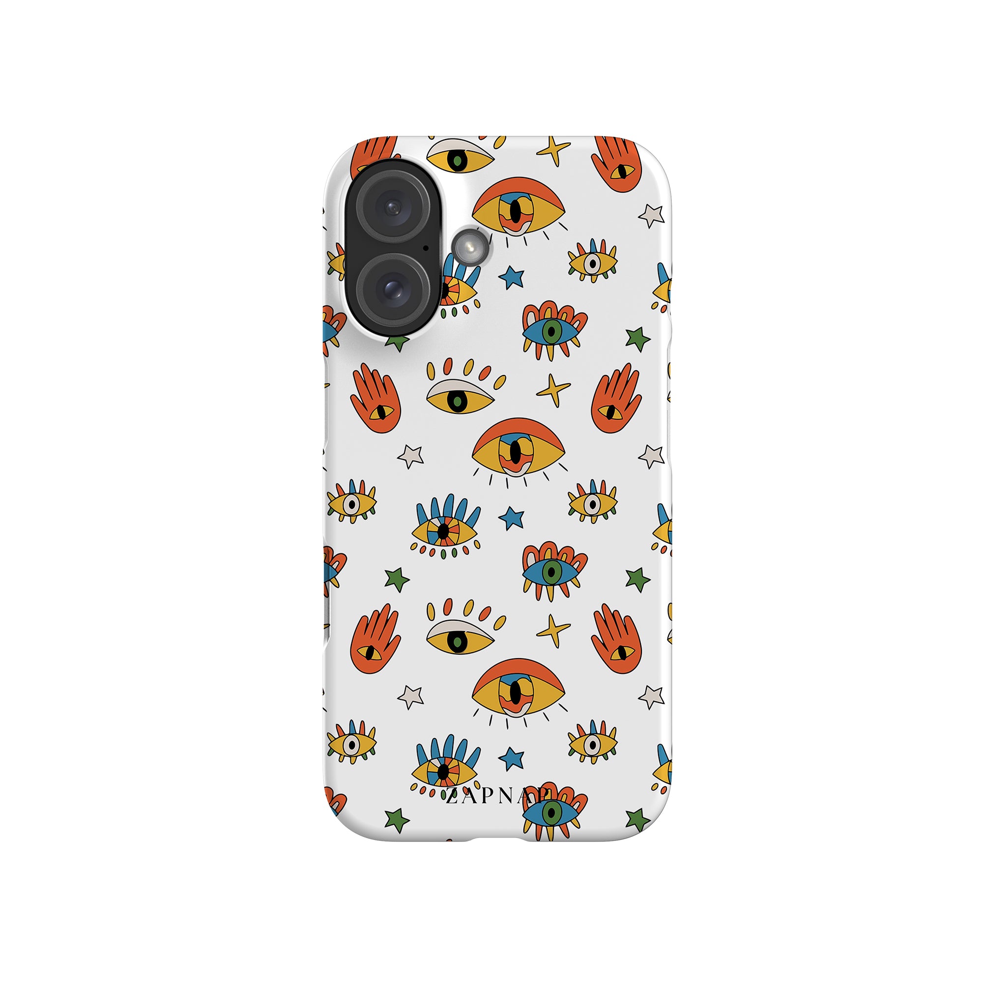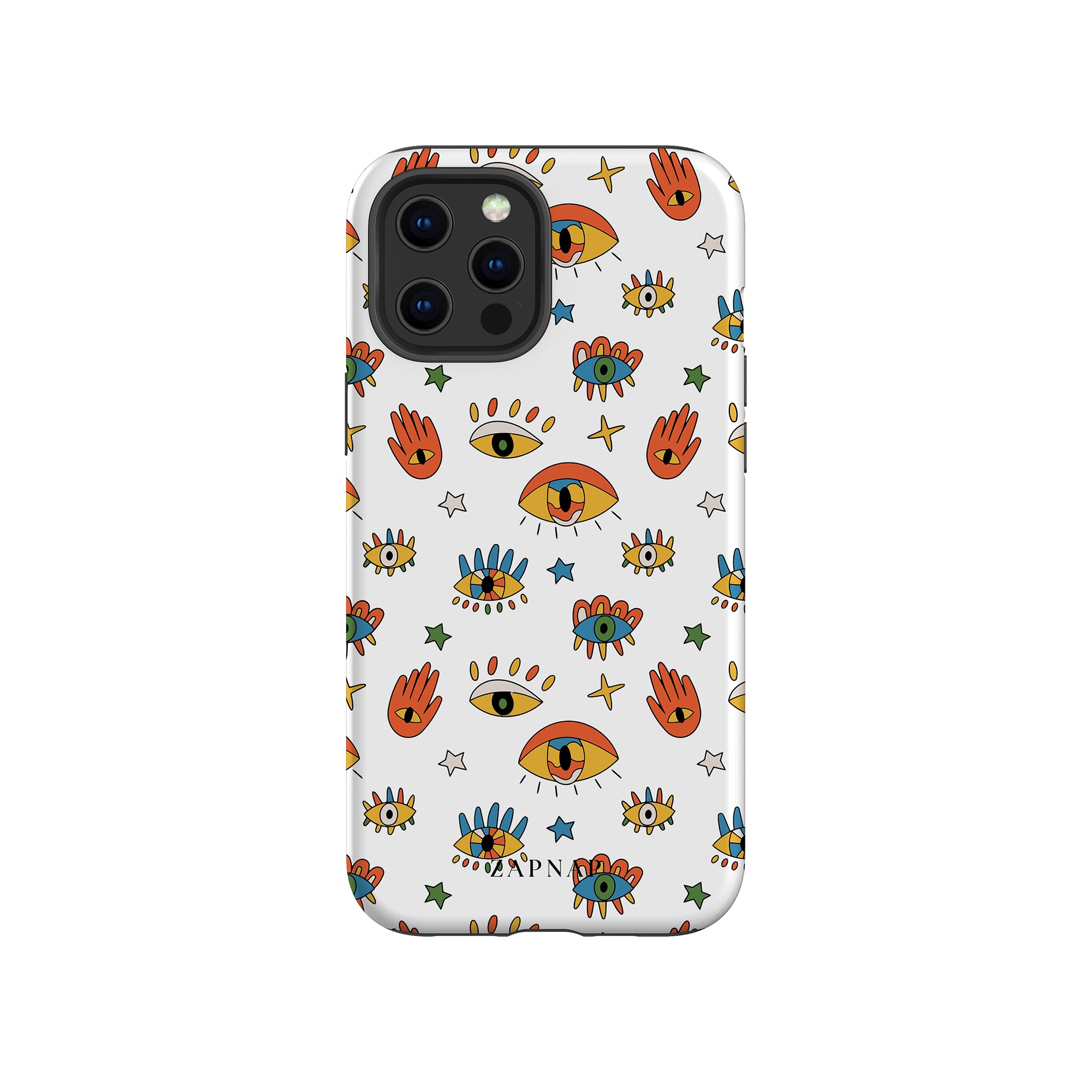 Dit telefoonhoesje heeft een speels en levendig patroon van boze oogmotieven, handen en sterren op een helderwitte achtergrond. De gedurfde kleuren en het grillige ontwerp bieden bescherming en stijl en voegen een vleugje culturele charme en intriges toe aan uw apparaat. 'Guardian Eyes' is perfect voor degenen die unieke en betekenisvolle ontwerpen waarderen, waardoor uw telefoon een opvallend accessoire wordt met een vleugje mystiek.