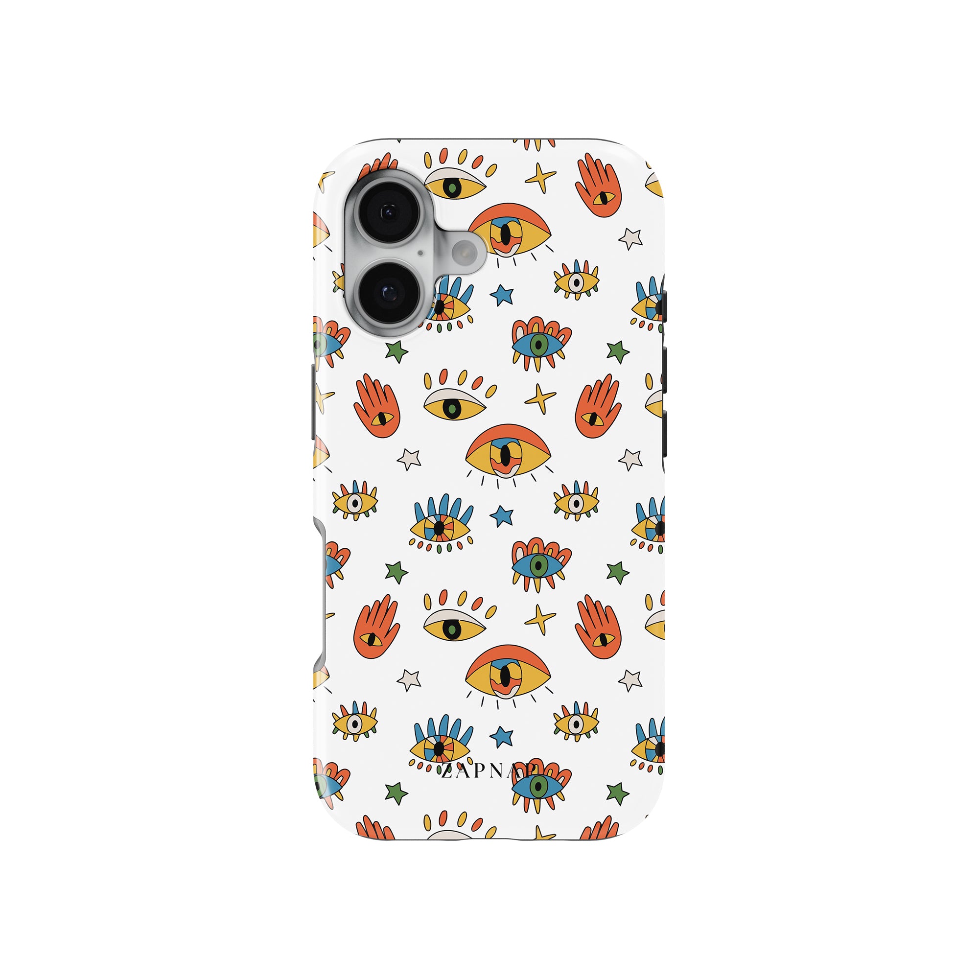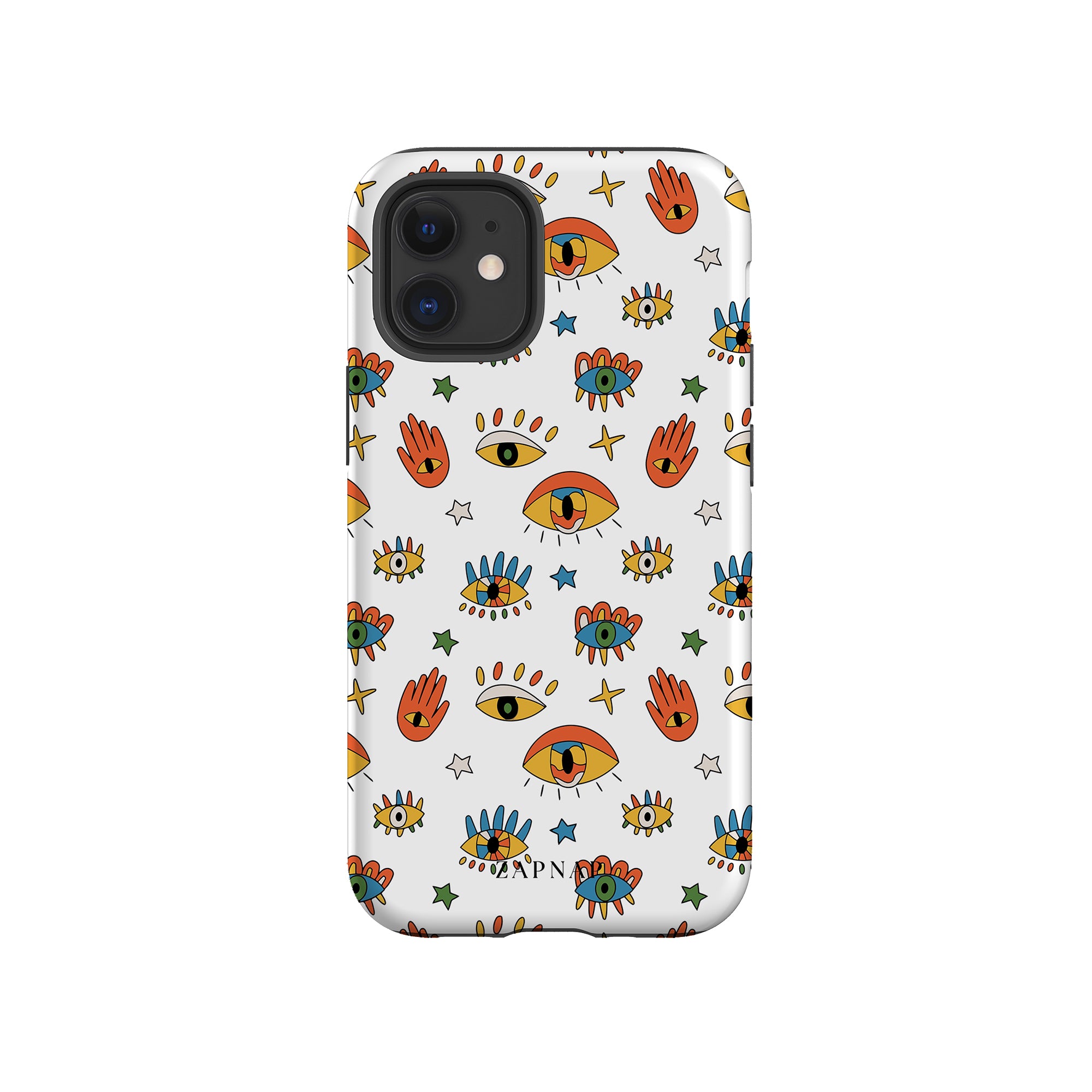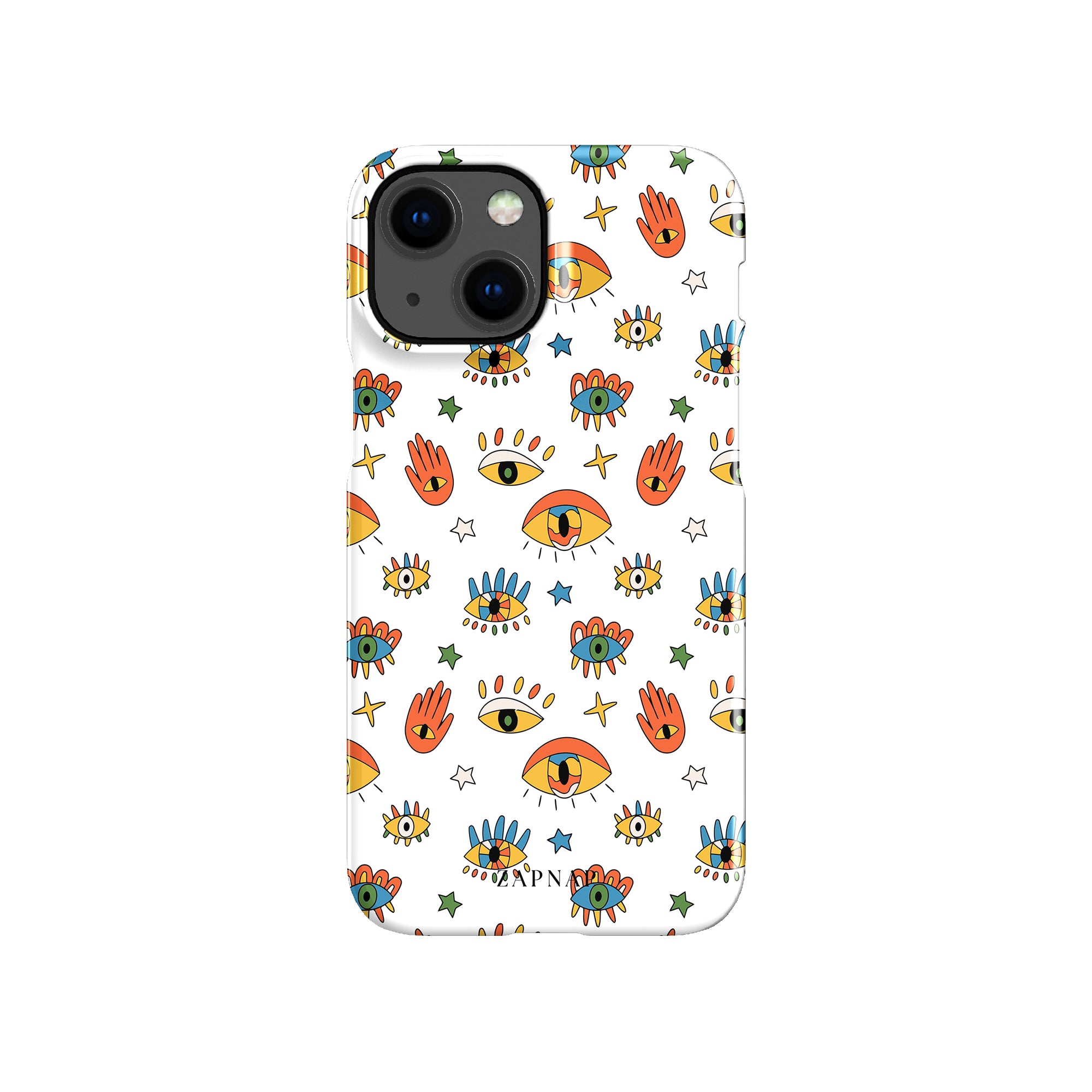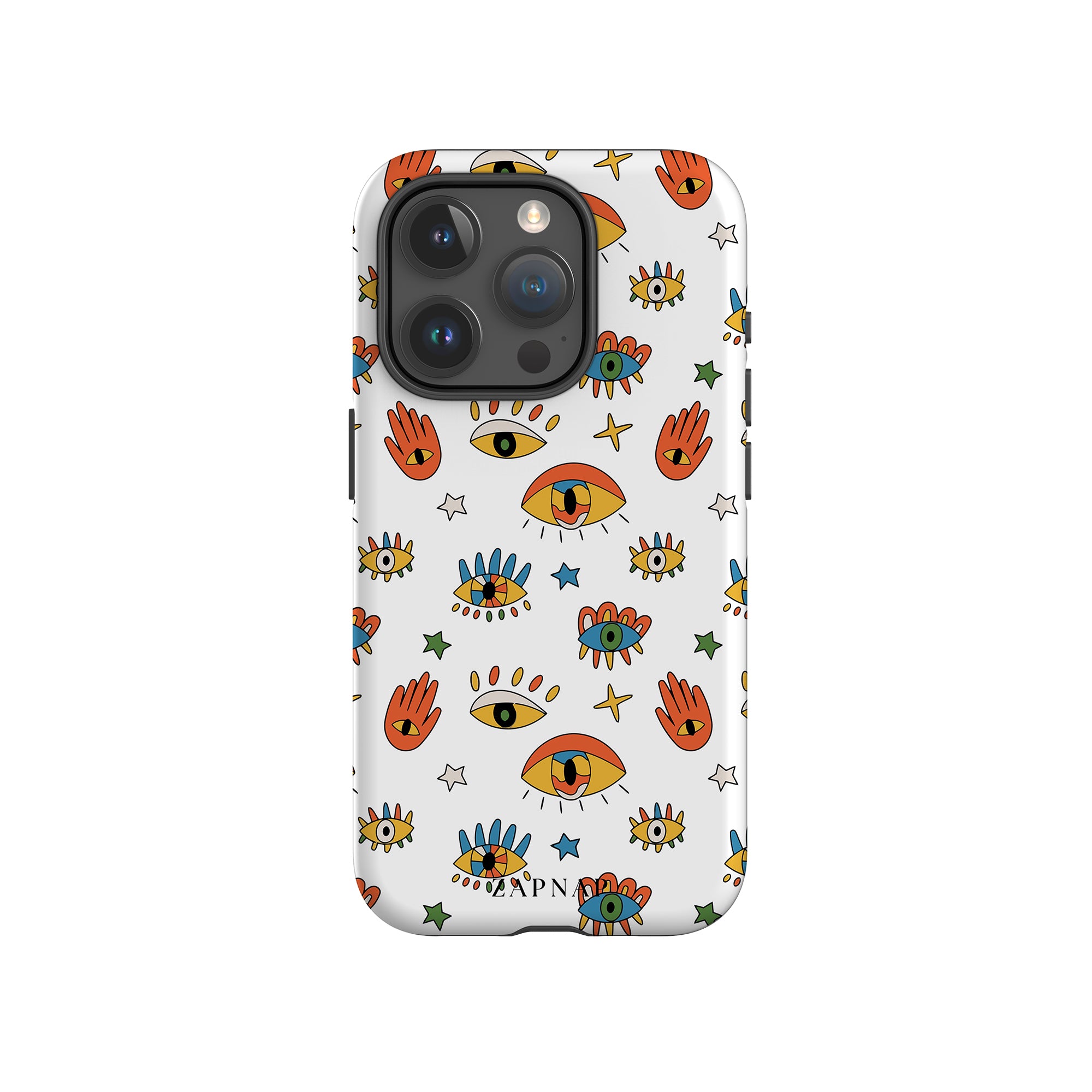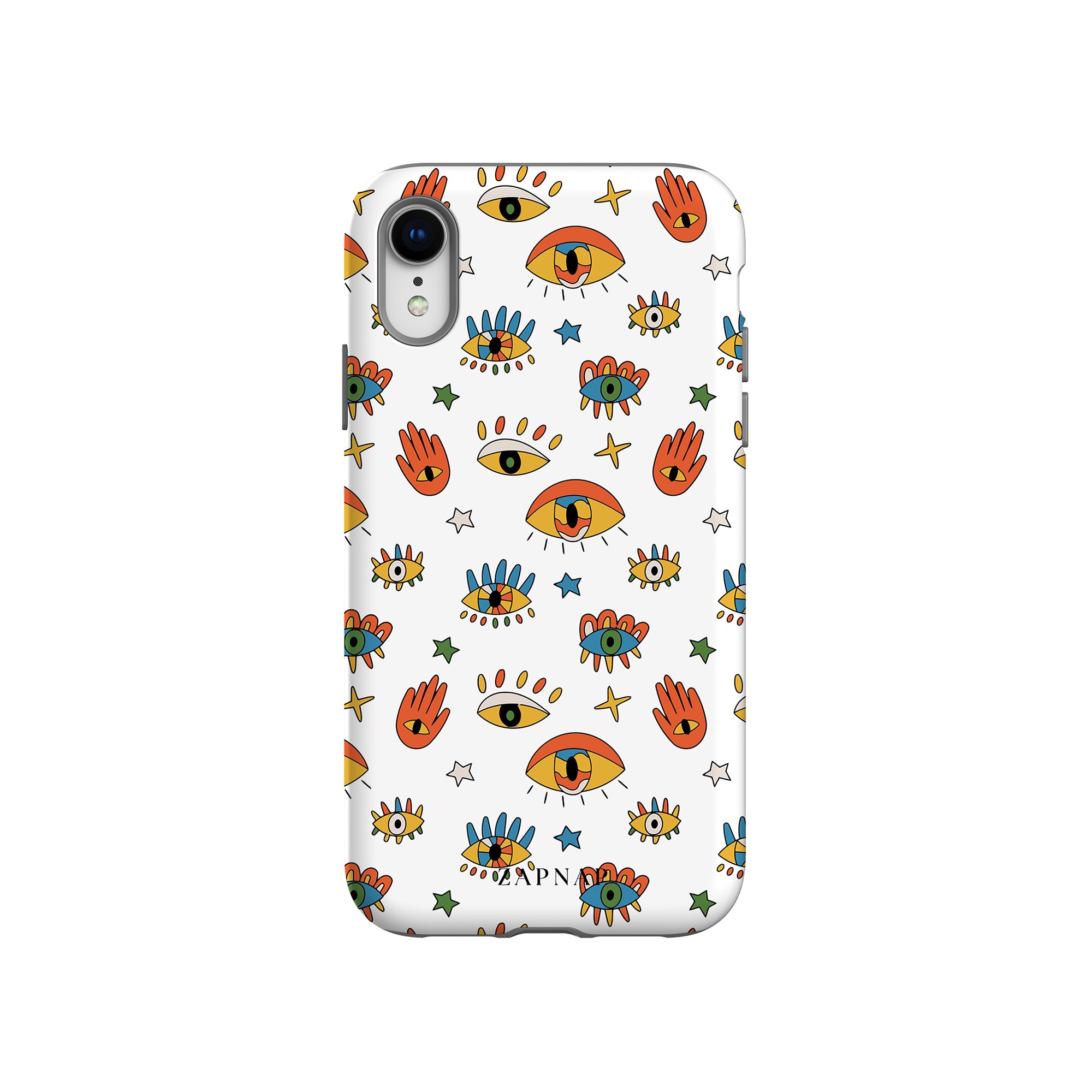 Dit telefoonhoesje heeft een speels en levendig patroon van boze oogmotieven, handen en sterren op een helderwitte achtergrond. De gedurfde kleuren en het grillige ontwerp bieden bescherming en stijl en voegen een vleugje culturele charme en intriges toe aan uw apparaat. 'Guardian Eyes' is perfect voor degenen die unieke en betekenisvolle ontwerpen waarderen, waardoor uw telefoon een opvallend accessoire wordt met een vleugje mystiek.