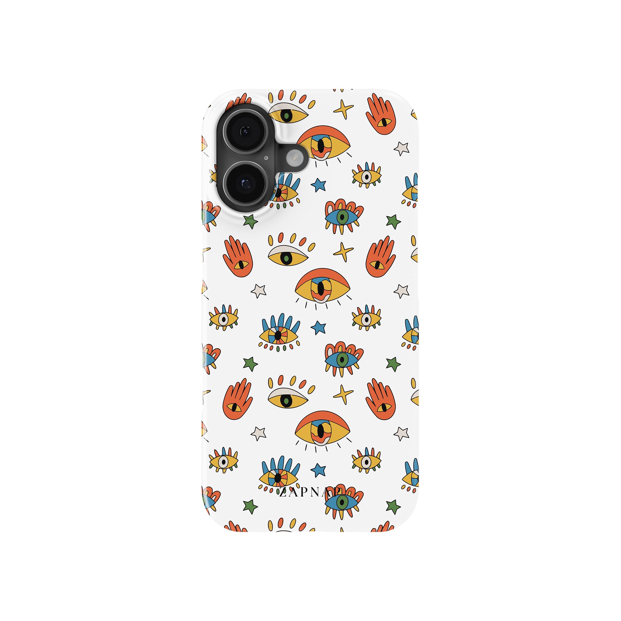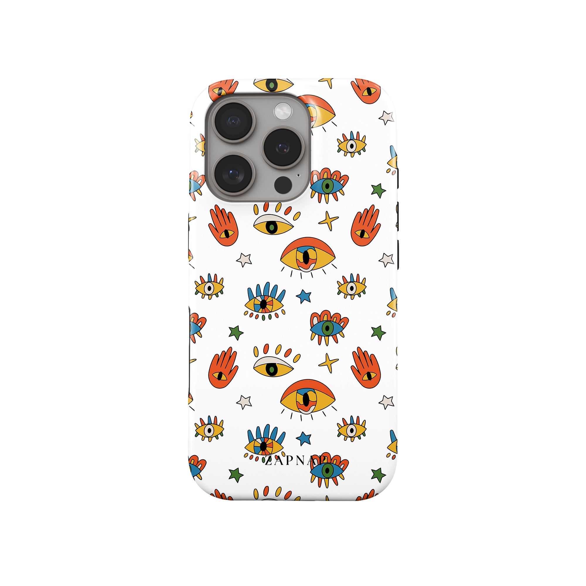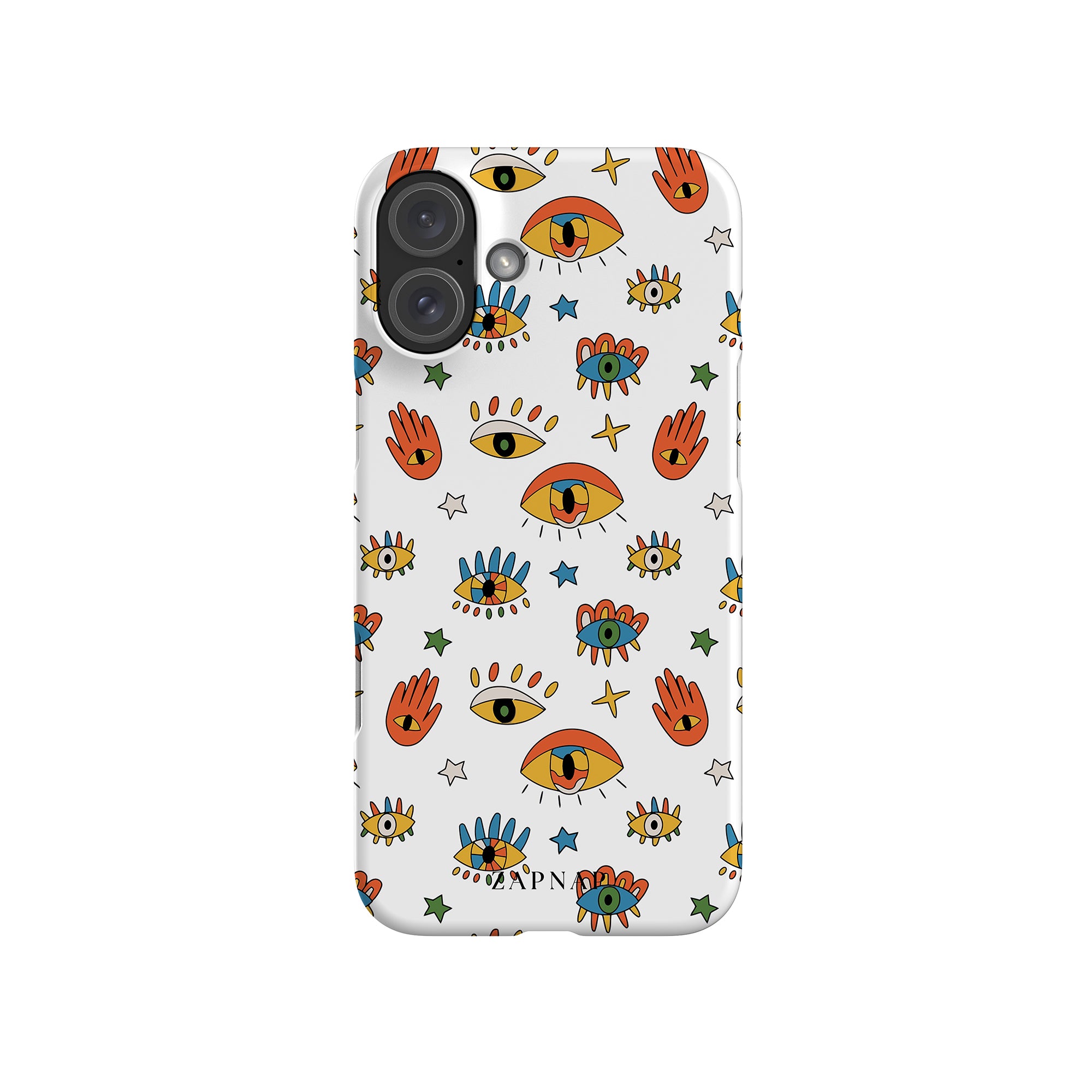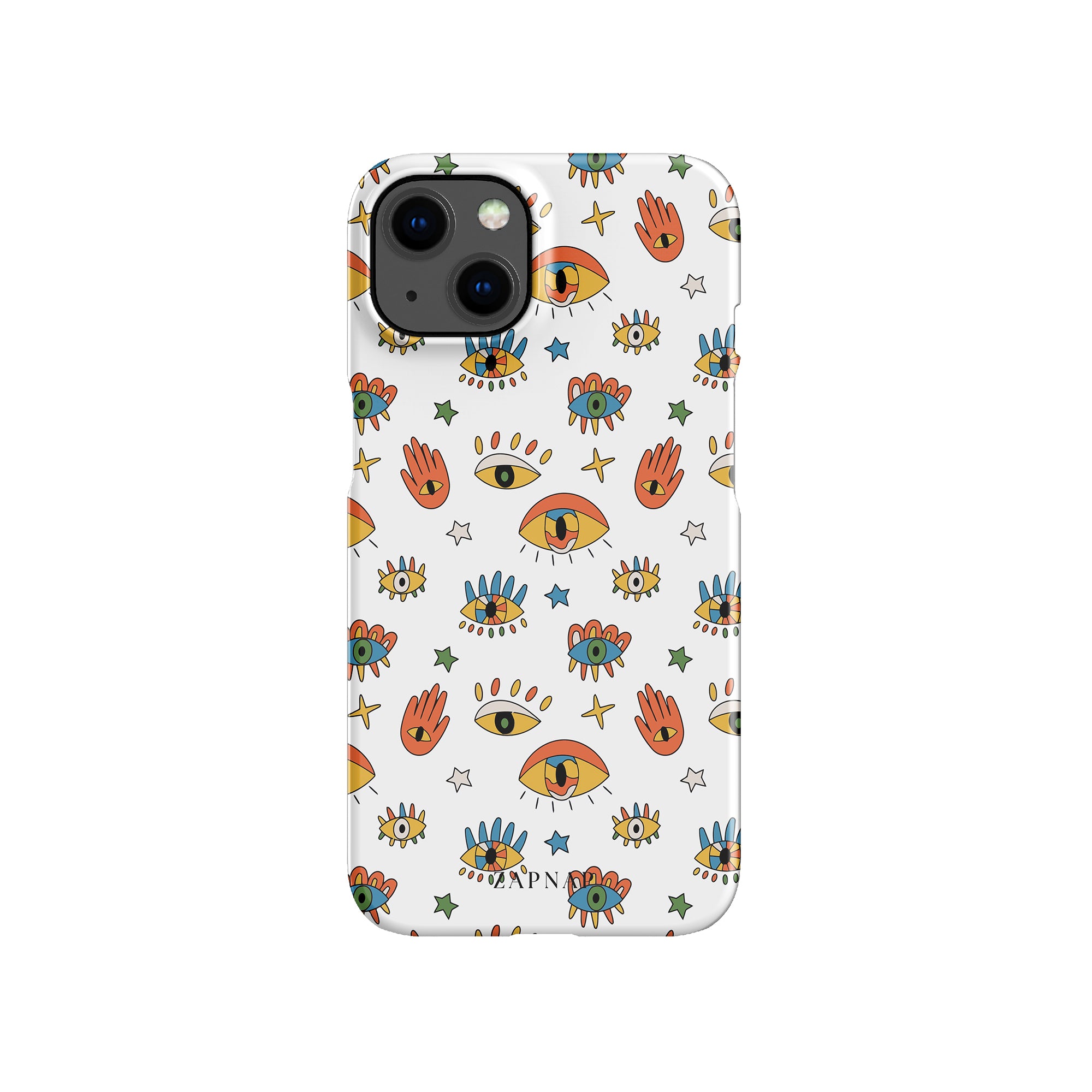 Dit telefoonhoesje heeft een speels en levendig patroon van boze oogmotieven, handen en sterren op een helderwitte achtergrond. De gedurfde kleuren en het grillige ontwerp bieden bescherming en stijl en voegen een vleugje culturele charme en intriges toe aan uw apparaat. 'Guardian Eyes' is perfect voor degenen die unieke en betekenisvolle ontwerpen waarderen, waardoor uw telefoon een opvallend accessoire wordt met een vleugje mystiek.