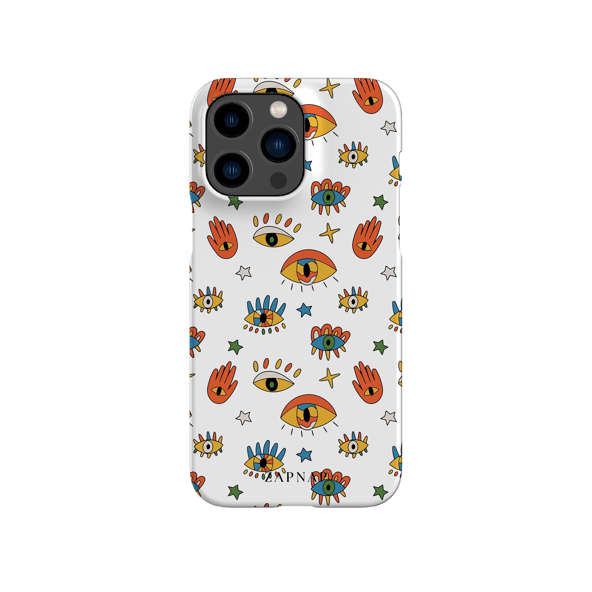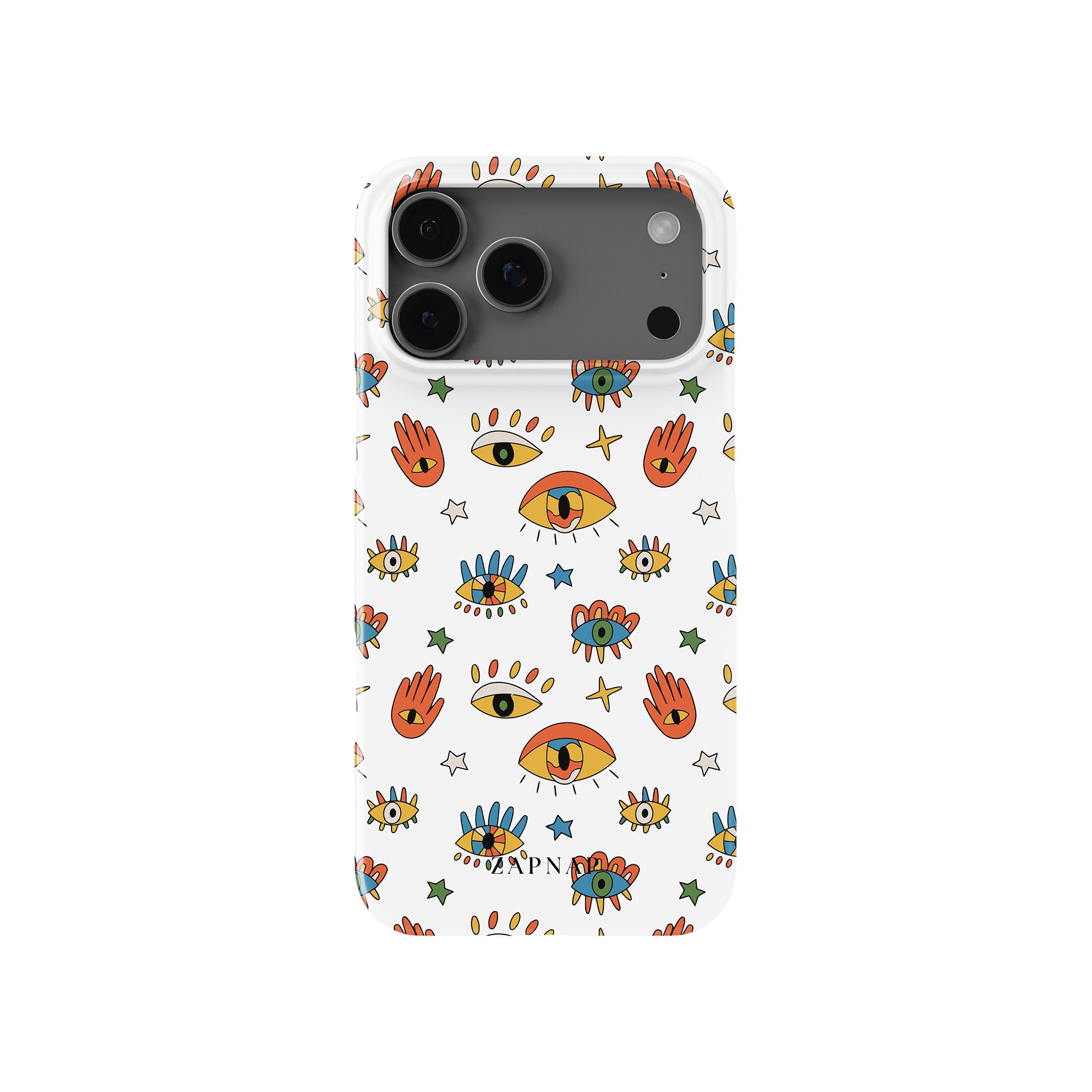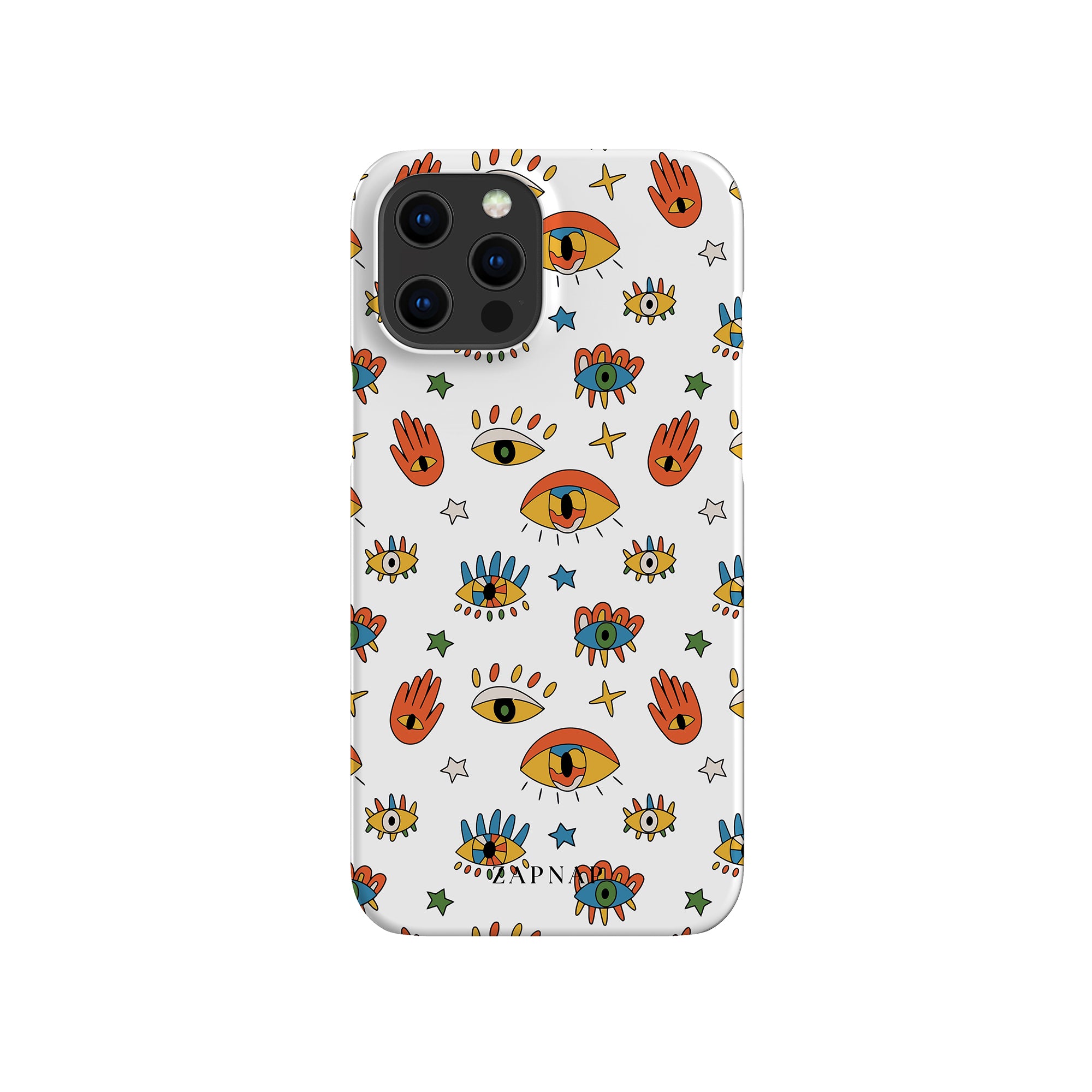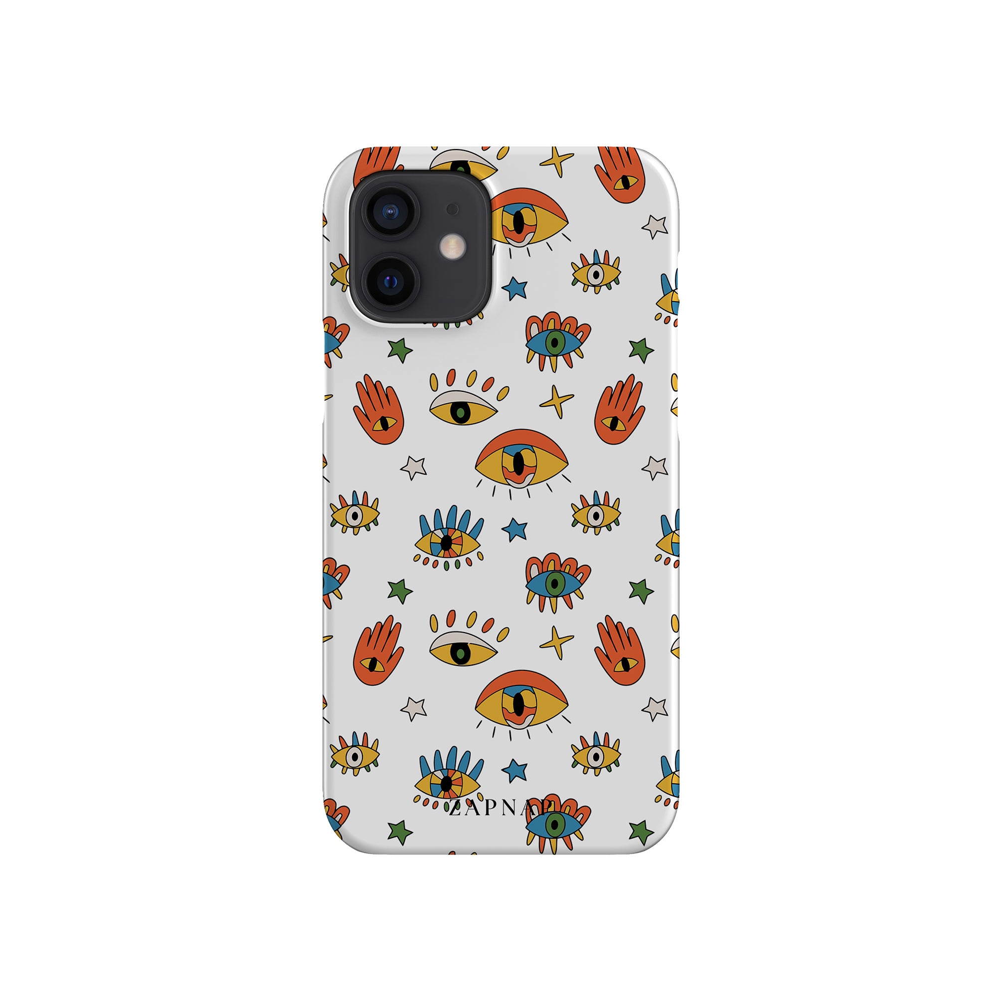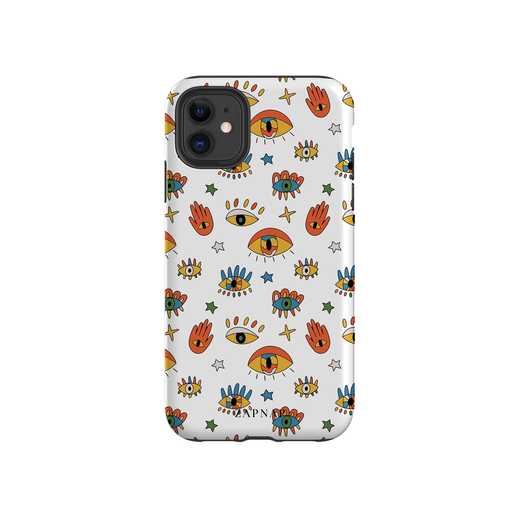 Dit telefoonhoesje heeft een speels en levendig patroon van boze oogmotieven, handen en sterren op een helderwitte achtergrond. De gedurfde kleuren en het grillige ontwerp bieden bescherming en stijl en voegen een vleugje culturele charme en intriges toe aan uw apparaat. 'Guardian Eyes' is perfect voor degenen die unieke en betekenisvolle ontwerpen waarderen, waardoor uw telefoon een opvallend accessoire wordt met een vleugje mystiek.