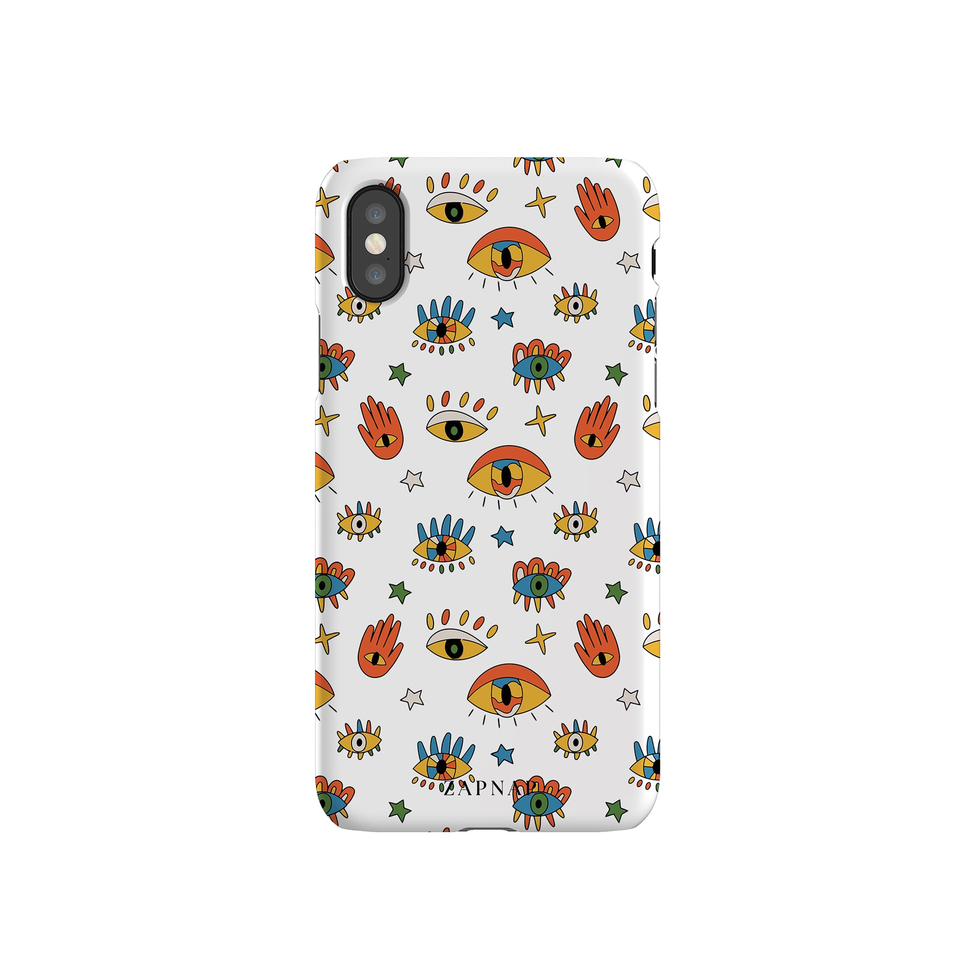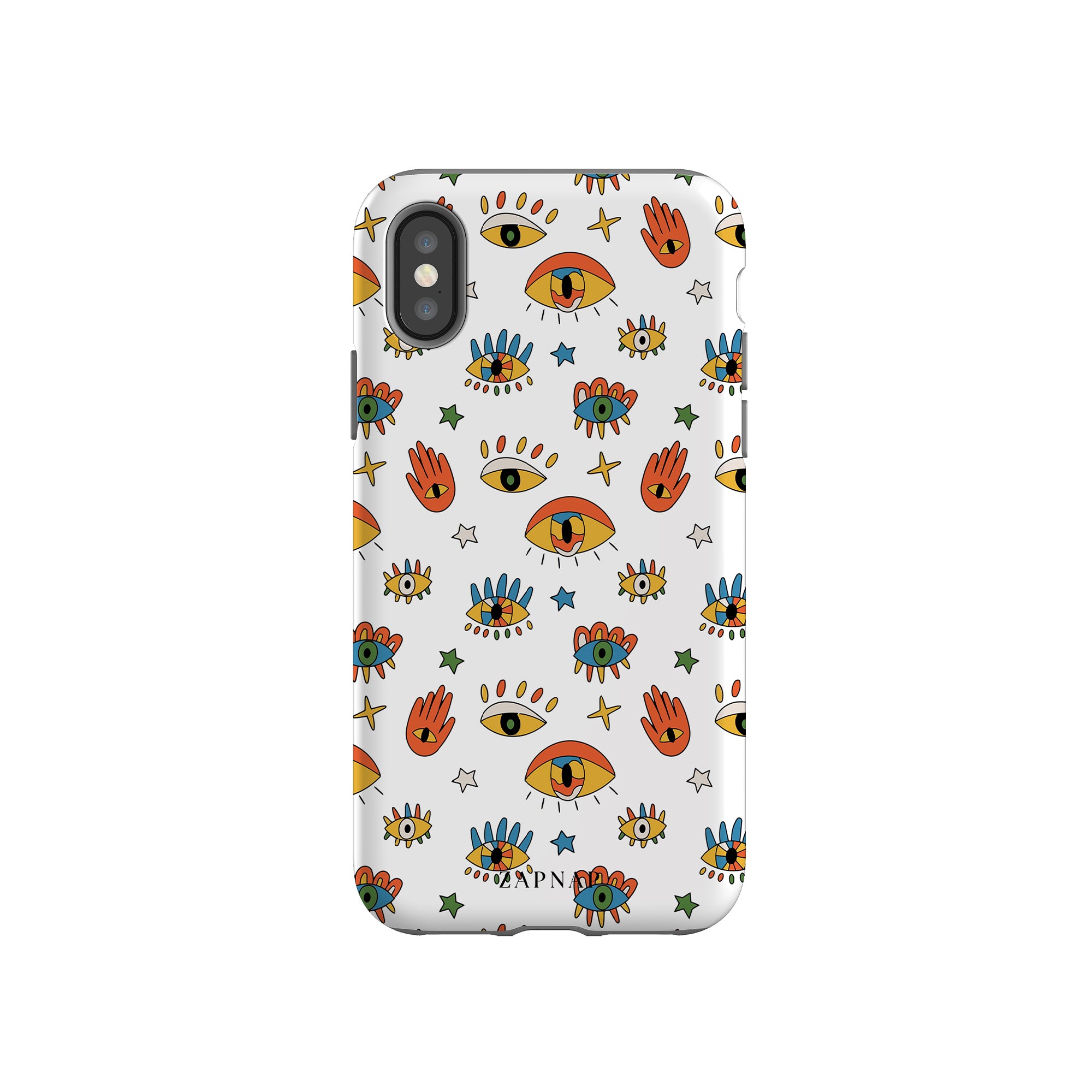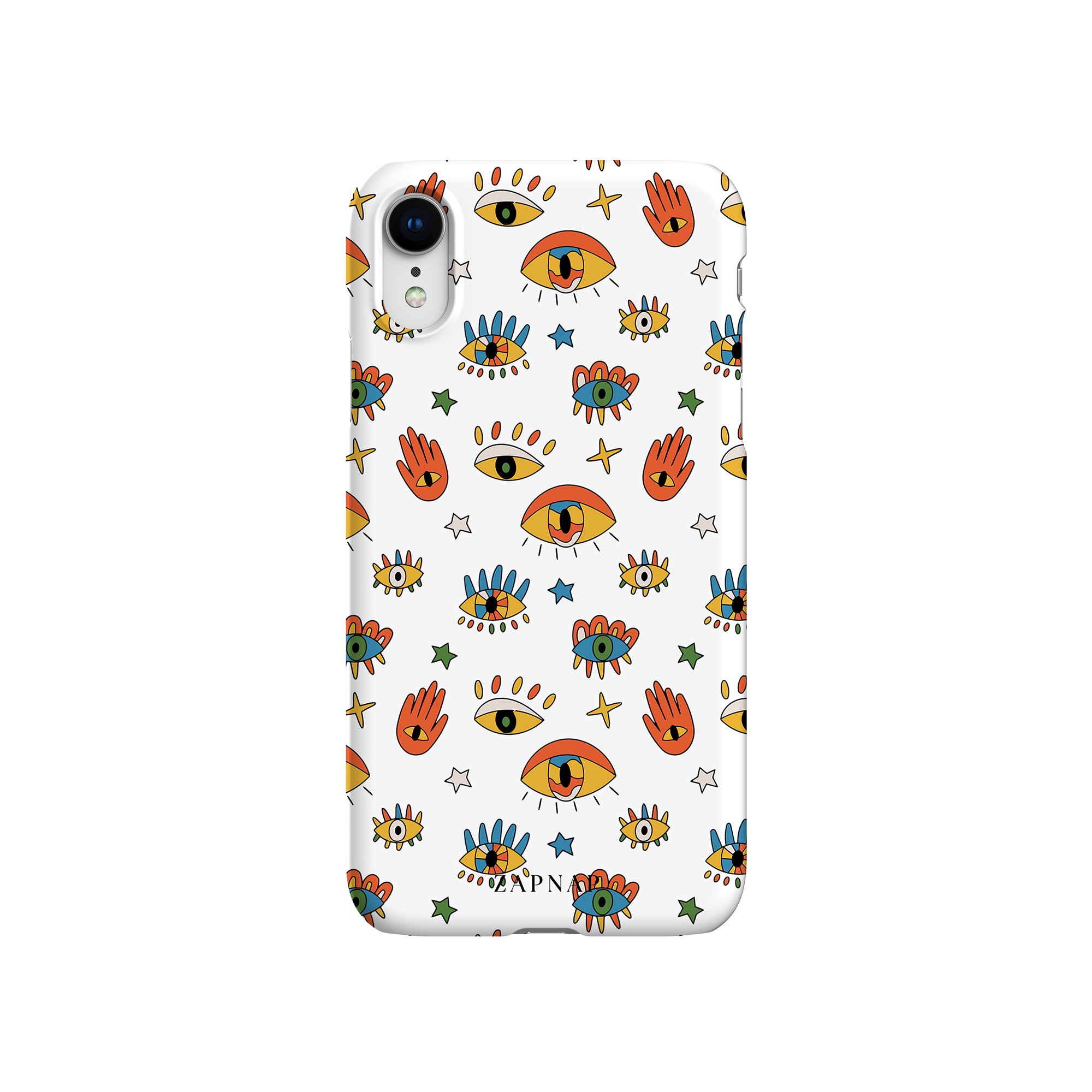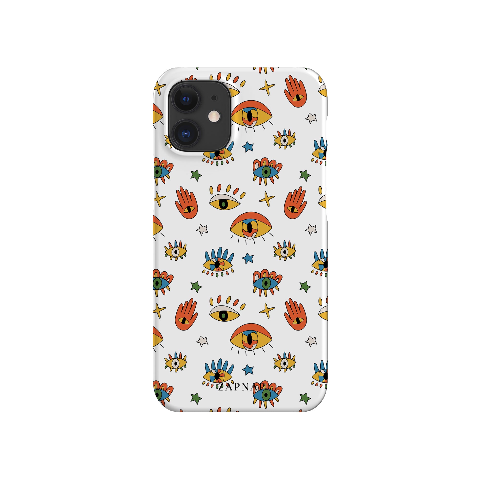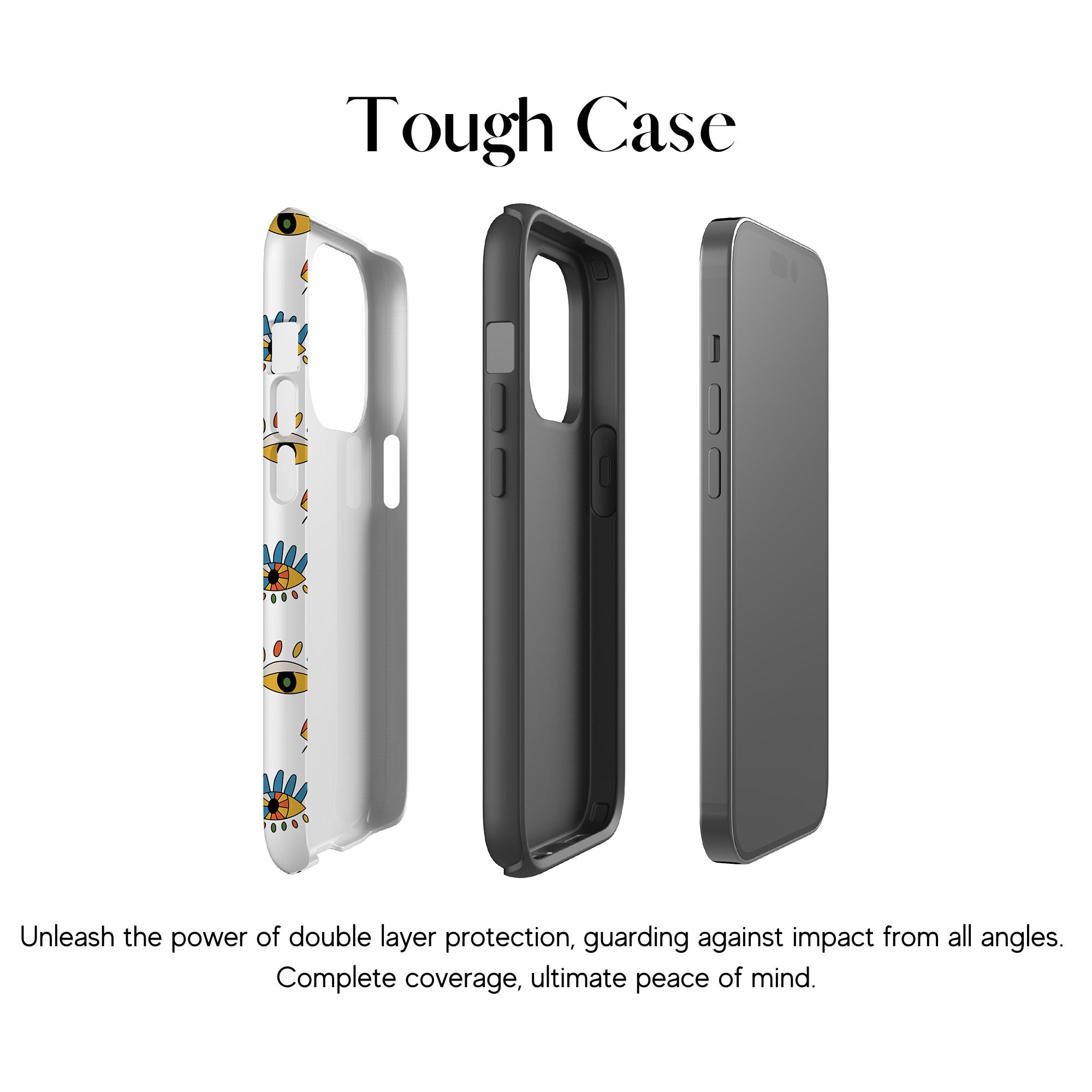 Dit telefoonhoesje heeft een speels en levendig patroon van boze oogmotieven, handen en sterren op een helderwitte achtergrond. De gedurfde kleuren en het grillige ontwerp bieden bescherming en stijl en voegen een vleugje culturele charme en intriges toe aan uw apparaat. 'Guardian Eyes' is perfect voor degenen die unieke en betekenisvolle ontwerpen waarderen, waardoor uw telefoon een opvallend accessoire wordt met een vleugje mystiek.