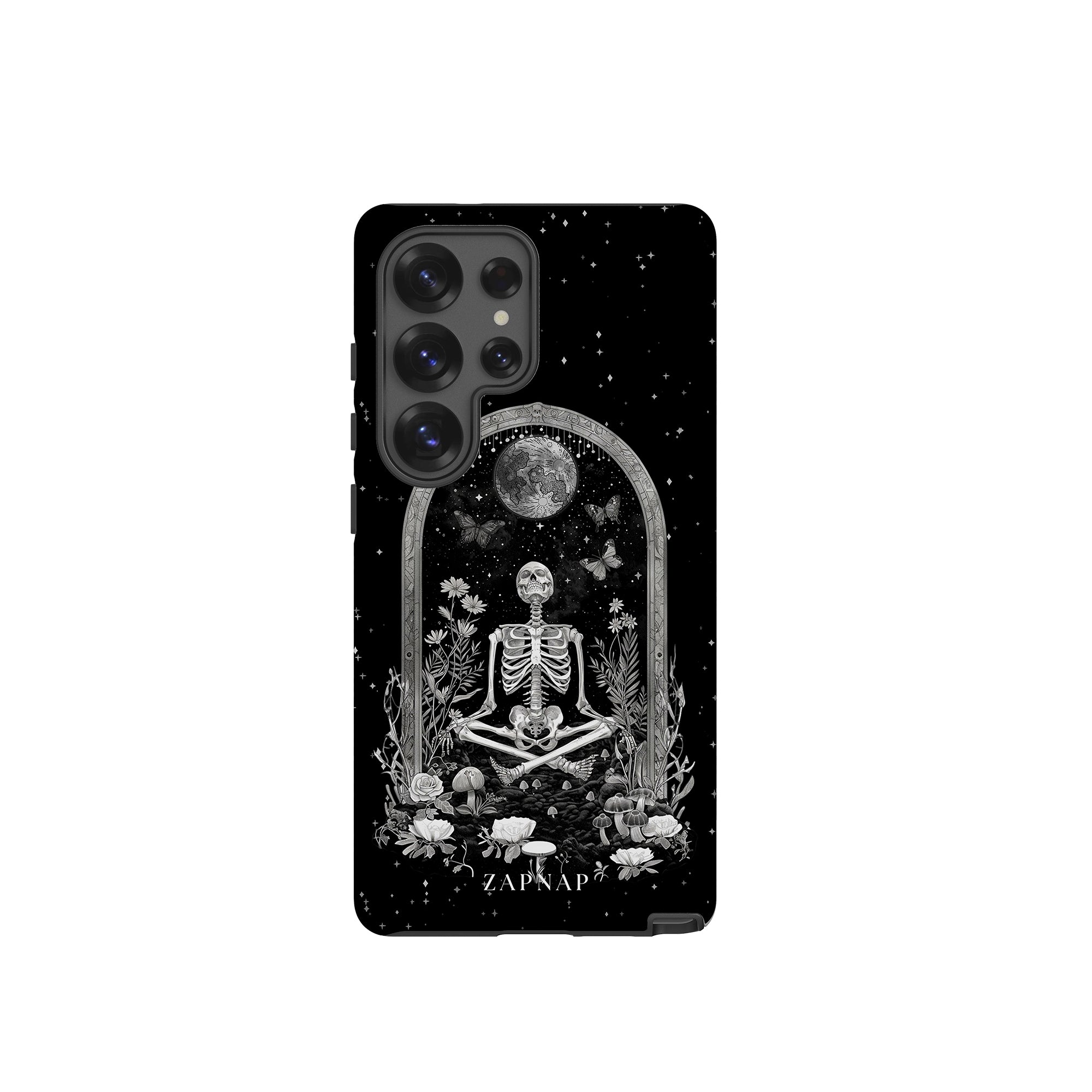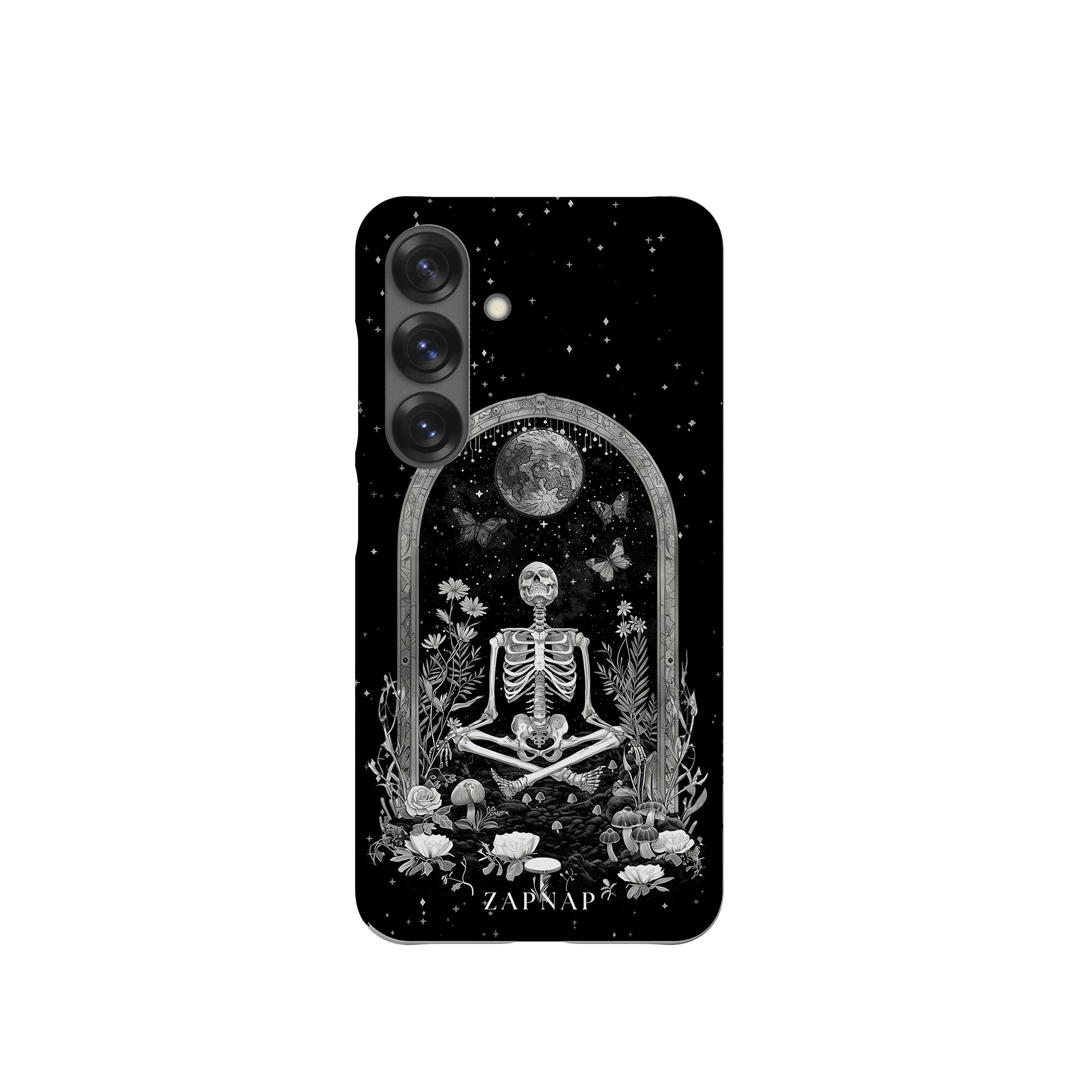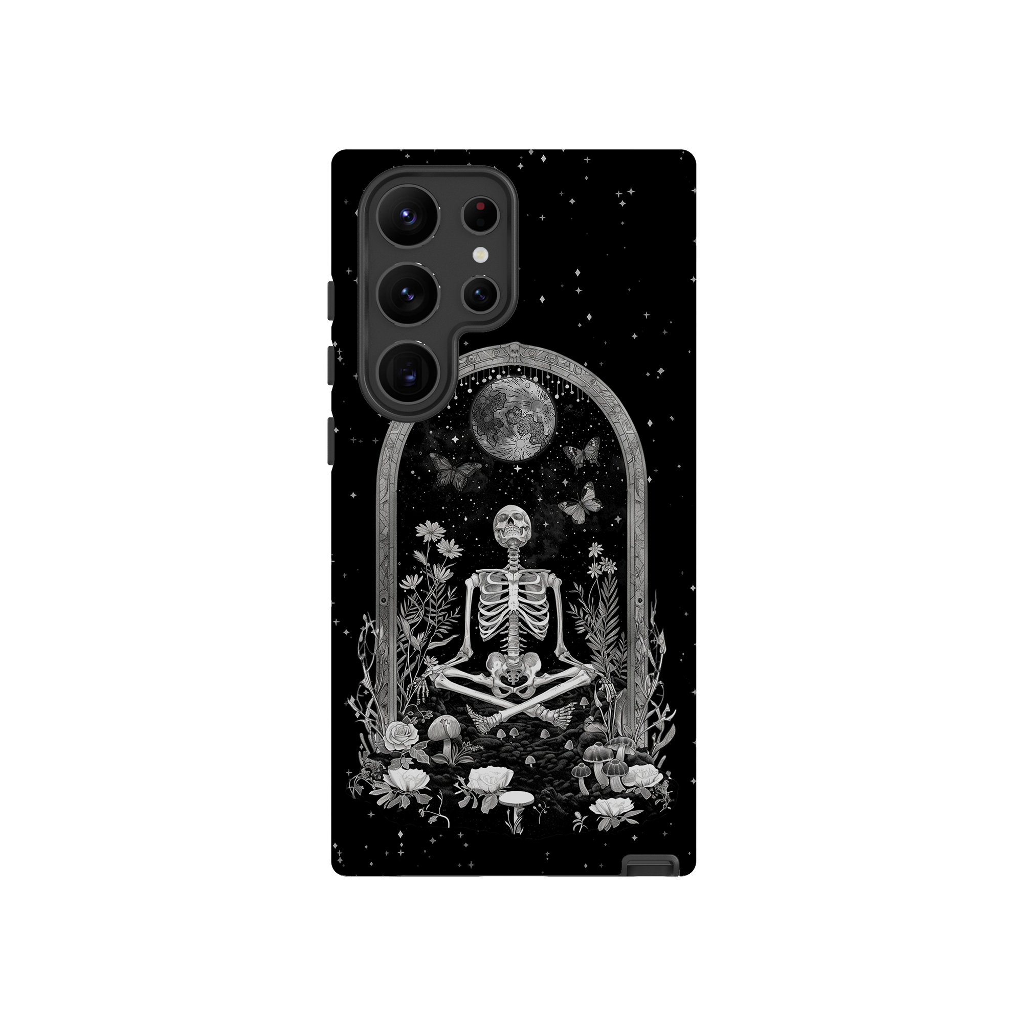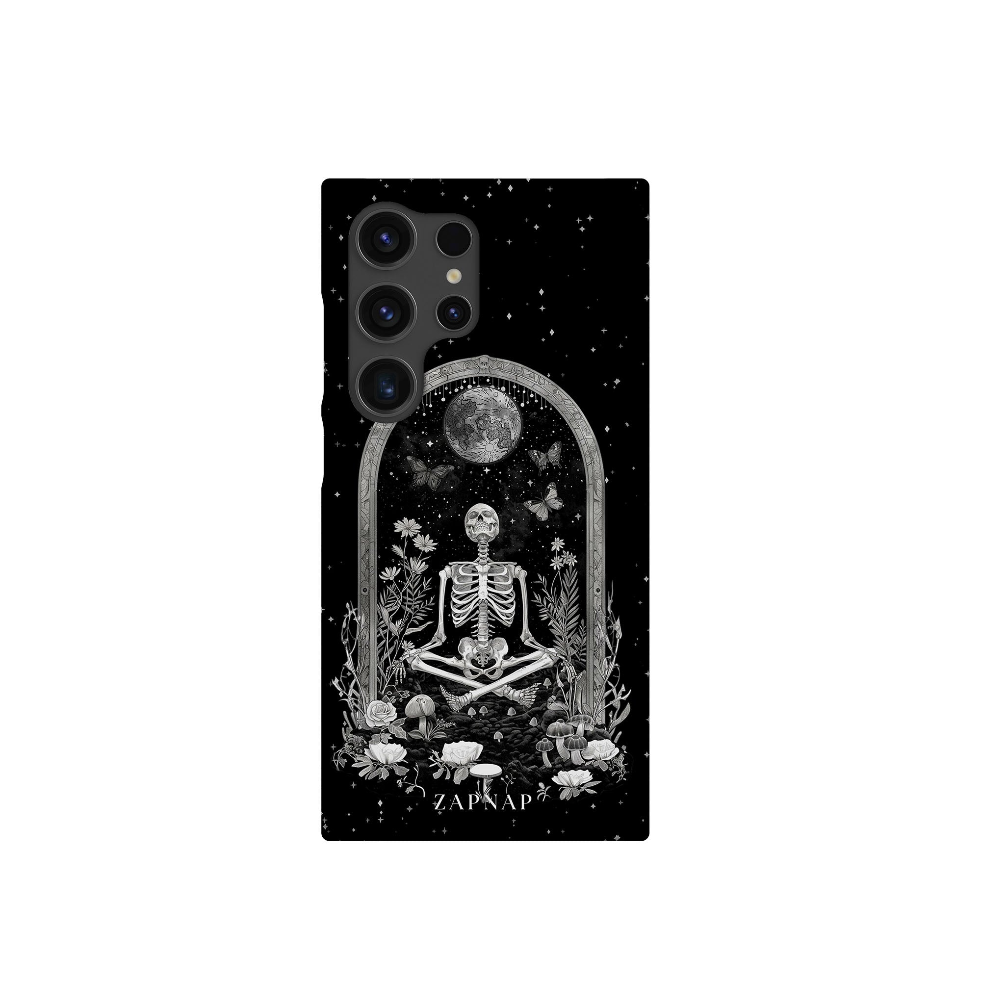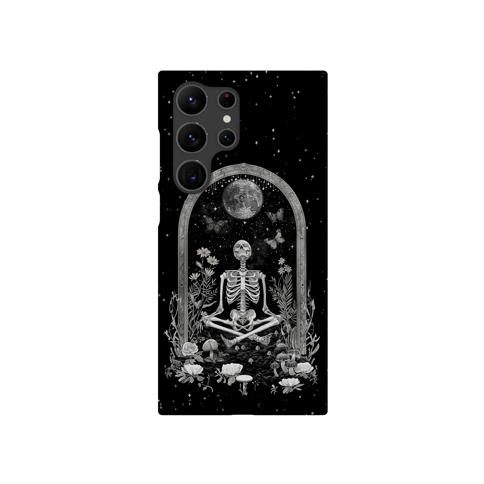 In 'Astral Reflection' mediteert een skelet te midden van bloemen en paddenstoelen onder een sierlijke boog. Vlinders fladderen rond, en de hemelse achtergrond van sterren en de maan versterkt het gotische tafereel en symboliseert een vreedzame unie tussen het aardse en het kosmische rijk.