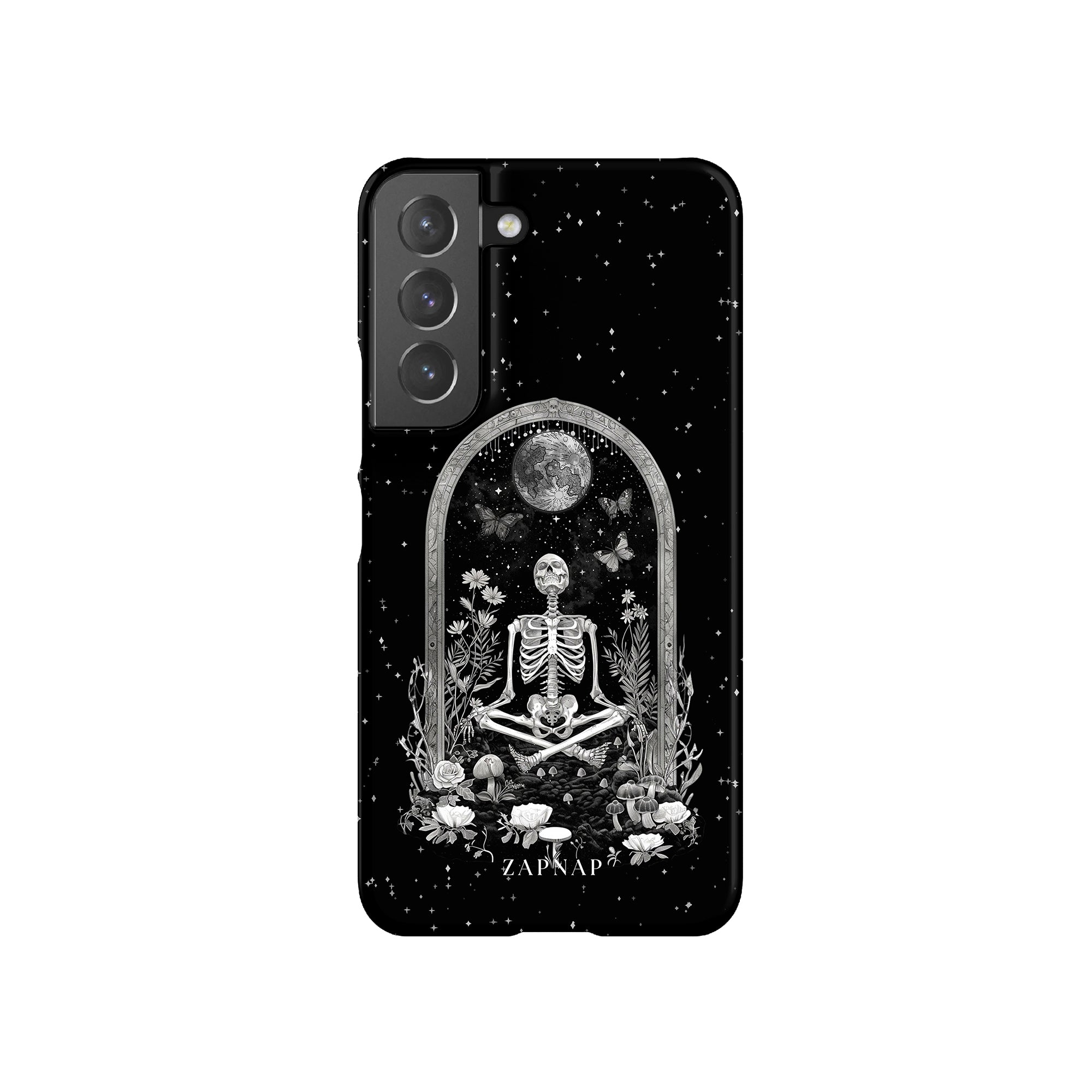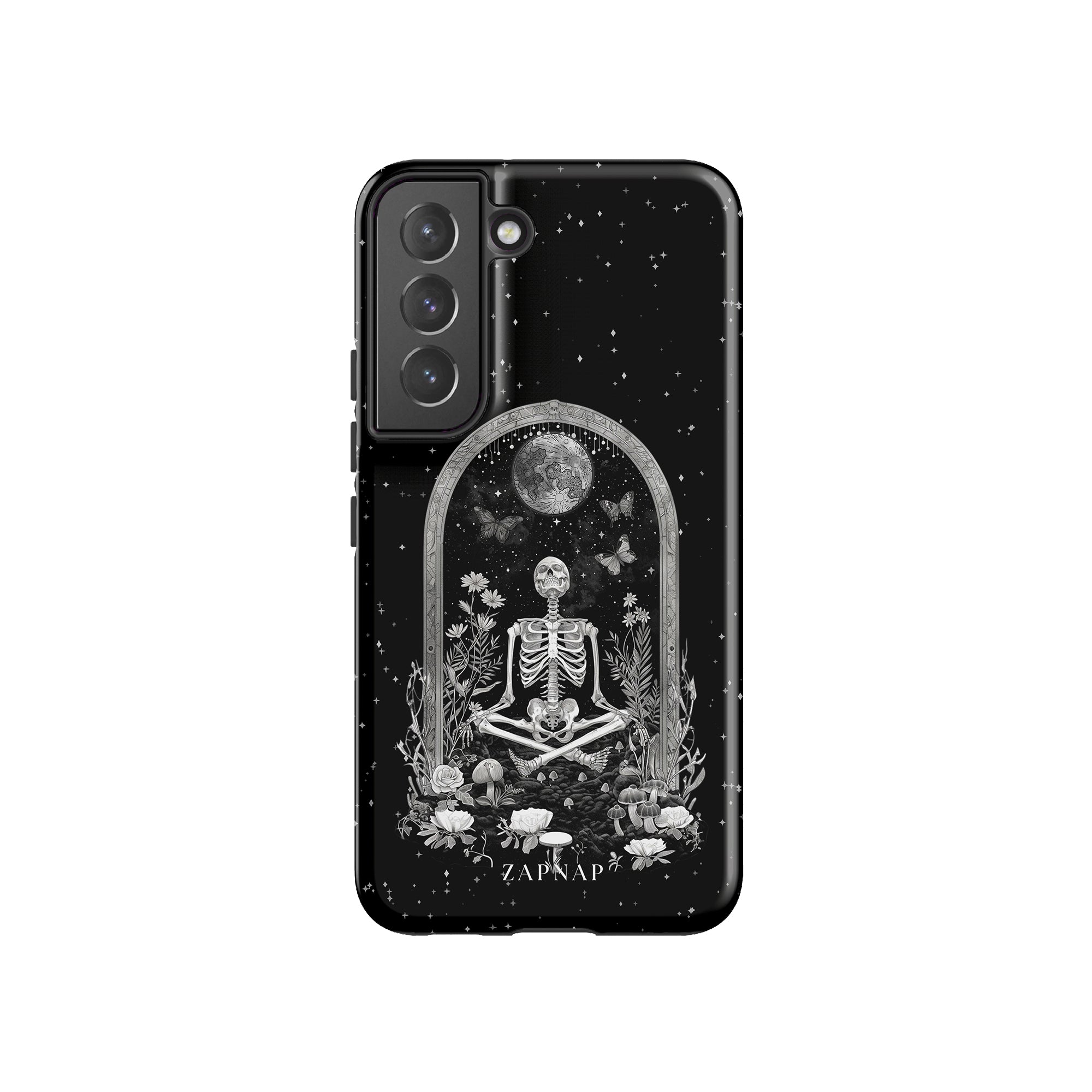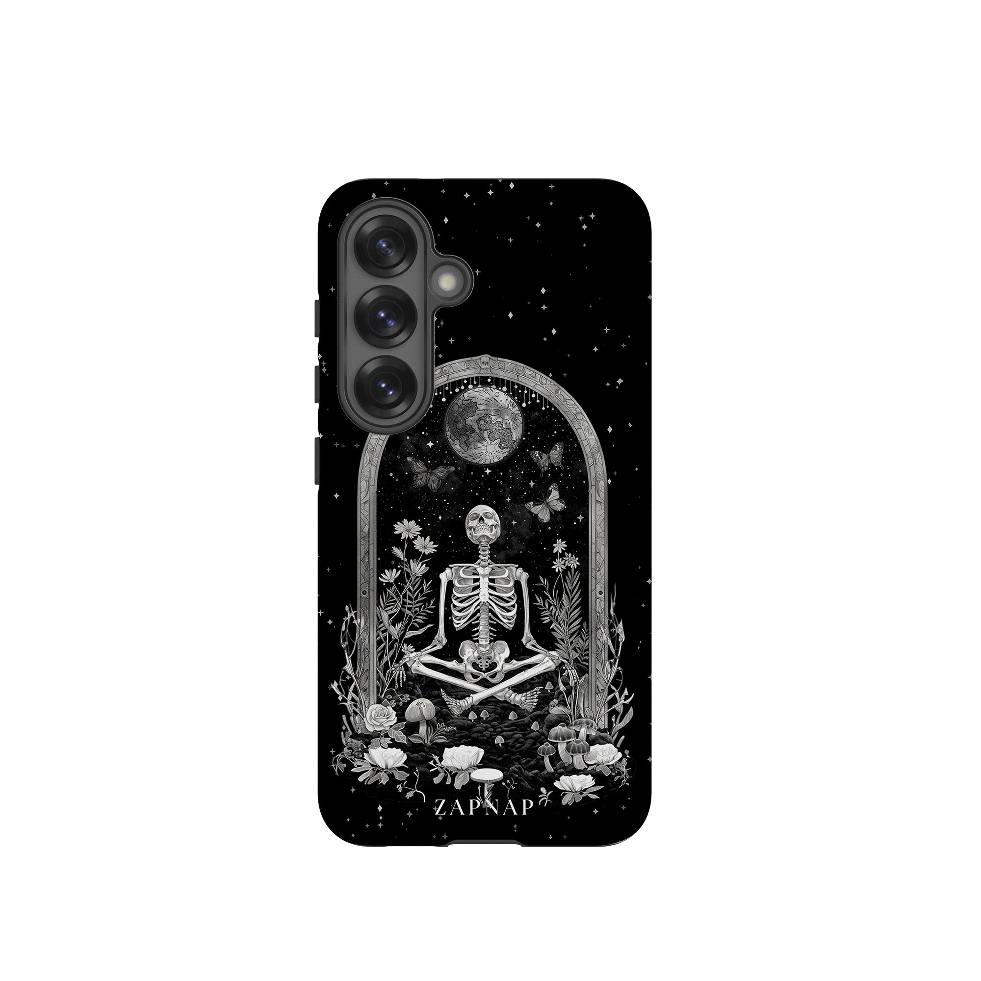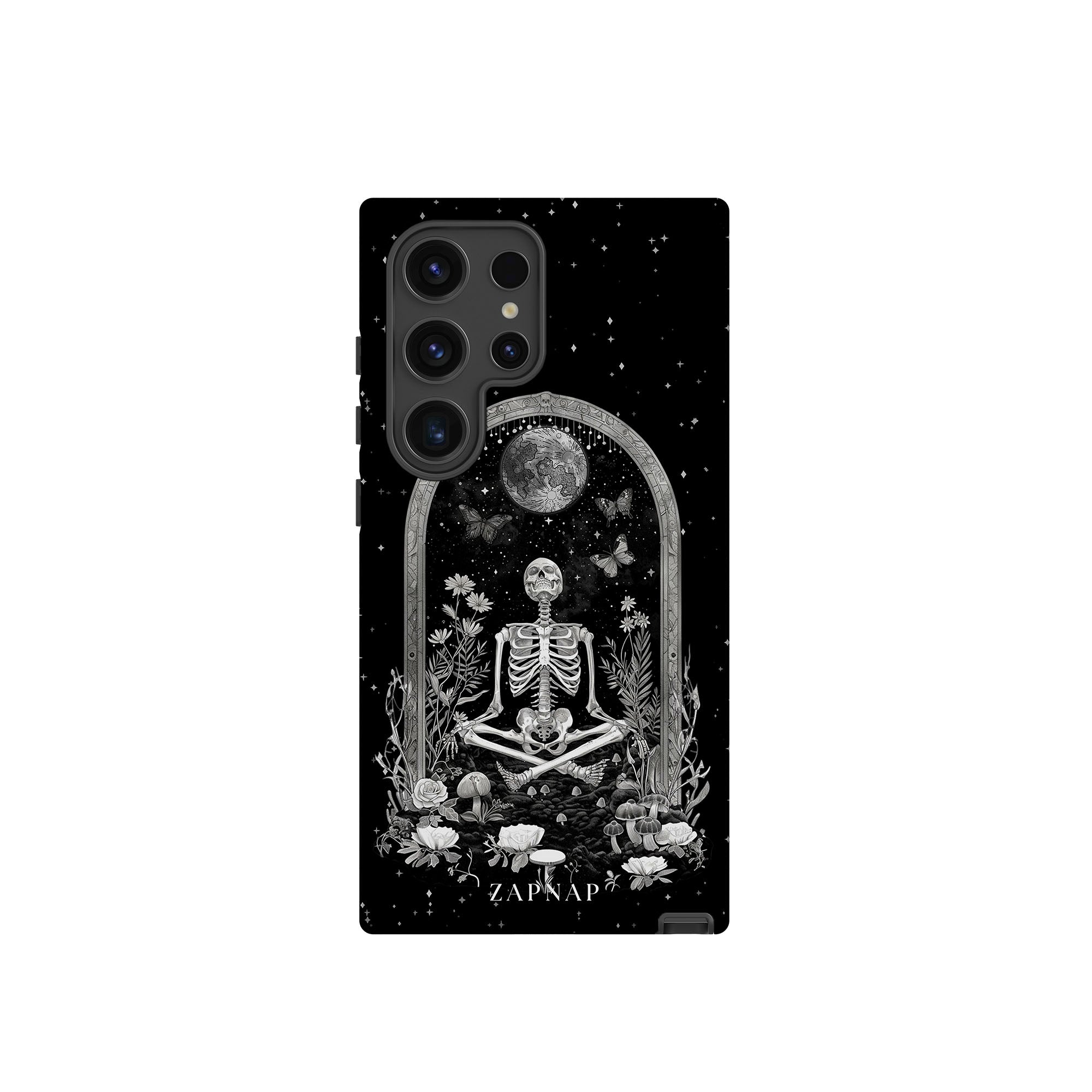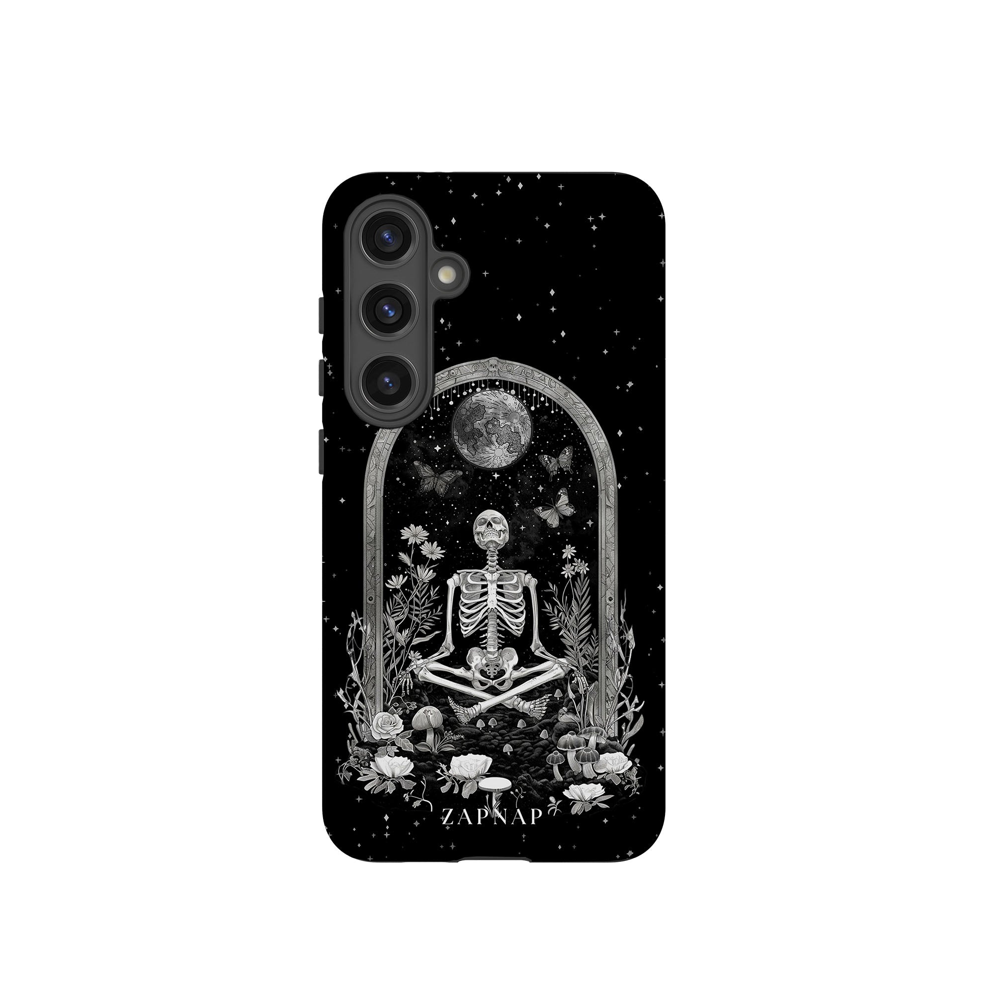 In 'Astral Reflection' mediteert een skelet te midden van bloemen en paddenstoelen onder een sierlijke boog. Vlinders fladderen rond, en de hemelse achtergrond van sterren en de maan versterkt het gotische tafereel en symboliseert een vreedzame unie tussen het aardse en het kosmische rijk.