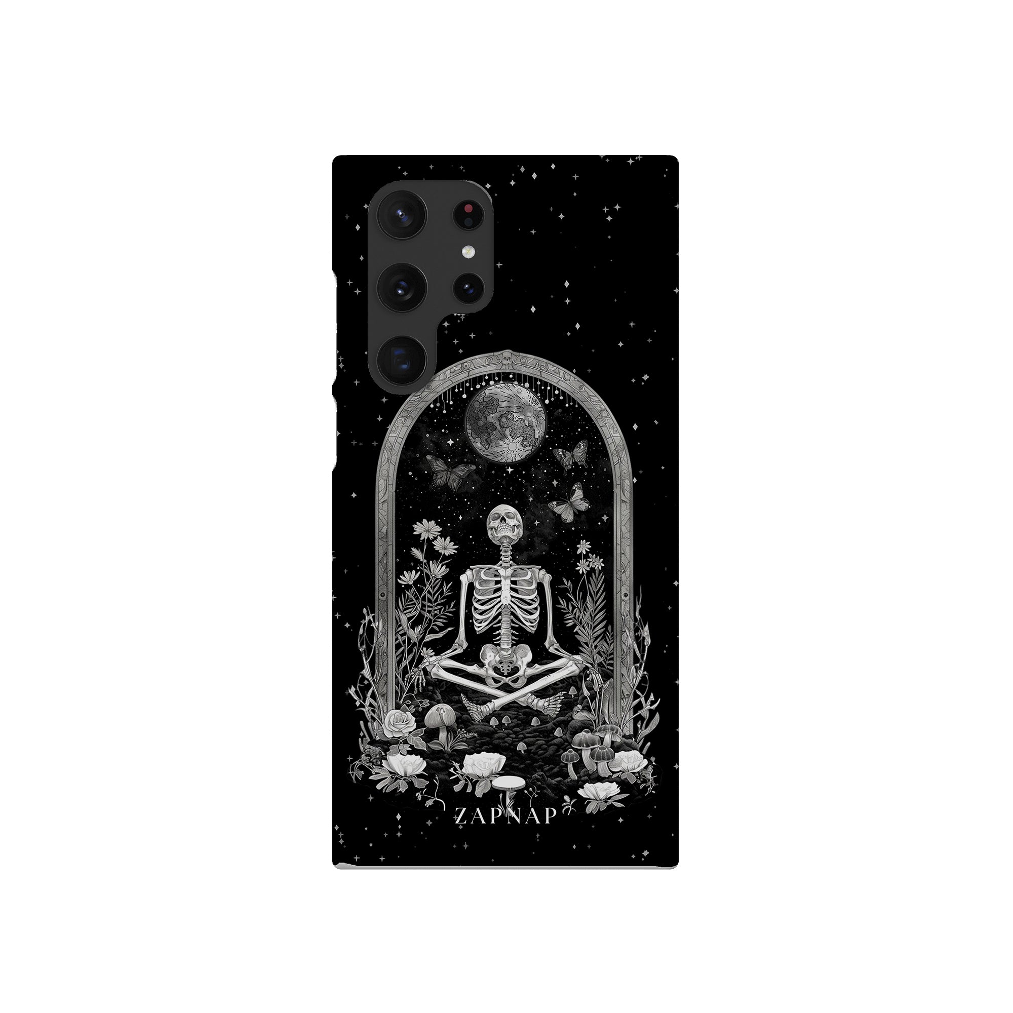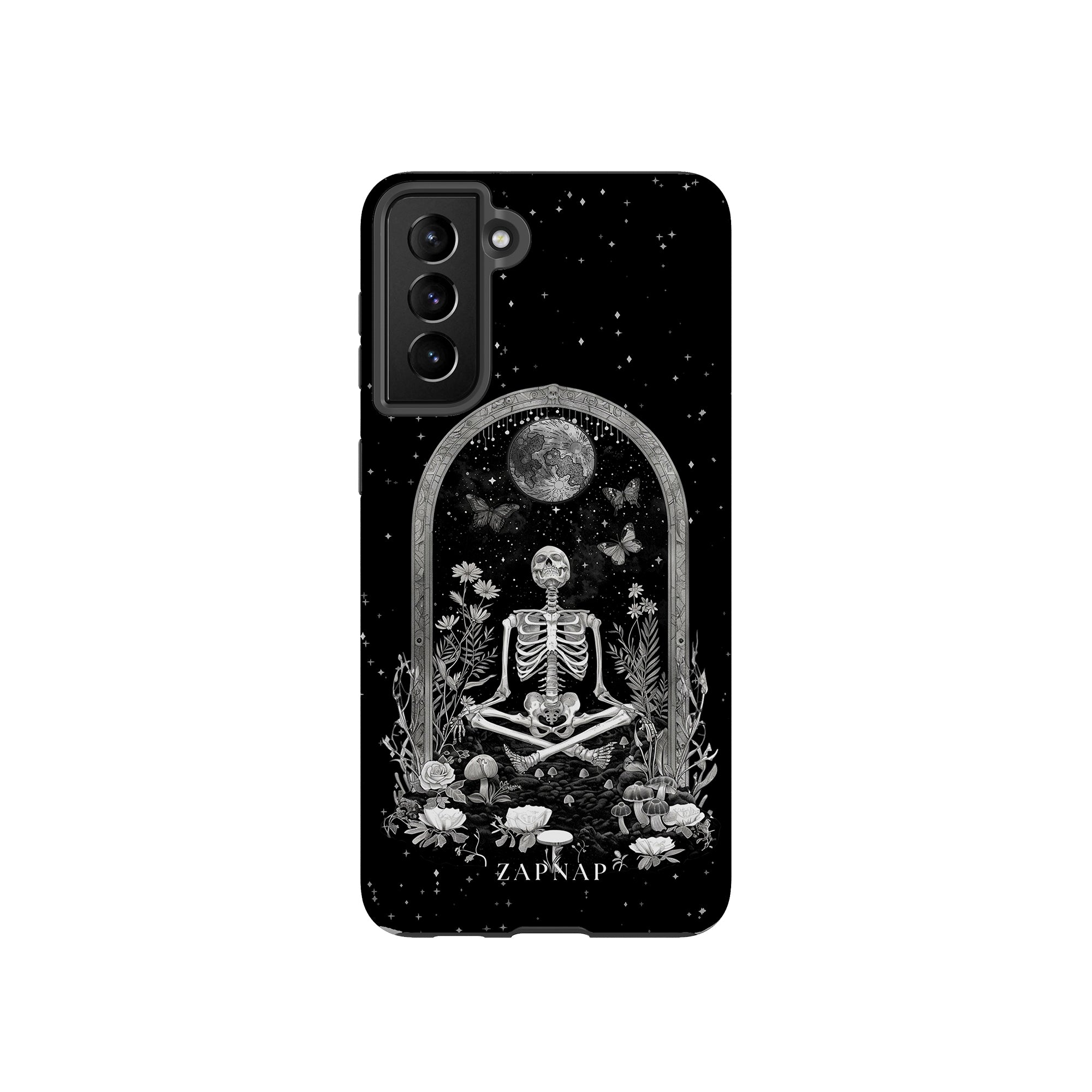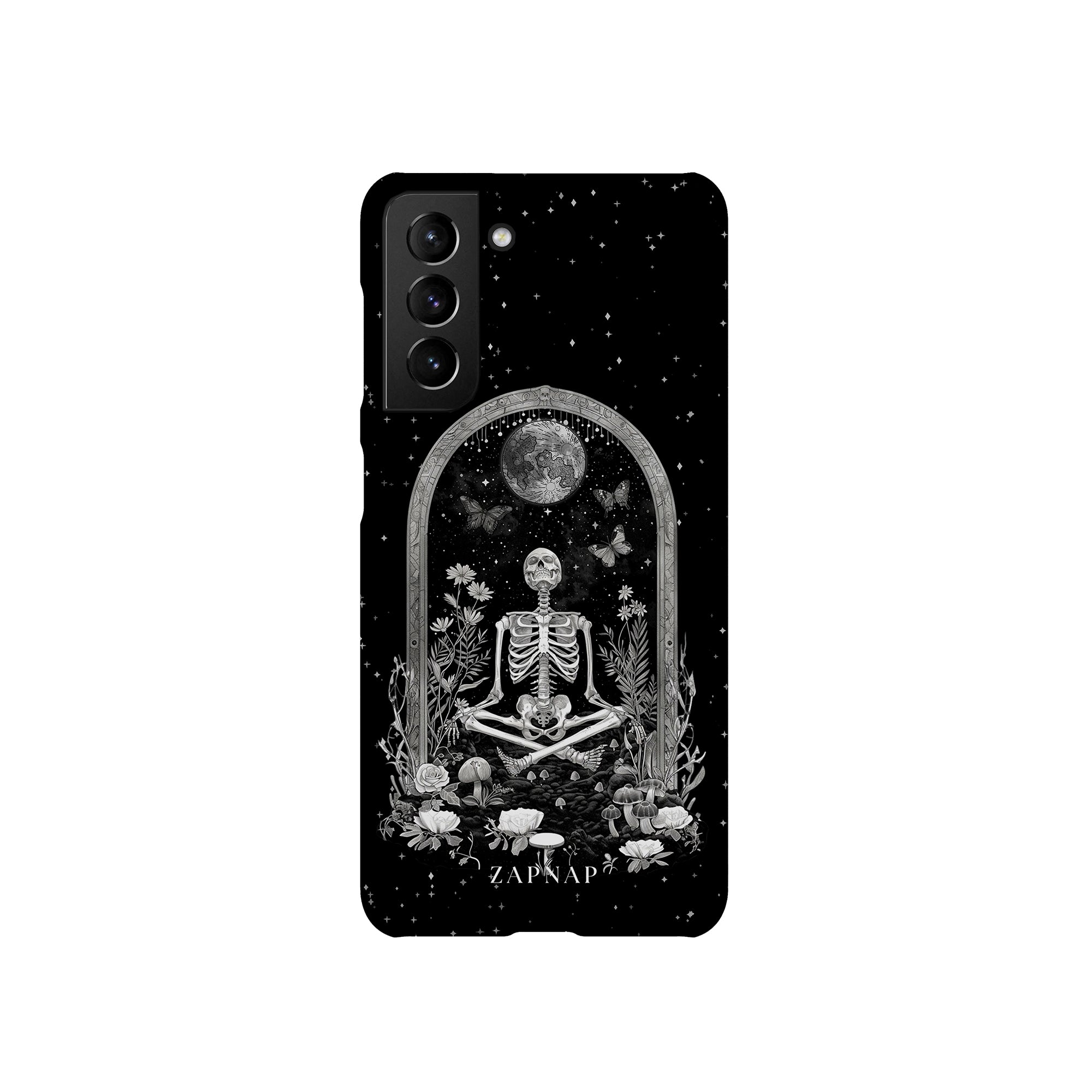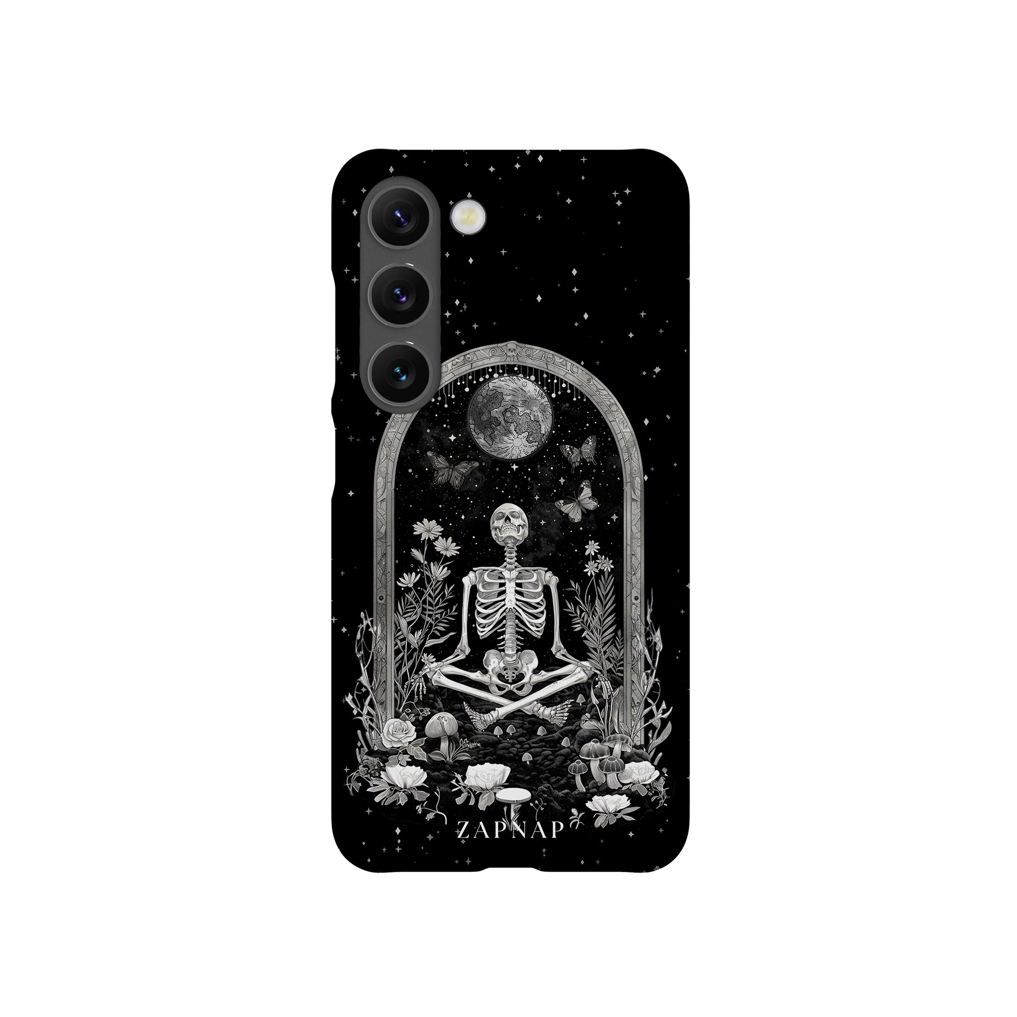 In 'Astral Reflection' mediteert een skelet te midden van bloemen en paddenstoelen onder een sierlijke boog. Vlinders fladderen rond, en de hemelse achtergrond van sterren en de maan versterkt het gotische tafereel en symboliseert een vreedzame unie tussen het aardse en het kosmische rijk.