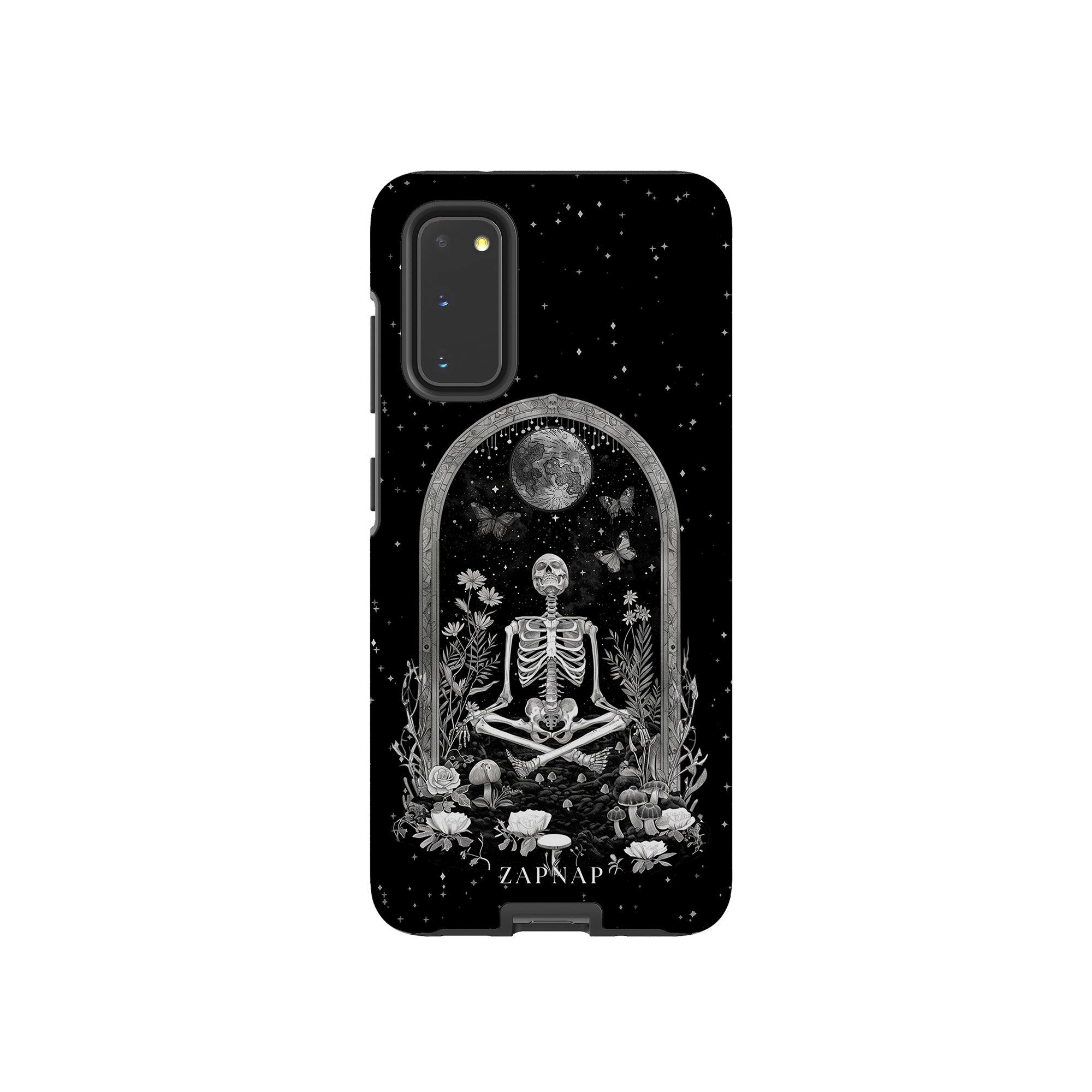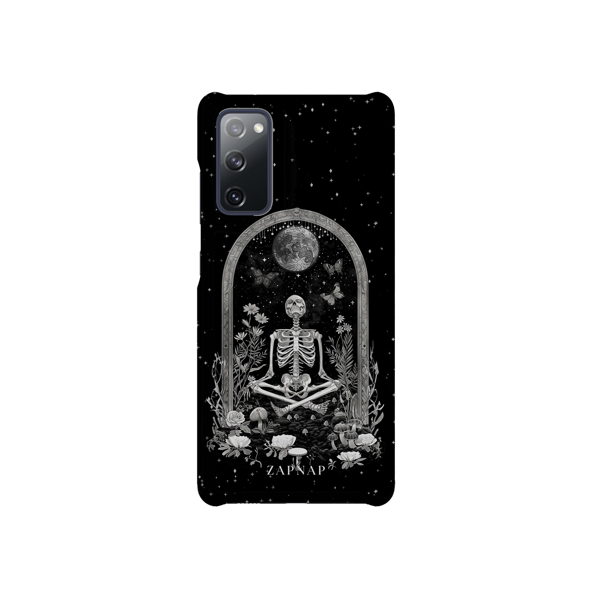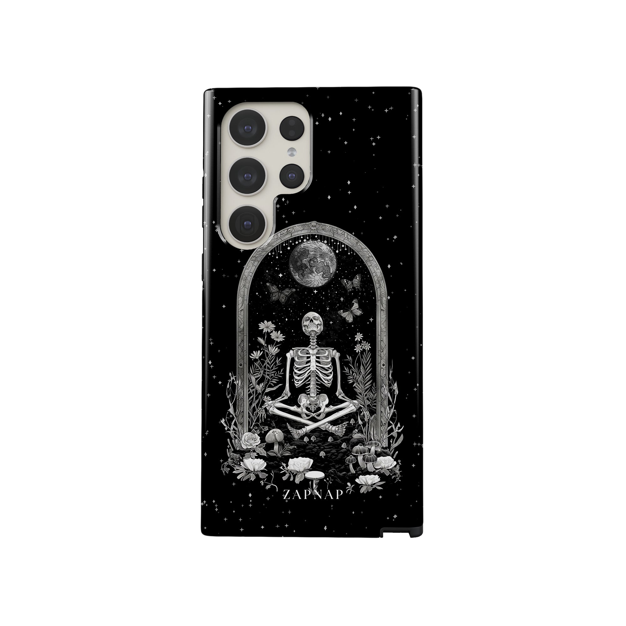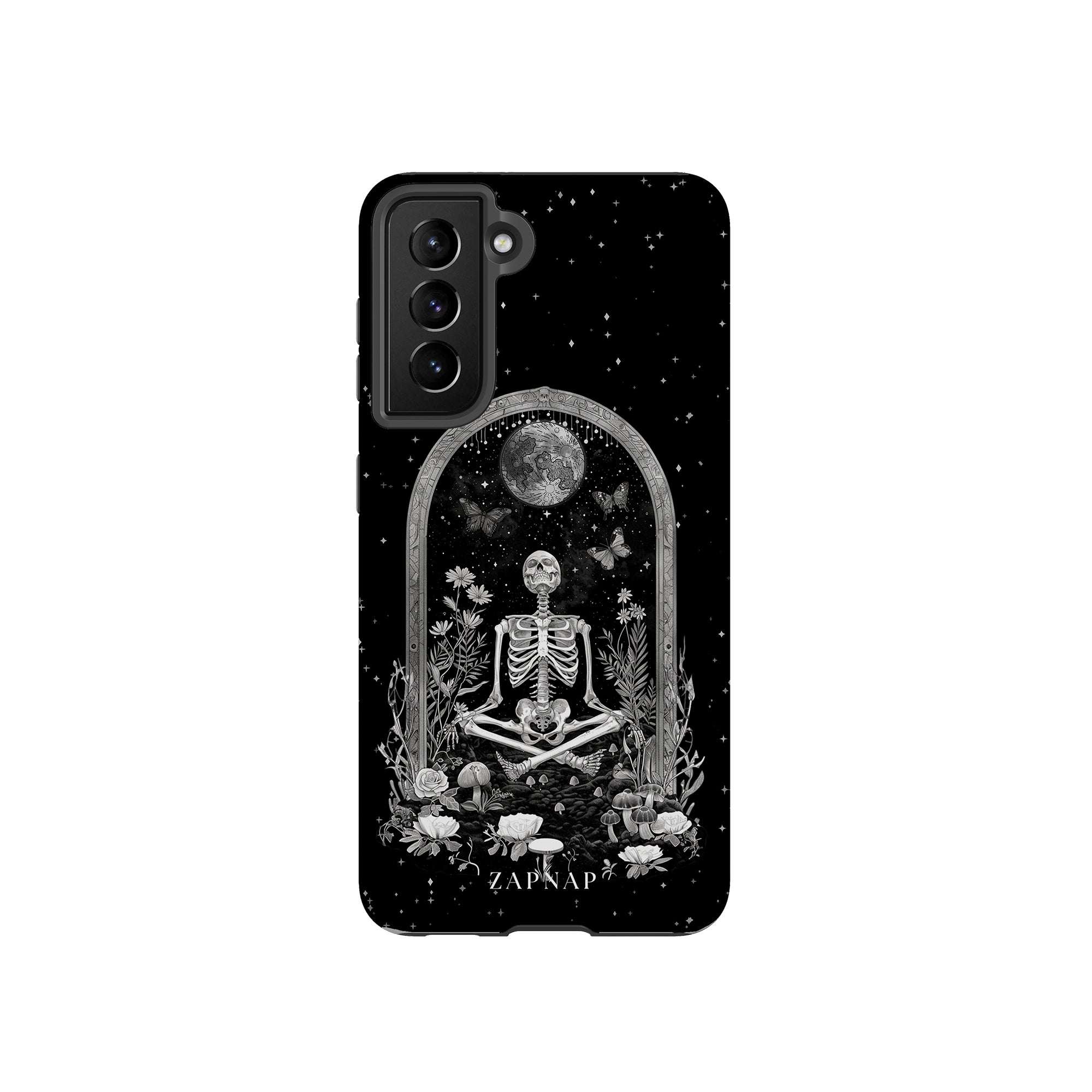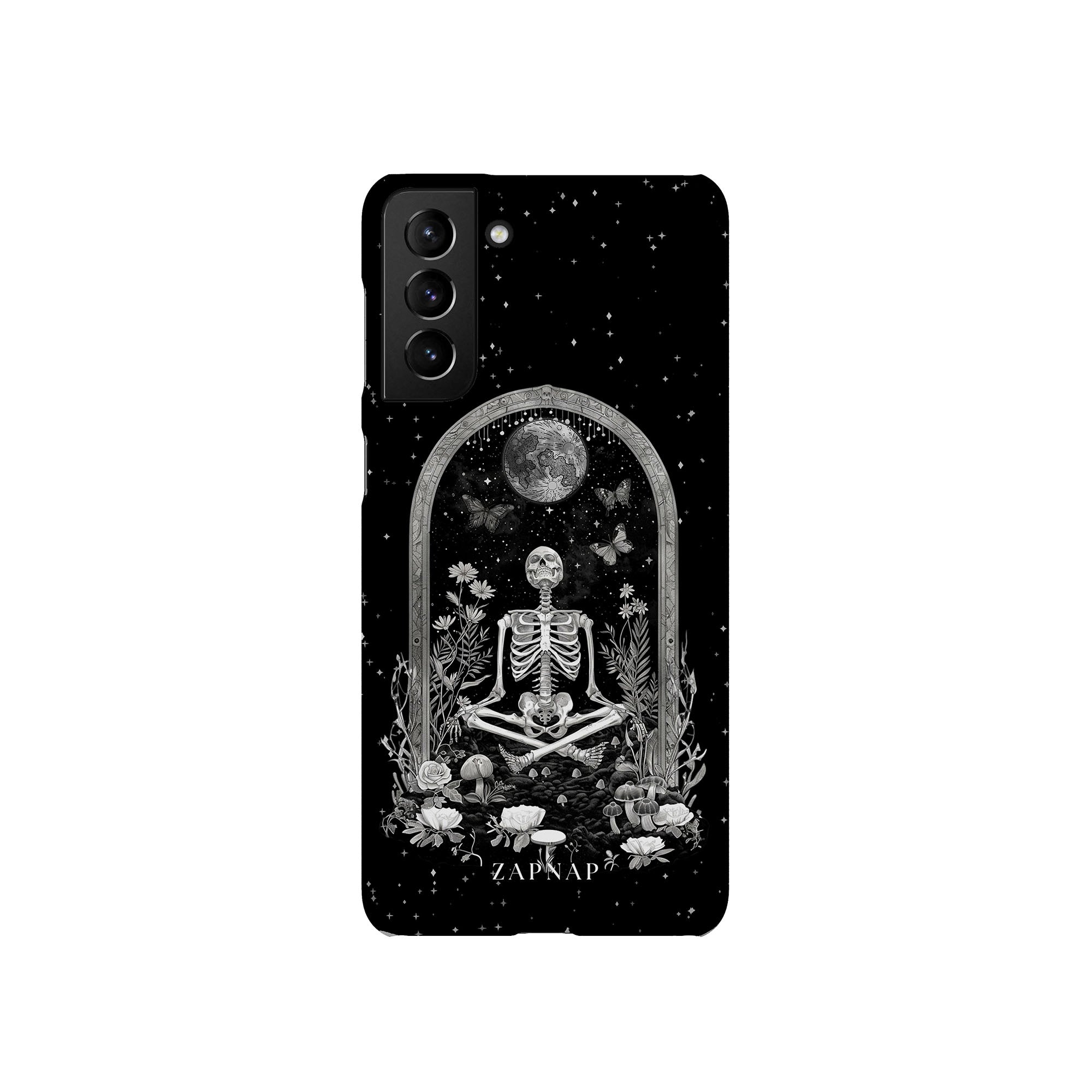 In 'Astral Reflection' mediteert een skelet te midden van bloemen en paddenstoelen onder een sierlijke boog. Vlinders fladderen rond, en de hemelse achtergrond van sterren en de maan versterkt het gotische tafereel en symboliseert een vreedzame unie tussen het aardse en het kosmische rijk.