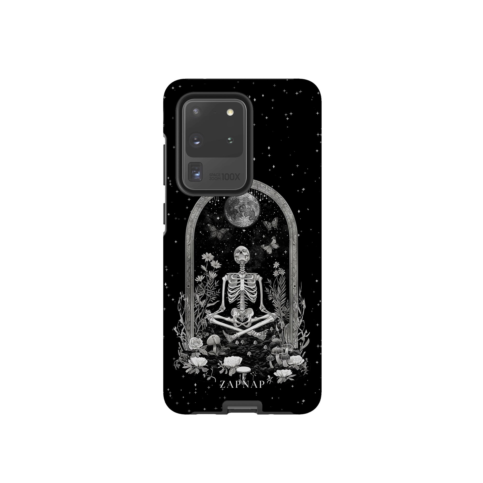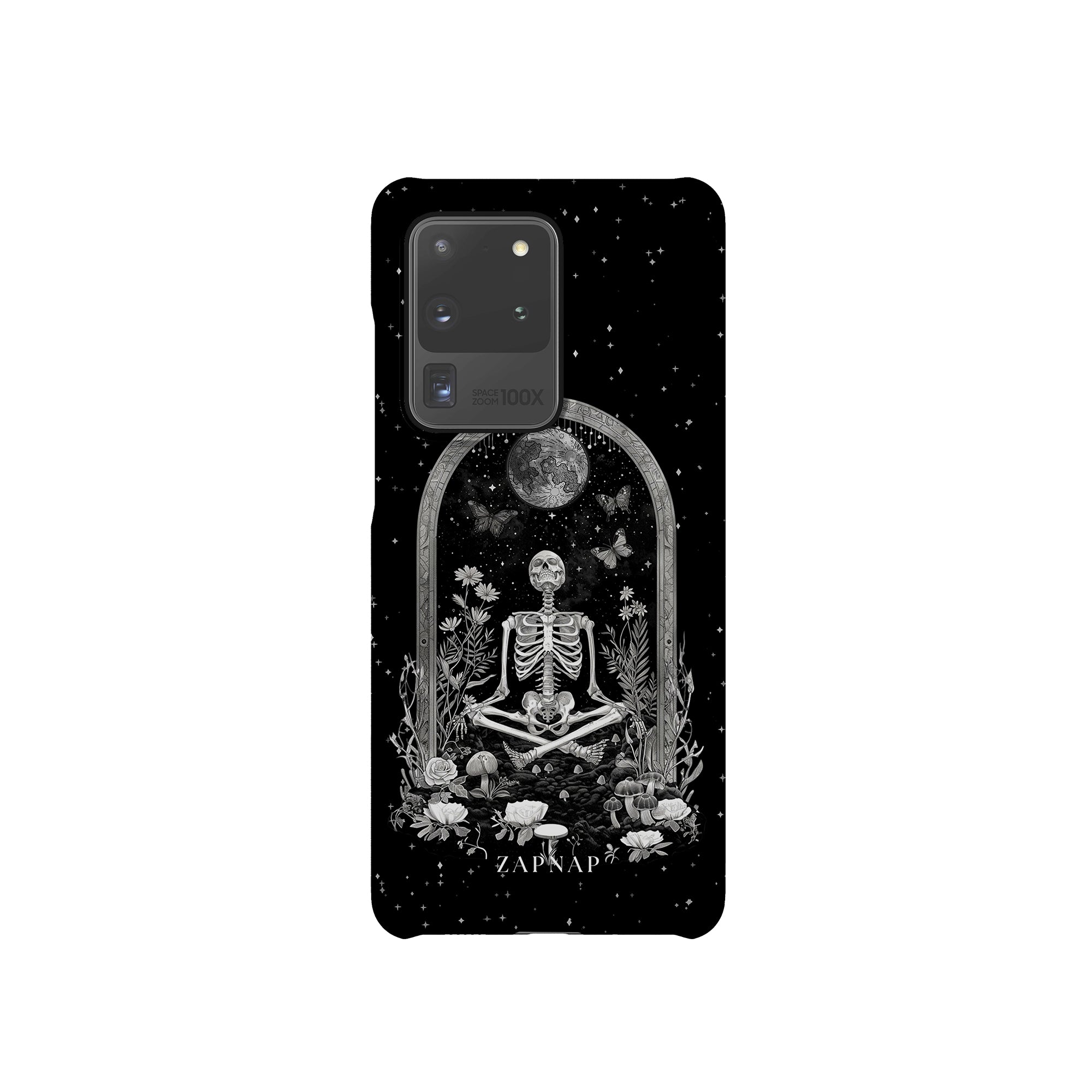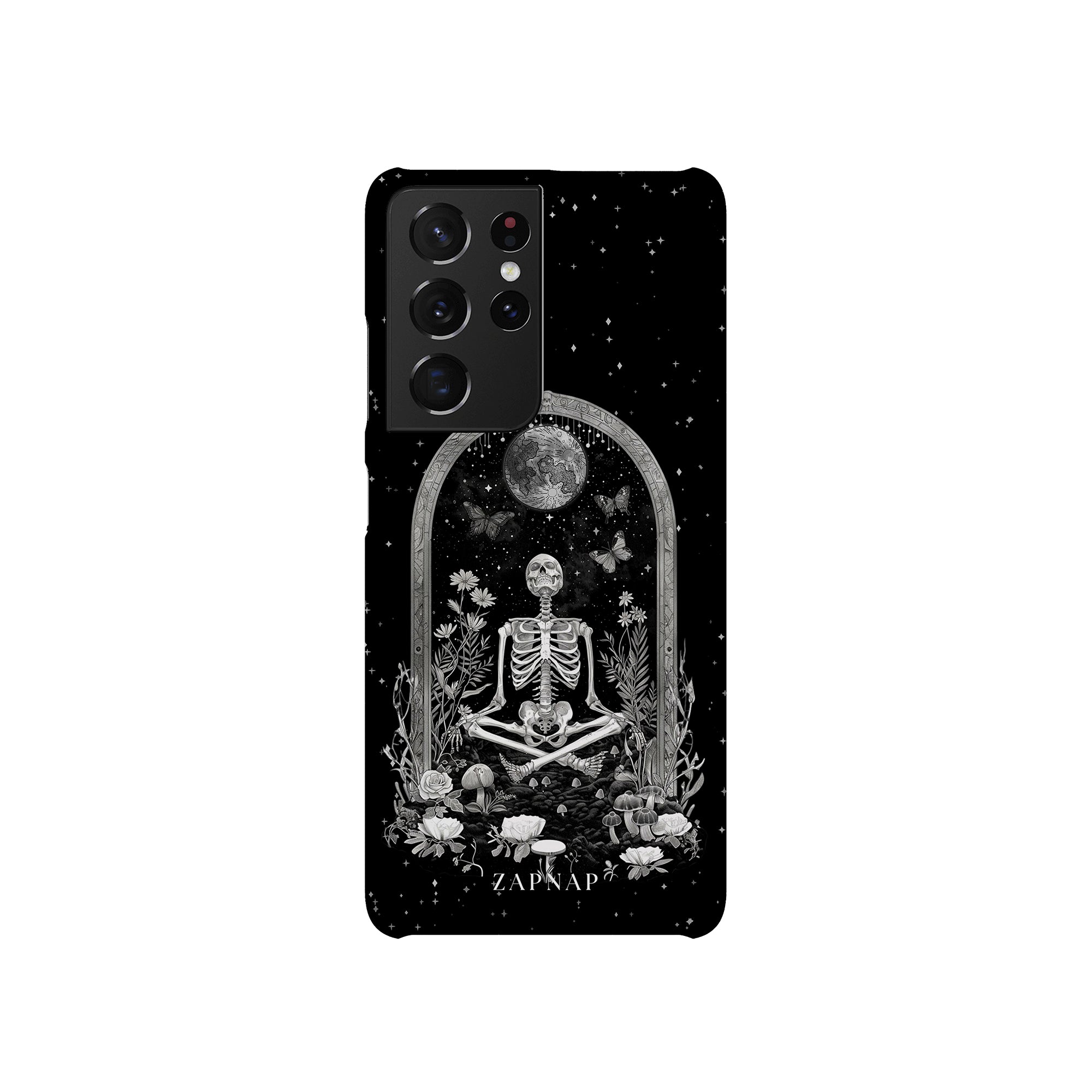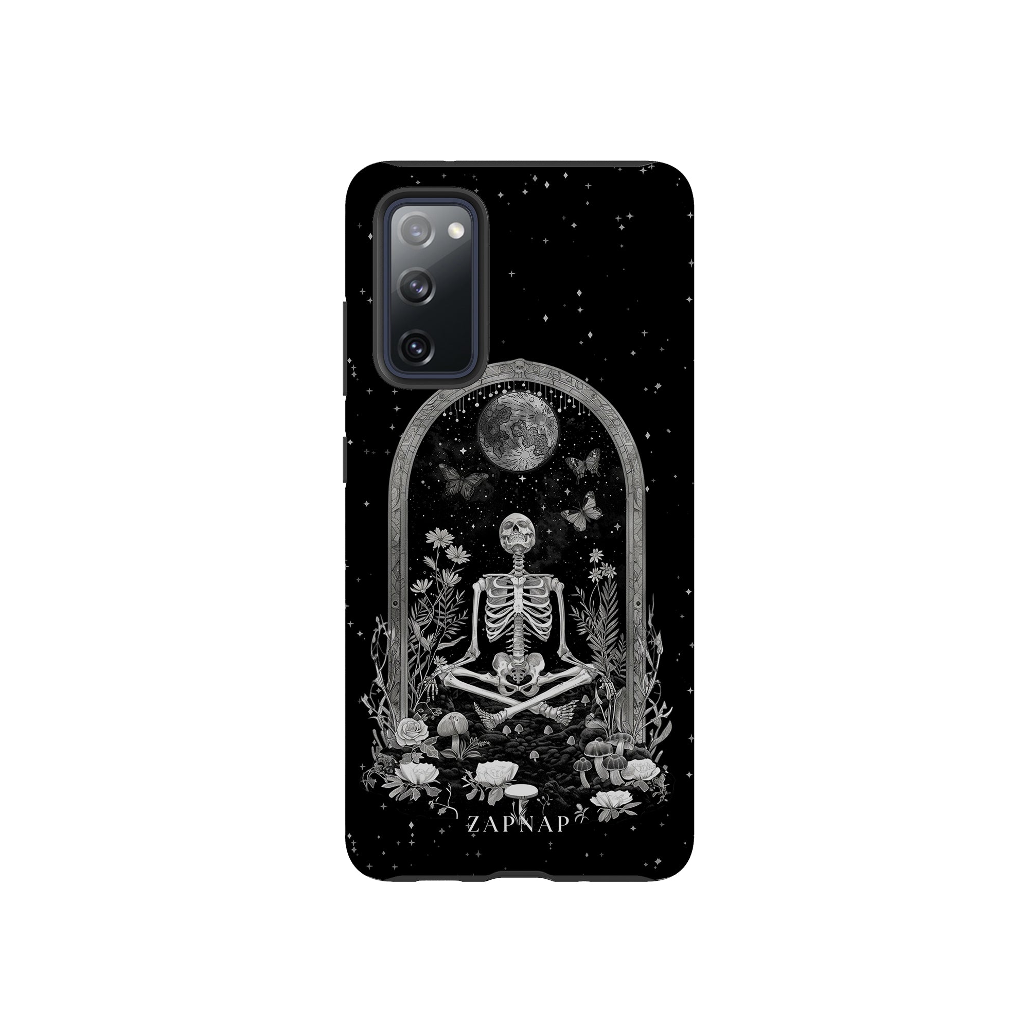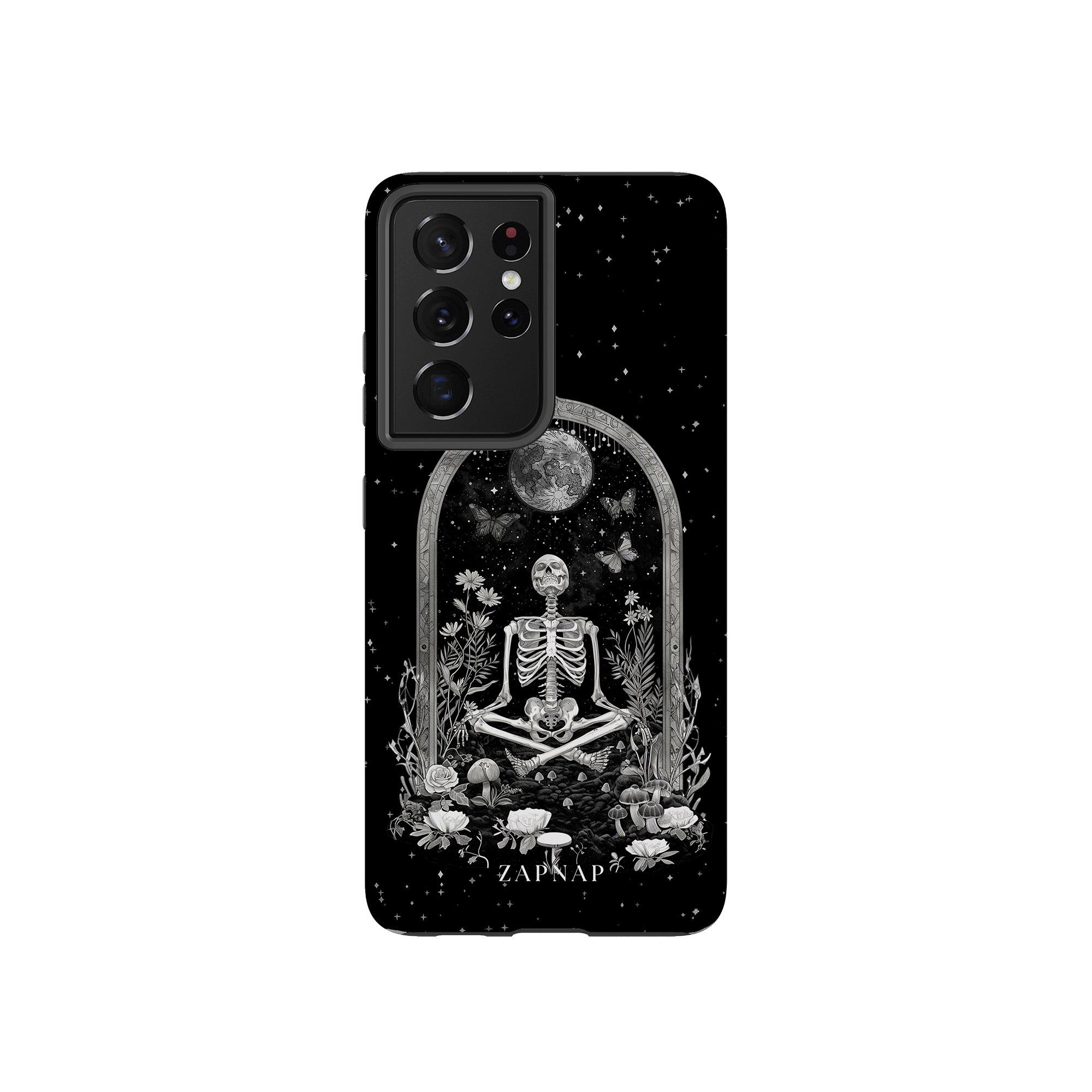 In 'Astral Reflection' mediteert een skelet te midden van bloemen en paddenstoelen onder een sierlijke boog. Vlinders fladderen rond, en de hemelse achtergrond van sterren en de maan versterkt het gotische tafereel en symboliseert een vreedzame unie tussen het aardse en het kosmische rijk.