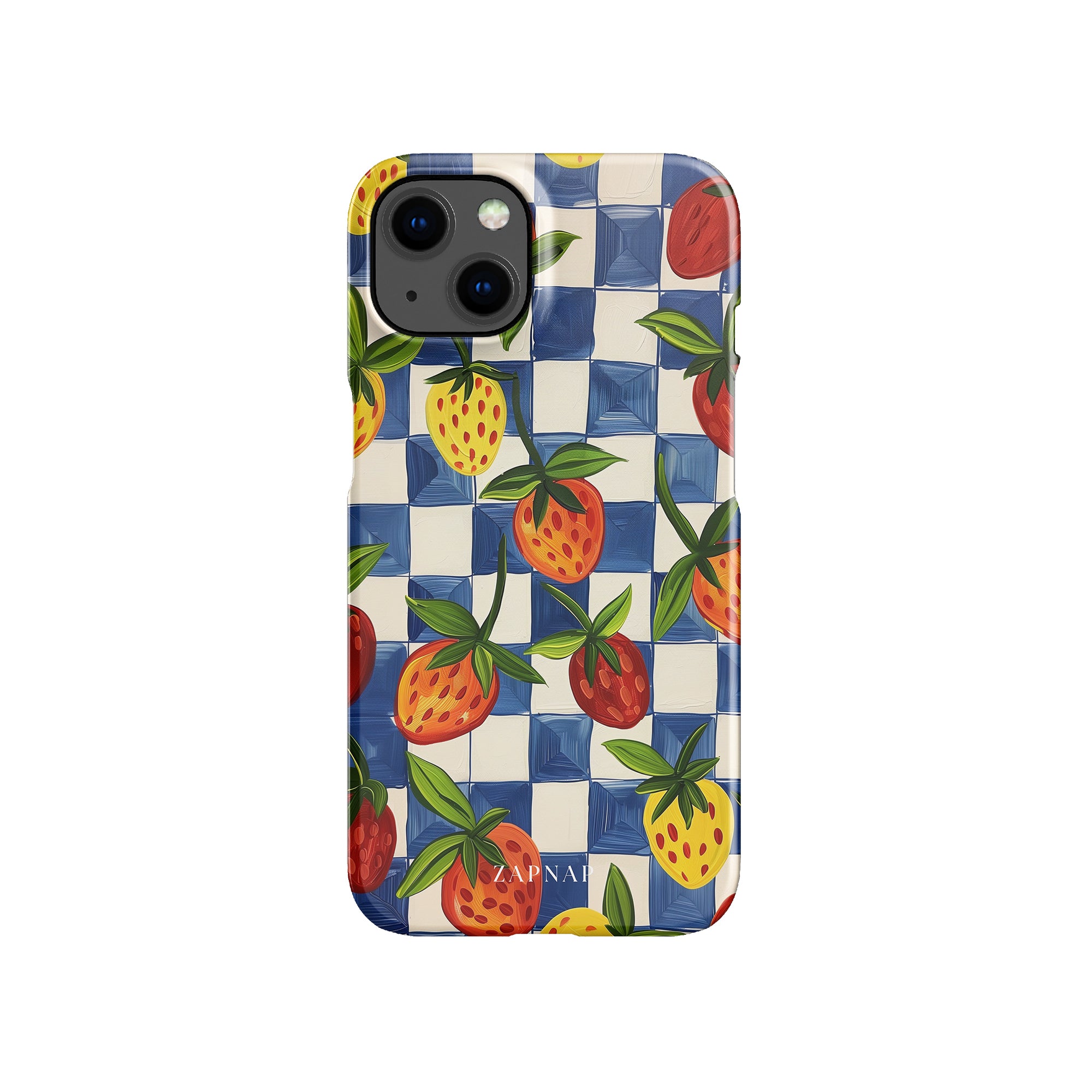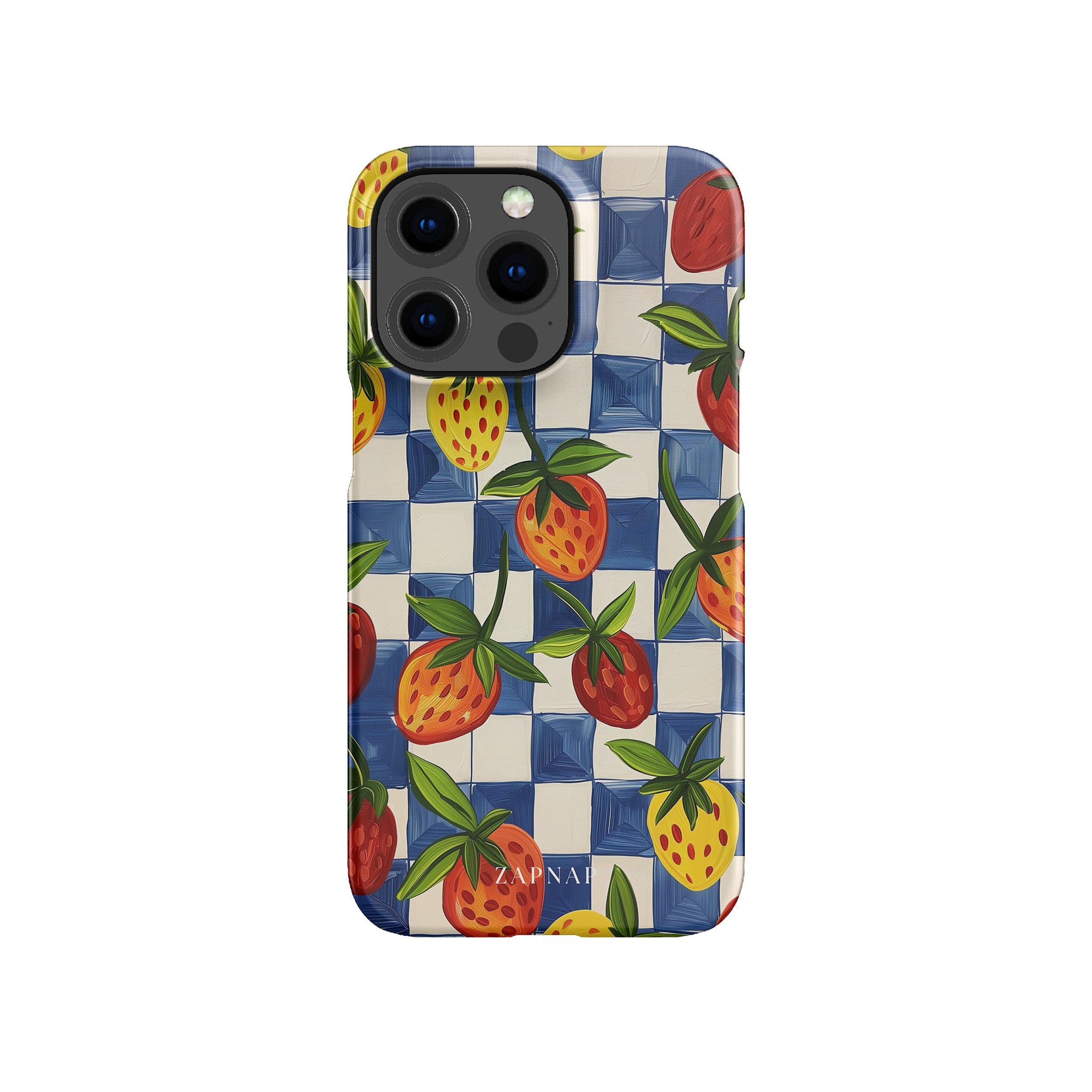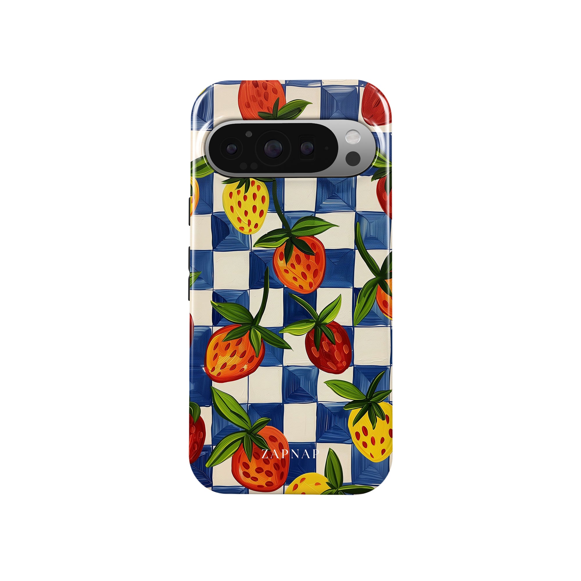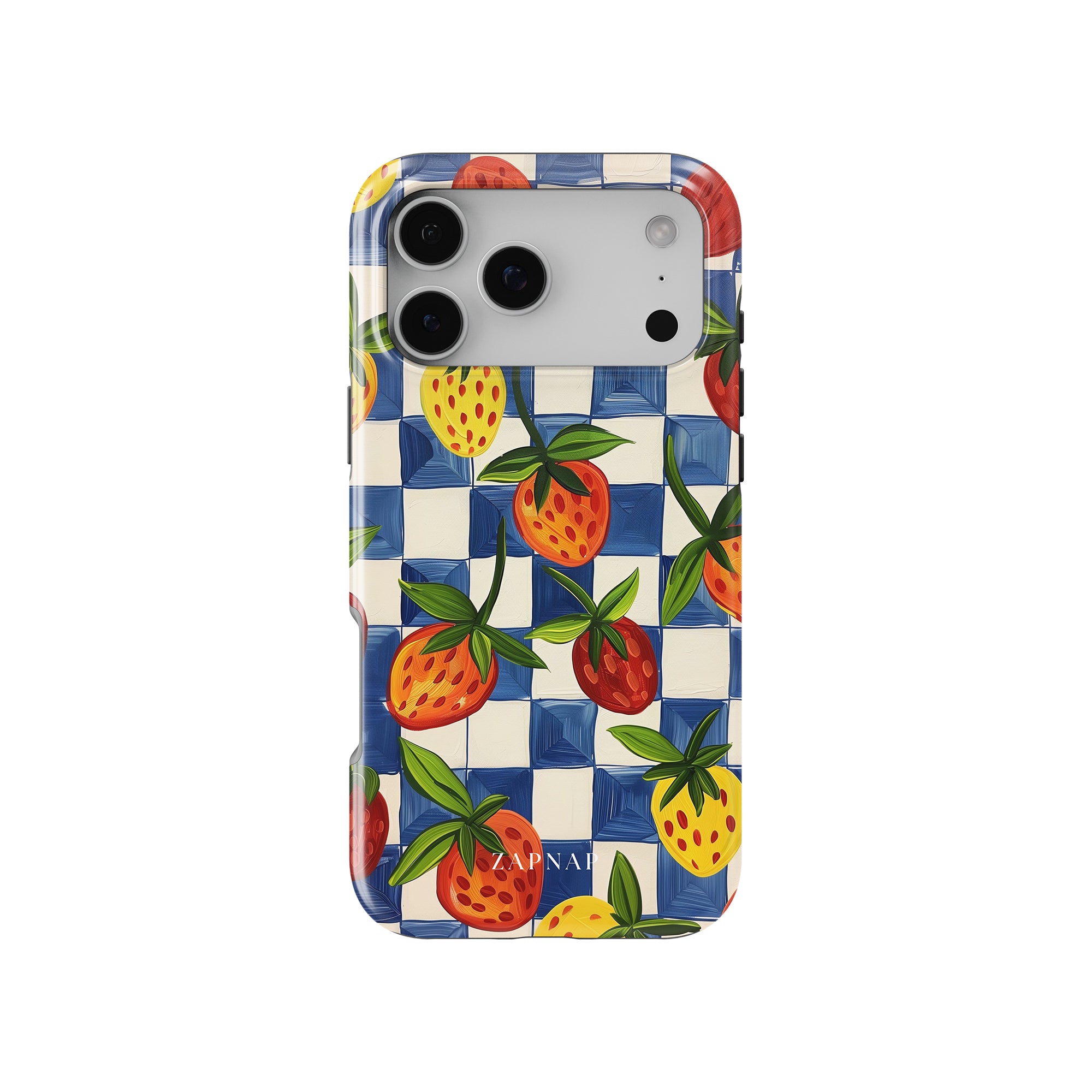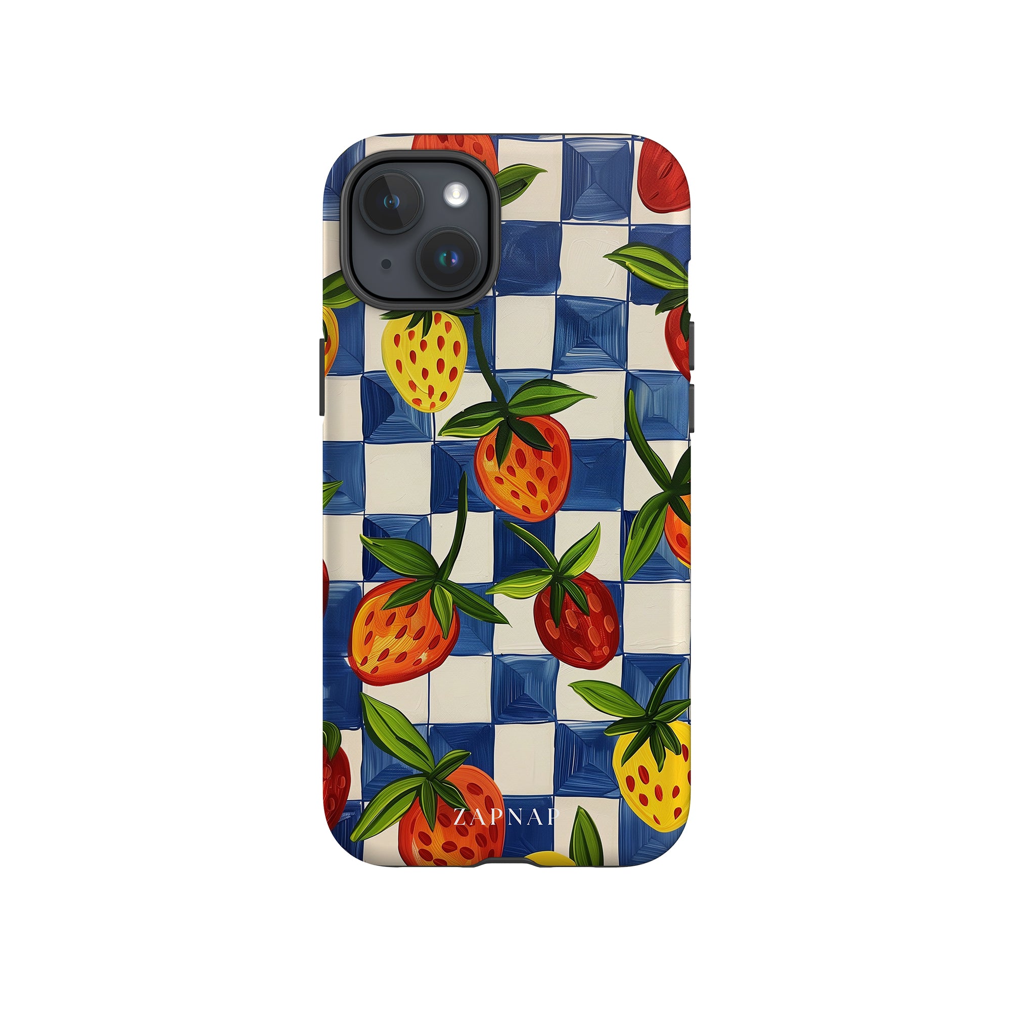Dit speelse ontwerp brengt een vleugje kleur en vreugde met zijn levendige aardbeien tegen een klassieke blauw-wit geblokte achtergrond. Het levendige contrast tussen de rijke rode, gele en groene tinten van de bessen en de frisse ruiten roepen een heerlijk gevoel van zomerse frisheid en zorgeloos buitenplezier op. Perfect om elke ruimte op te fleuren met een vleugje fruitige charme.