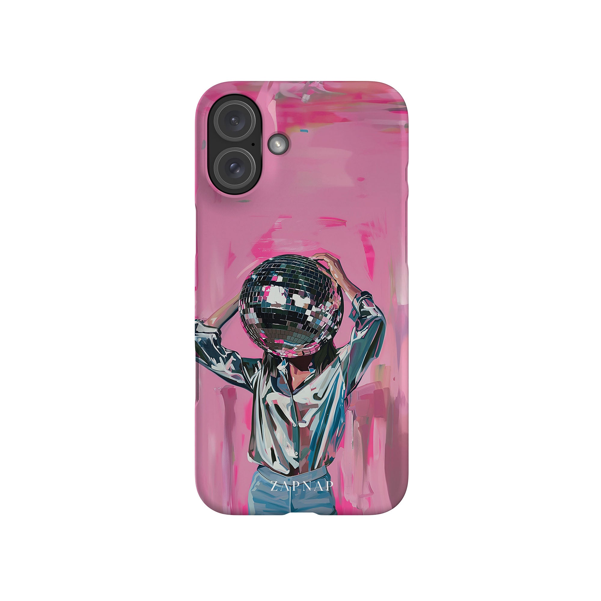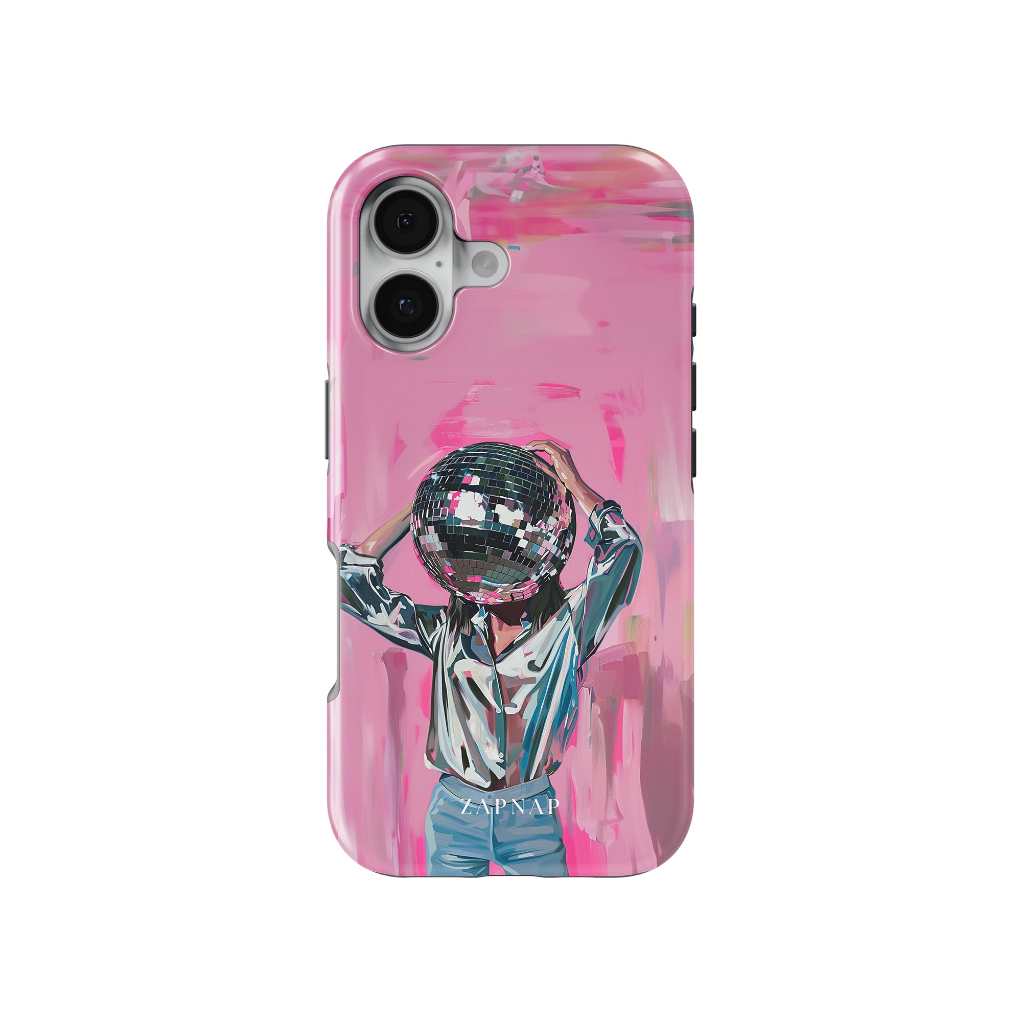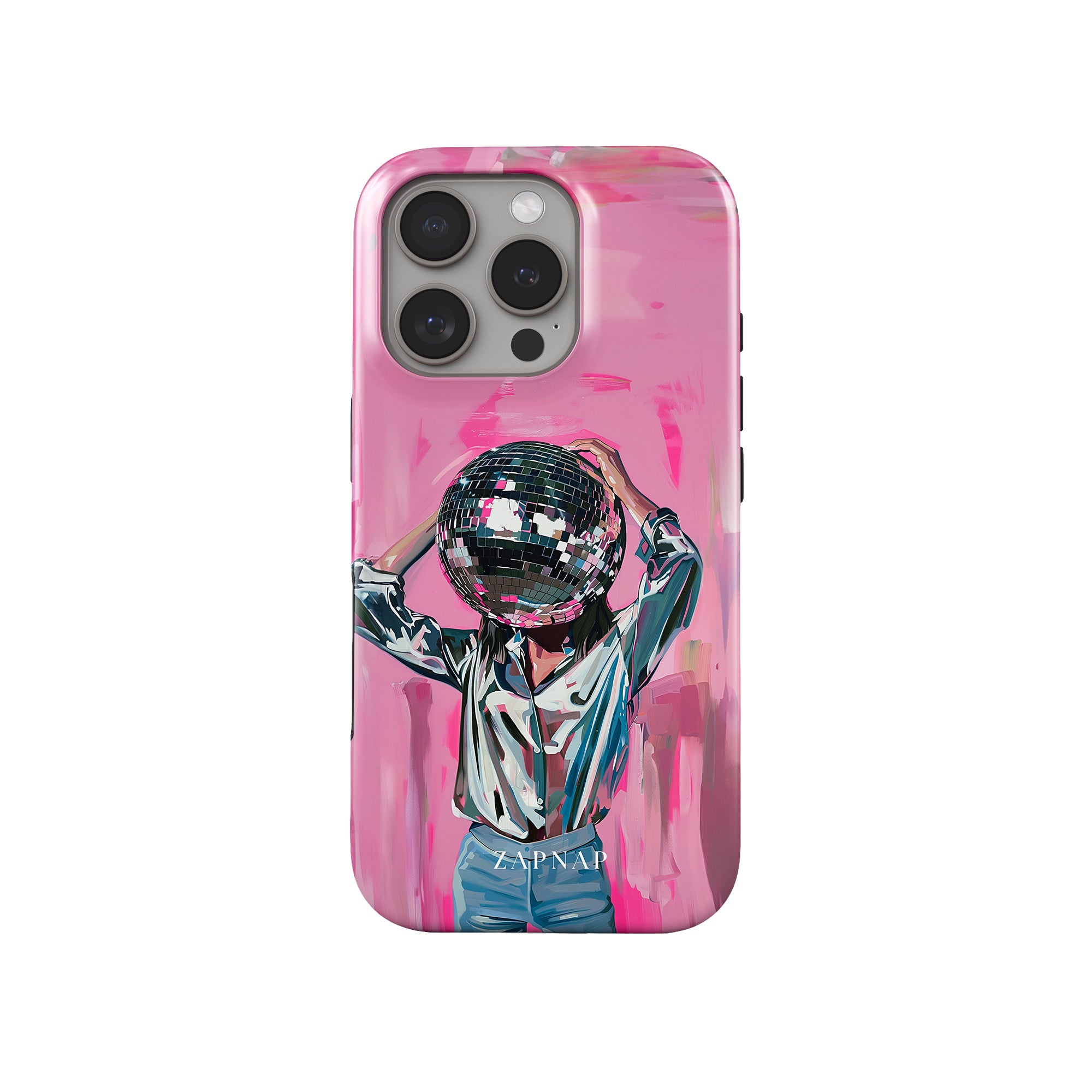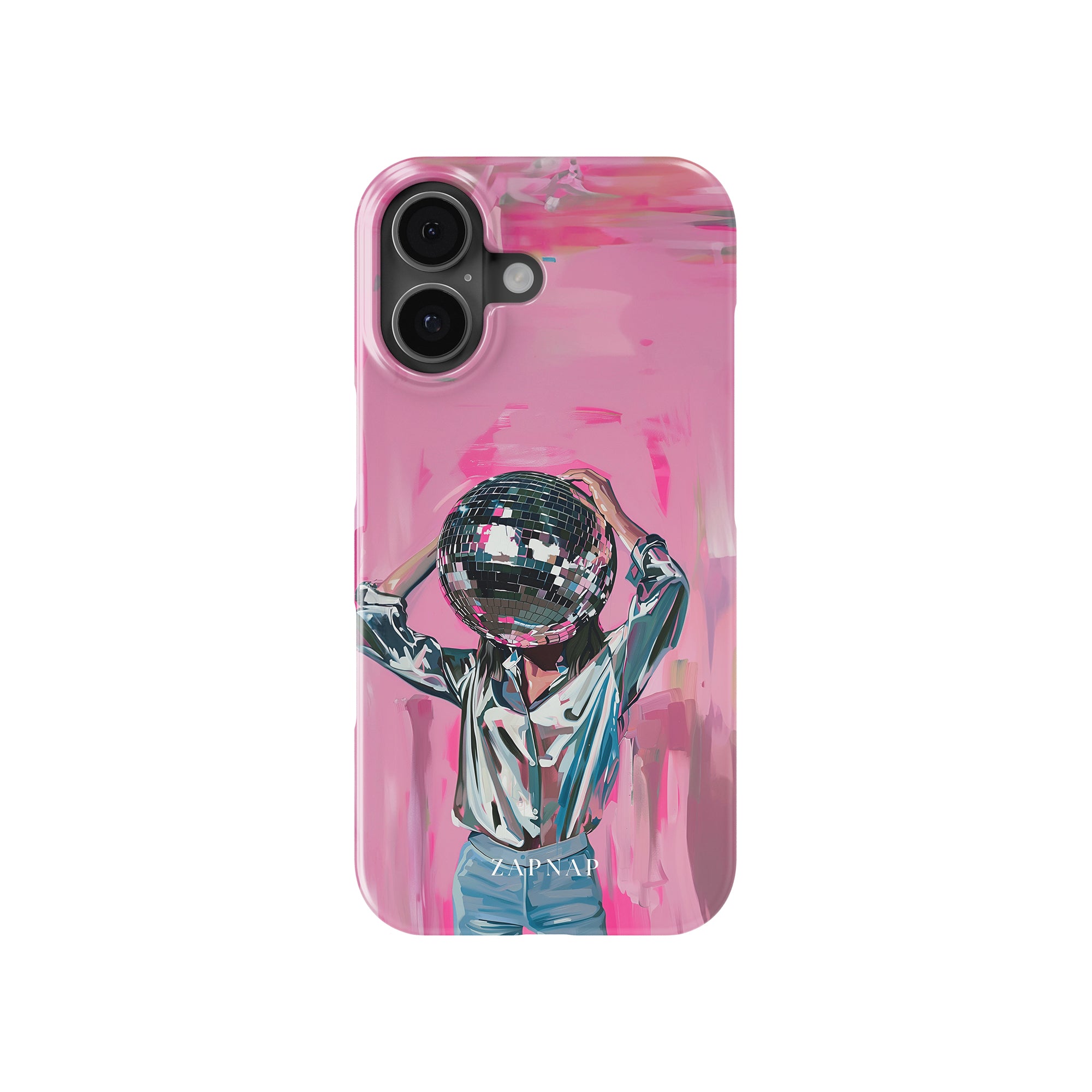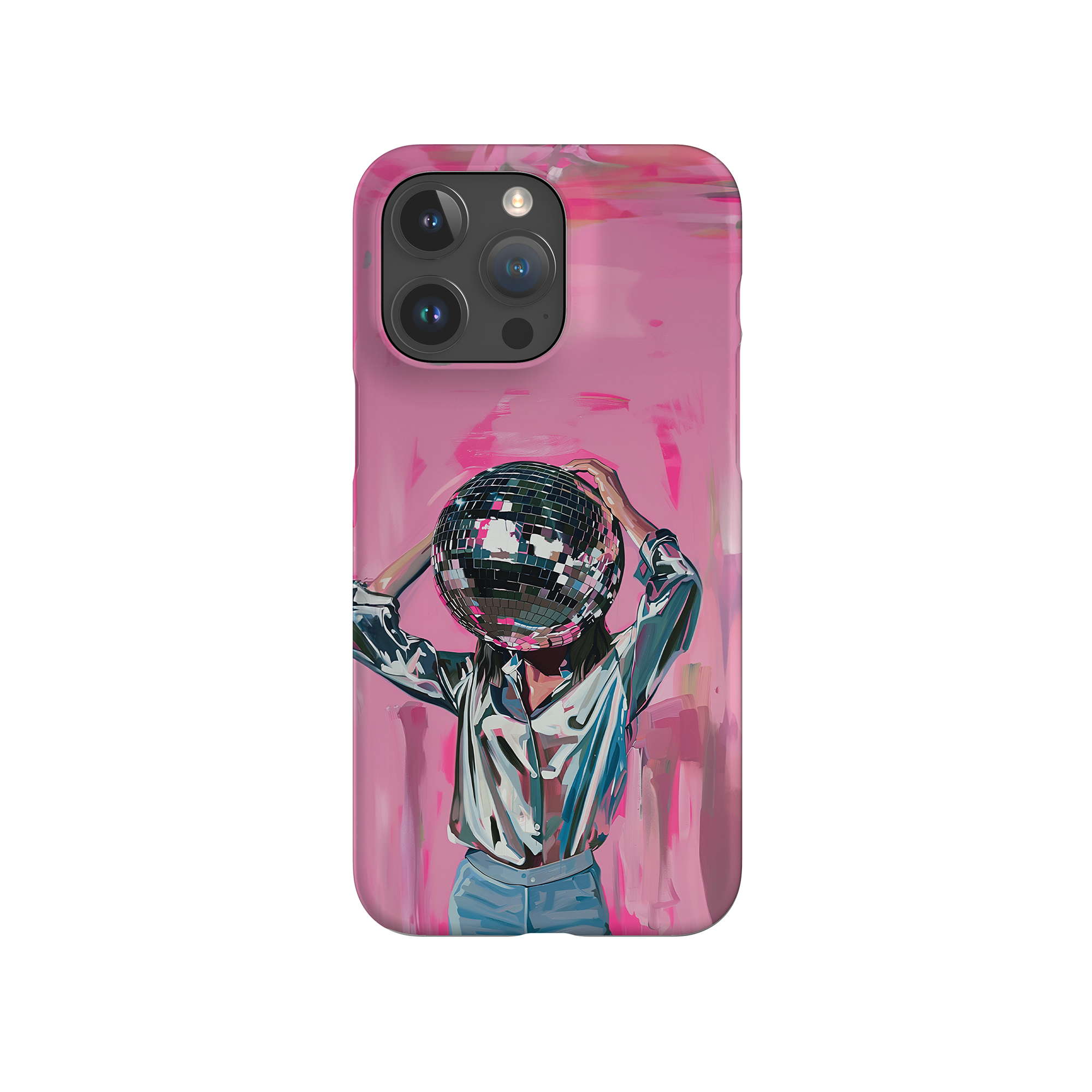 Disco Dream is een surrealistisch schilderij dat de grillige essentie van het discotijdperk vastlegt. Het kunstwerk toont een figuur met een discobal als hoofd, gekleed in een glanzend metallic shirt en spijkerbroek, tegen een levendig roze achtergrond. Dit fantasierijke stuk combineert elementen van fantasie en nostalgie en nodigt kijkers uit om zich onder te dompelen in de speelse en energieke wereld van disco.