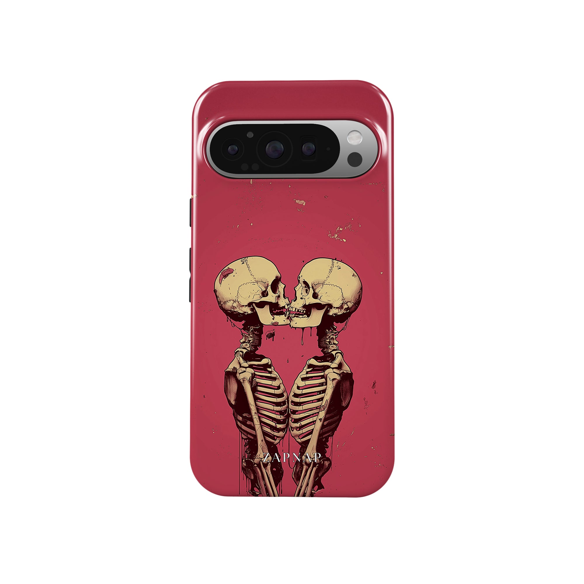Eternal Embrace” toont twee skeletten die opgesloten zitten in een tedere kus tegen een levendig rode achtergrond. Dit kunstwerk combineert elementen van liefde en sterfelijkheid, waardoor een aangrijpend en boeiend beeld ontstaat. De skeletachtige figuren, ontdaan van alles behalve hun botten, symboliseren blijvende genegenheid die het leven zelf overstijgt.