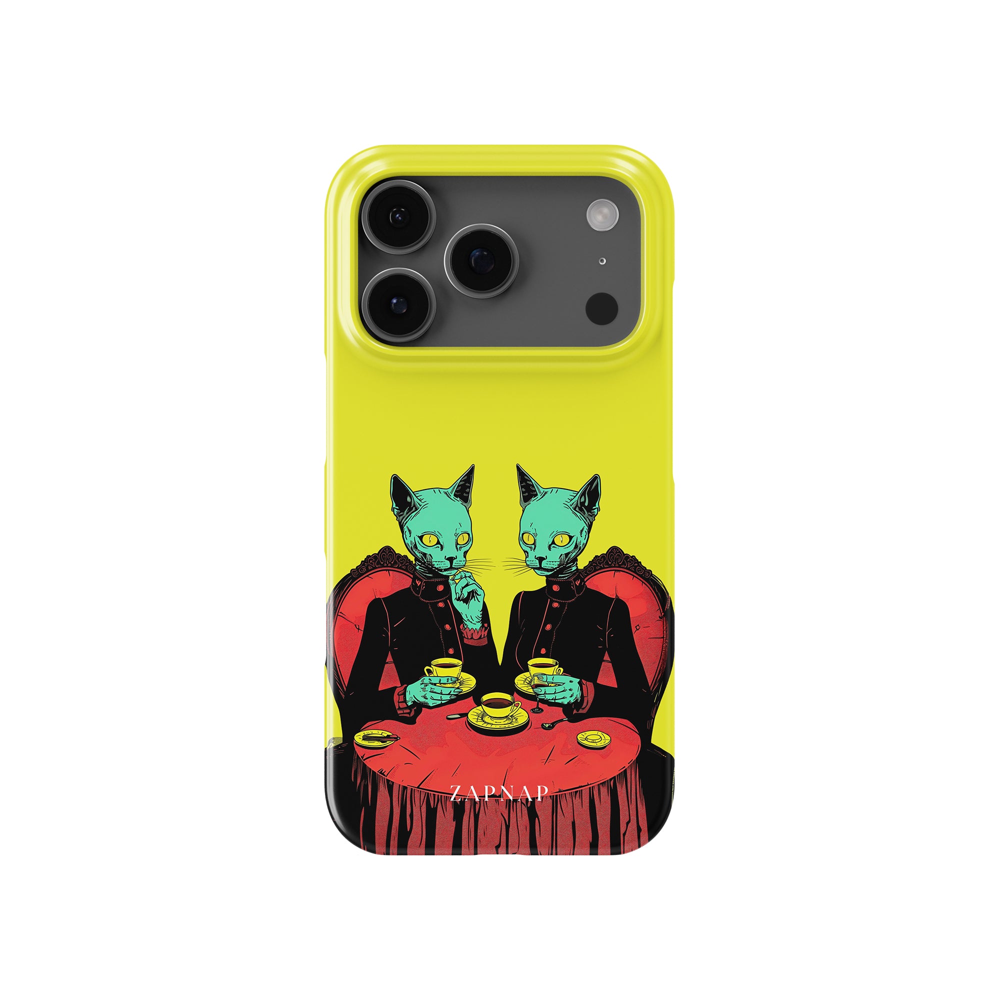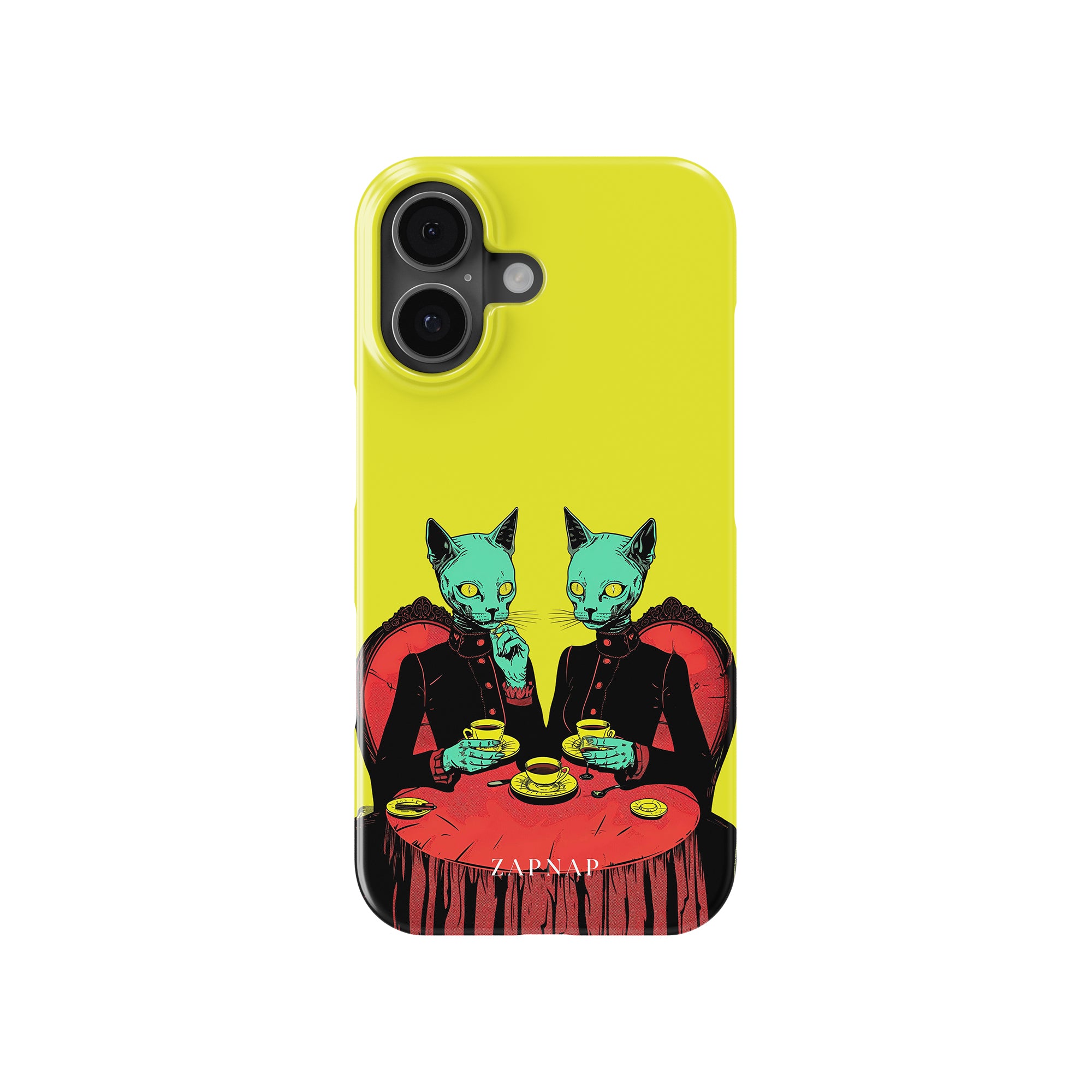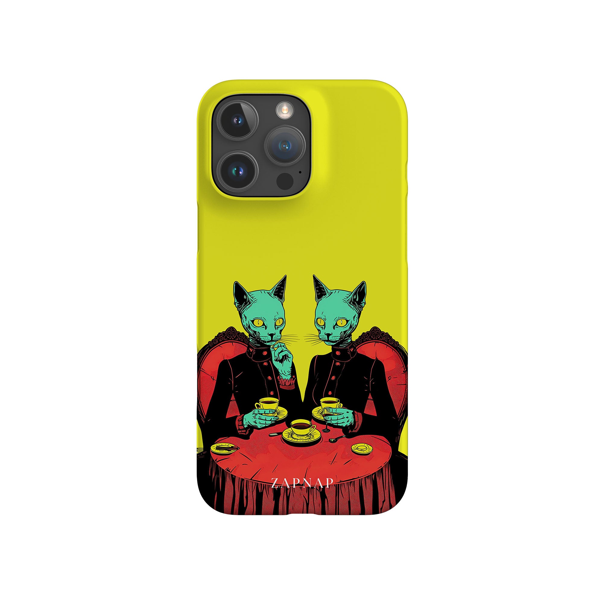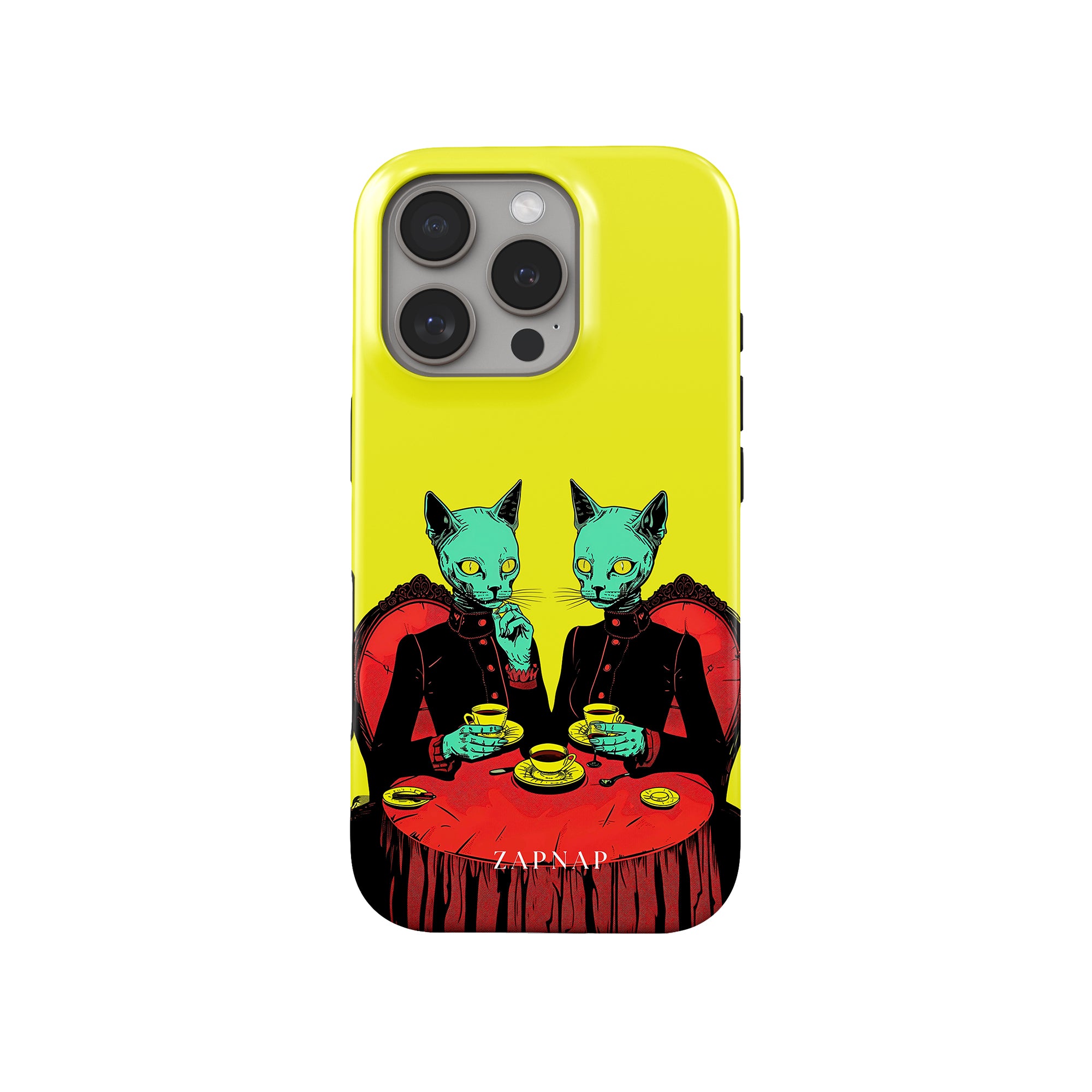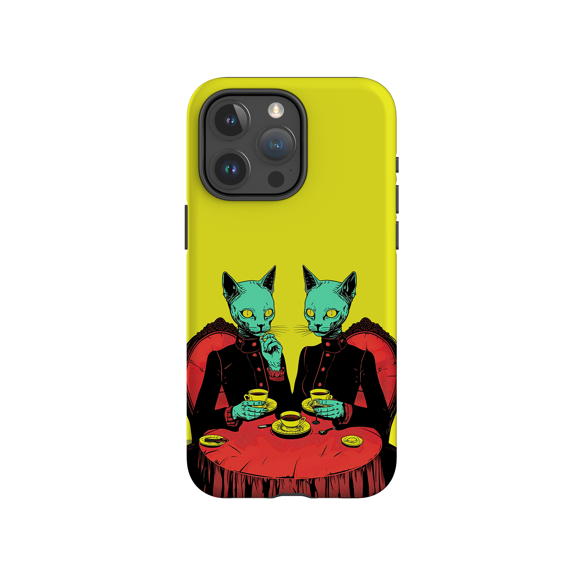 Feline Noir toont twee gotische katten met een opvallende groene tint, zittend aan een rijkelijk versierde tafel, genietend van hun thee. De levendig gele achtergrond contrasteert scherp met de dieprode en zwarte elementen, waardoor een intens, buitenaards tafereel ontstaat. Dit kunstwerk combineert op meesterlijke wijze elegantie met het bizarre, waardoor het een boeiend stuk is voor degenen die donkere, surrealistische esthetiek waarderen.