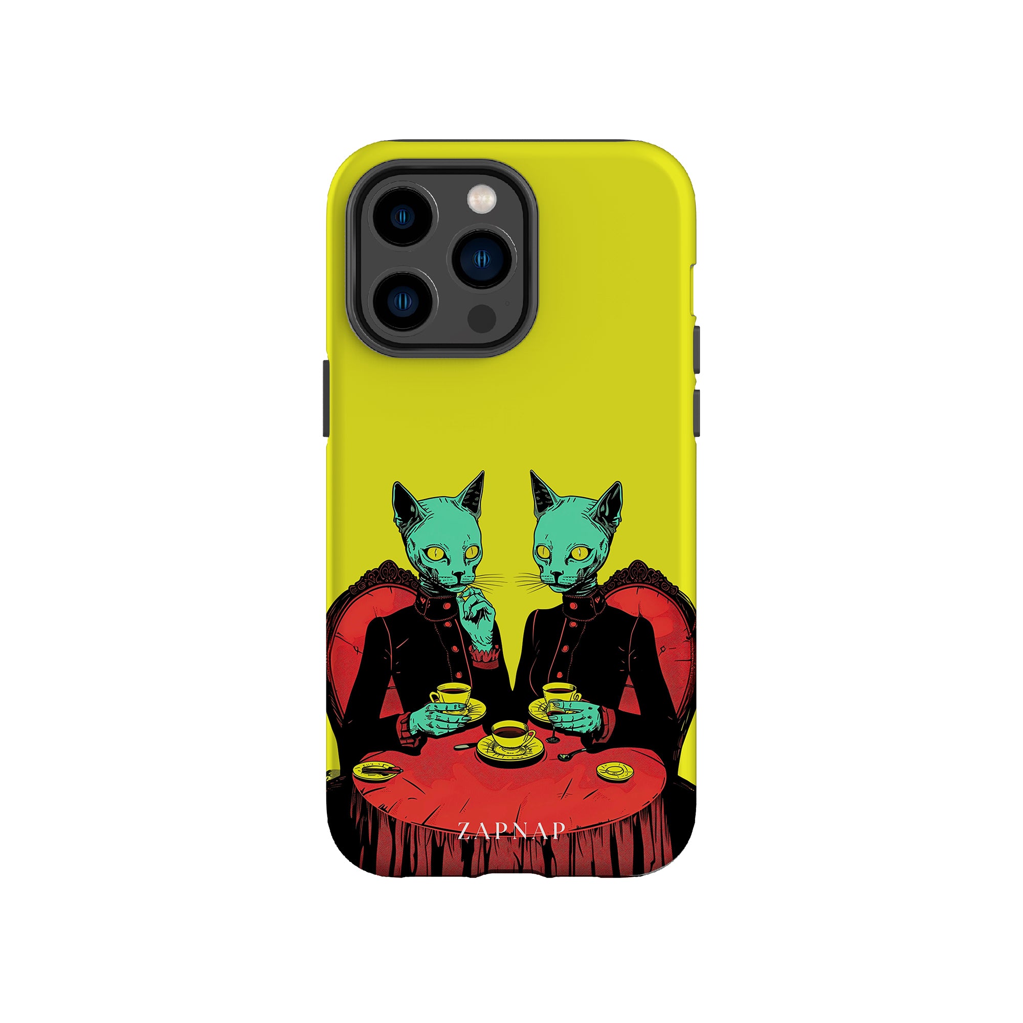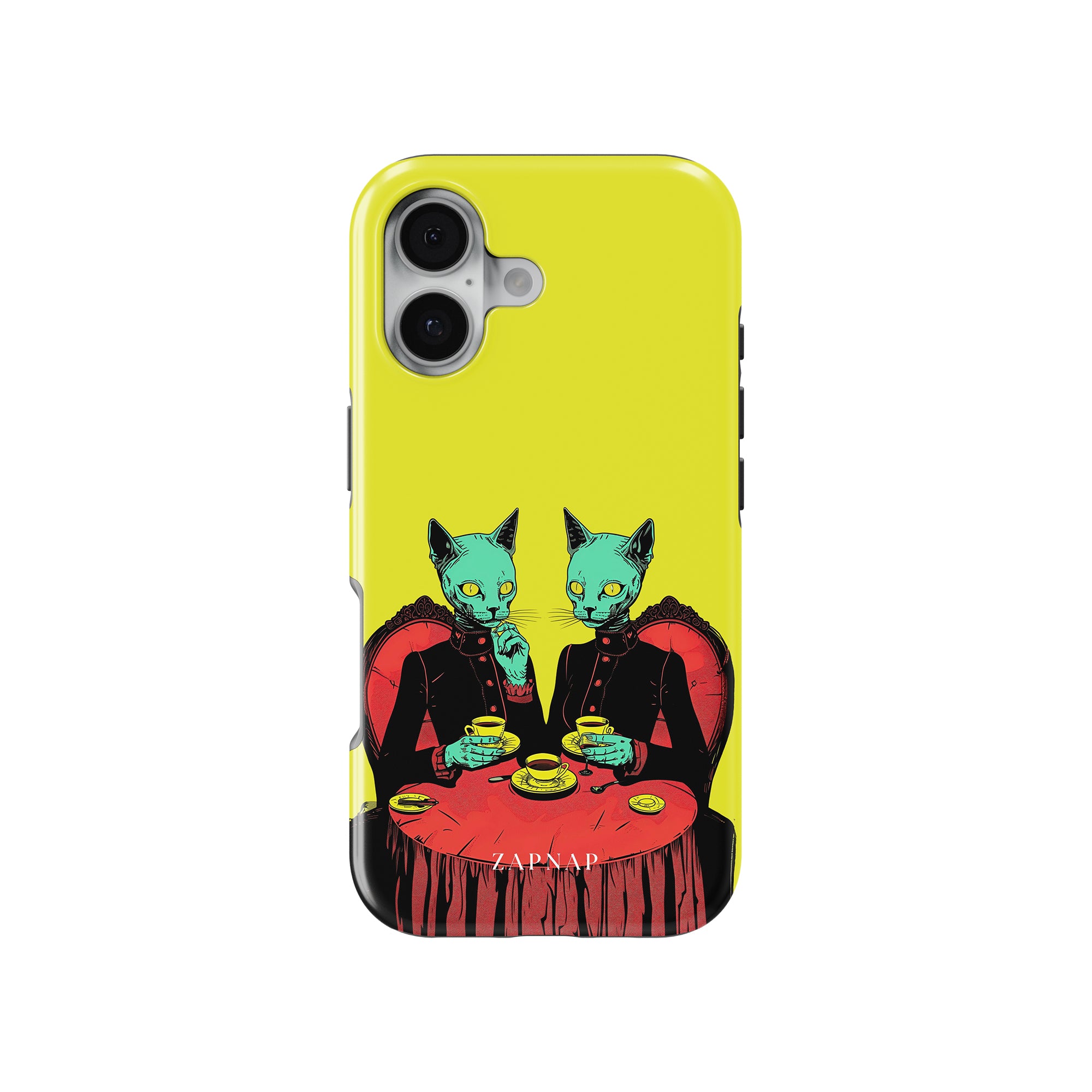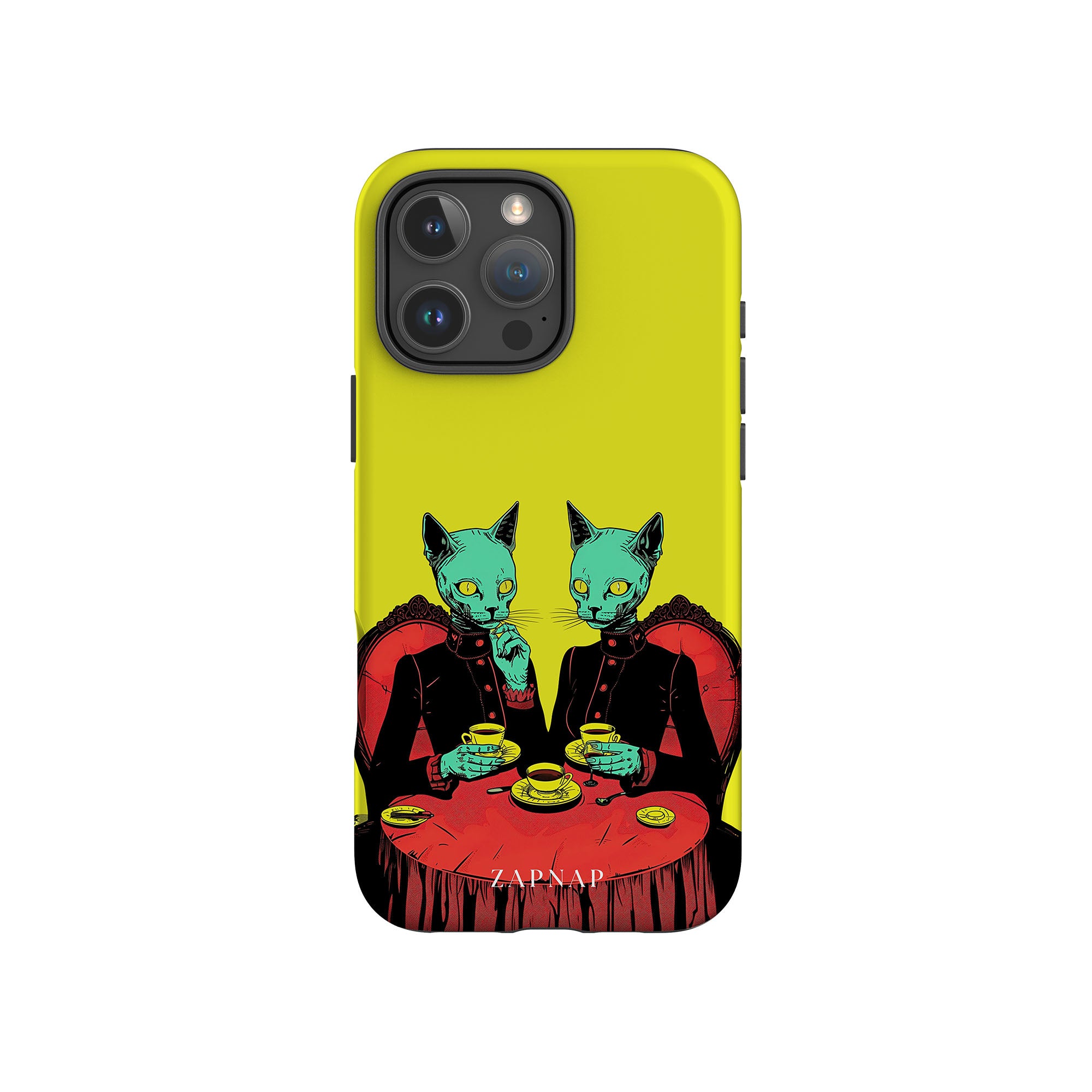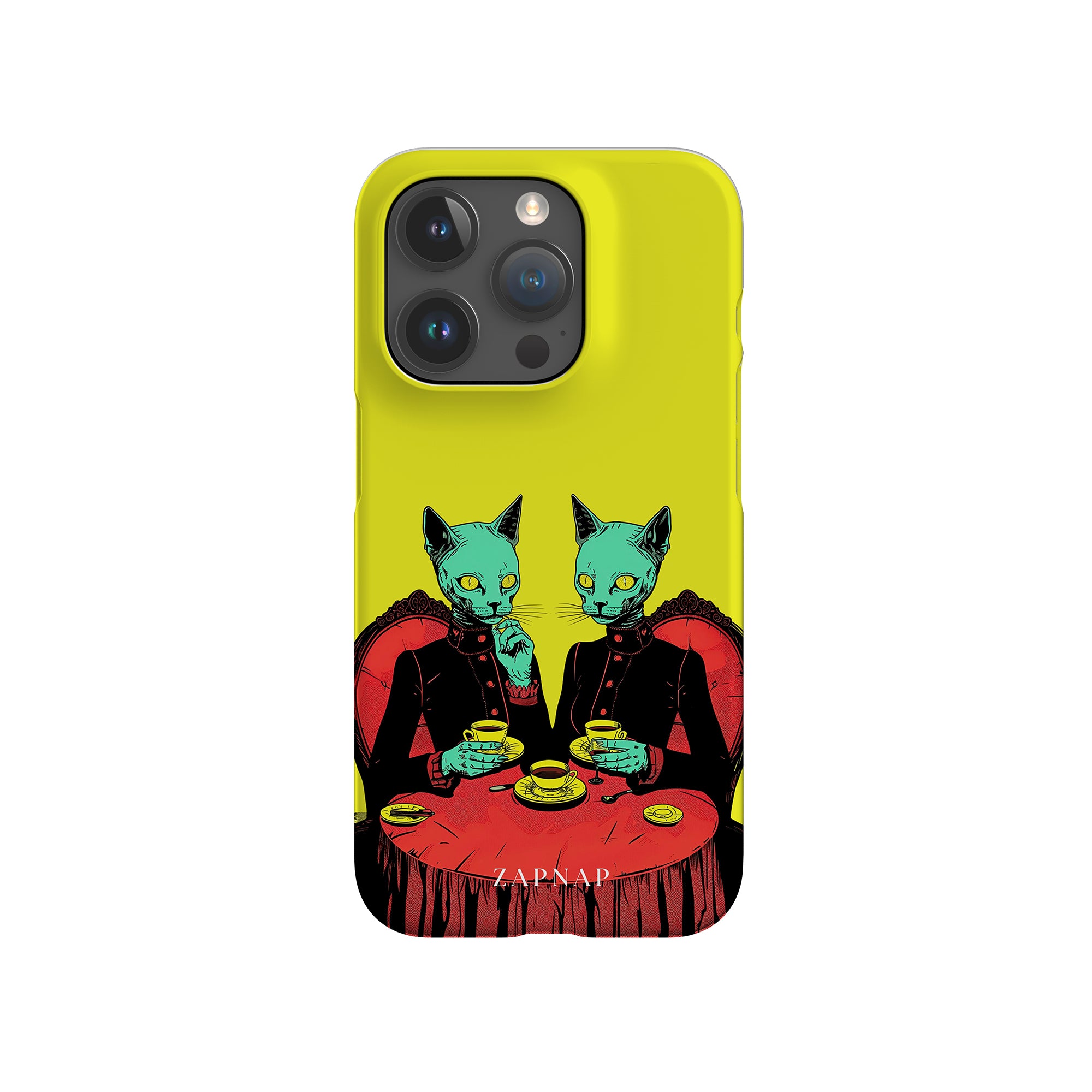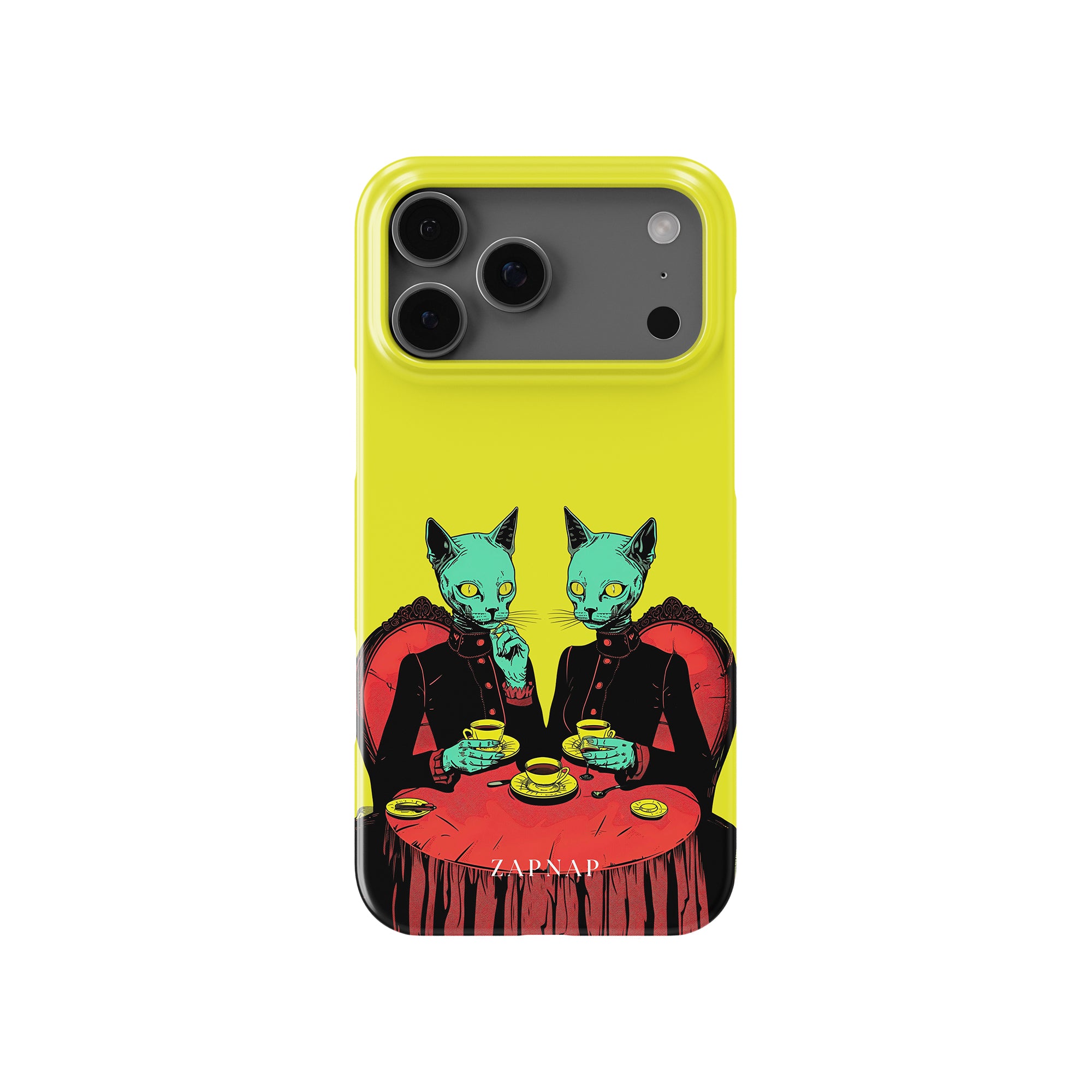 Feline Noir toont twee gotische katten met een opvallende groene tint, zittend aan een rijkelijk versierde tafel, genietend van hun thee. De levendig gele achtergrond contrasteert scherp met de dieprode en zwarte elementen, waardoor een intens, buitenaards tafereel ontstaat. Dit kunstwerk combineert op meesterlijke wijze elegantie met het bizarre, waardoor het een boeiend stuk is voor degenen die donkere, surrealistische esthetiek waarderen.