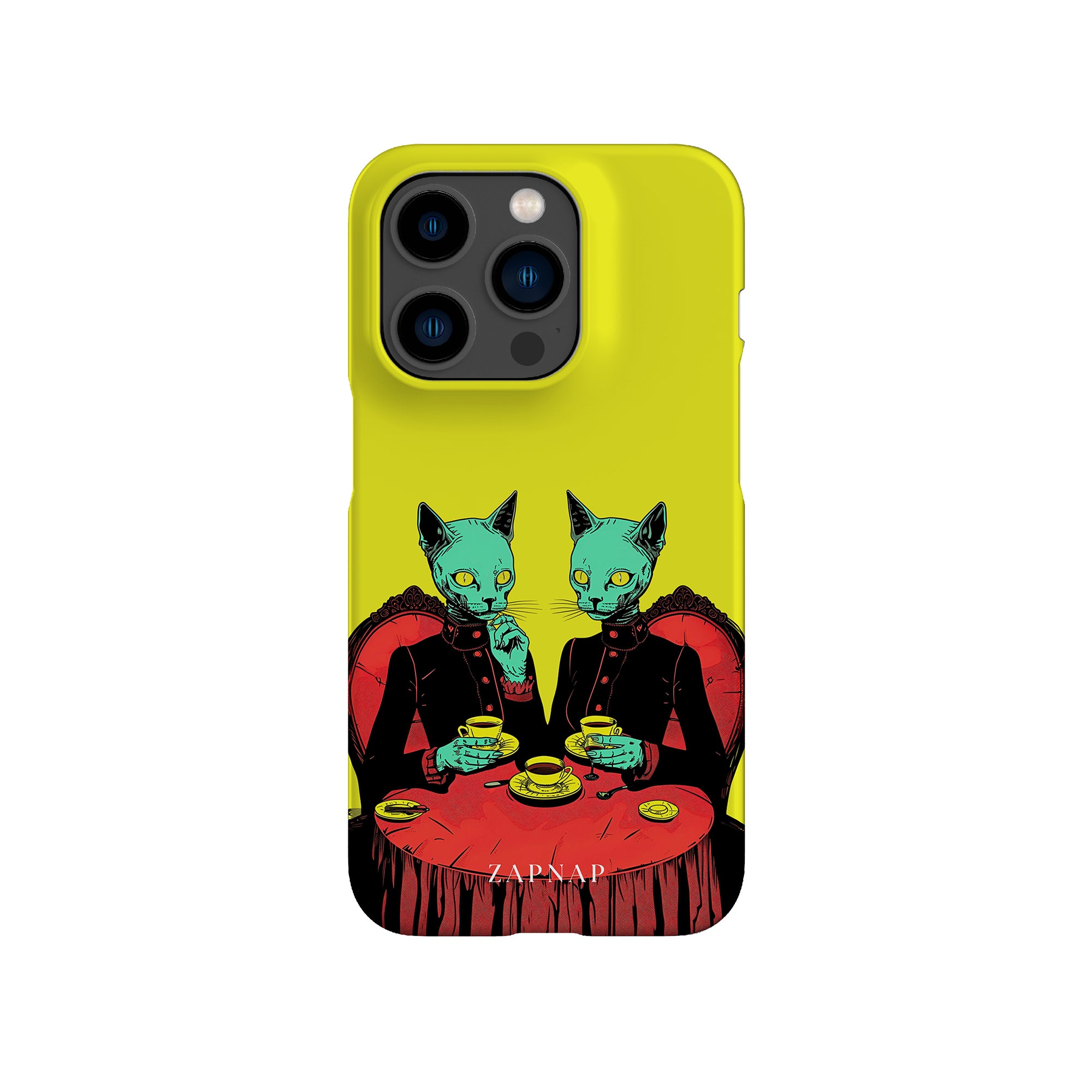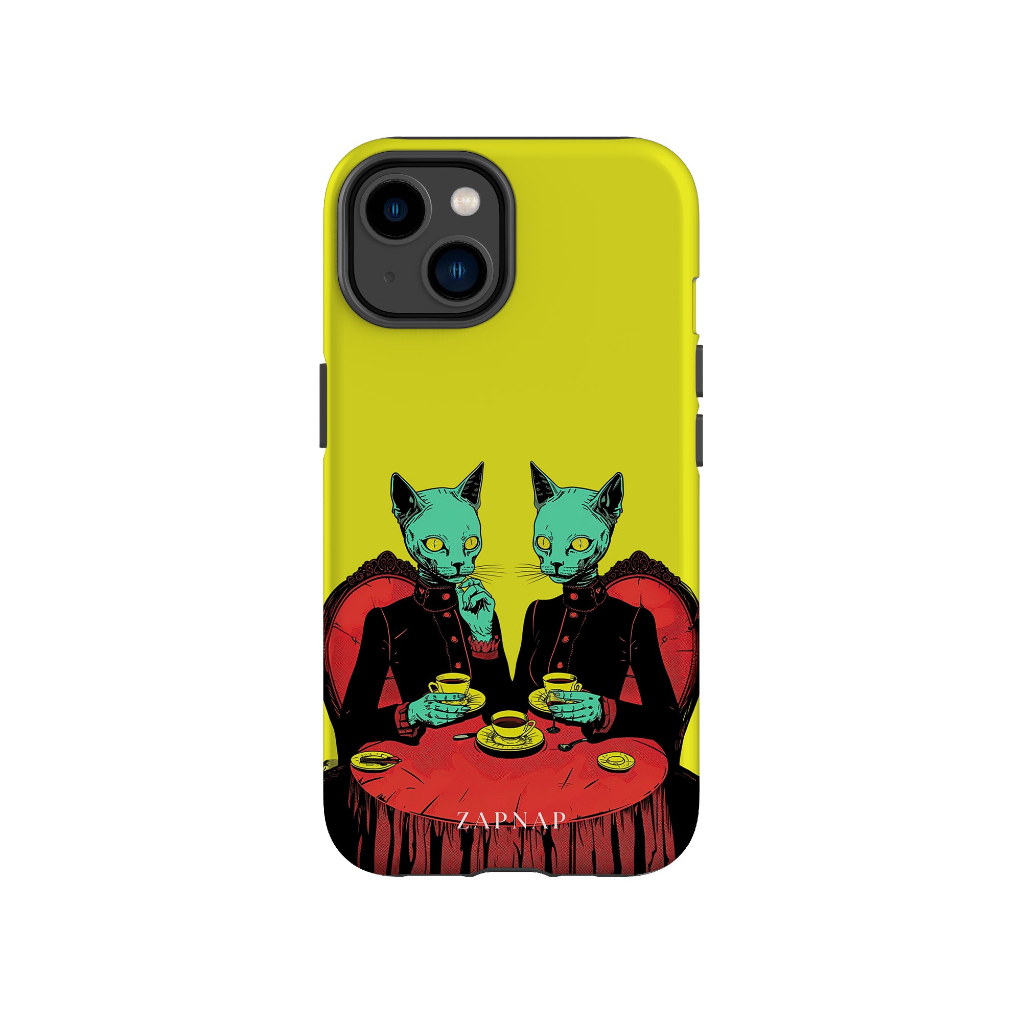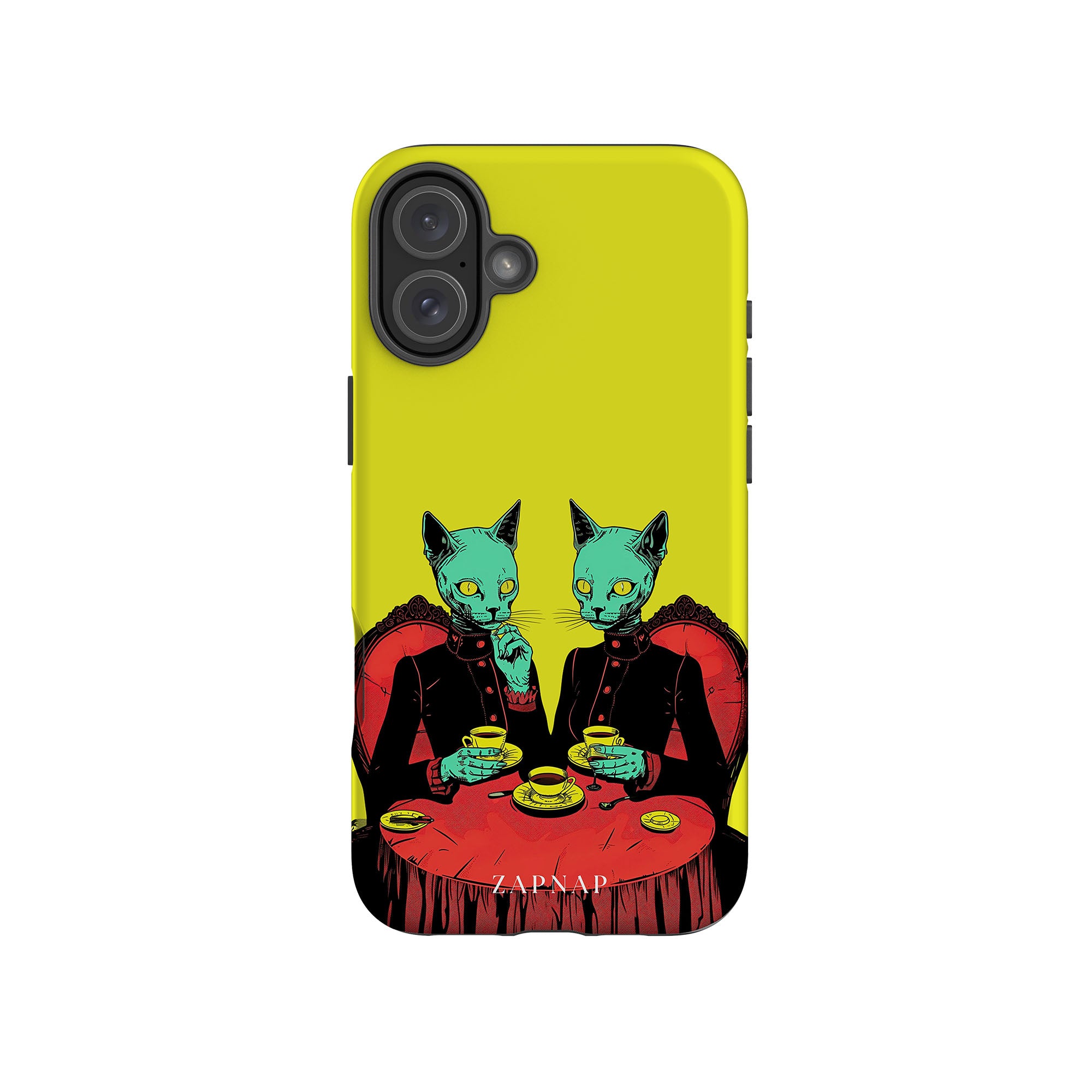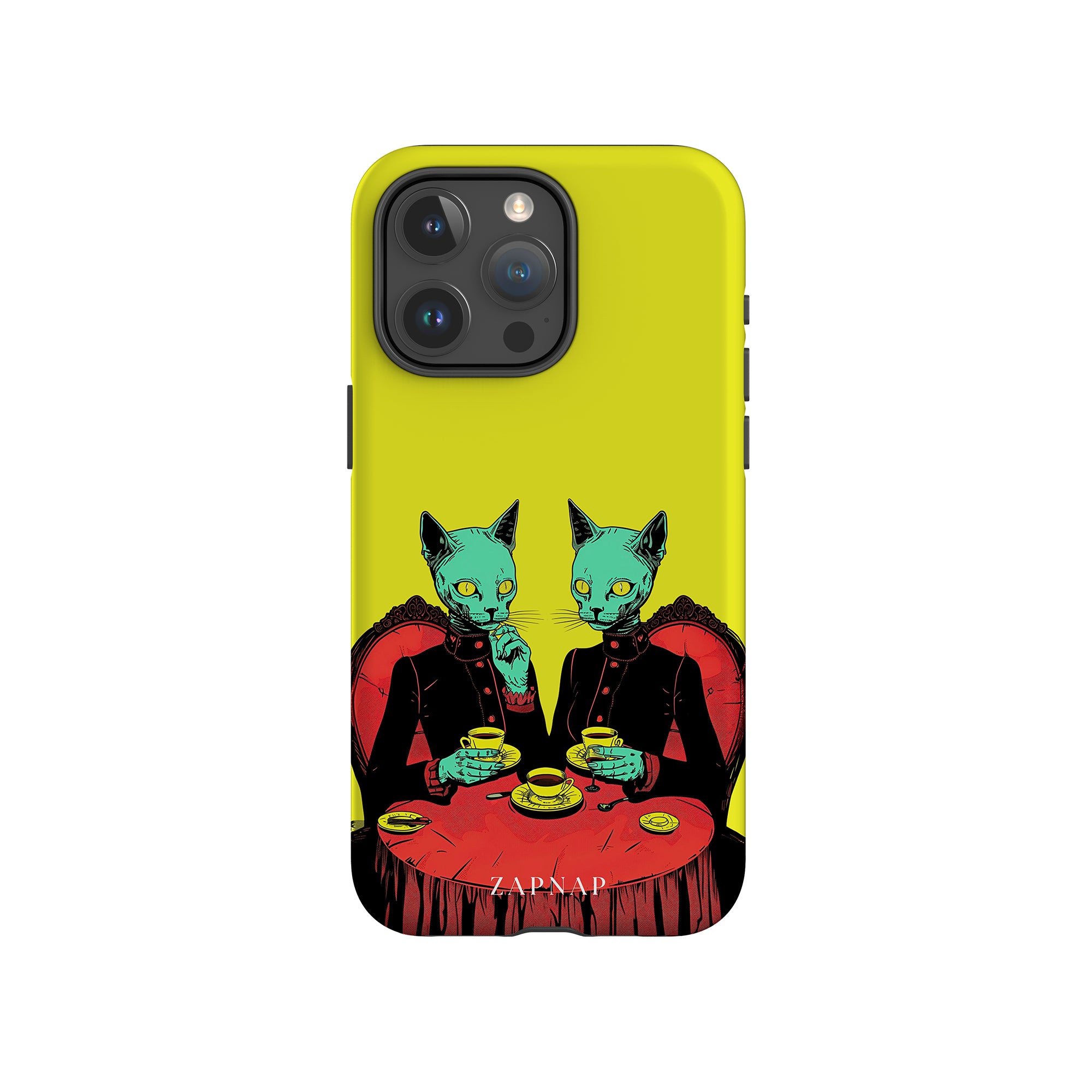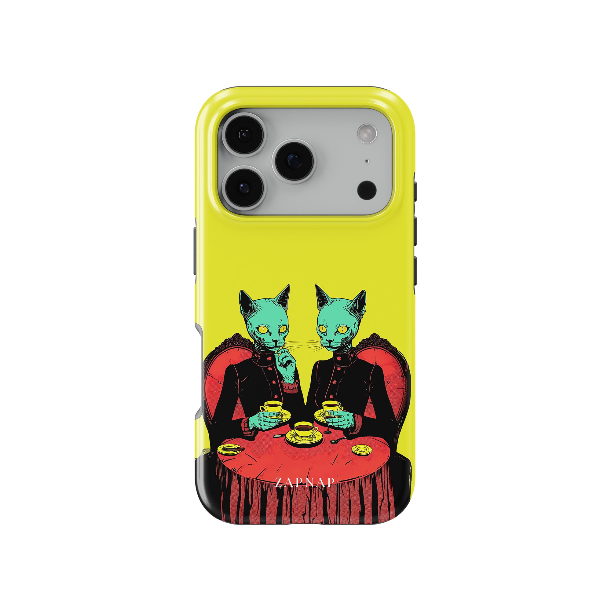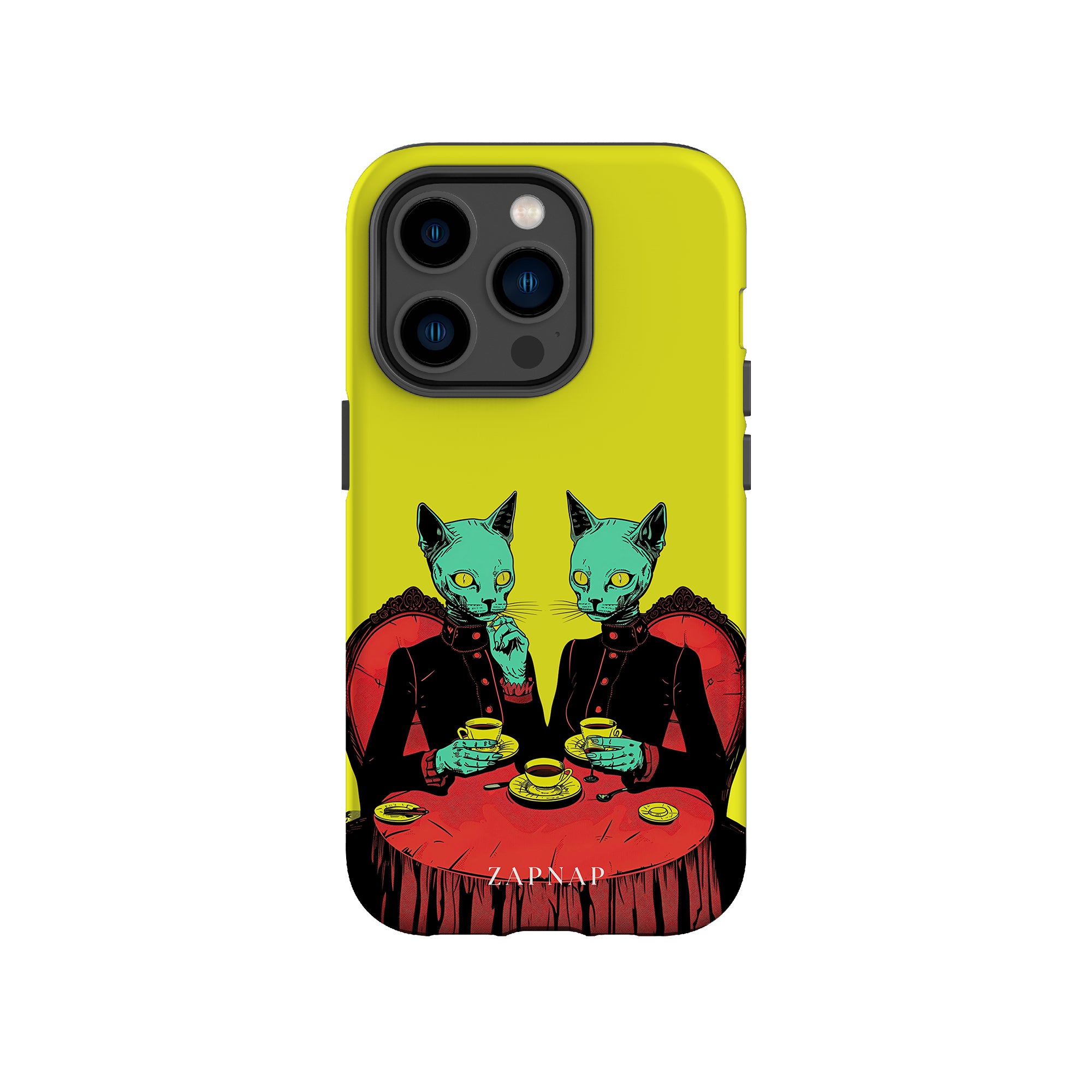 Feline Noir toont twee gotische katten met een opvallende groene tint, zittend aan een rijkelijk versierde tafel, genietend van hun thee. De levendig gele achtergrond contrasteert scherp met de dieprode en zwarte elementen, waardoor een intens, buitenaards tafereel ontstaat. Dit kunstwerk combineert op meesterlijke wijze elegantie met het bizarre, waardoor het een boeiend stuk is voor degenen die donkere, surrealistische esthetiek waarderen.