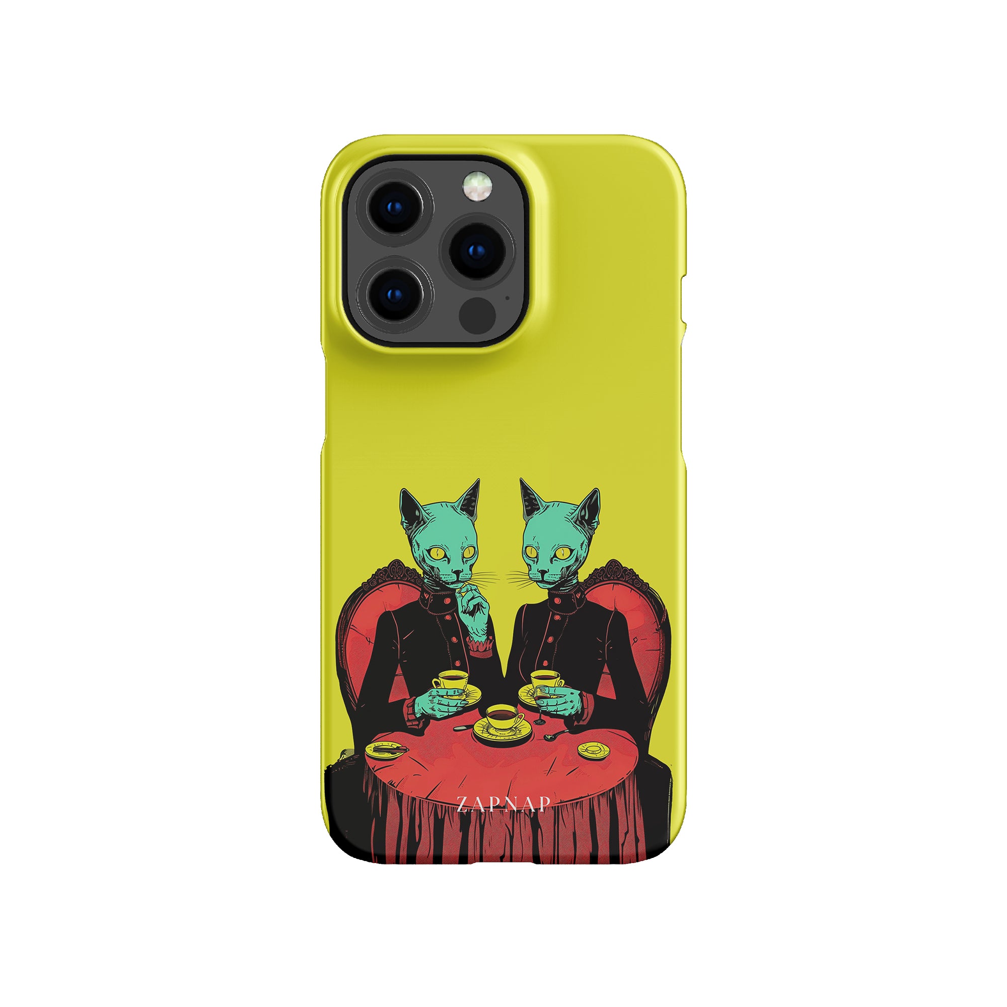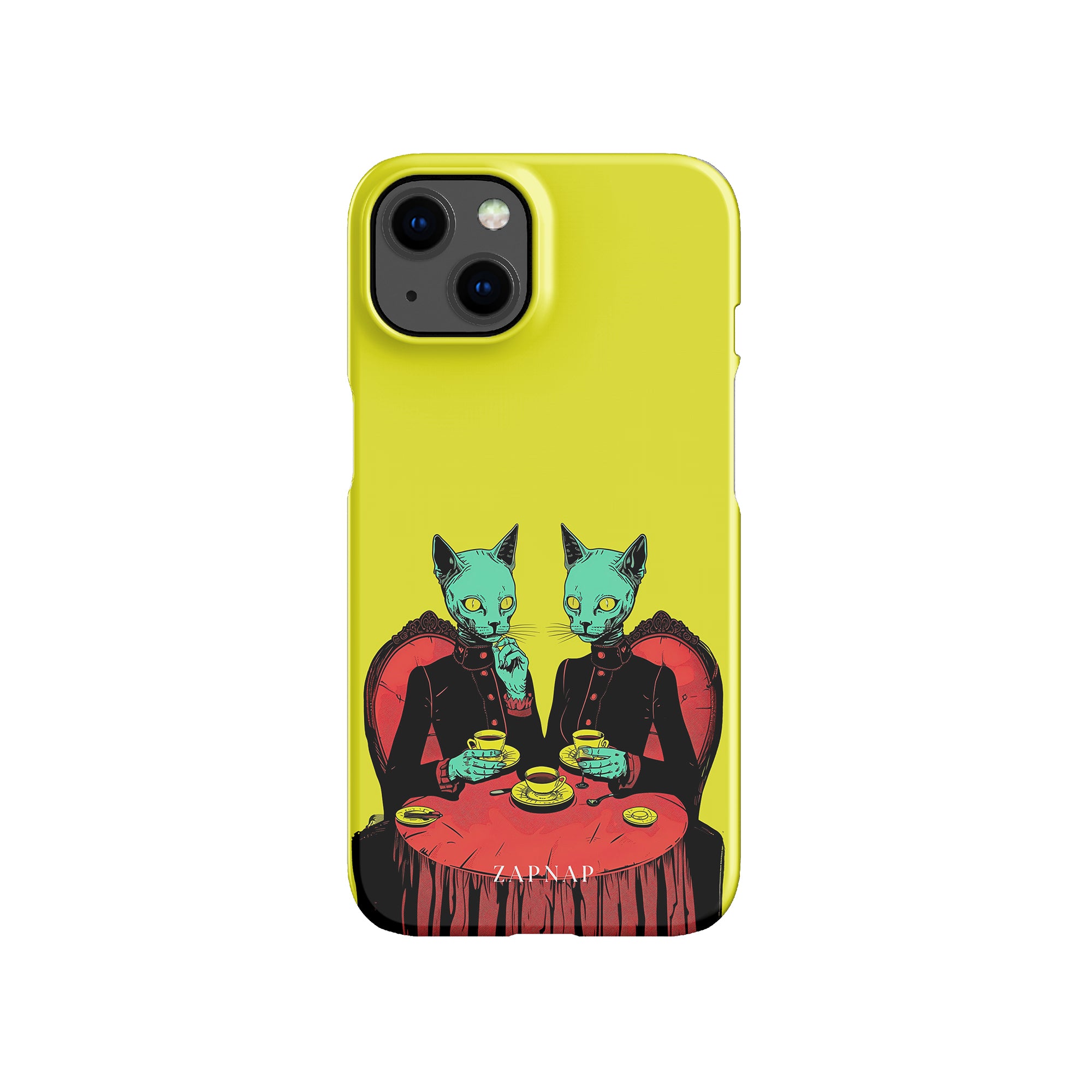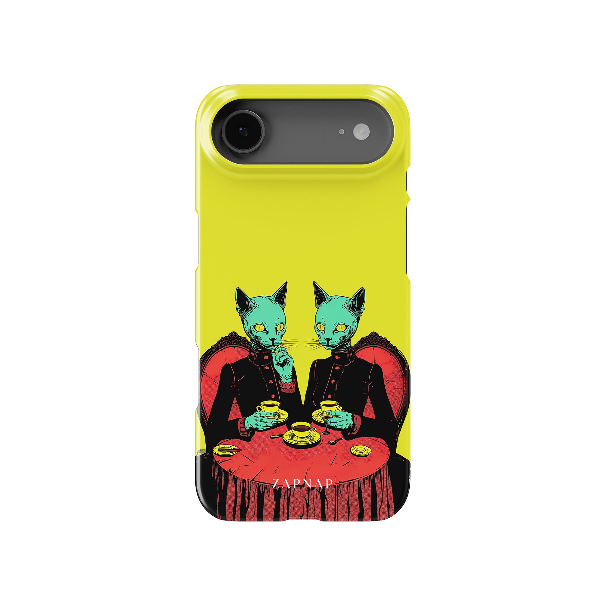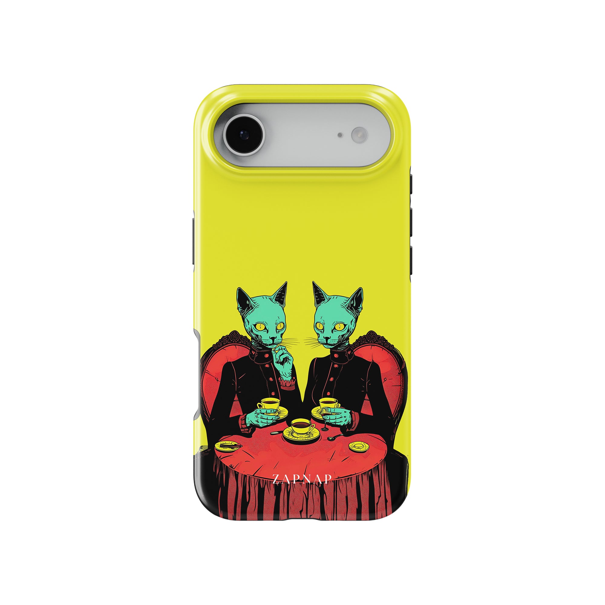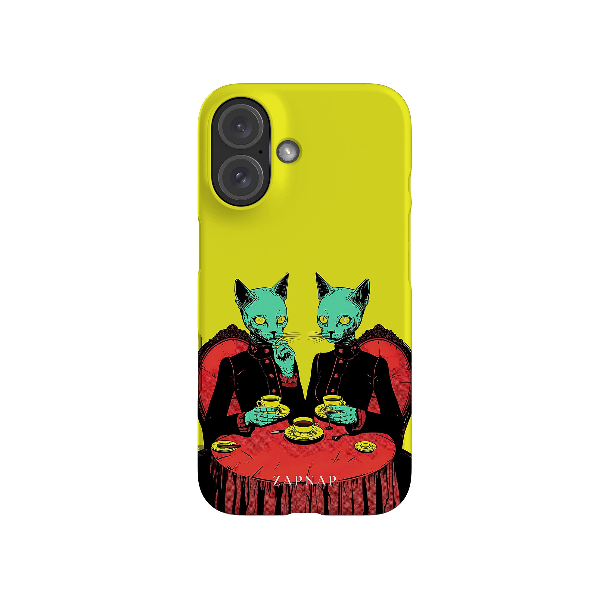Feline Noir toont twee gotische katten met een opvallende groene tint, zittend aan een rijkelijk versierde tafel, genietend van hun thee. De levendig gele achtergrond contrasteert scherp met de dieprode en zwarte elementen, waardoor een intens, buitenaards tafereel ontstaat. Dit kunstwerk combineert op meesterlijke wijze elegantie met het bizarre, waardoor het een boeiend stuk is voor degenen die donkere, surrealistische esthetiek waarderen.