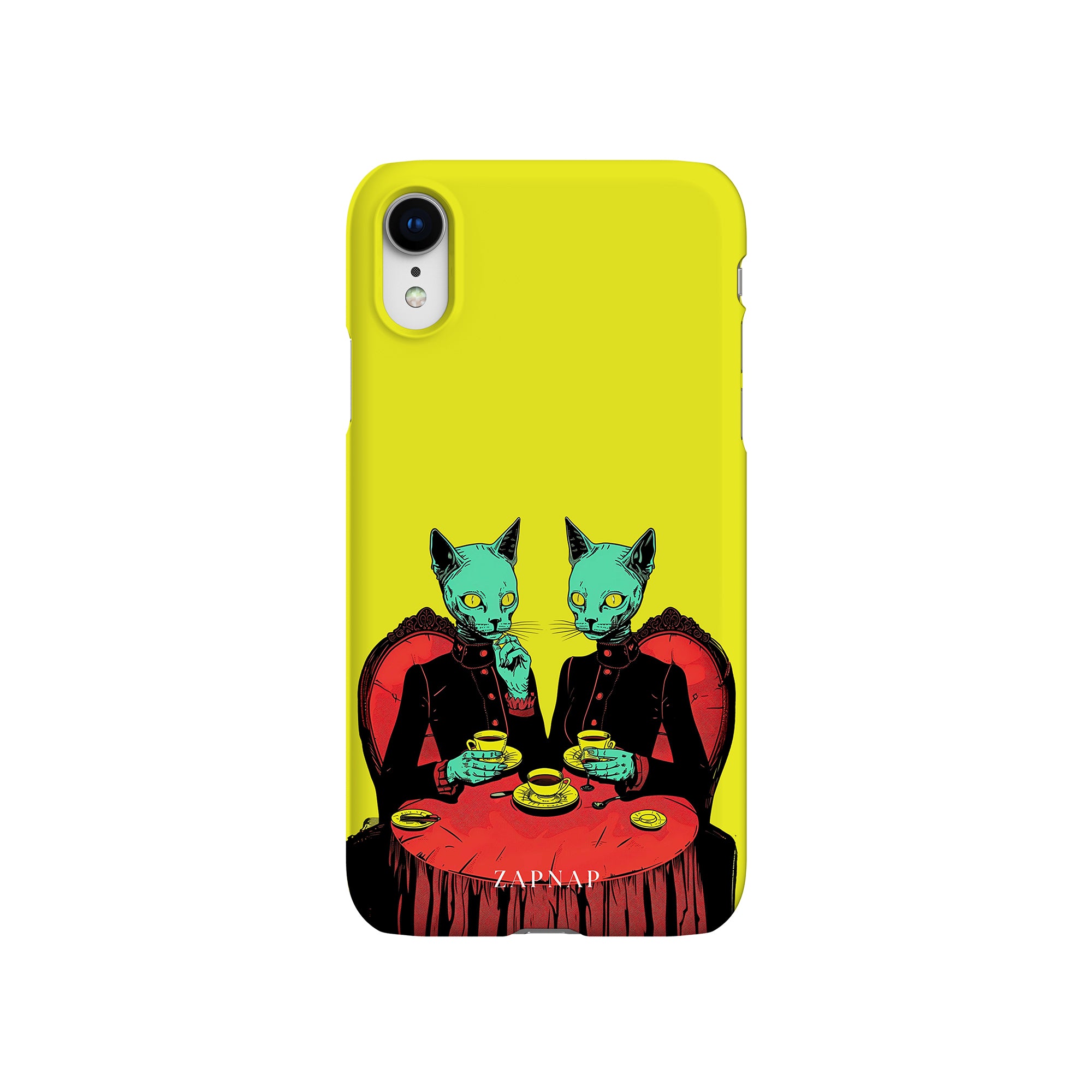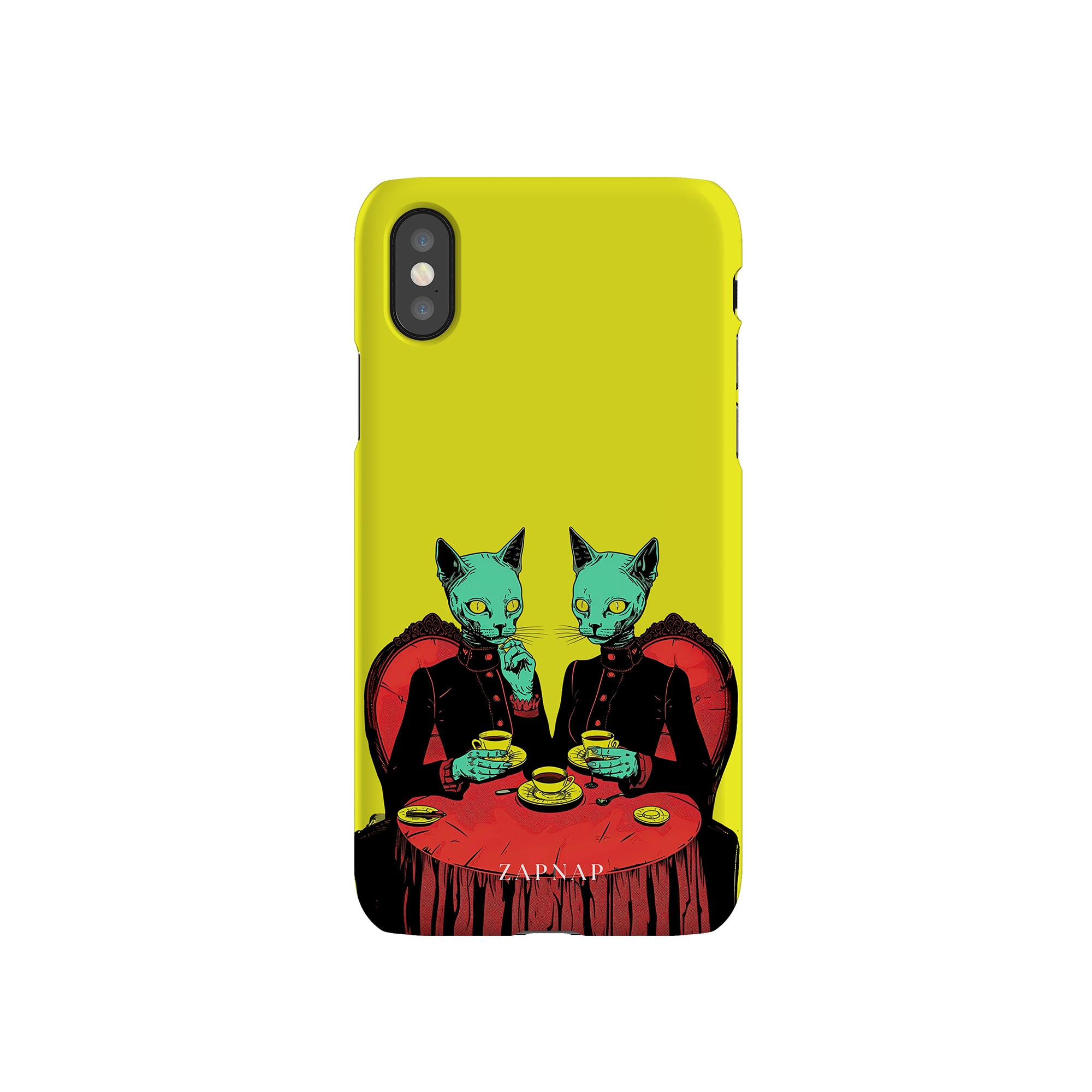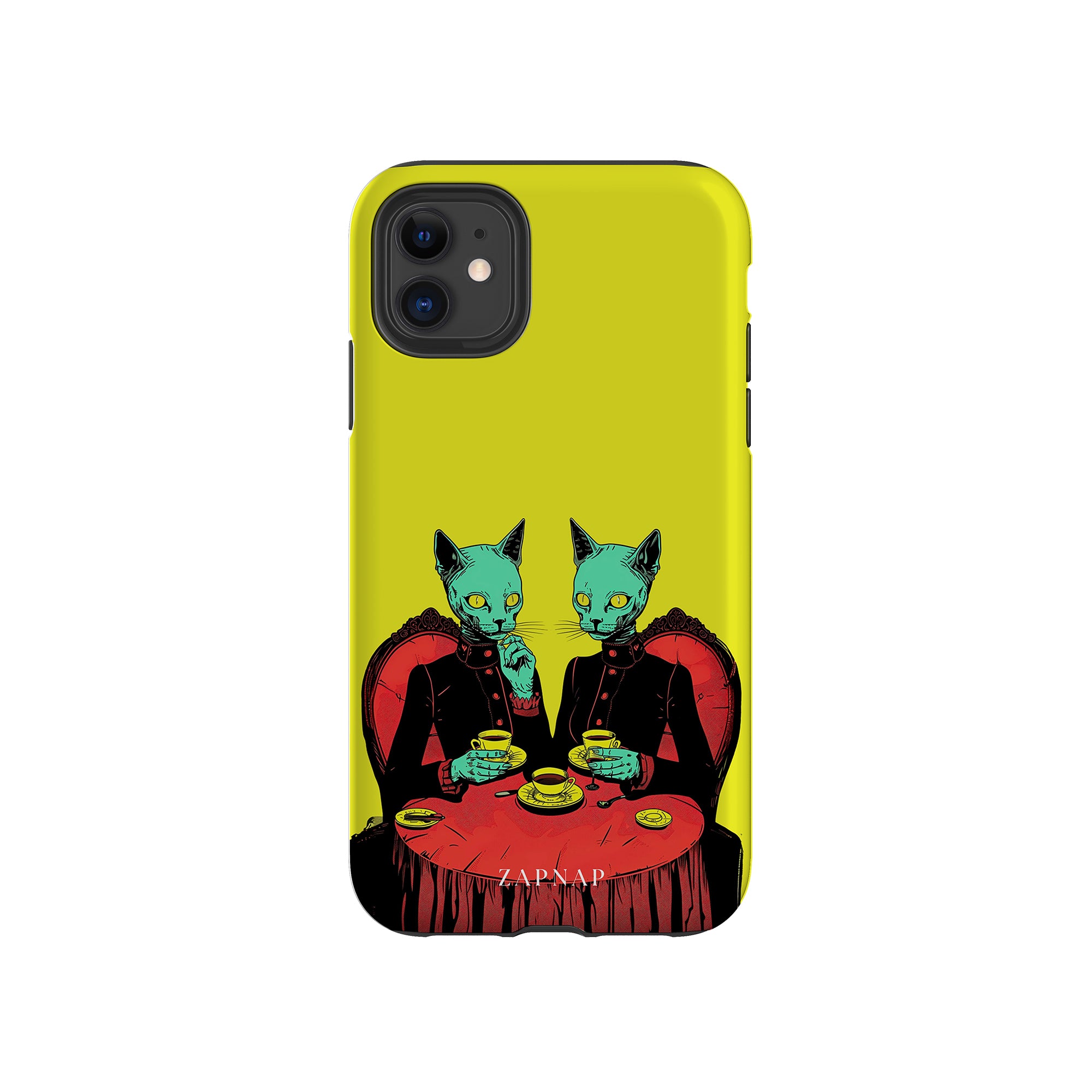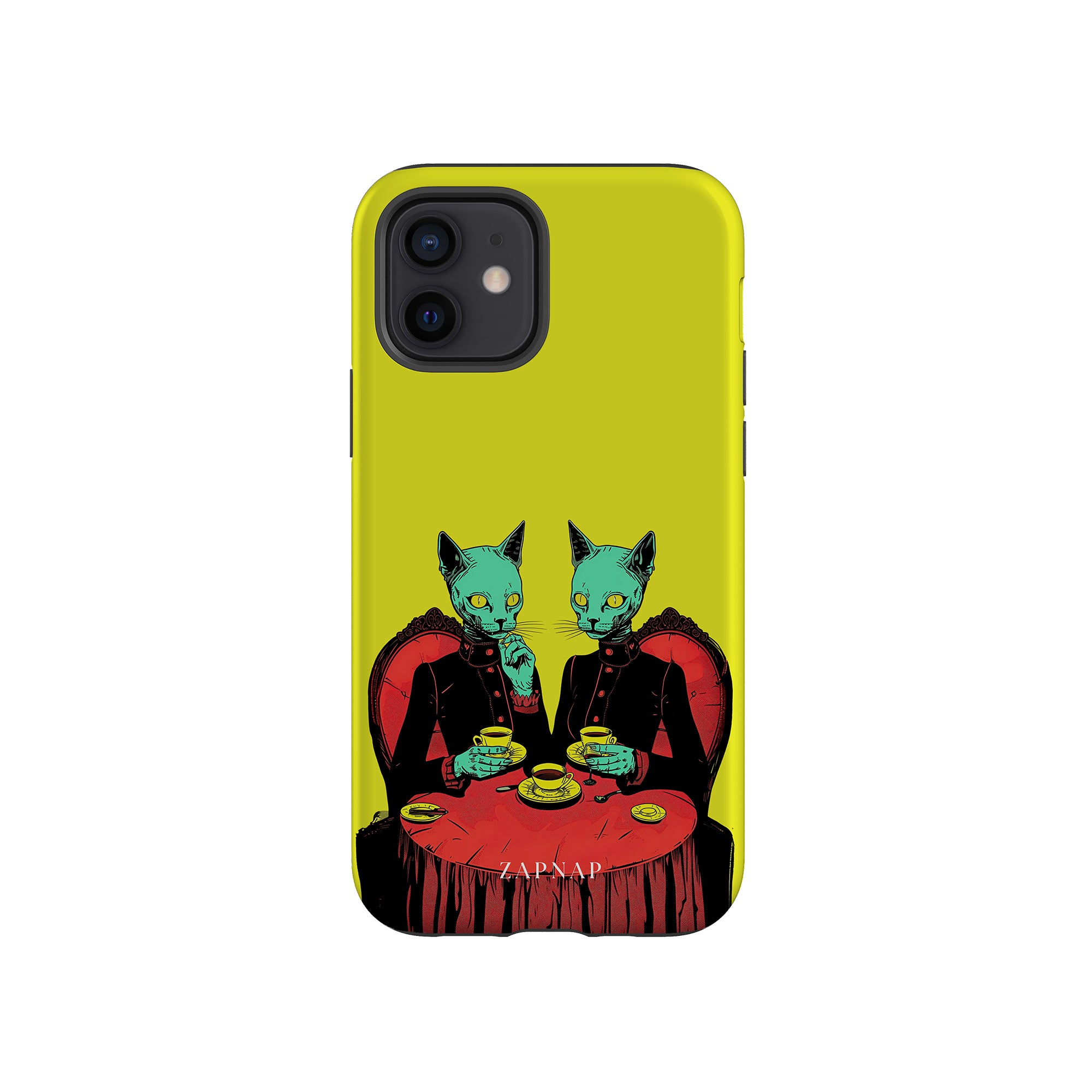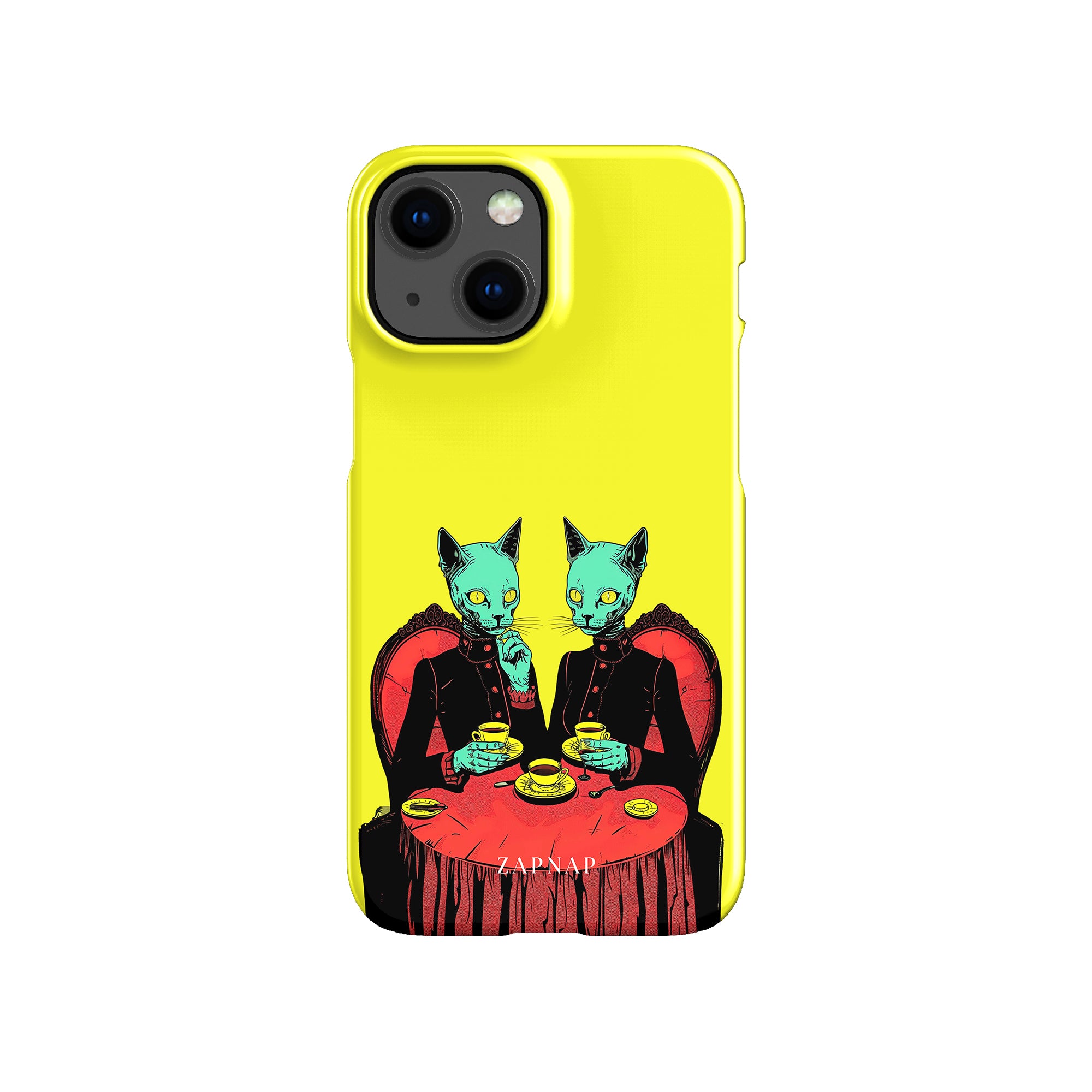 Feline Noir toont twee gotische katten met een opvallende groene tint, zittend aan een rijkelijk versierde tafel, genietend van hun thee. De levendig gele achtergrond contrasteert scherp met de dieprode en zwarte elementen, waardoor een intens, buitenaards tafereel ontstaat. Dit kunstwerk combineert op meesterlijke wijze elegantie met het bizarre, waardoor het een boeiend stuk is voor degenen die donkere, surrealistische esthetiek waarderen.