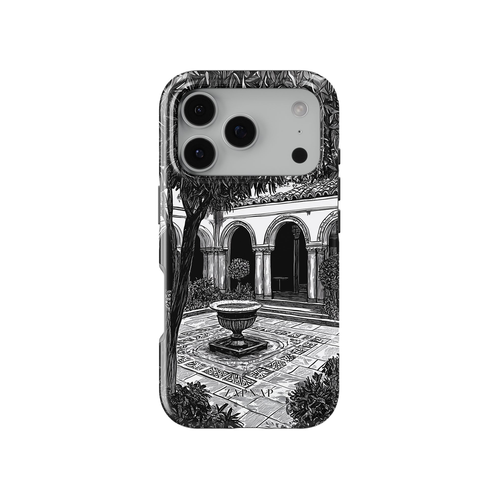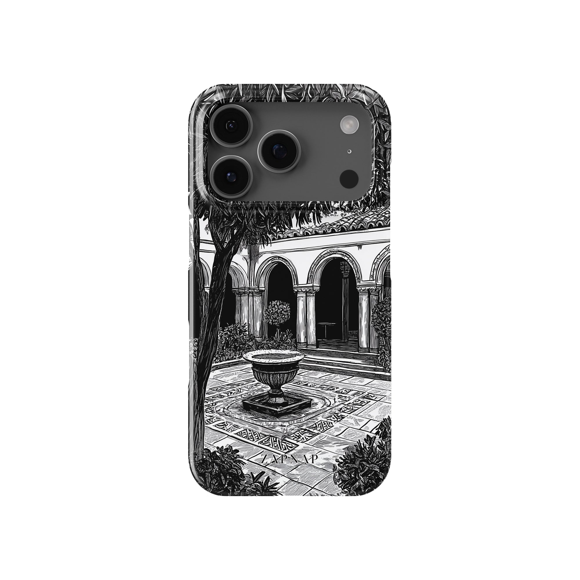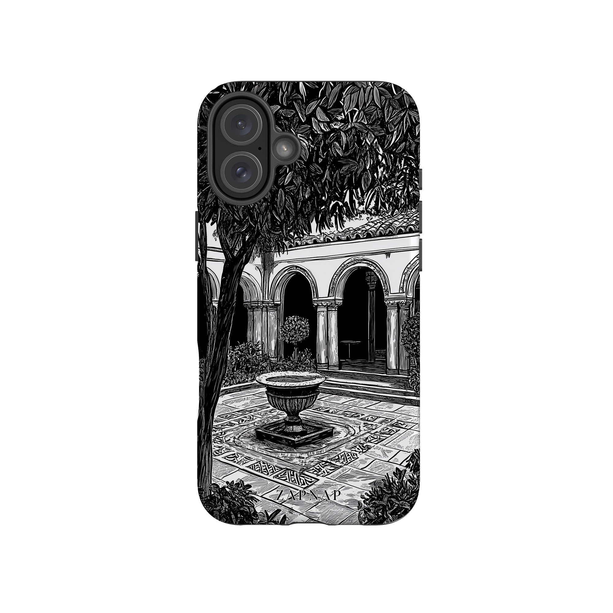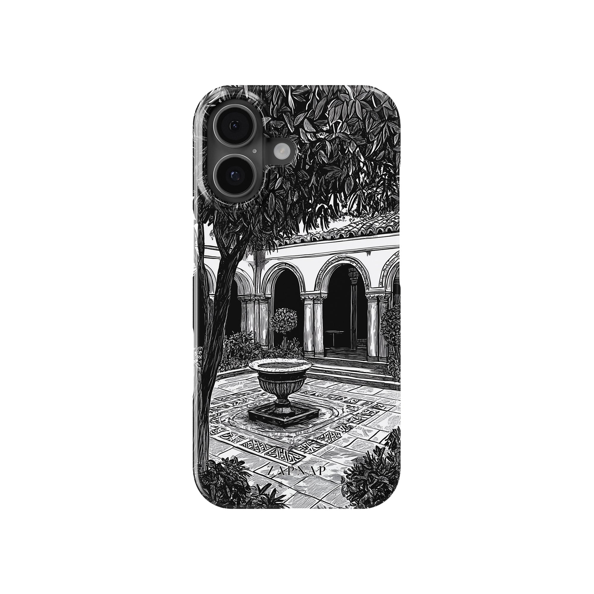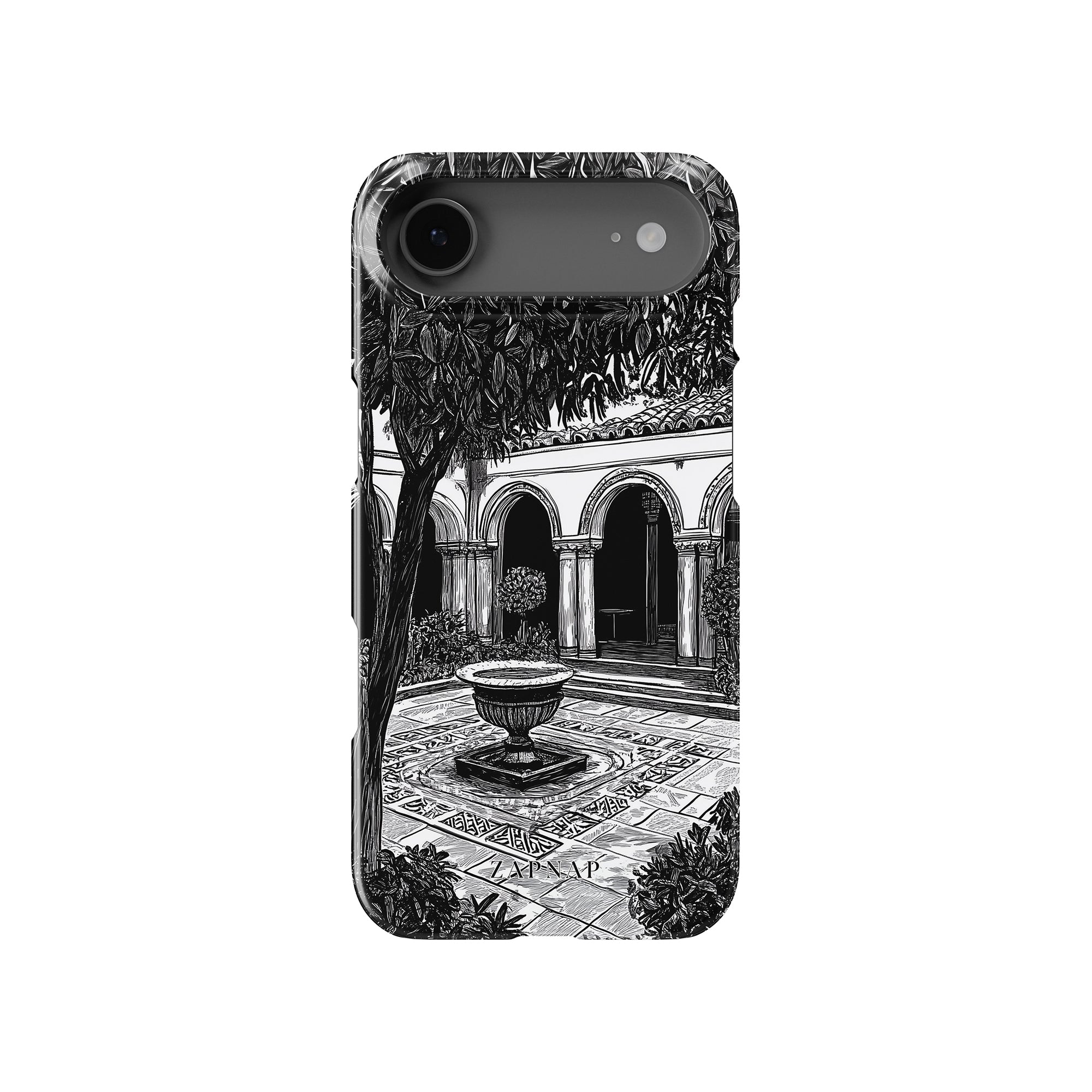 Dit zwart-wit kunstwerk toont een rustige binnenplaats met gebogen loopbruggen, weelderige planten en een centrale fontein. Het fijne lijnwerk en de schaduwwerking creëren een vredige sfeer en vangen de stille elegantie van een verborgen toevluchtsoord op.