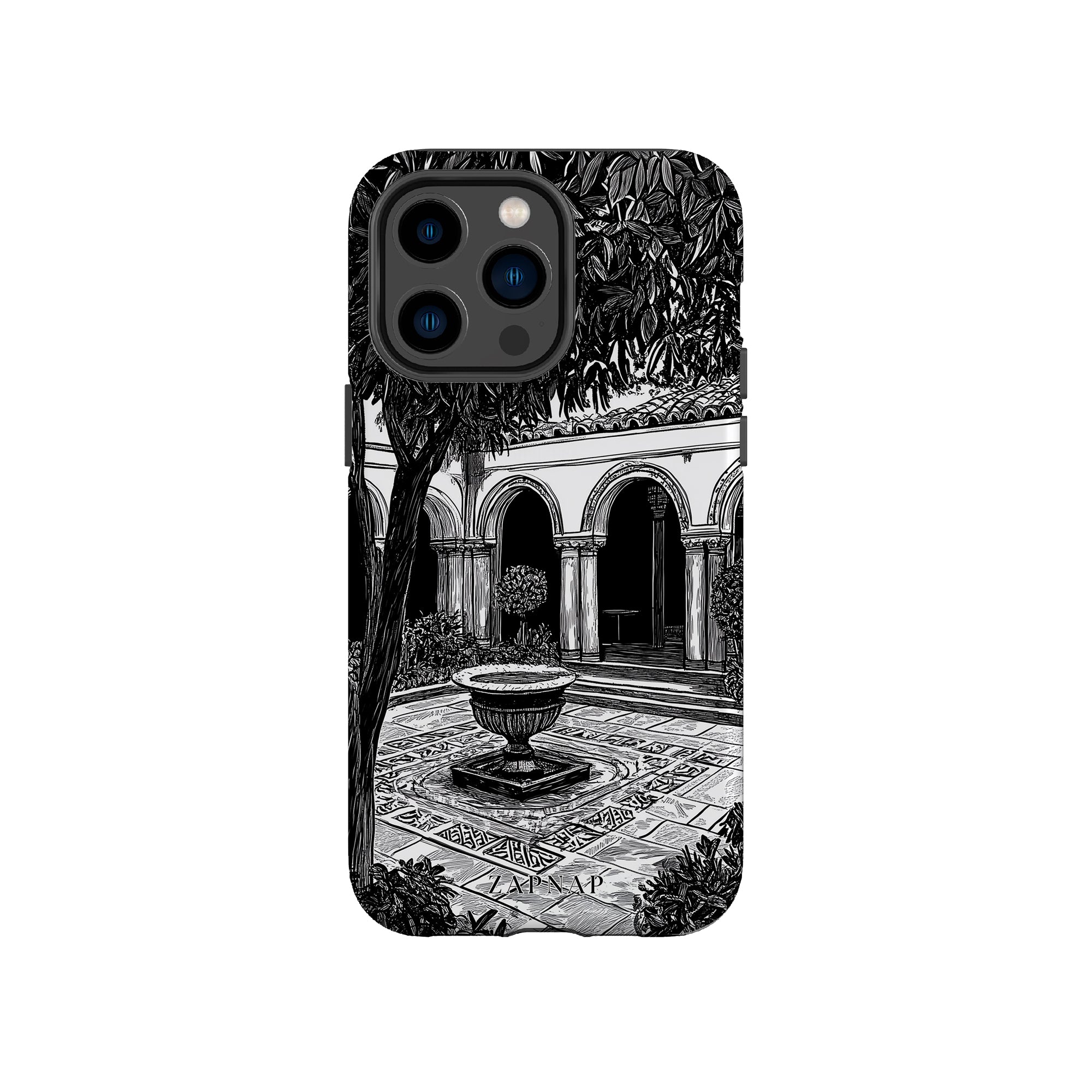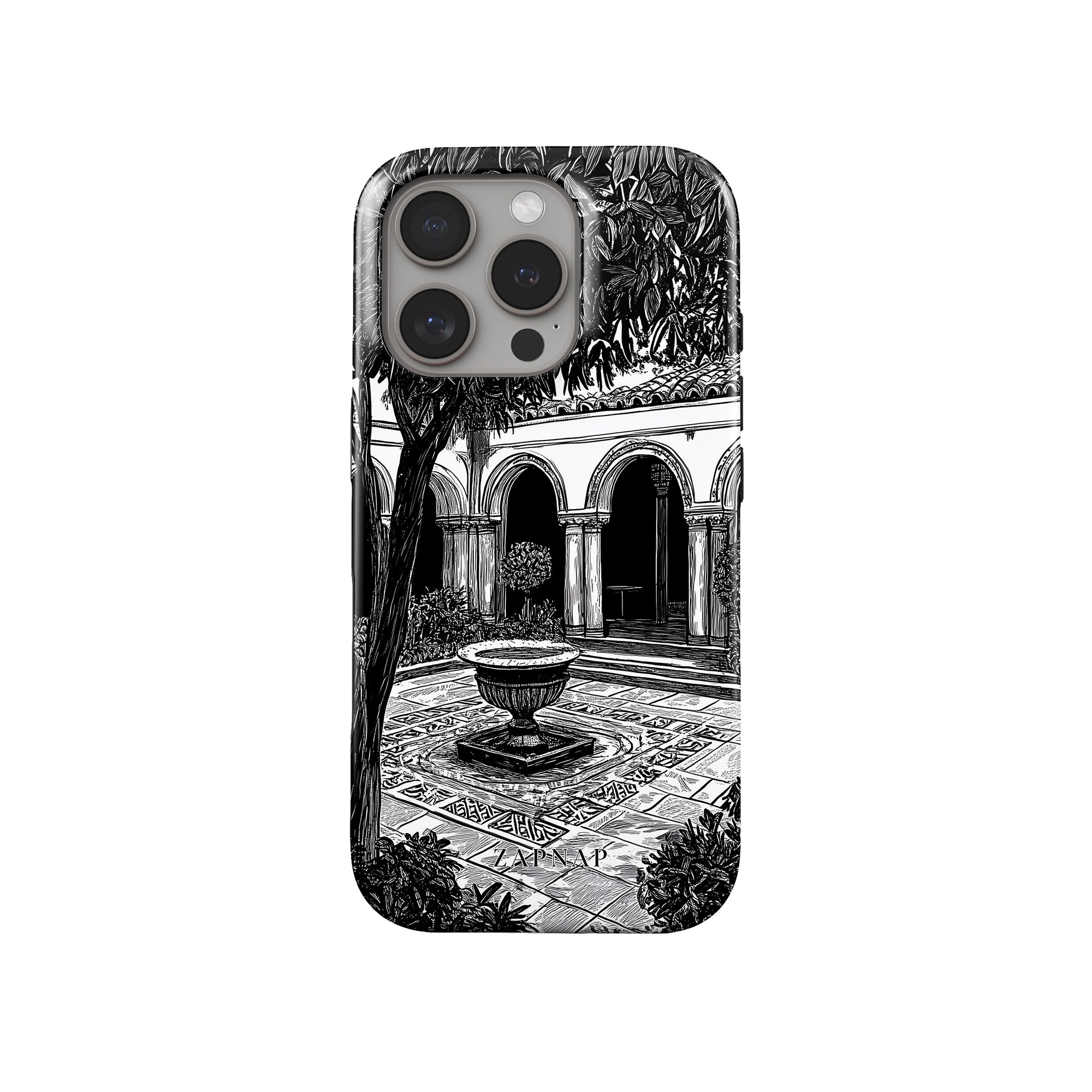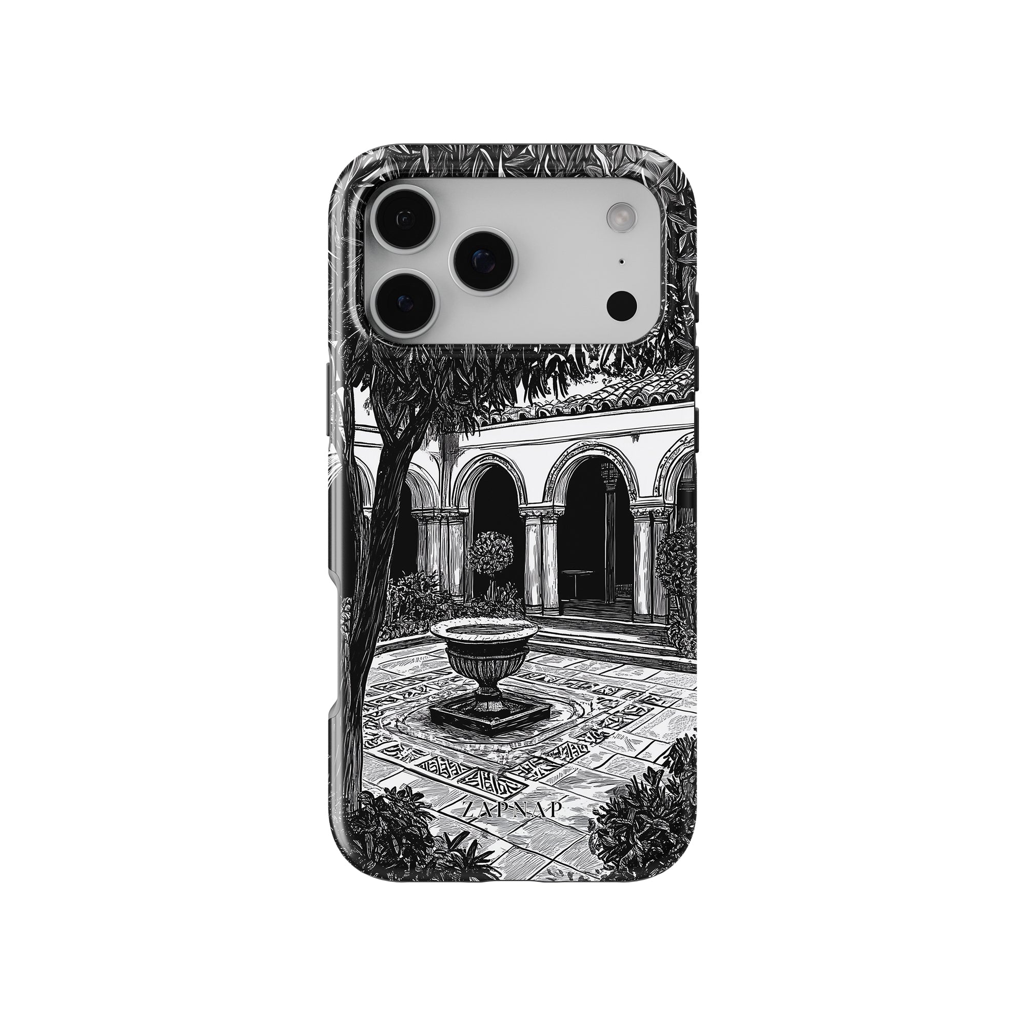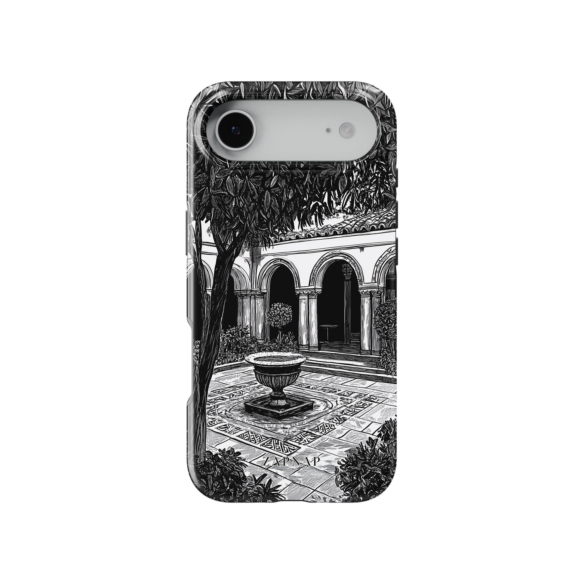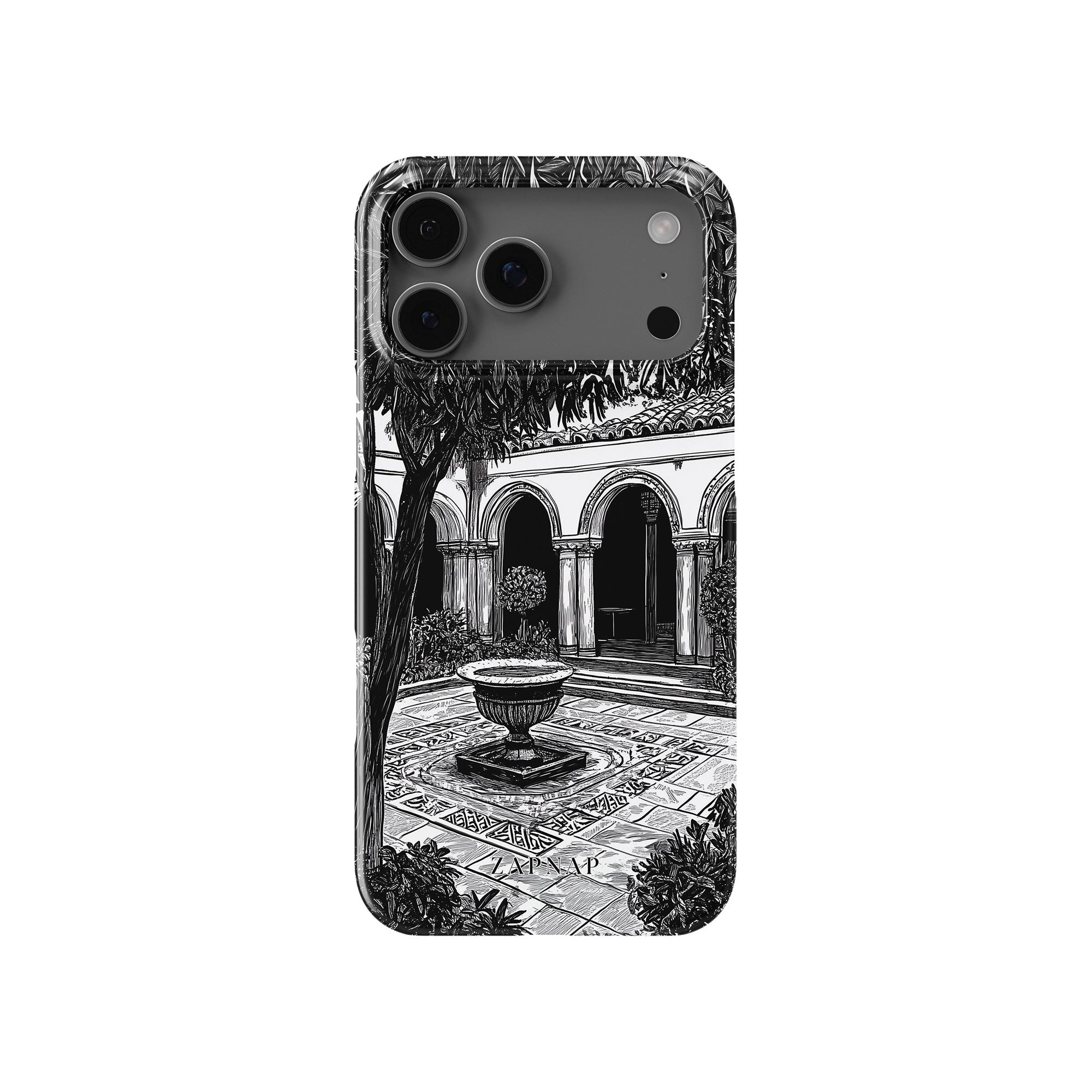 Dit zwart-wit kunstwerk toont een rustige binnenplaats met gebogen loopbruggen, weelderige planten en een centrale fontein. Het fijne lijnwerk en de schaduwwerking creëren een vredige sfeer en vangen de stille elegantie van een verborgen toevluchtsoord op.