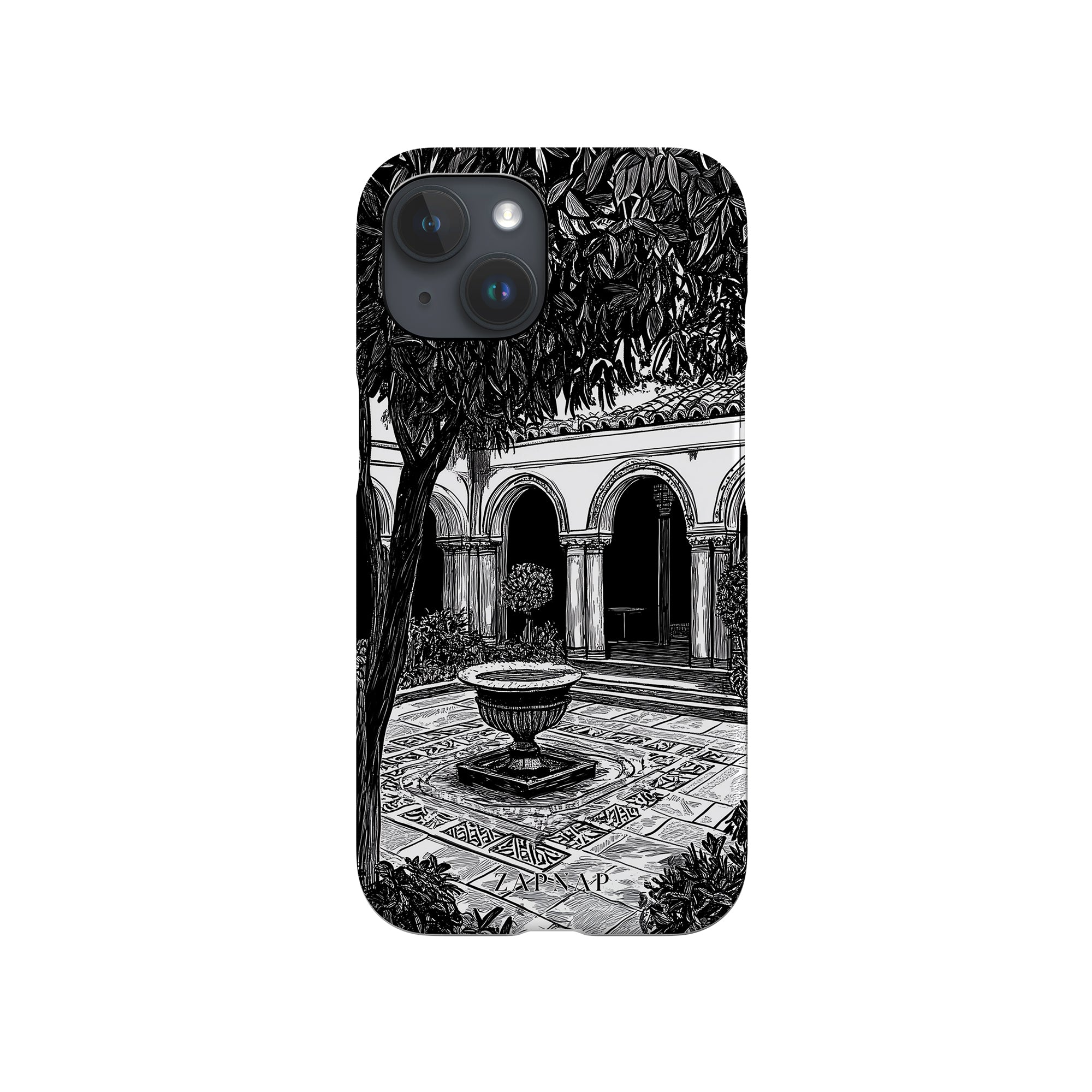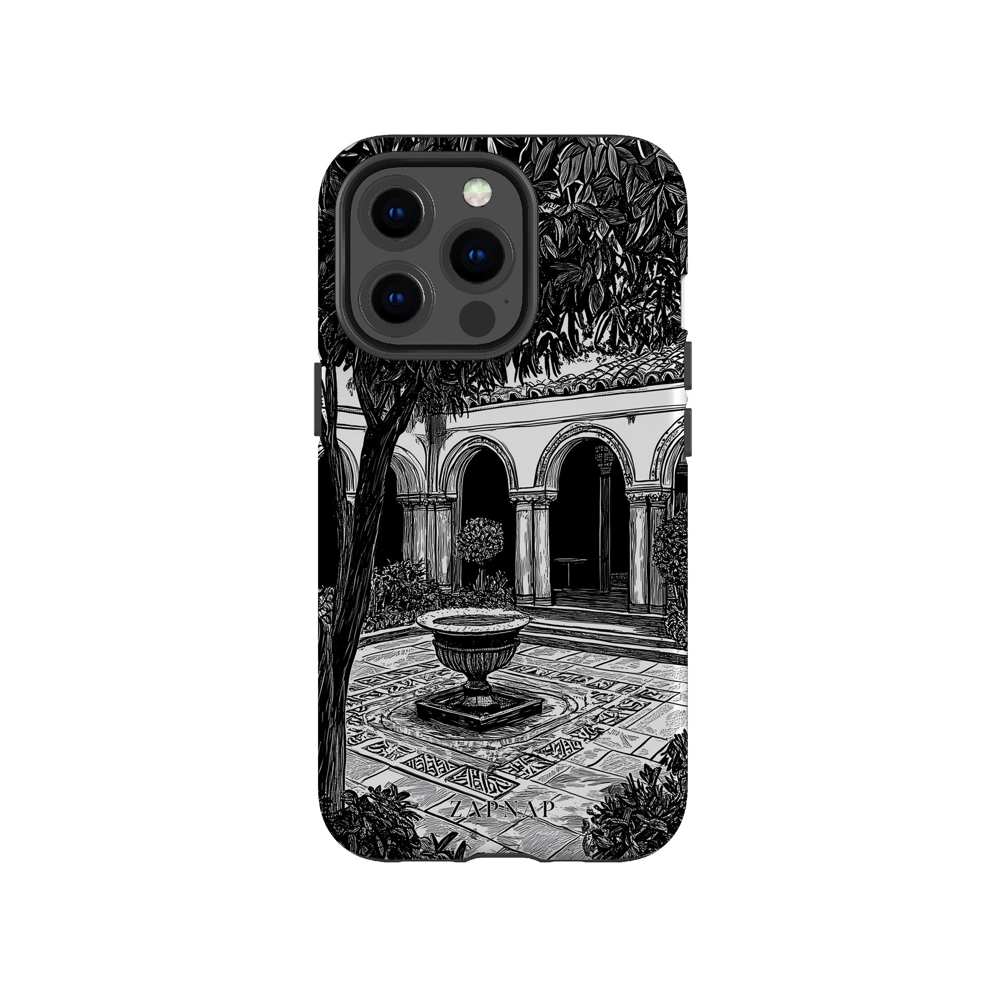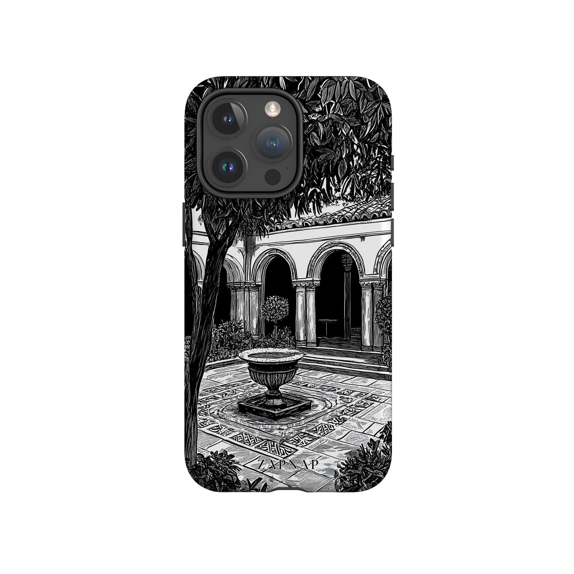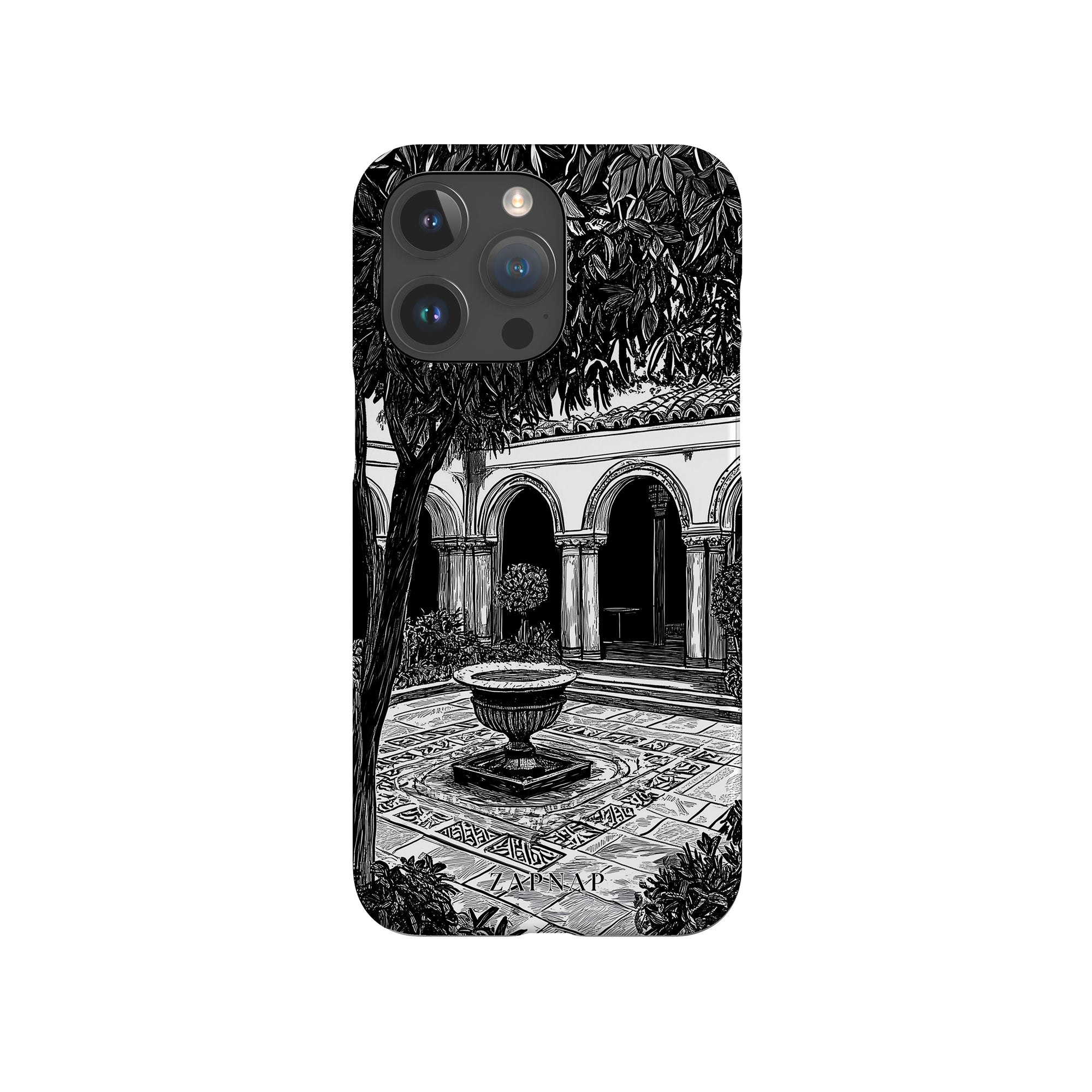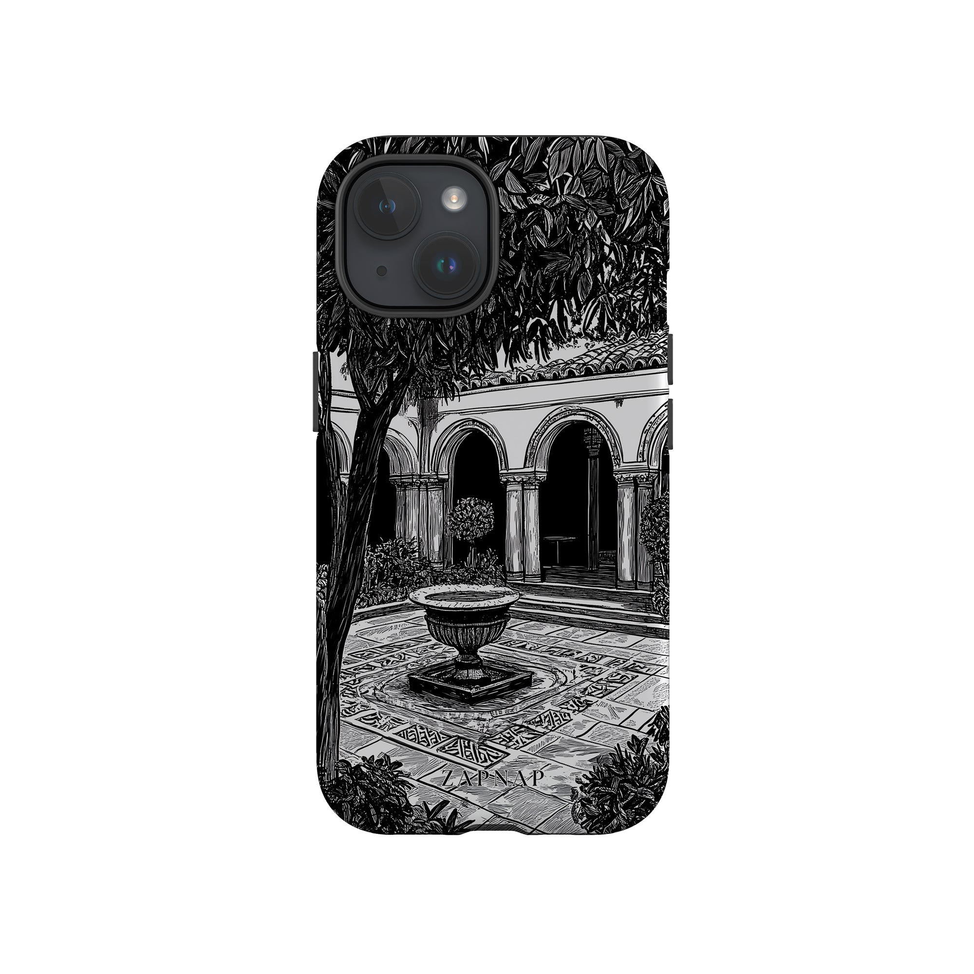 Dit zwart-wit kunstwerk toont een rustige binnenplaats met gebogen loopbruggen, weelderige planten en een centrale fontein. Het fijne lijnwerk en de schaduwwerking creëren een vredige sfeer en vangen de stille elegantie van een verborgen toevluchtsoord op.