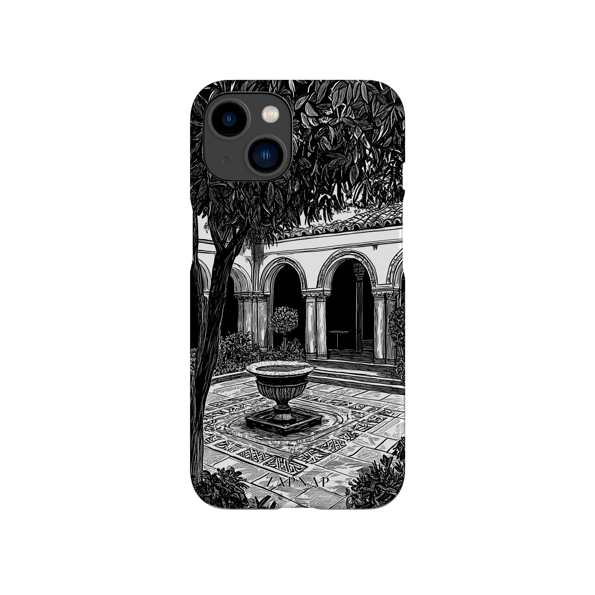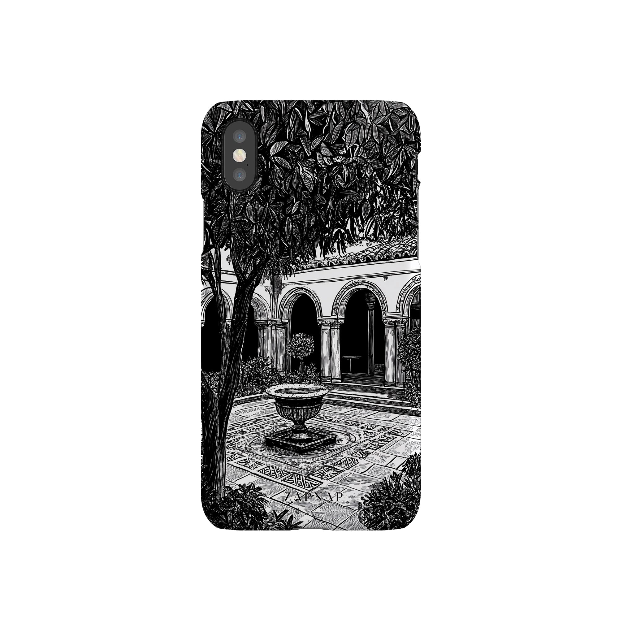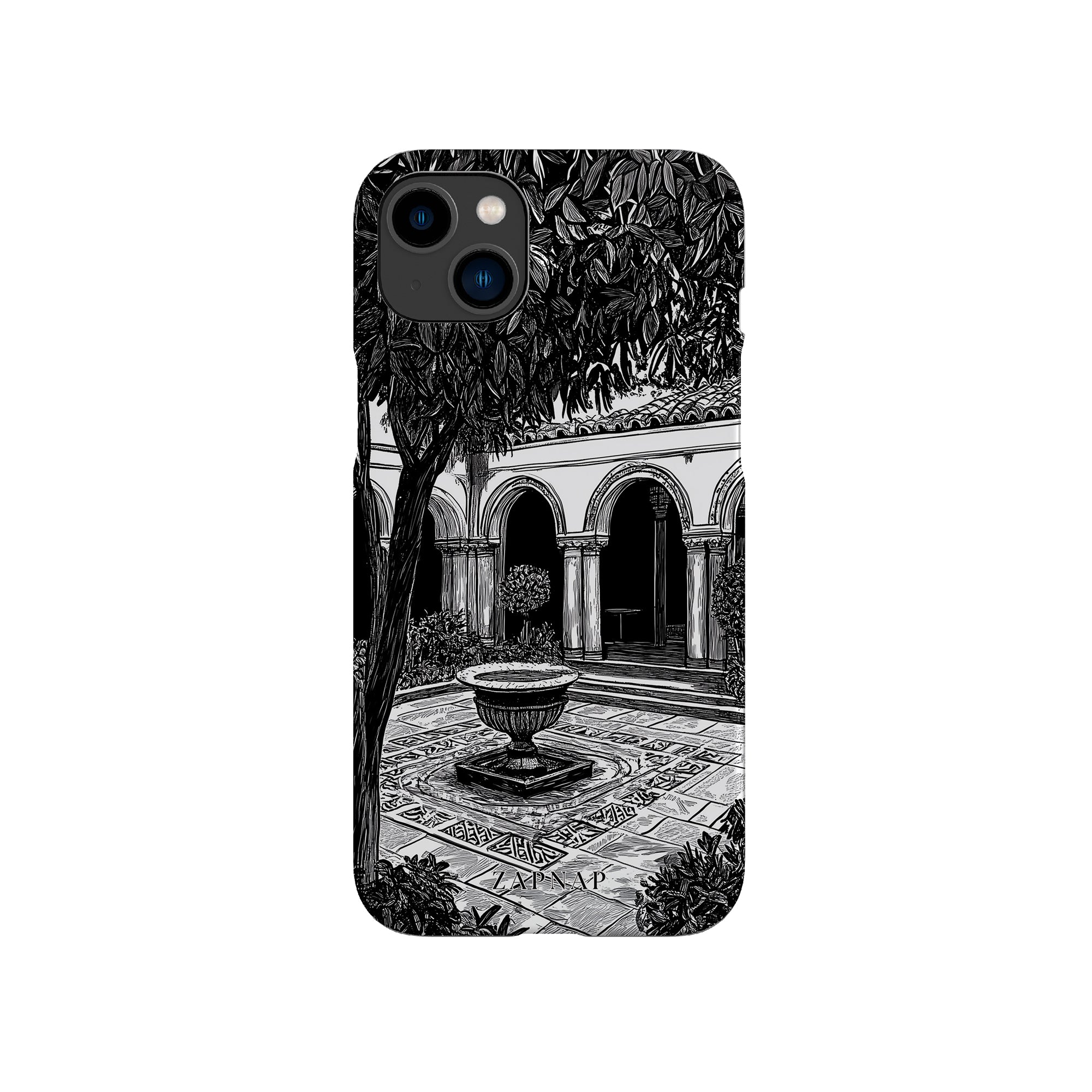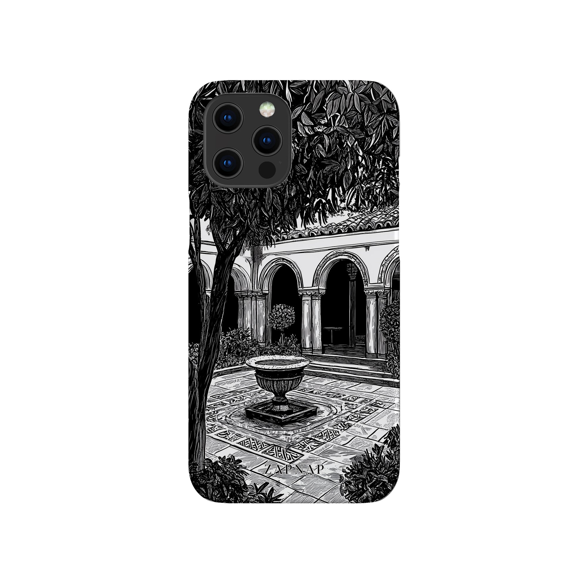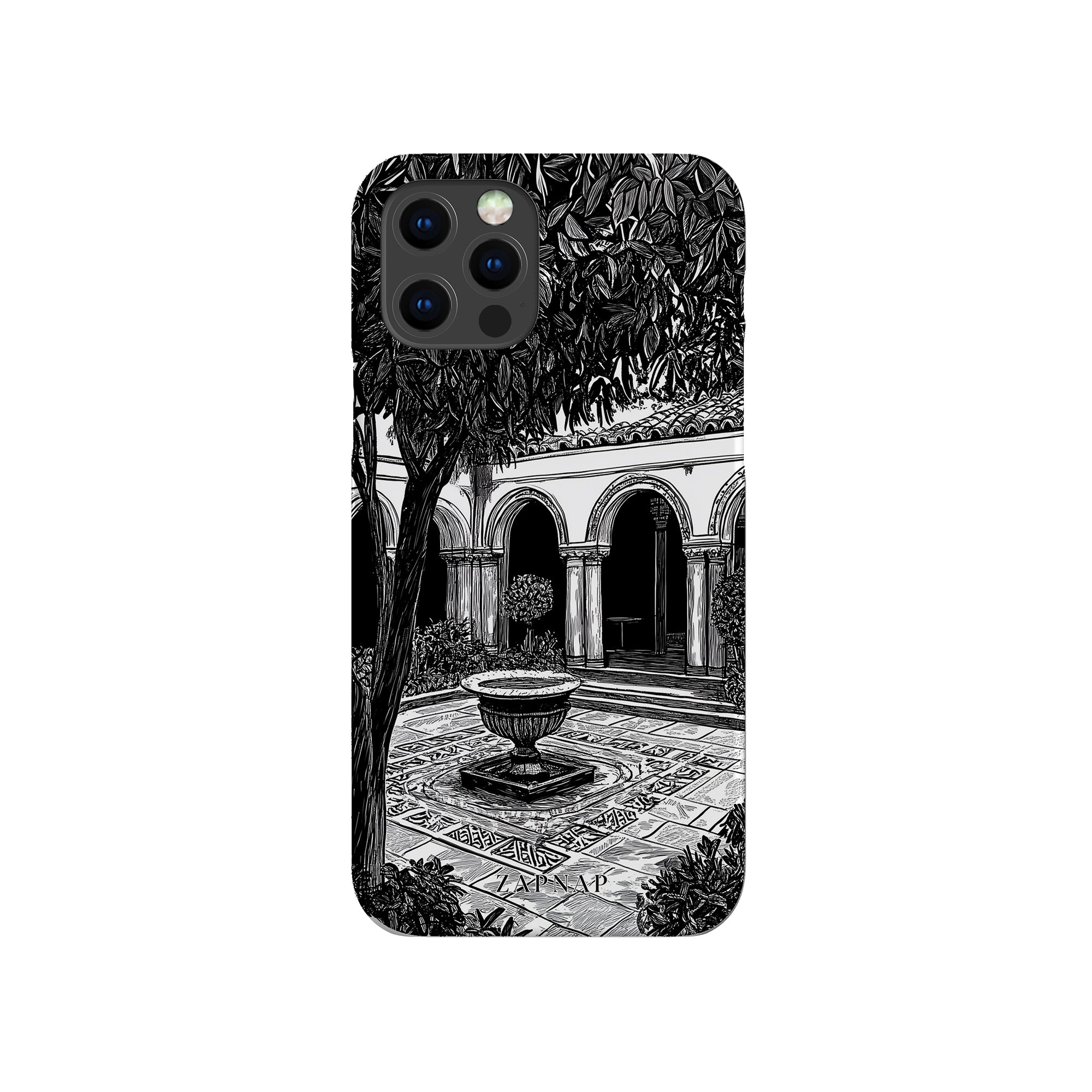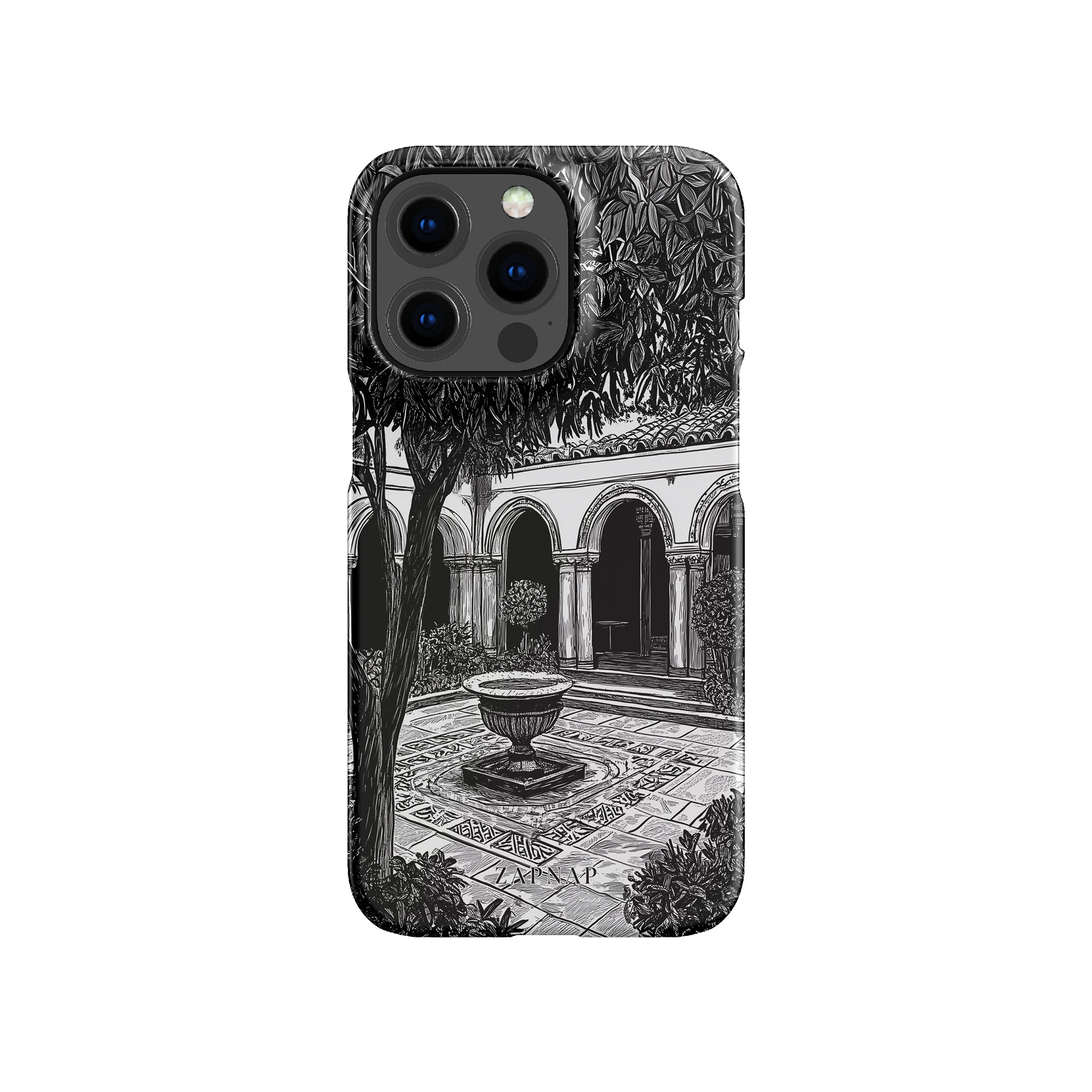 Dit zwart-wit kunstwerk toont een rustige binnenplaats met gebogen loopbruggen, weelderige planten en een centrale fontein. Het fijne lijnwerk en de schaduwwerking creëren een vredige sfeer en vangen de stille elegantie van een verborgen toevluchtsoord op.