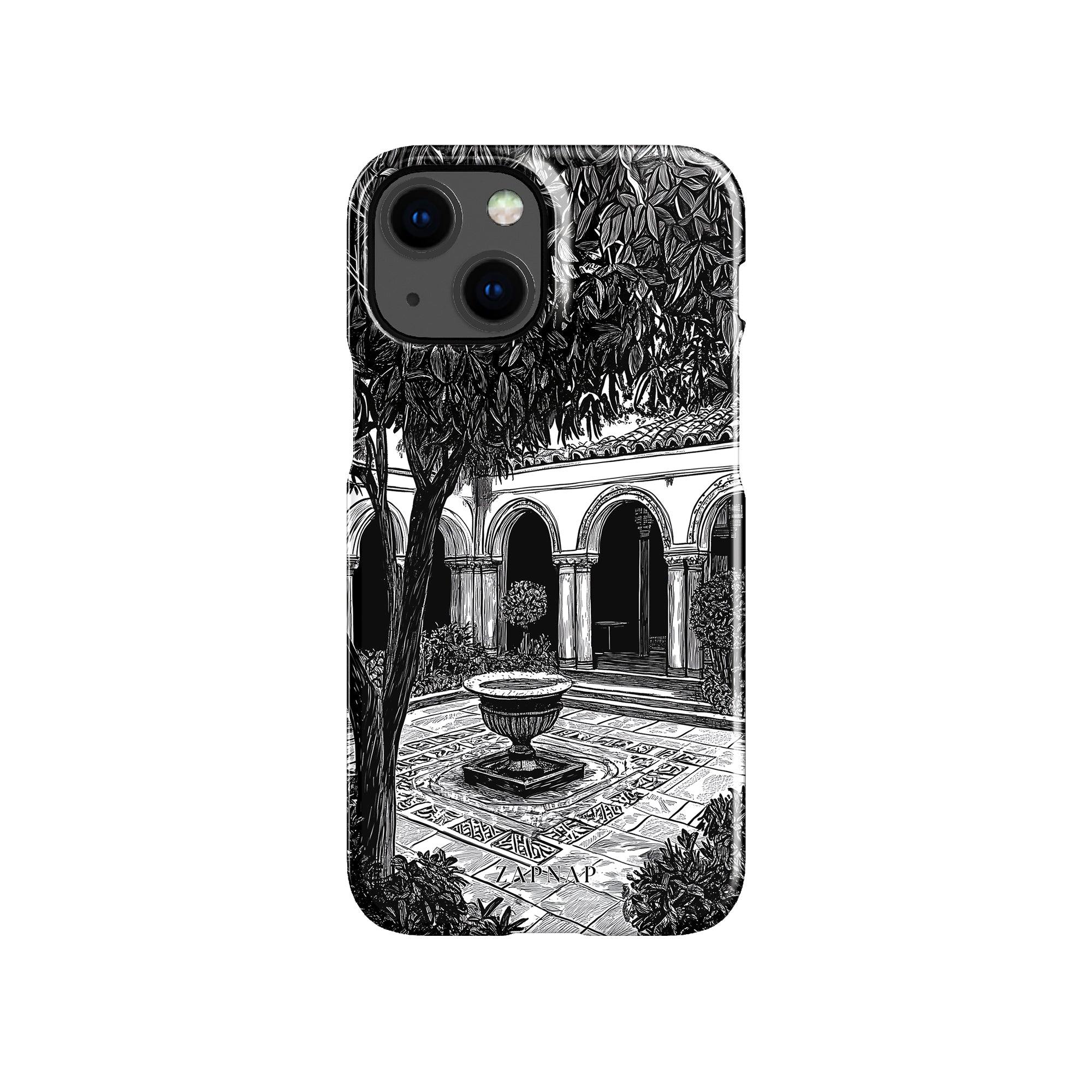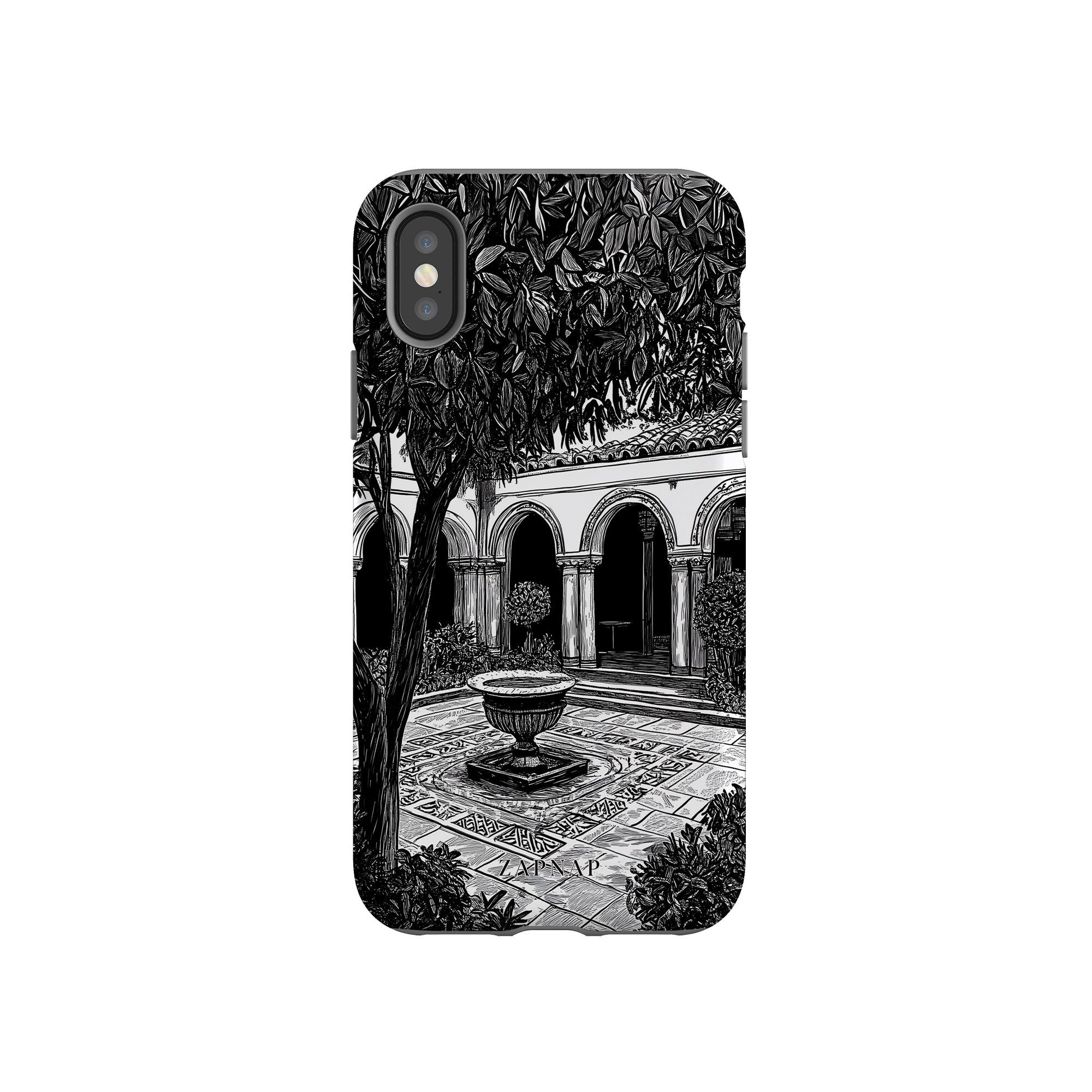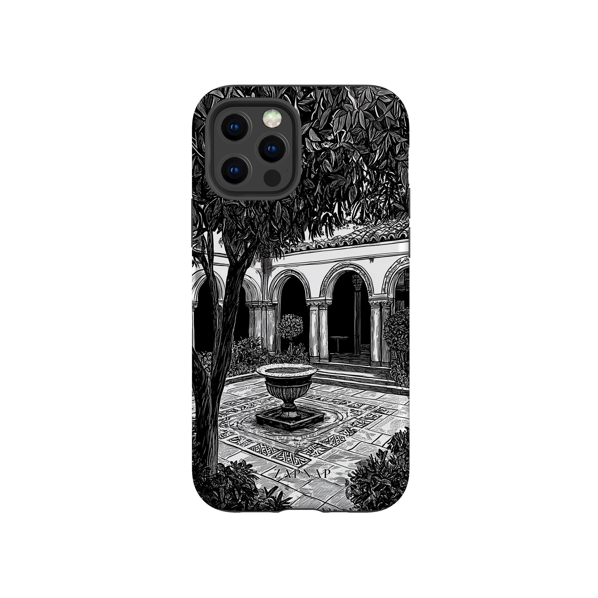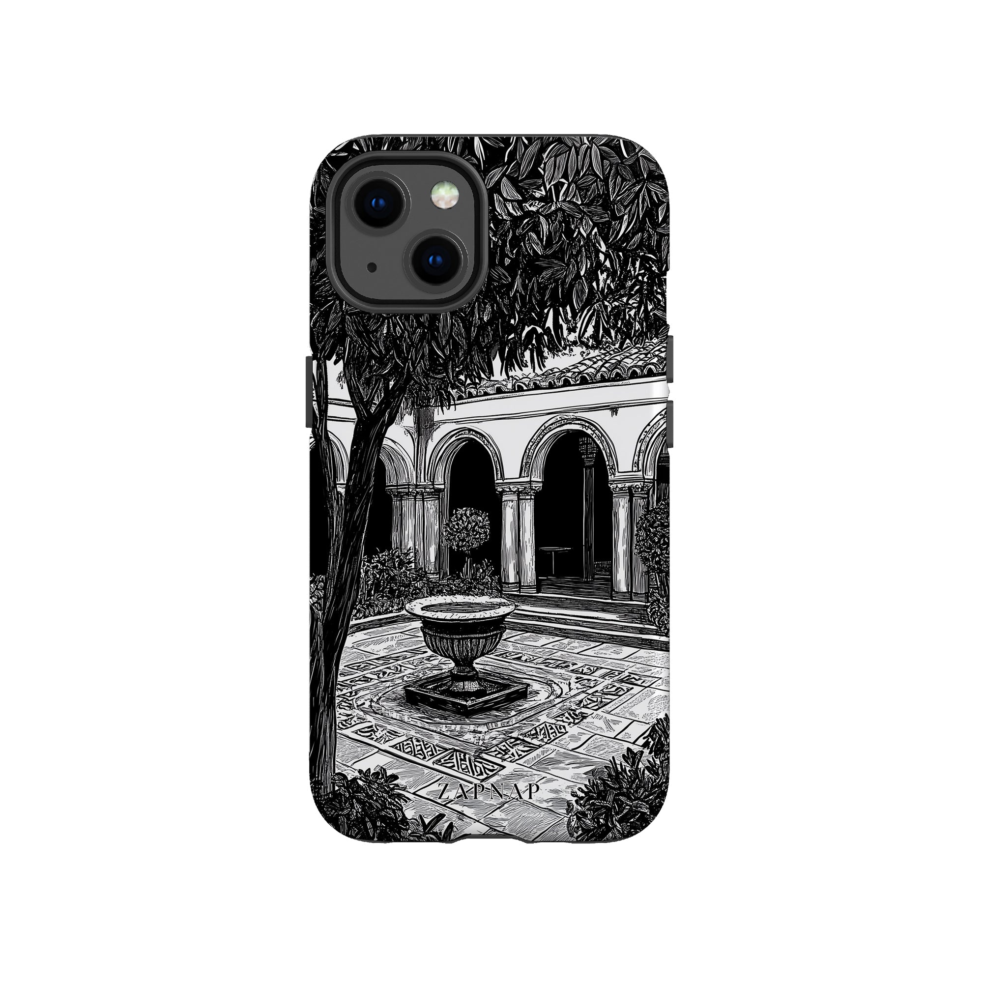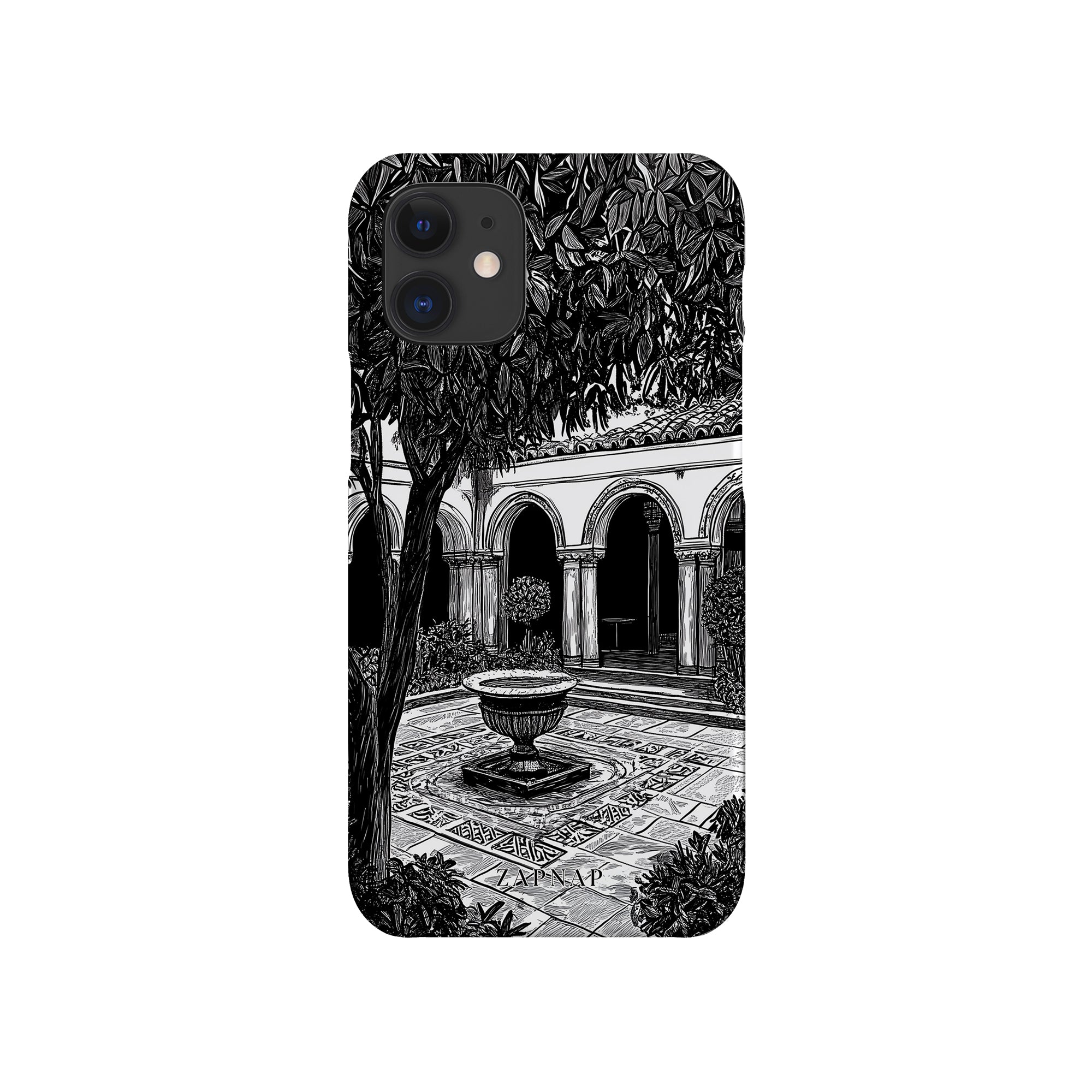 Dit zwart-wit kunstwerk toont een rustige binnenplaats met gebogen loopbruggen, weelderige planten en een centrale fontein. Het fijne lijnwerk en de schaduwwerking creëren een vredige sfeer en vangen de stille elegantie van een verborgen toevluchtsoord op.
