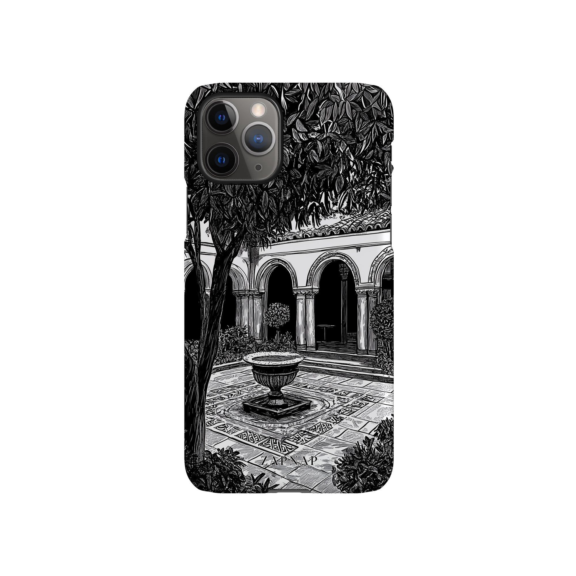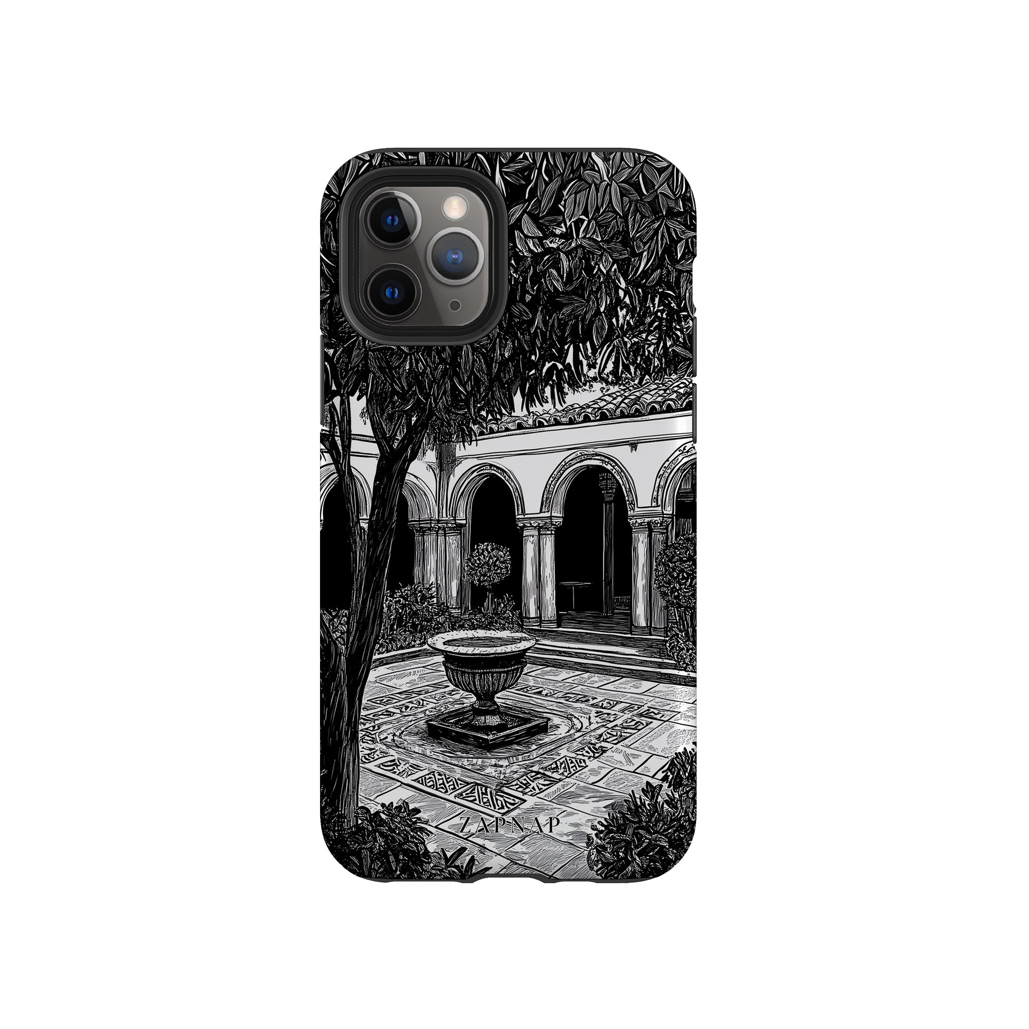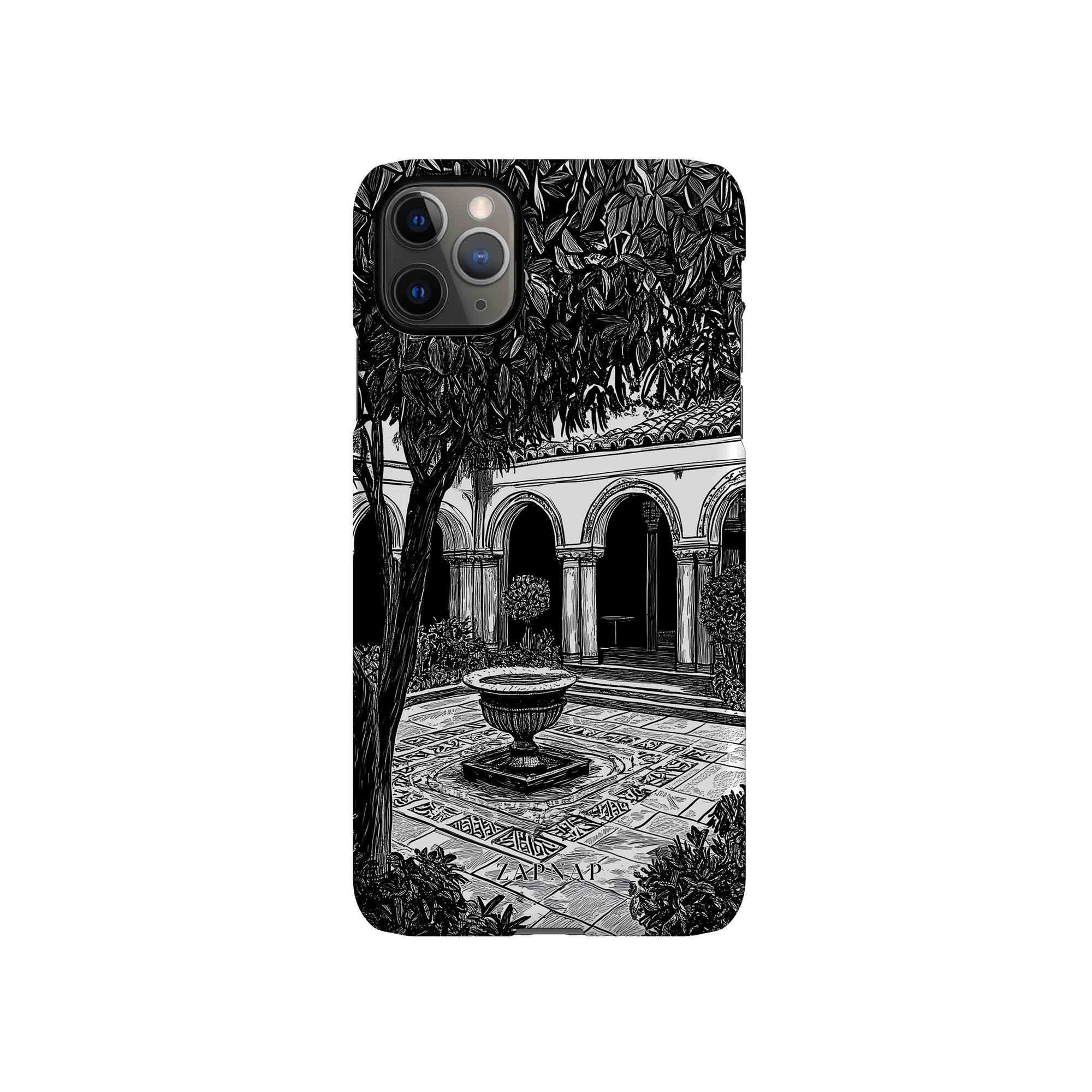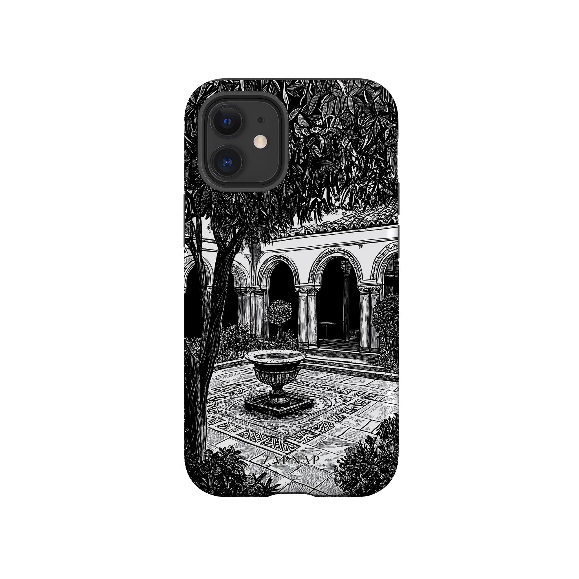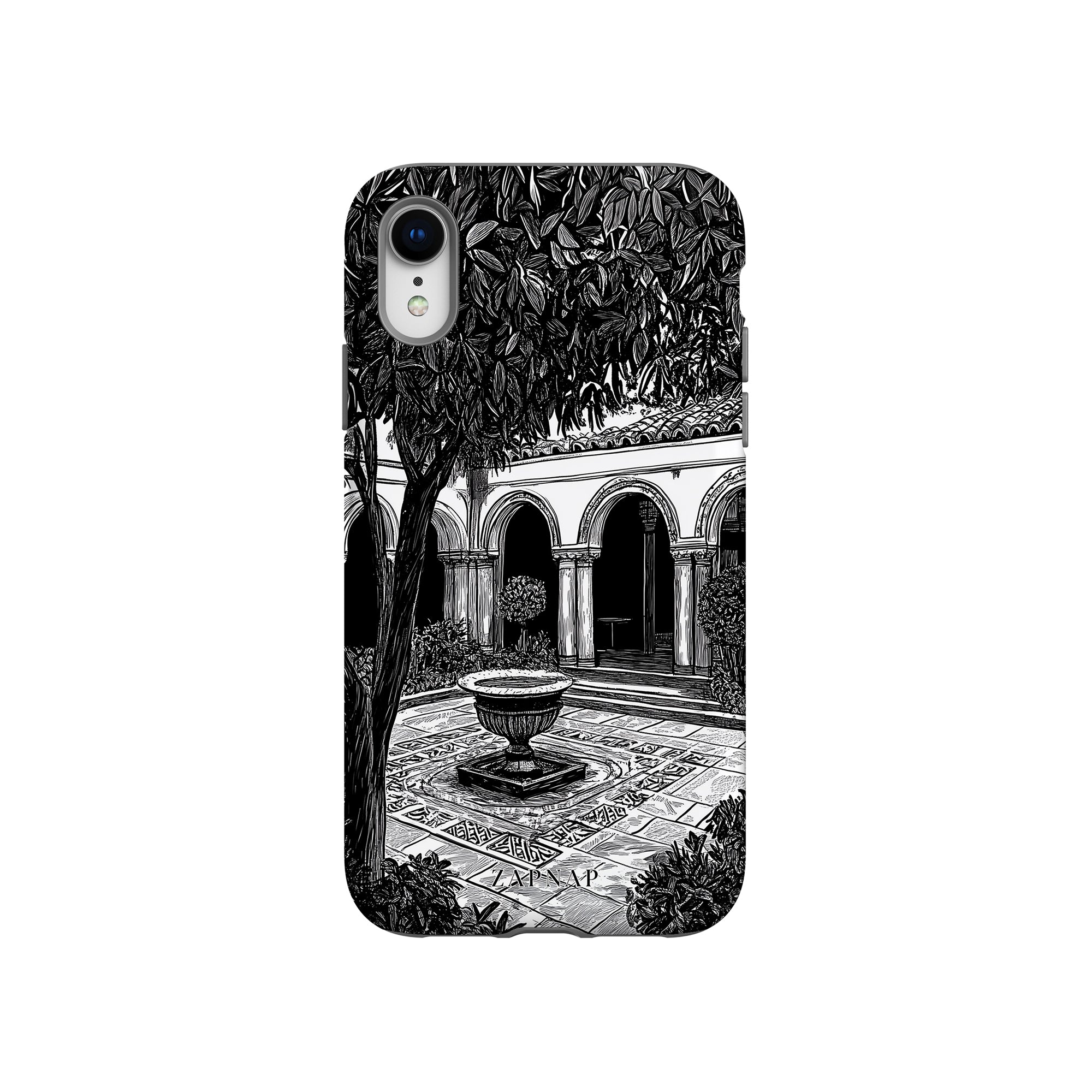 Dit zwart-wit kunstwerk toont een rustige binnenplaats met gebogen loopbruggen, weelderige planten en een centrale fontein. Het fijne lijnwerk en de schaduwwerking creëren een vredige sfeer en vangen de stille elegantie van een verborgen toevluchtsoord op.