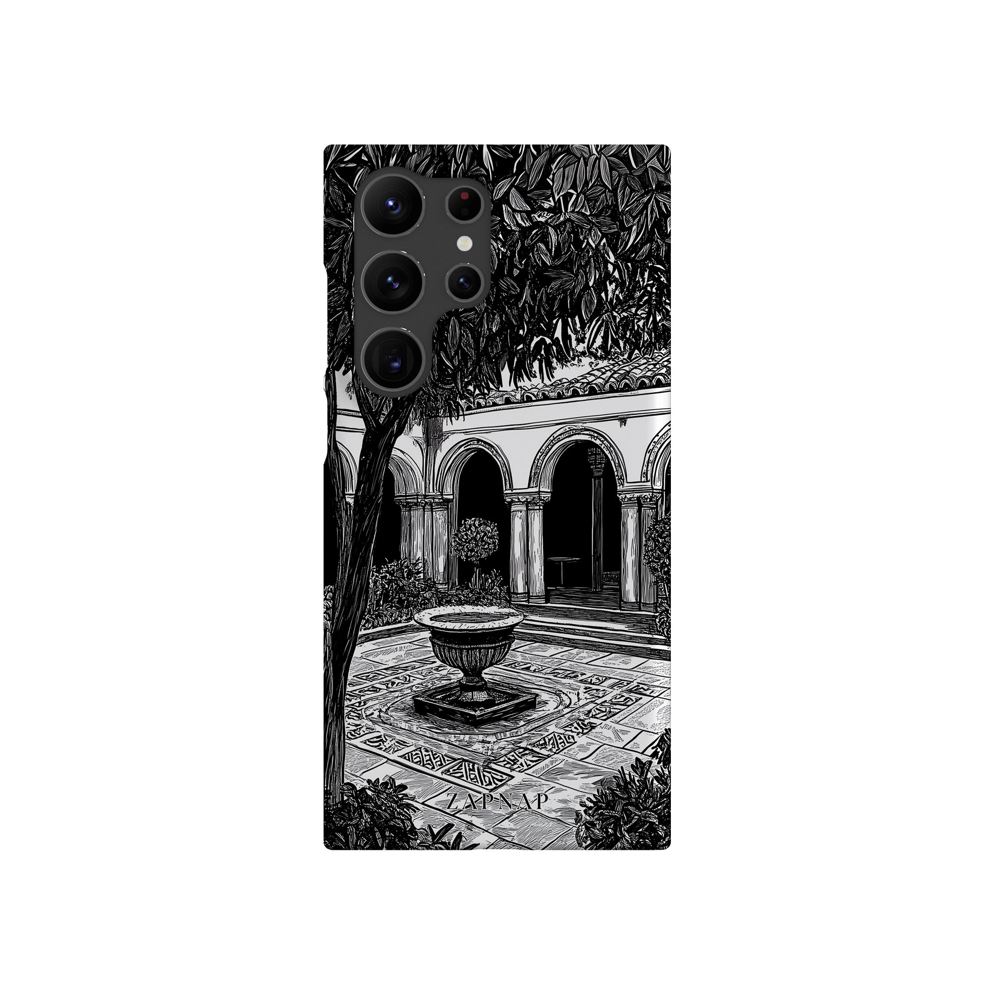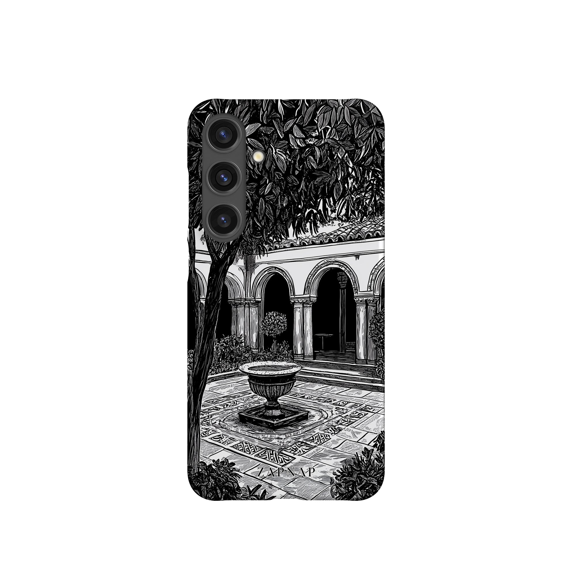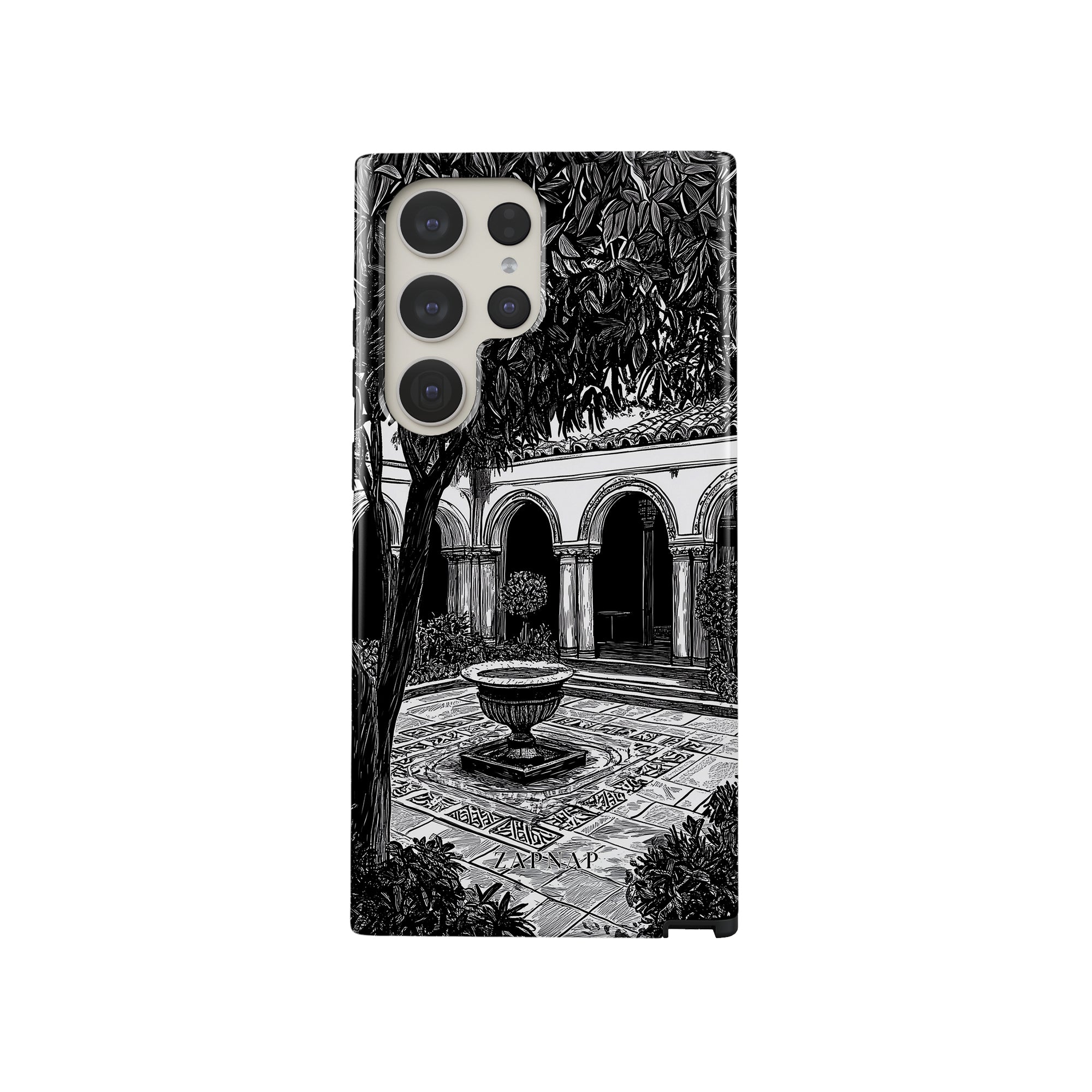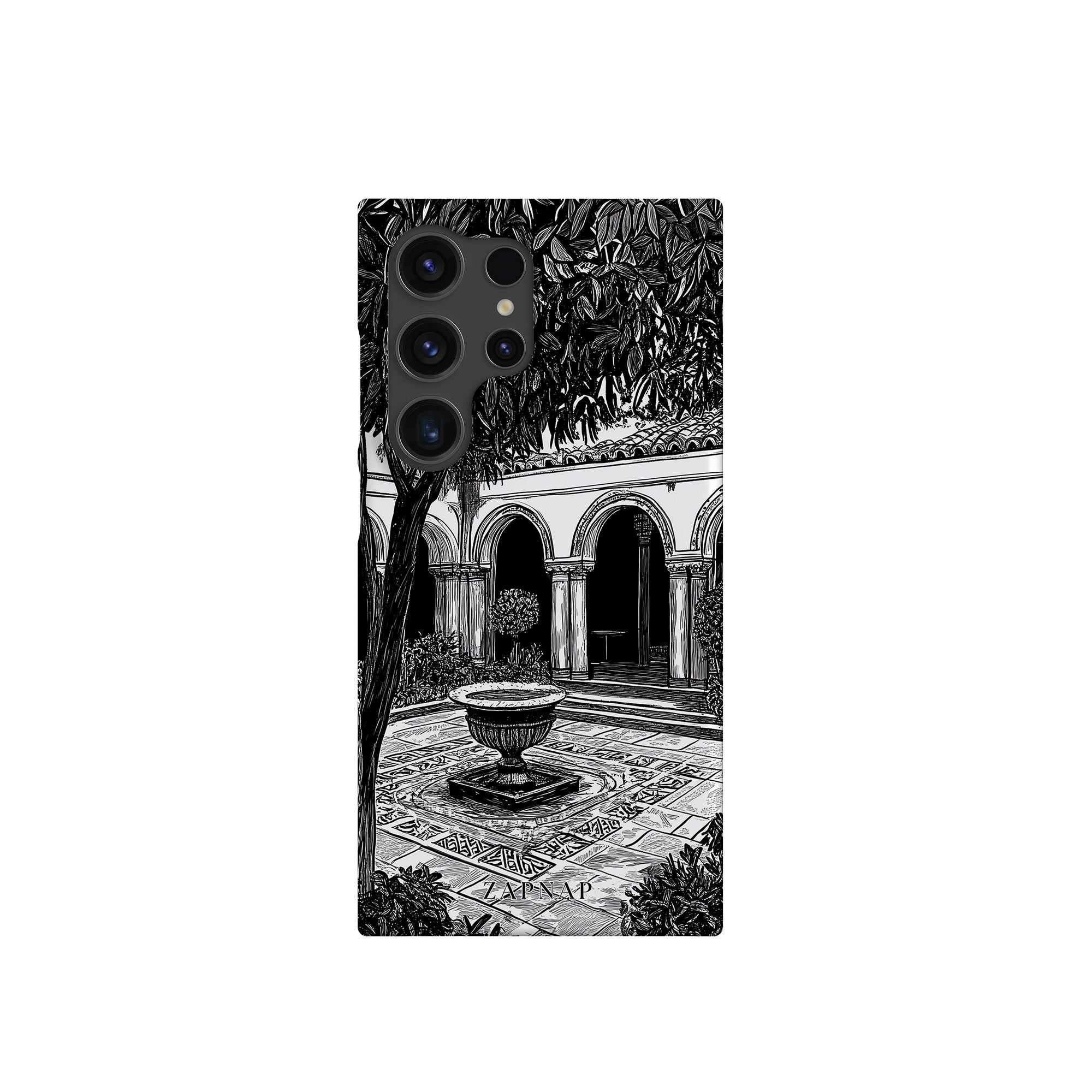 This black-and-white artwork depicts a tranquil courtyard with arched walkways, lush plants, and a central fountain. The fine line work and shadowing create a peaceful atmosphere, capturing the quiet elegance of a hidden sanctuary.