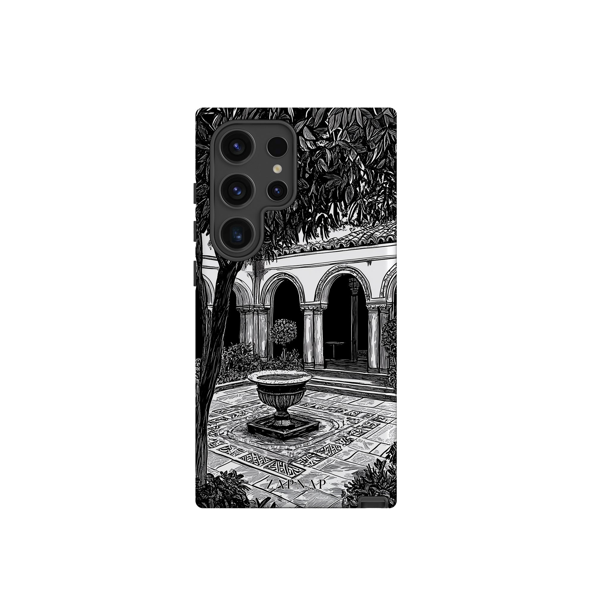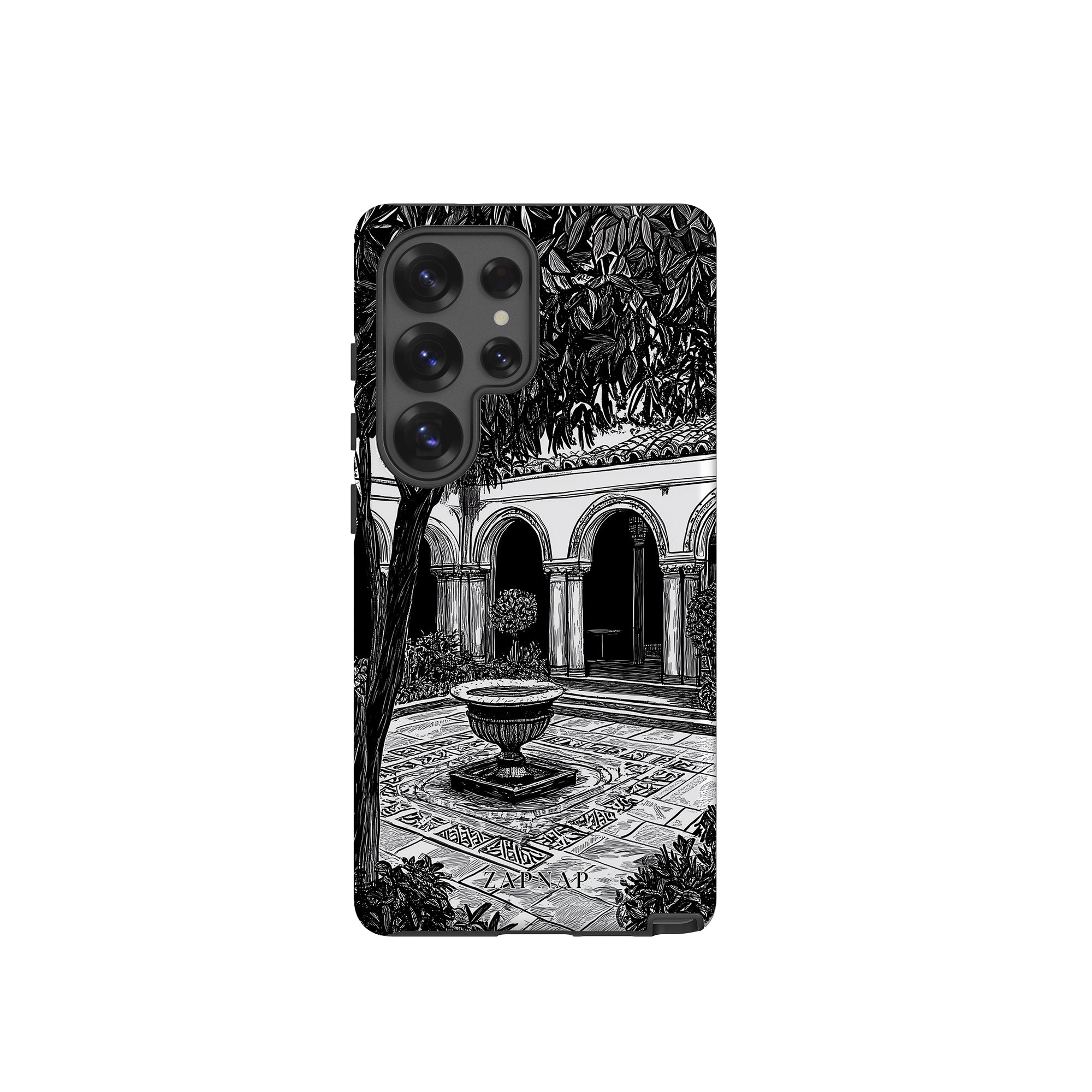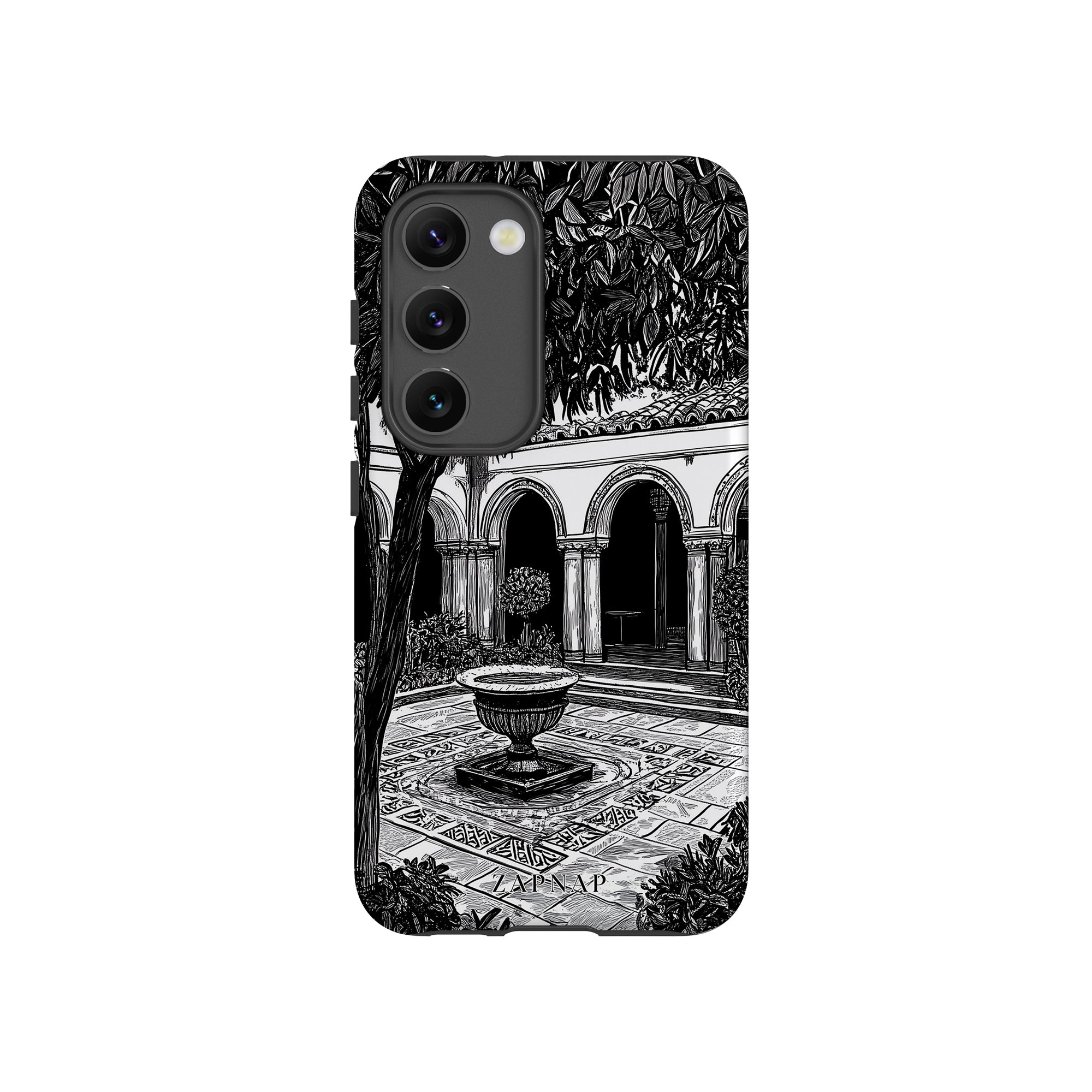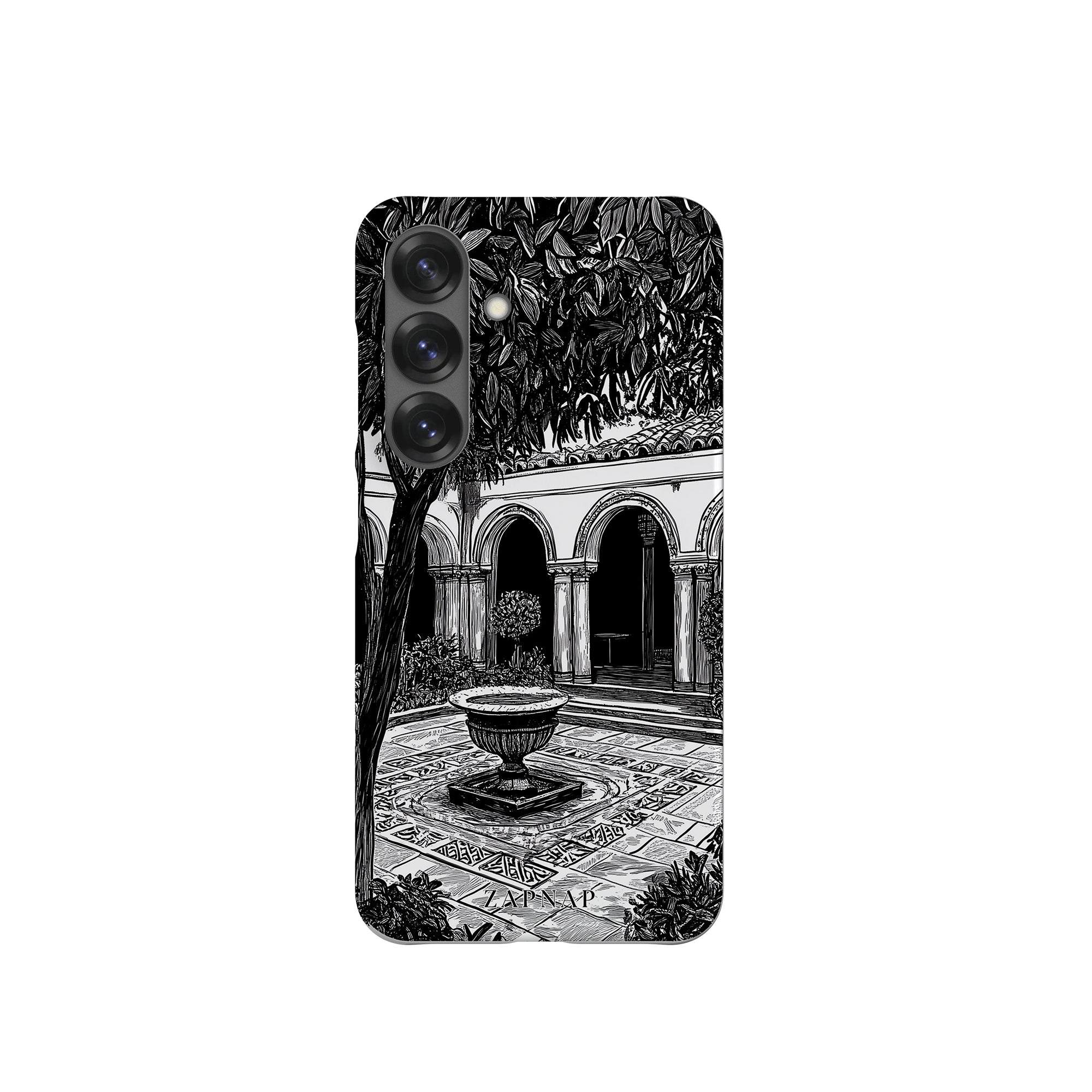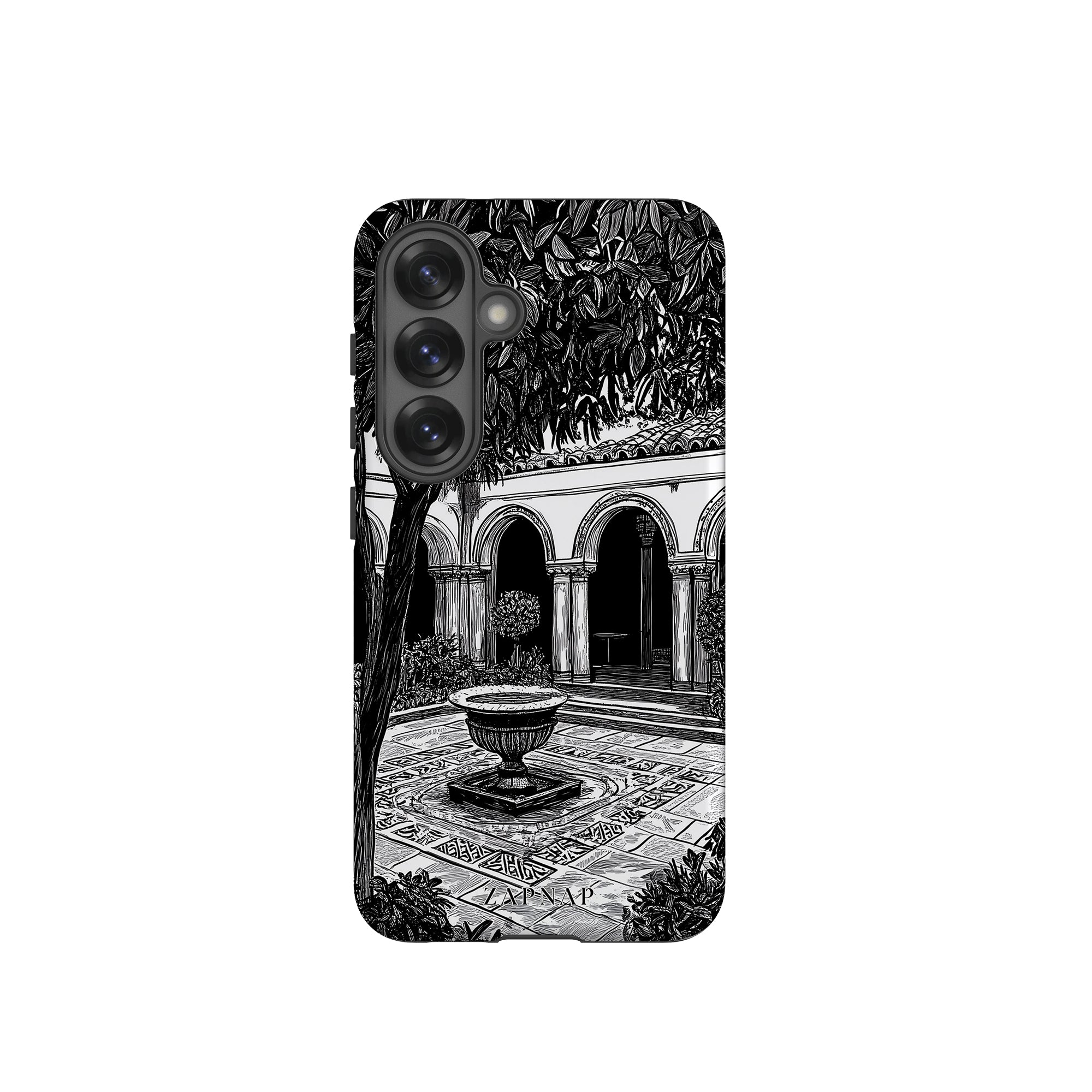 This black-and-white artwork depicts a tranquil courtyard with arched walkways, lush plants, and a central fountain. The fine line work and shadowing create a peaceful atmosphere, capturing the quiet elegance of a hidden sanctuary.