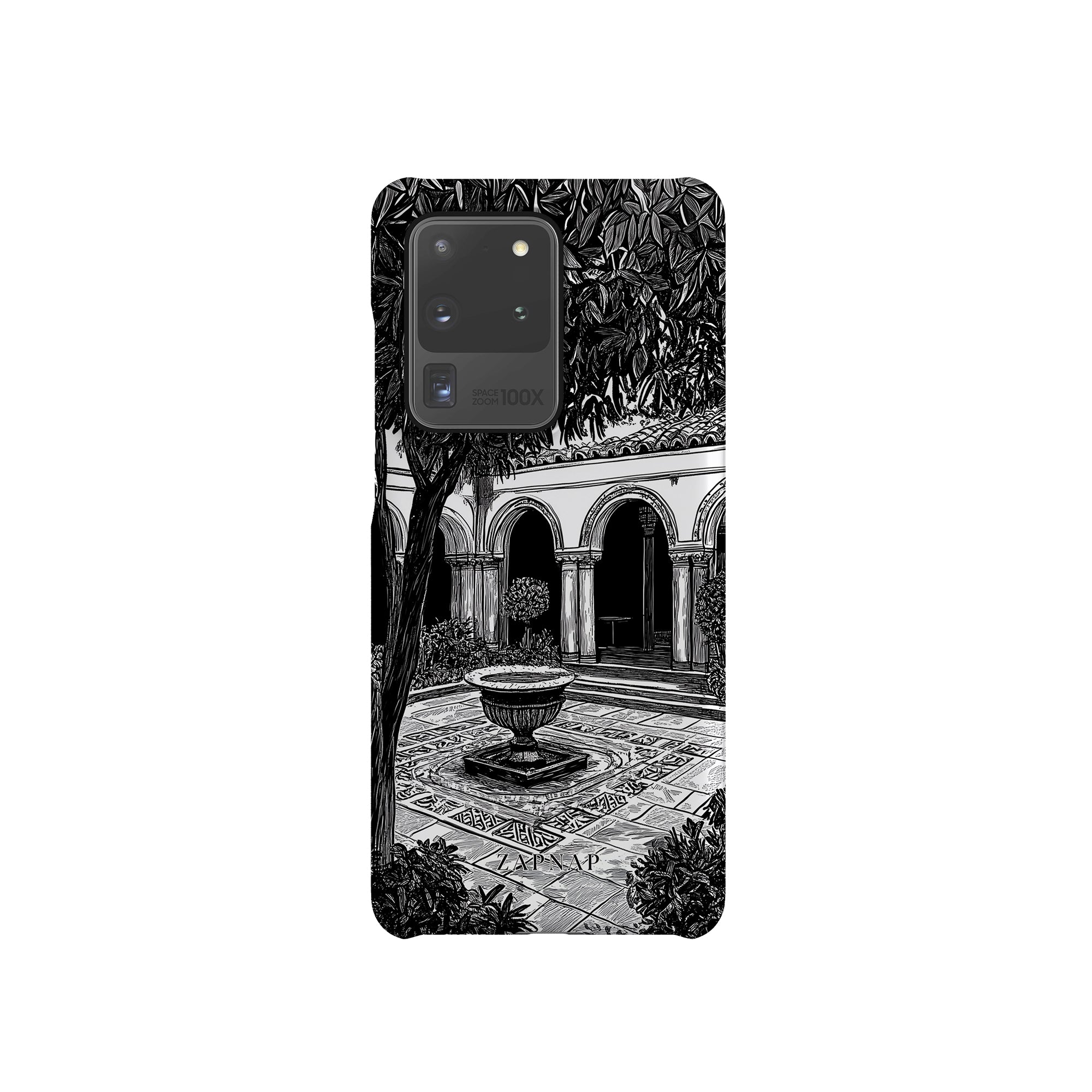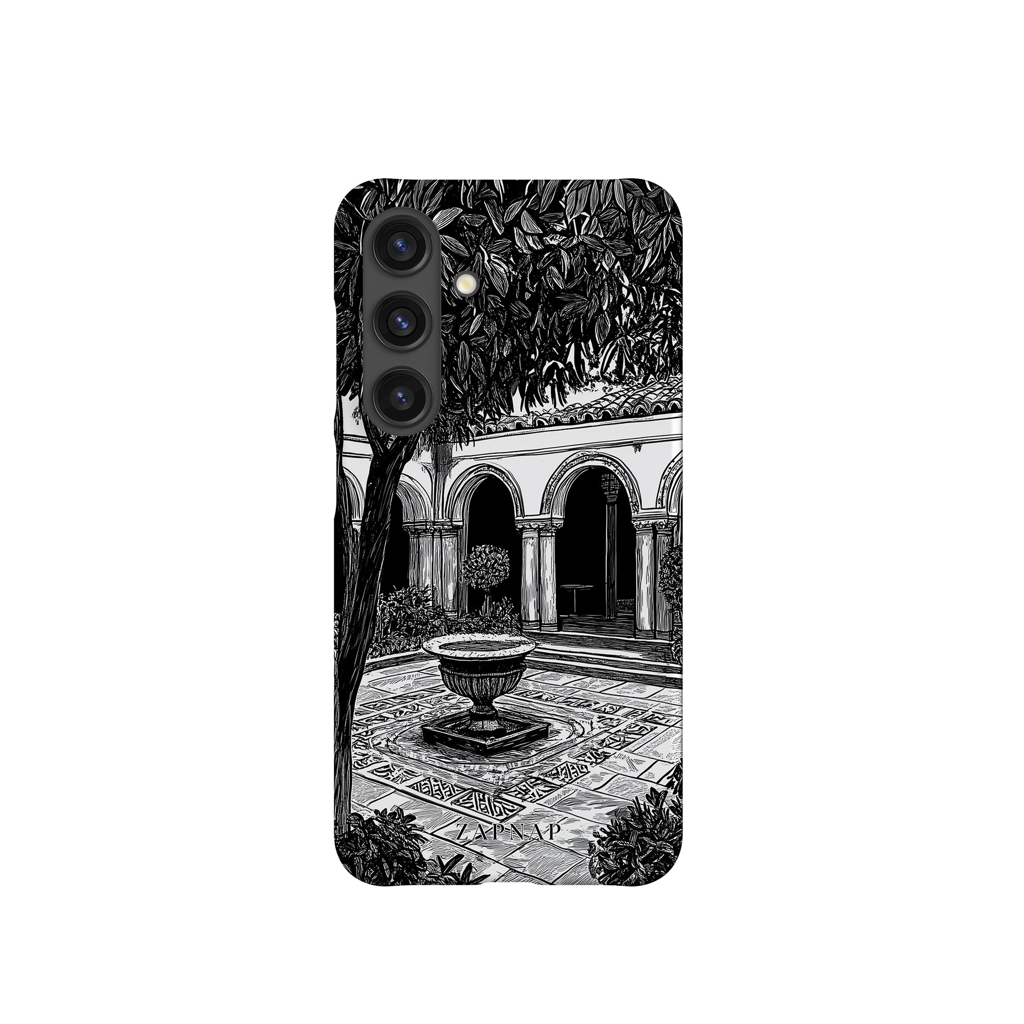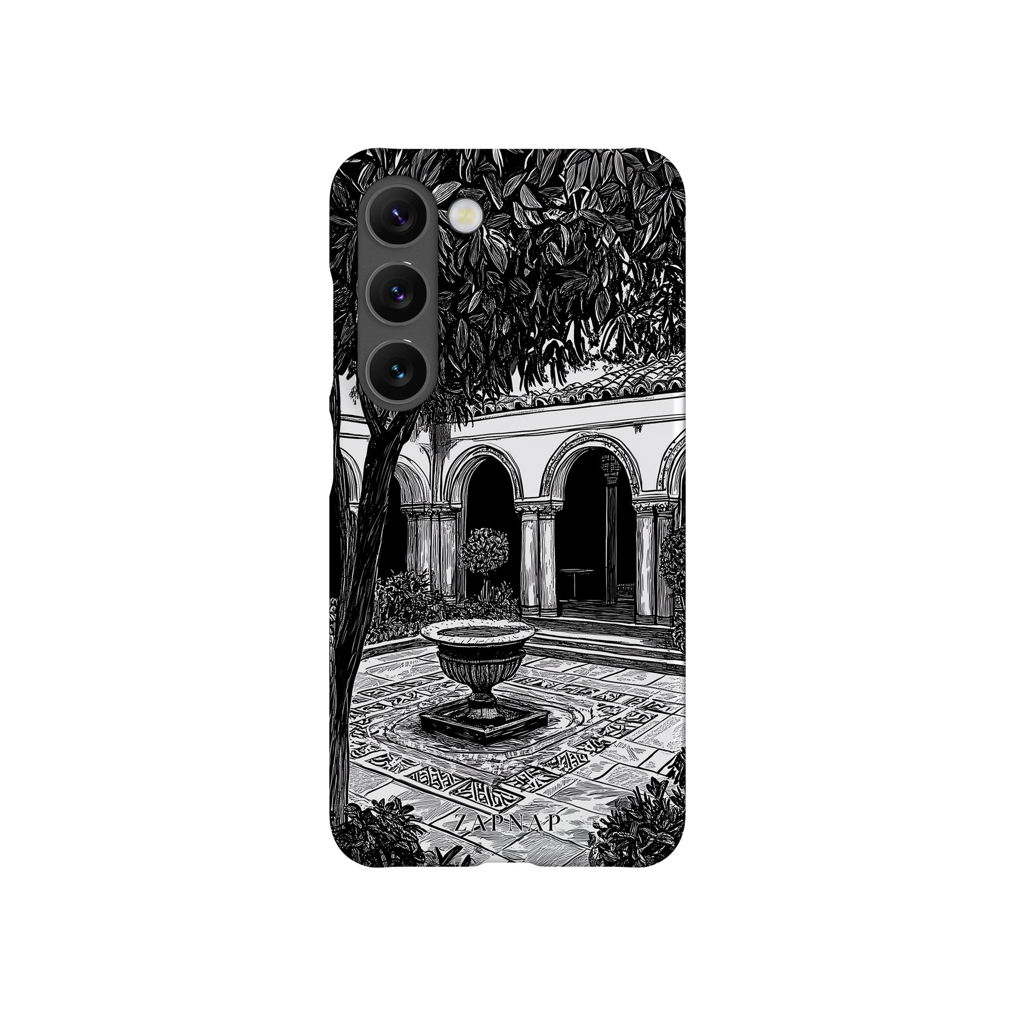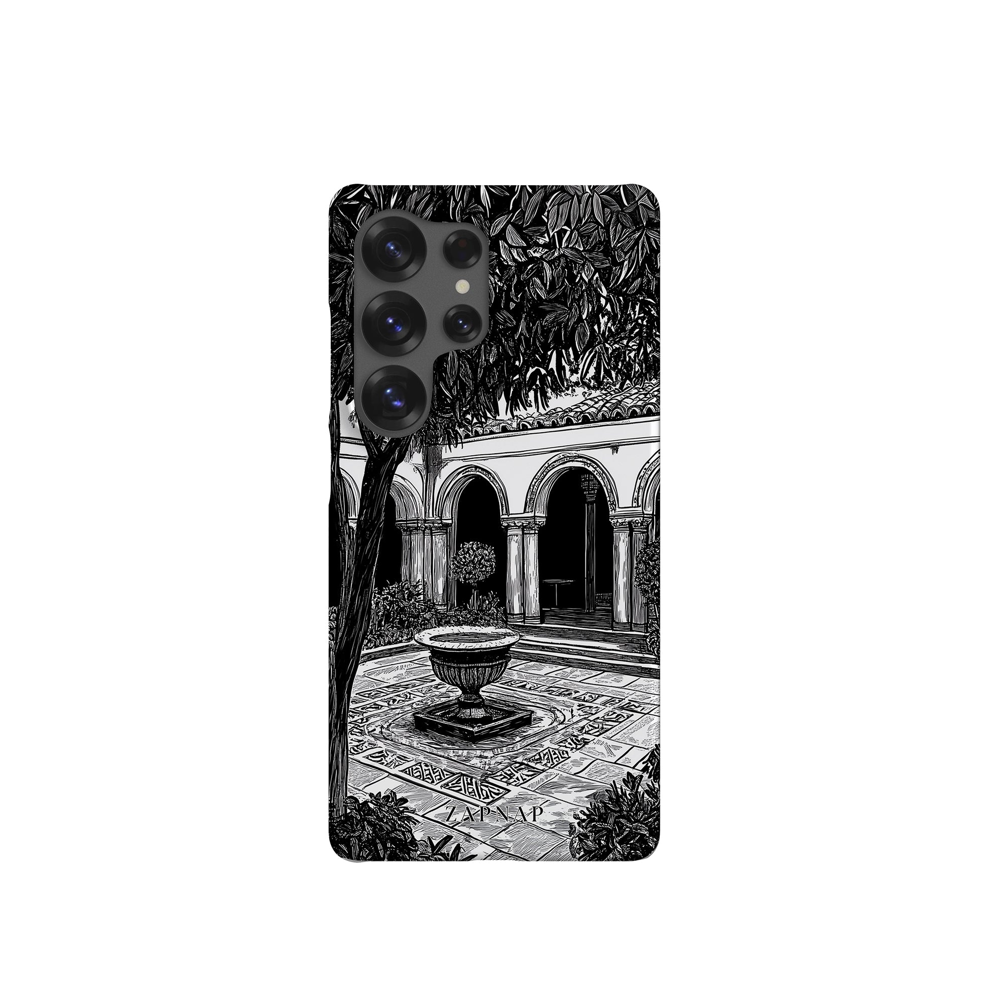 This black-and-white artwork depicts a tranquil courtyard with arched walkways, lush plants, and a central fountain. The fine line work and shadowing create a peaceful atmosphere, capturing the quiet elegance of a hidden sanctuary.