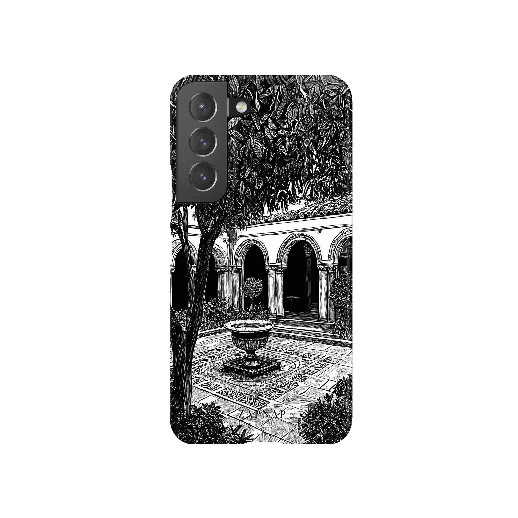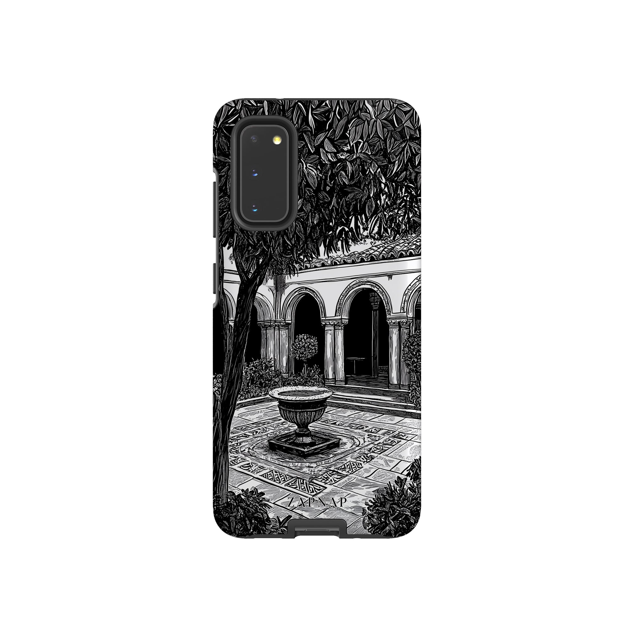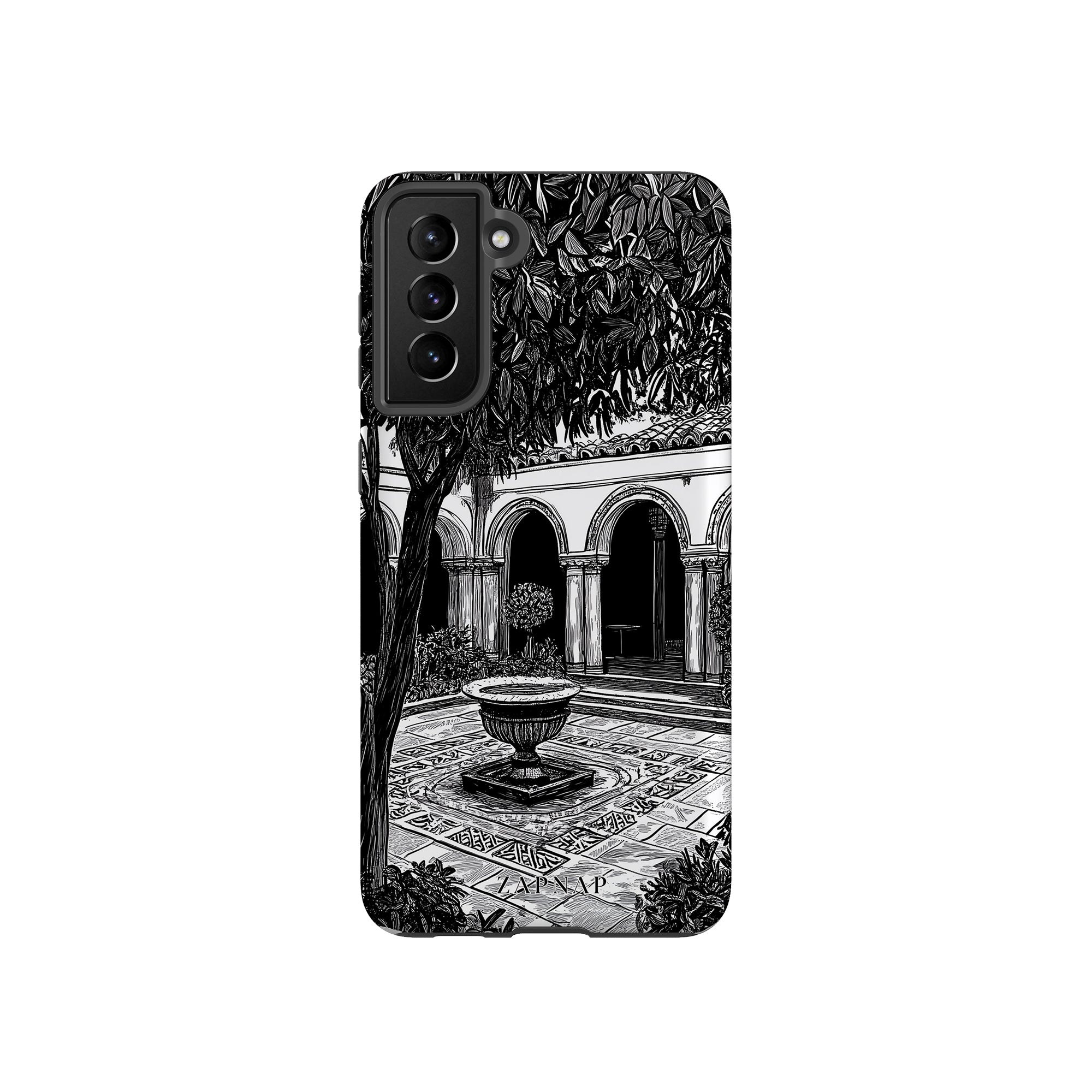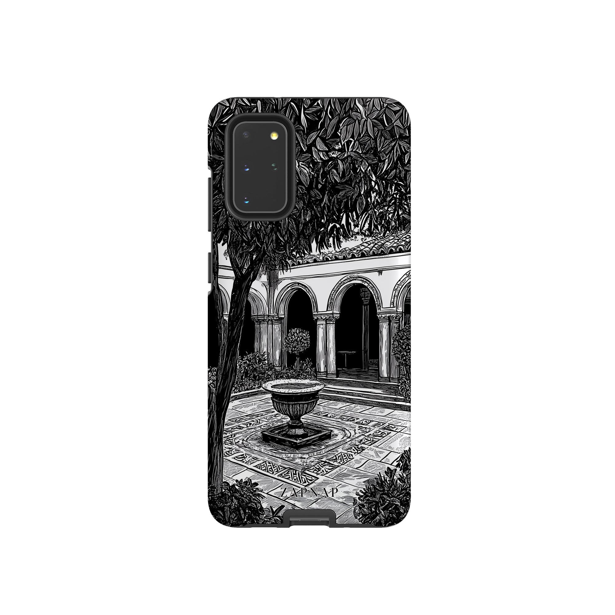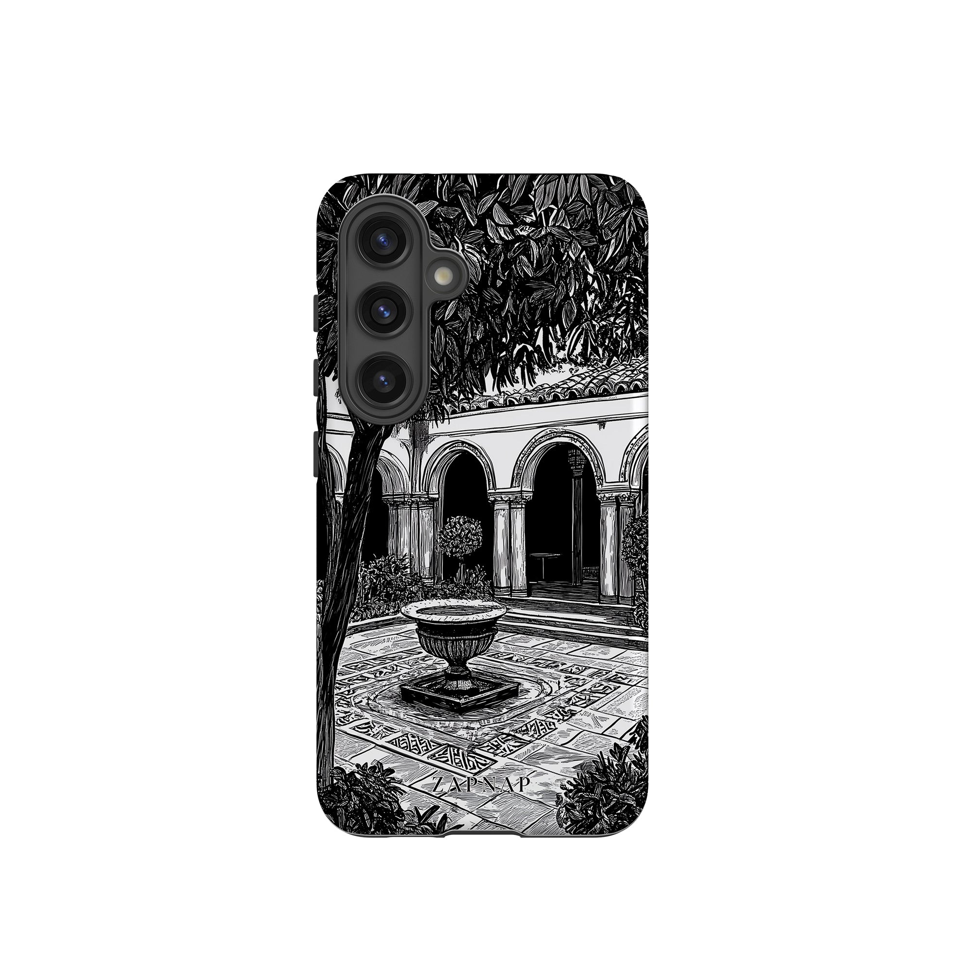 This black-and-white artwork depicts a tranquil courtyard with arched walkways, lush plants, and a central fountain. The fine line work and shadowing create a peaceful atmosphere, capturing the quiet elegance of a hidden sanctuary.