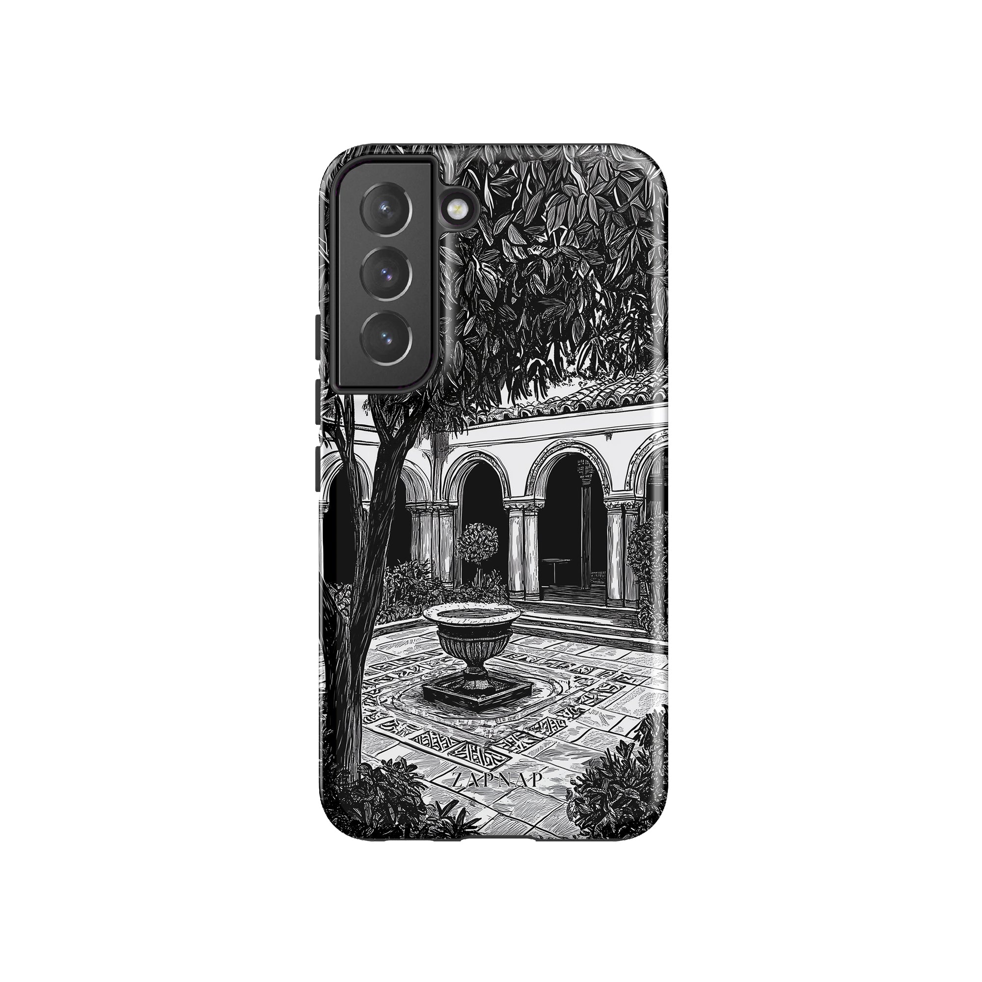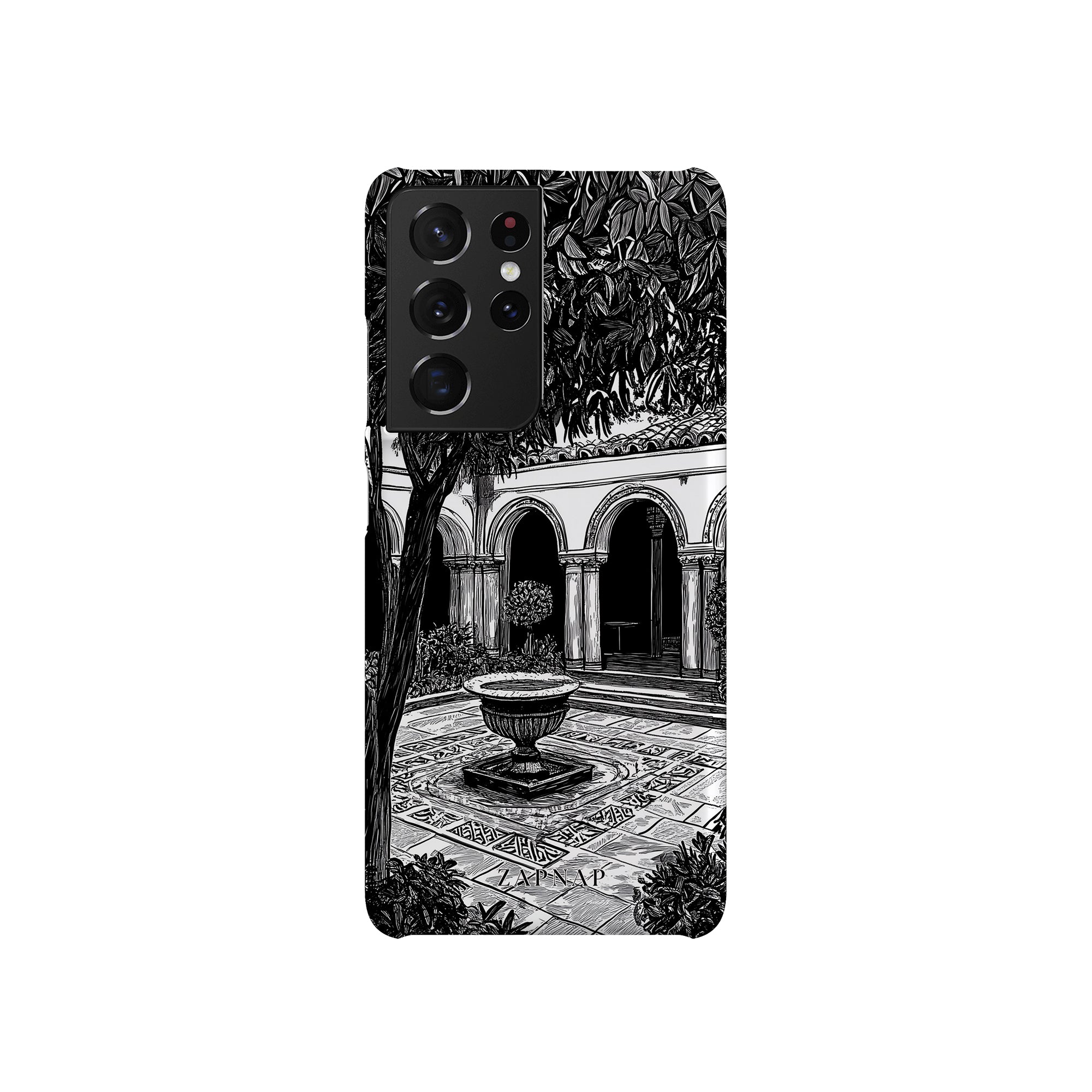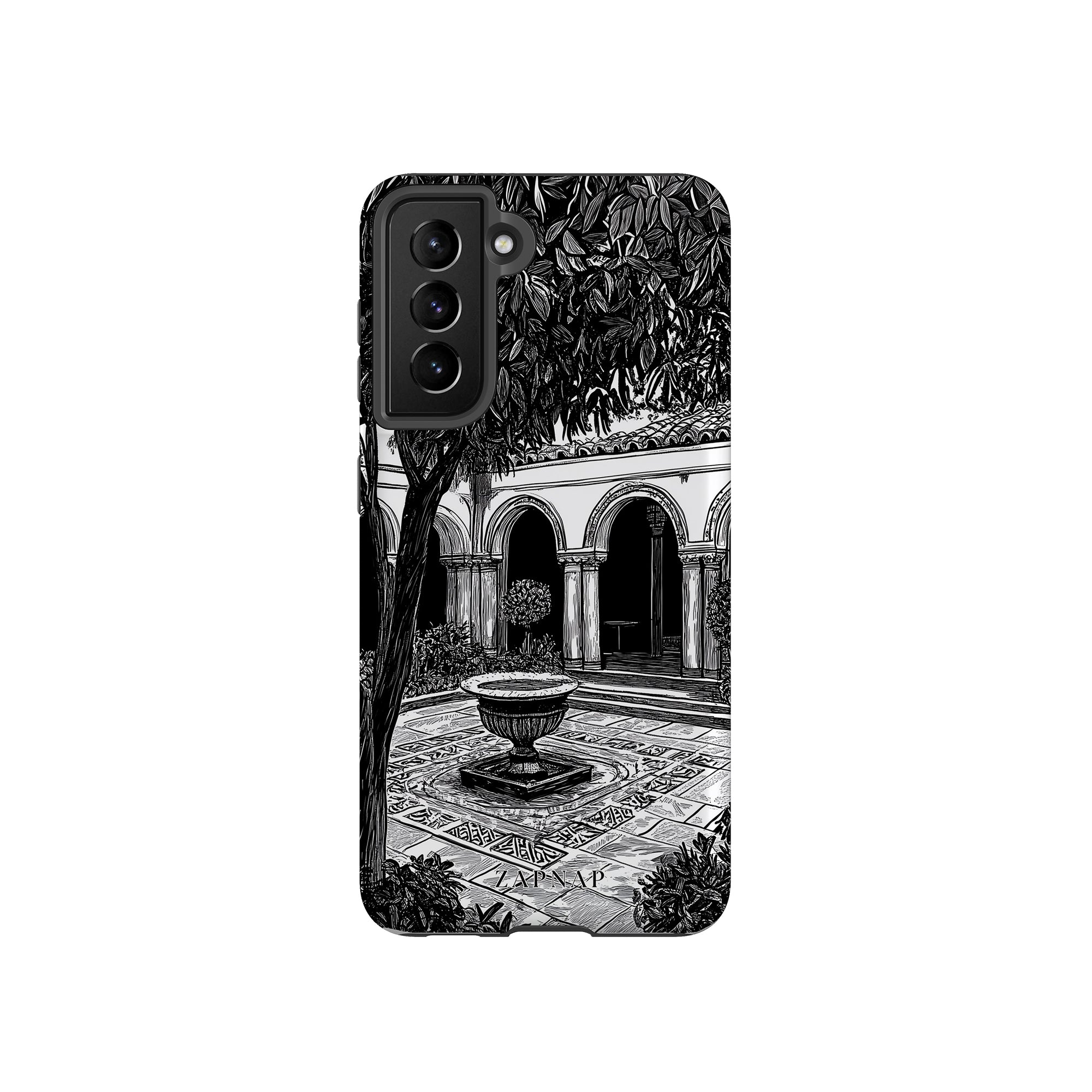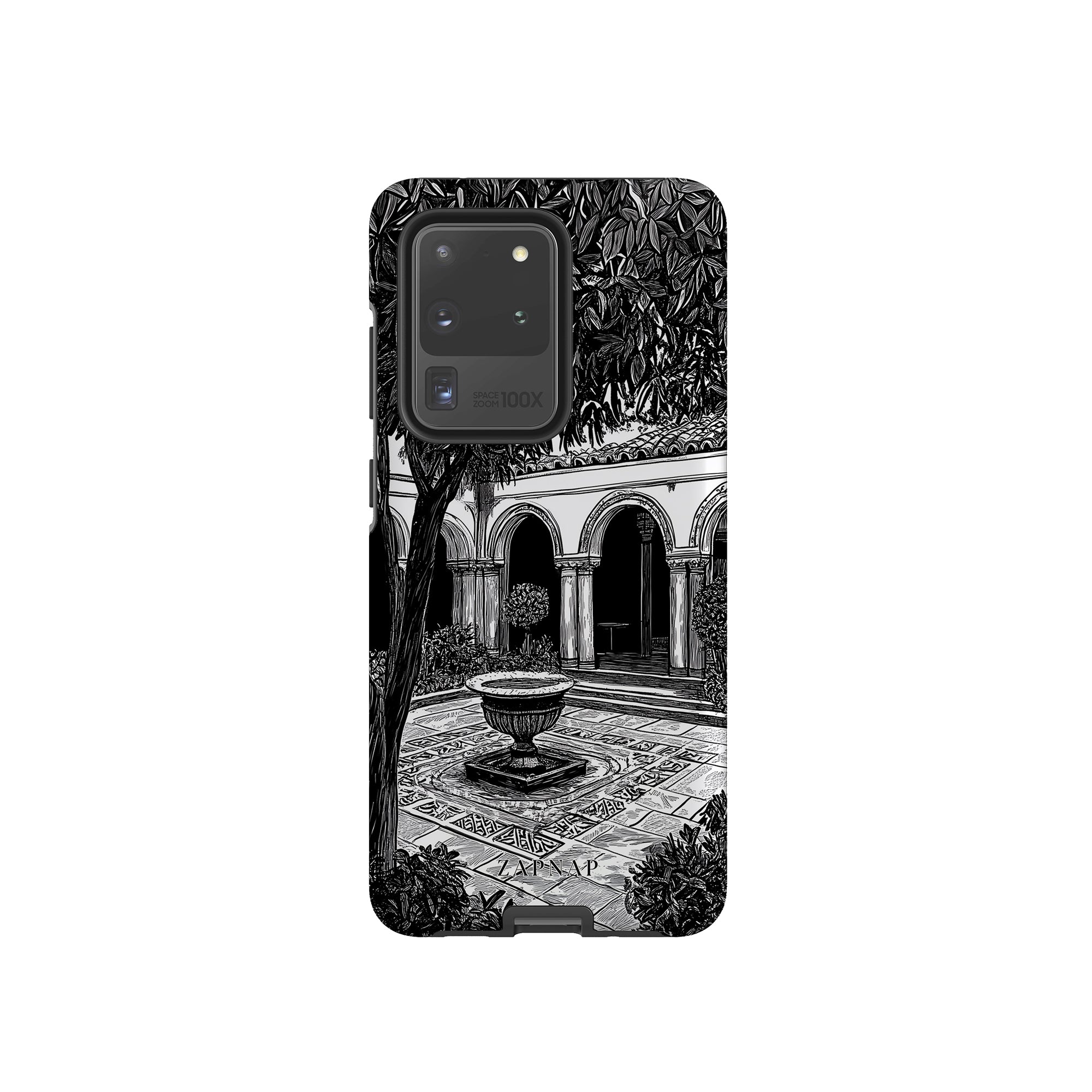 This black-and-white artwork depicts a tranquil courtyard with arched walkways, lush plants, and a central fountain. The fine line work and shadowing create a peaceful atmosphere, capturing the quiet elegance of a hidden sanctuary.