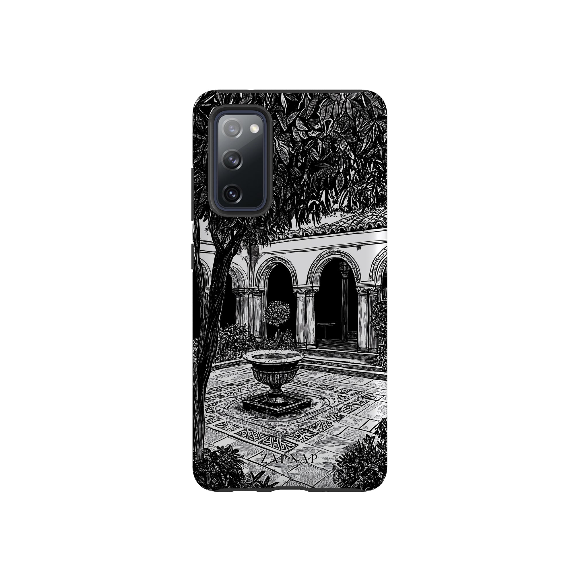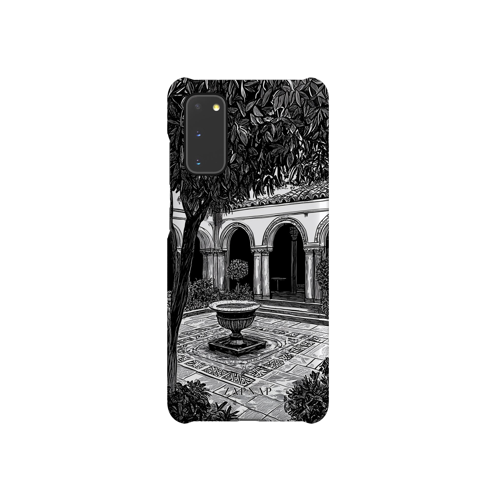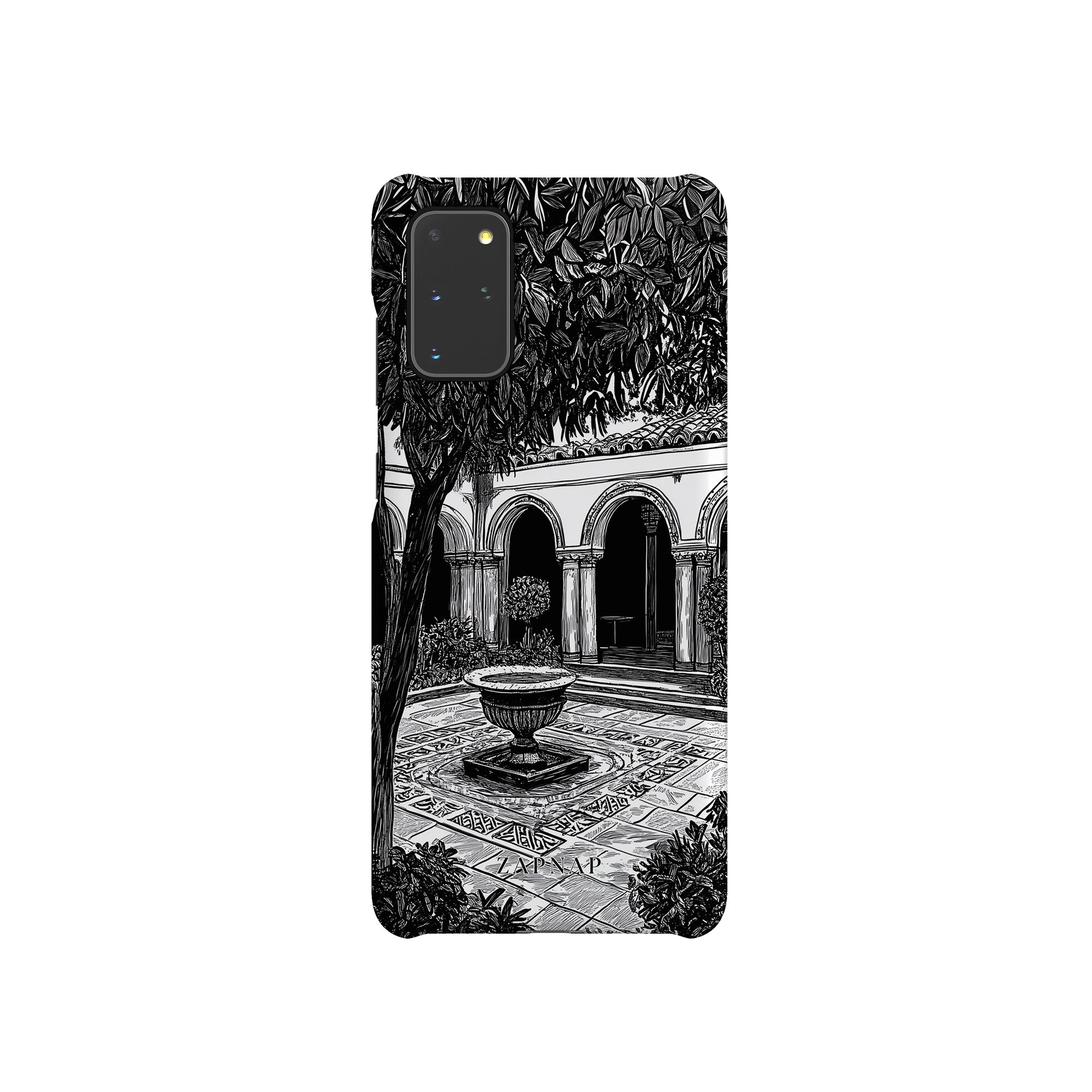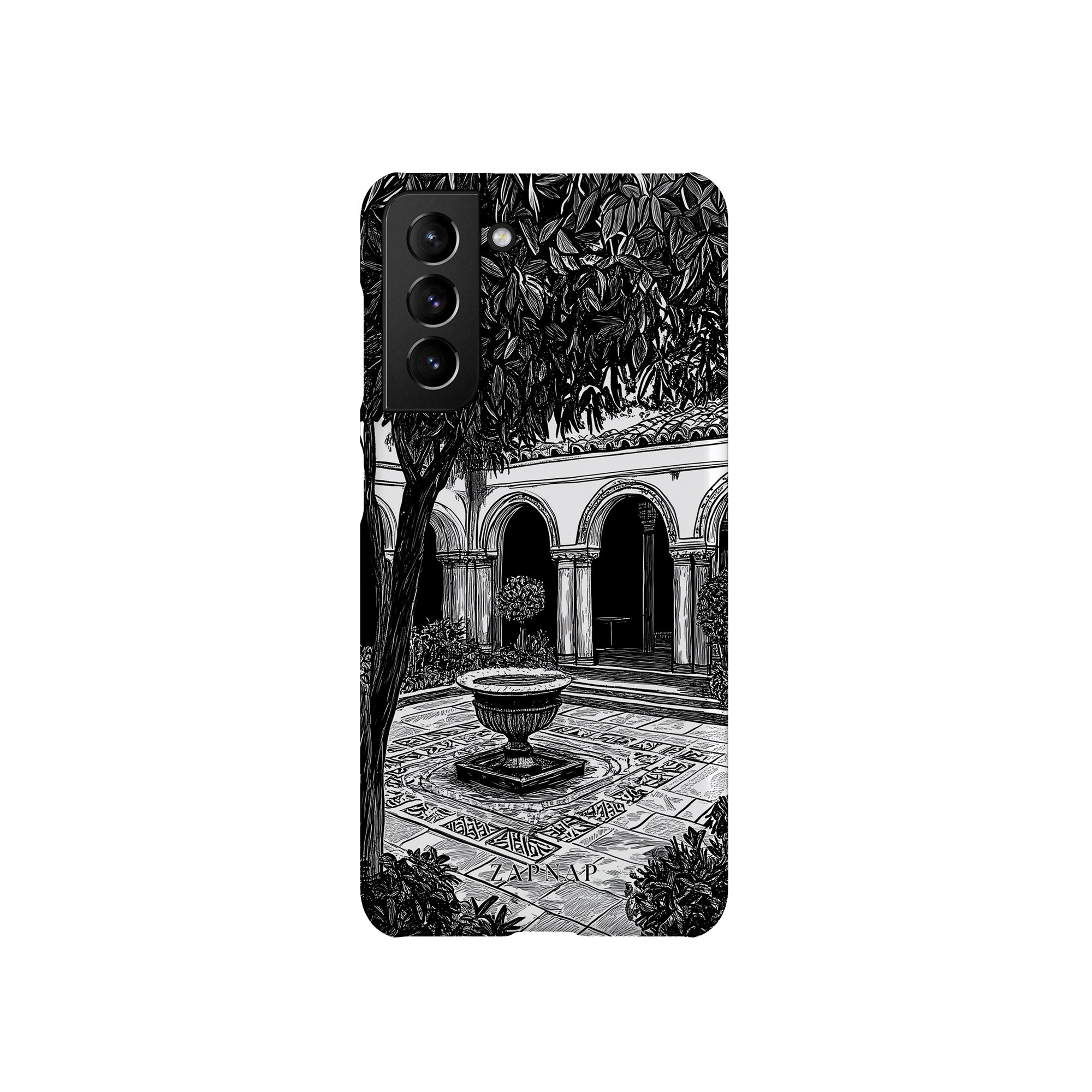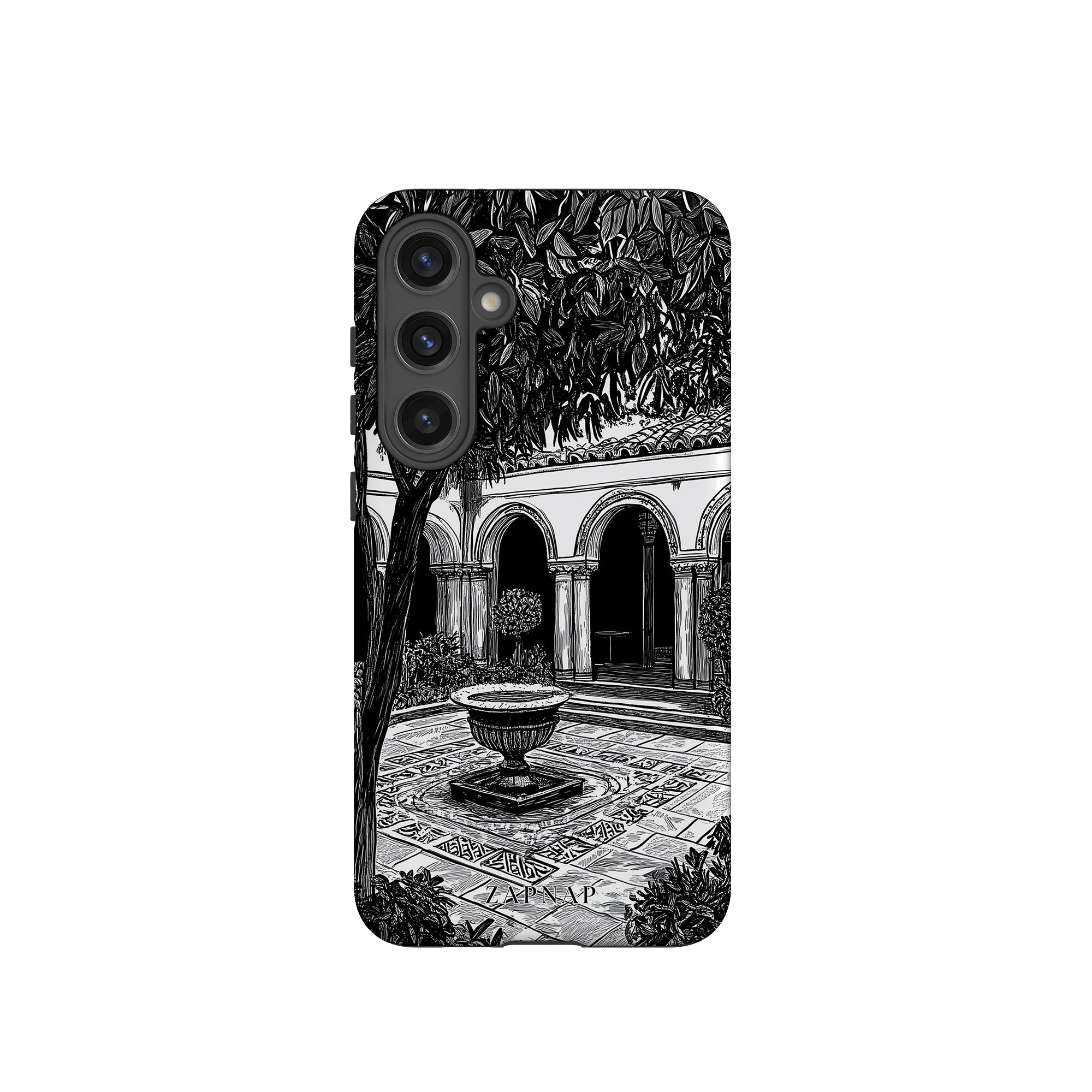 This black-and-white artwork depicts a tranquil courtyard with arched walkways, lush plants, and a central fountain. The fine line work and shadowing create a peaceful atmosphere, capturing the quiet elegance of a hidden sanctuary.