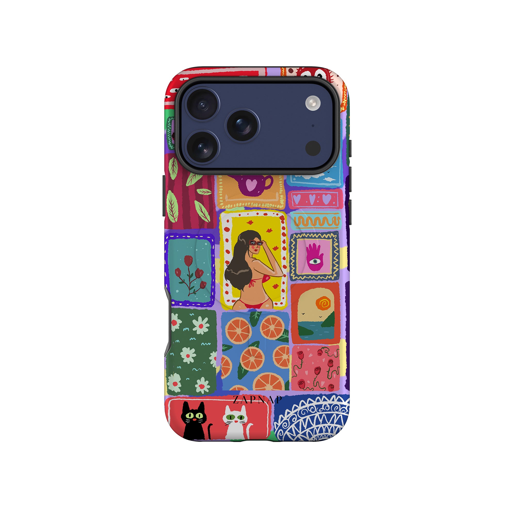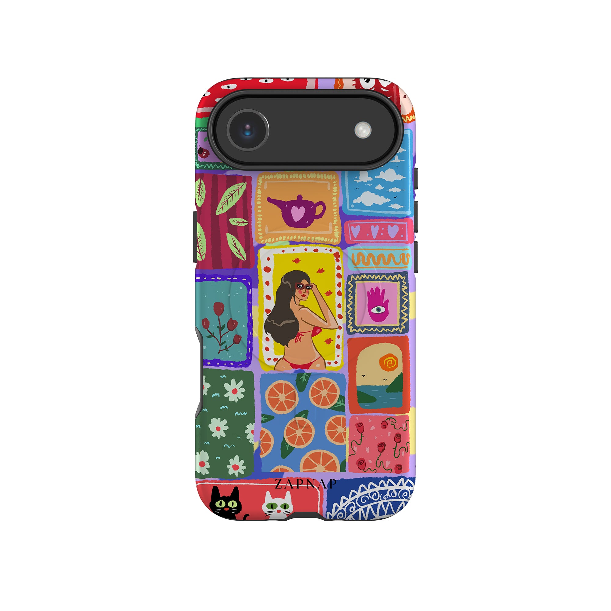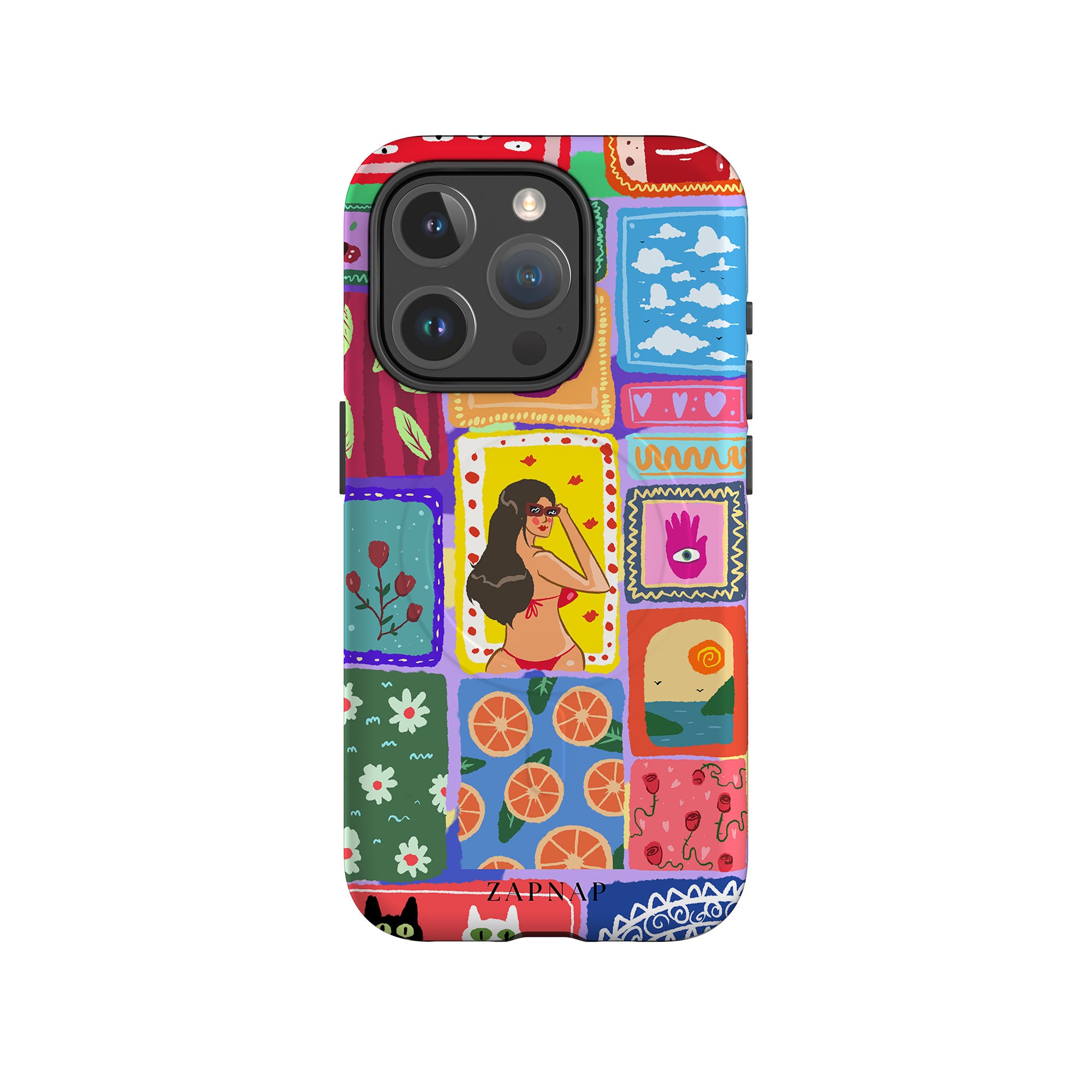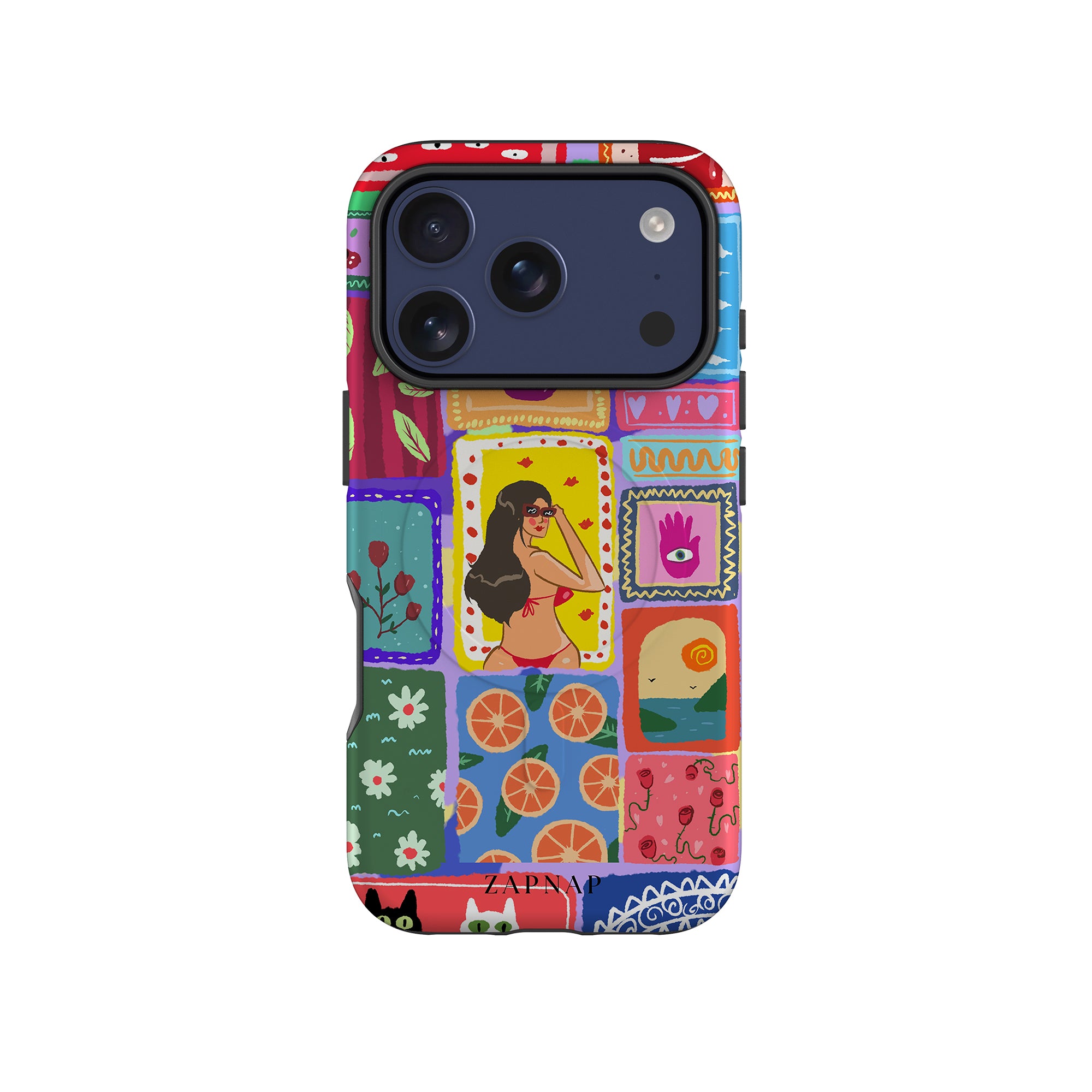 The painting celebrates the vibrancy of the tropics. This artwork is a charming mosaic of ocean vistas, lush botanicals, and oranges, perfect for adding a splash of perpetual Summer to your Phone case.