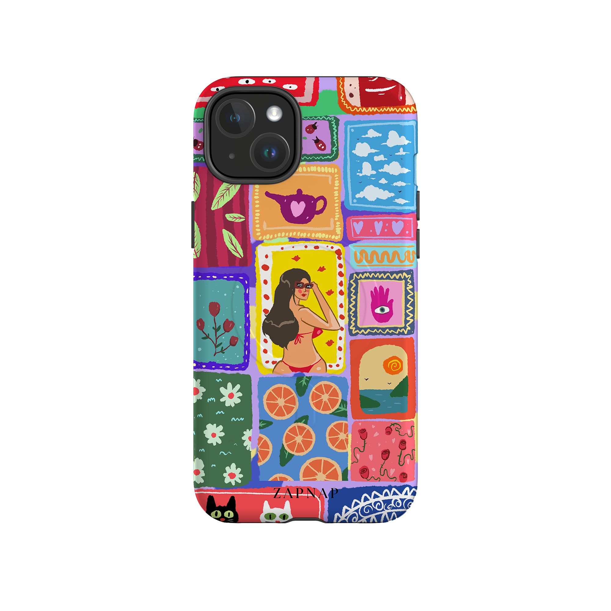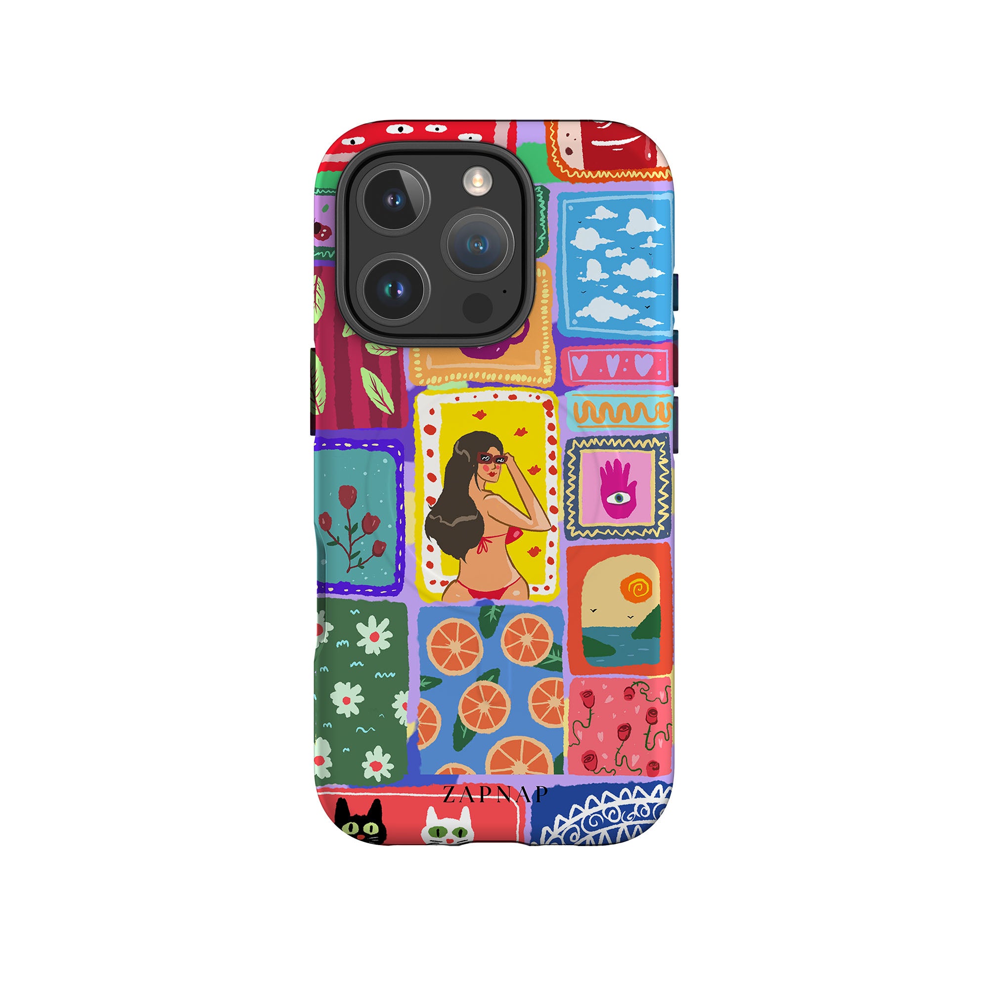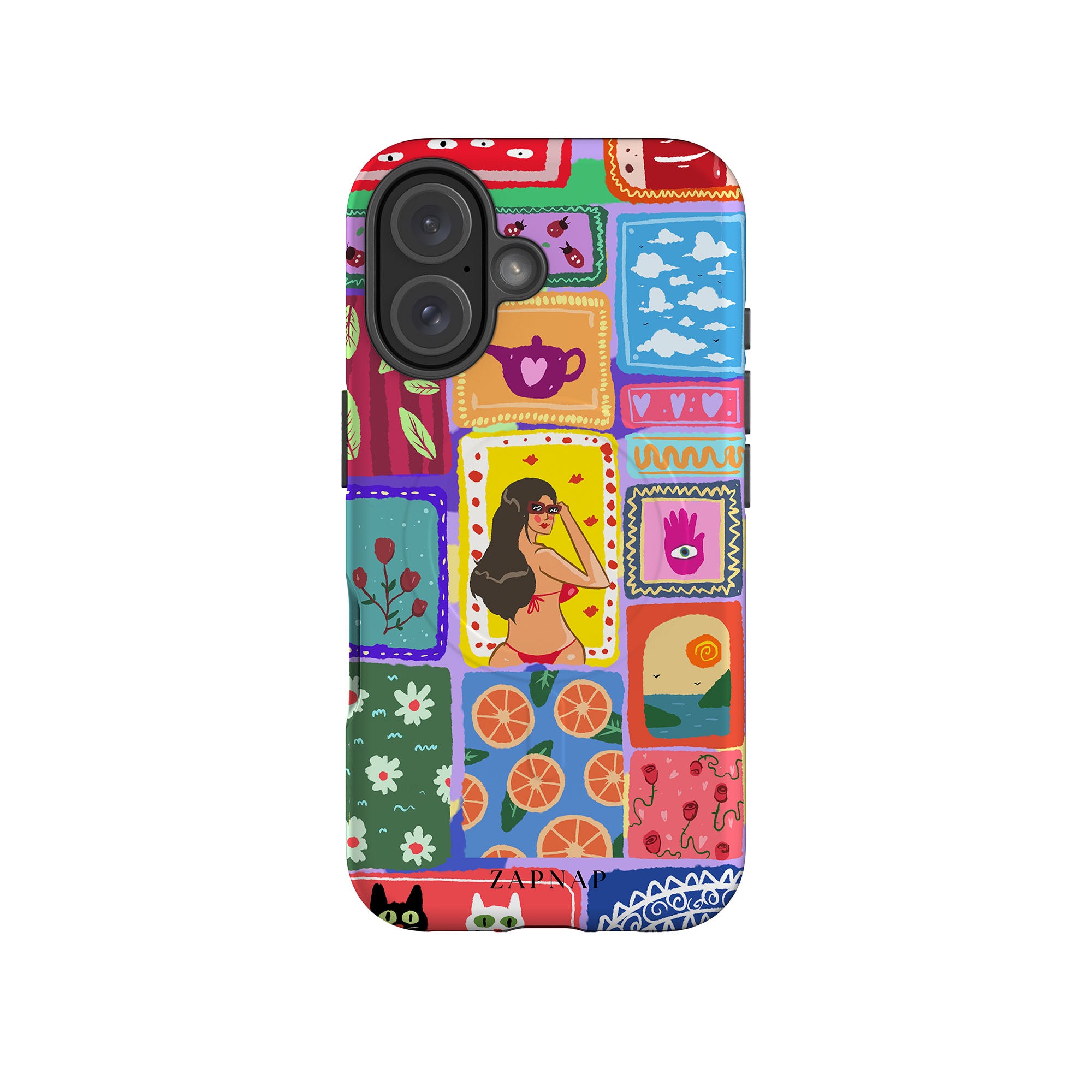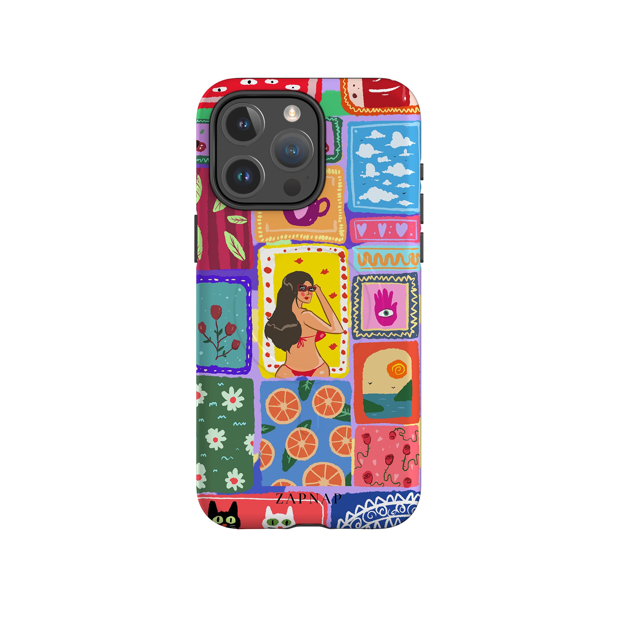 The painting celebrates the vibrancy of the tropics. This artwork is a charming mosaic of ocean vistas, lush botanicals, and oranges, perfect for adding a splash of perpetual Summer to your Phone case.